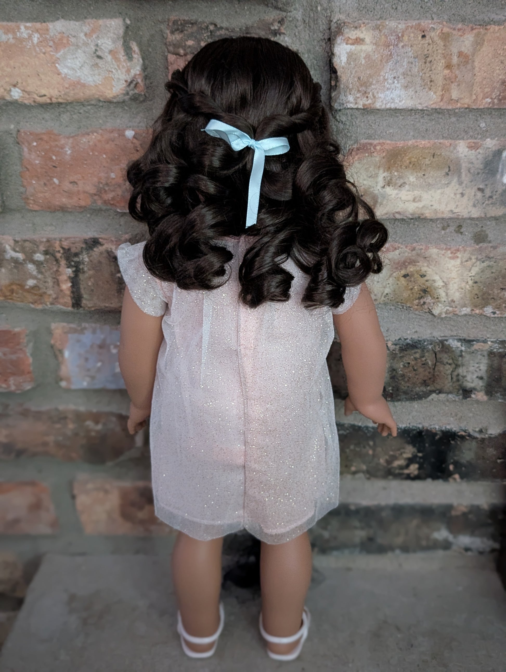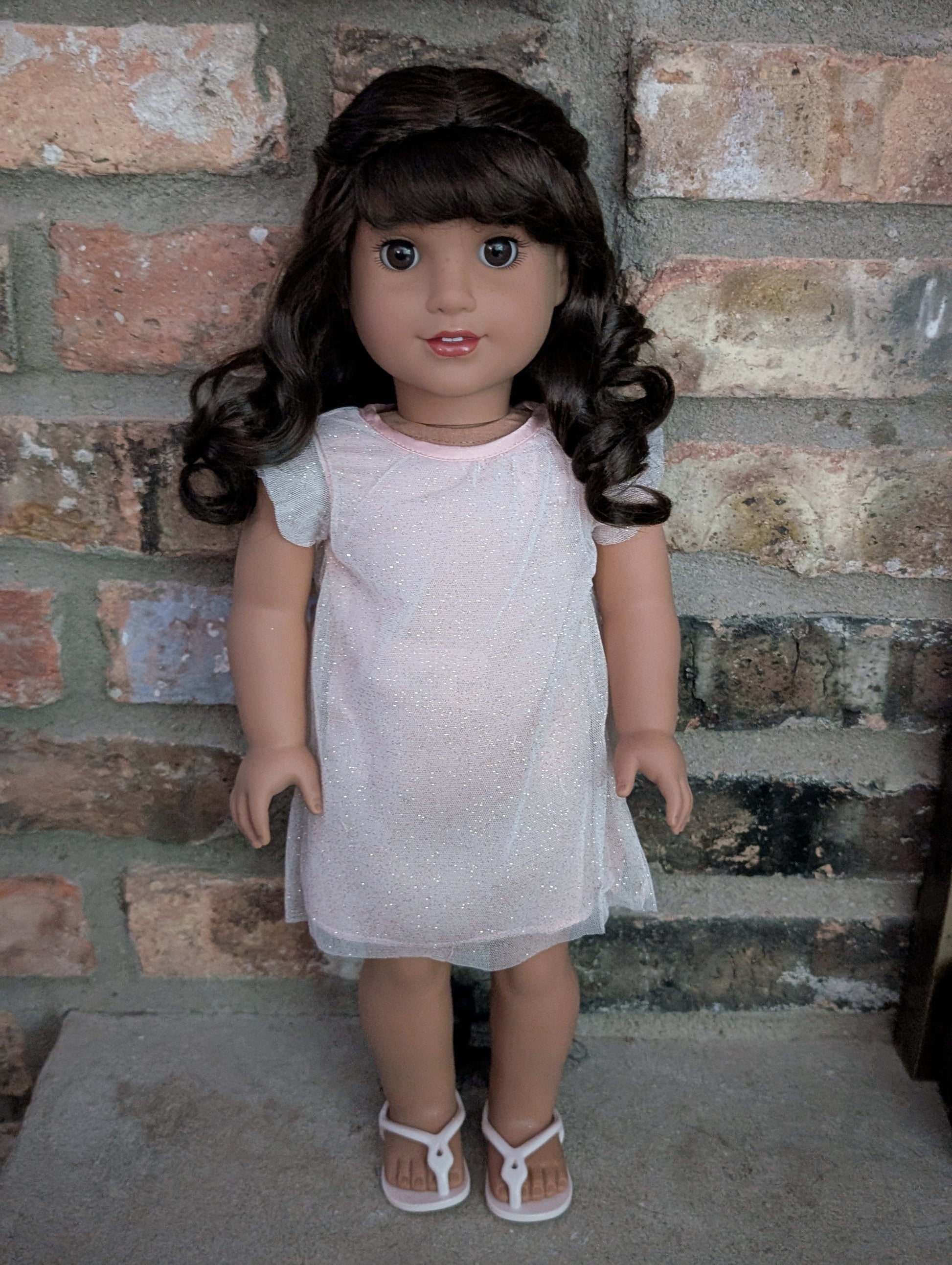 This one of a kind OOAK custom American Girl doll was created with a brand new Long Hair Looks doll, a brown wig, and brown eyes. She has lip gloss and freckles that were hand painted and sealed. She may have some minor shine marks from handling. She comes with the outfit pictured.