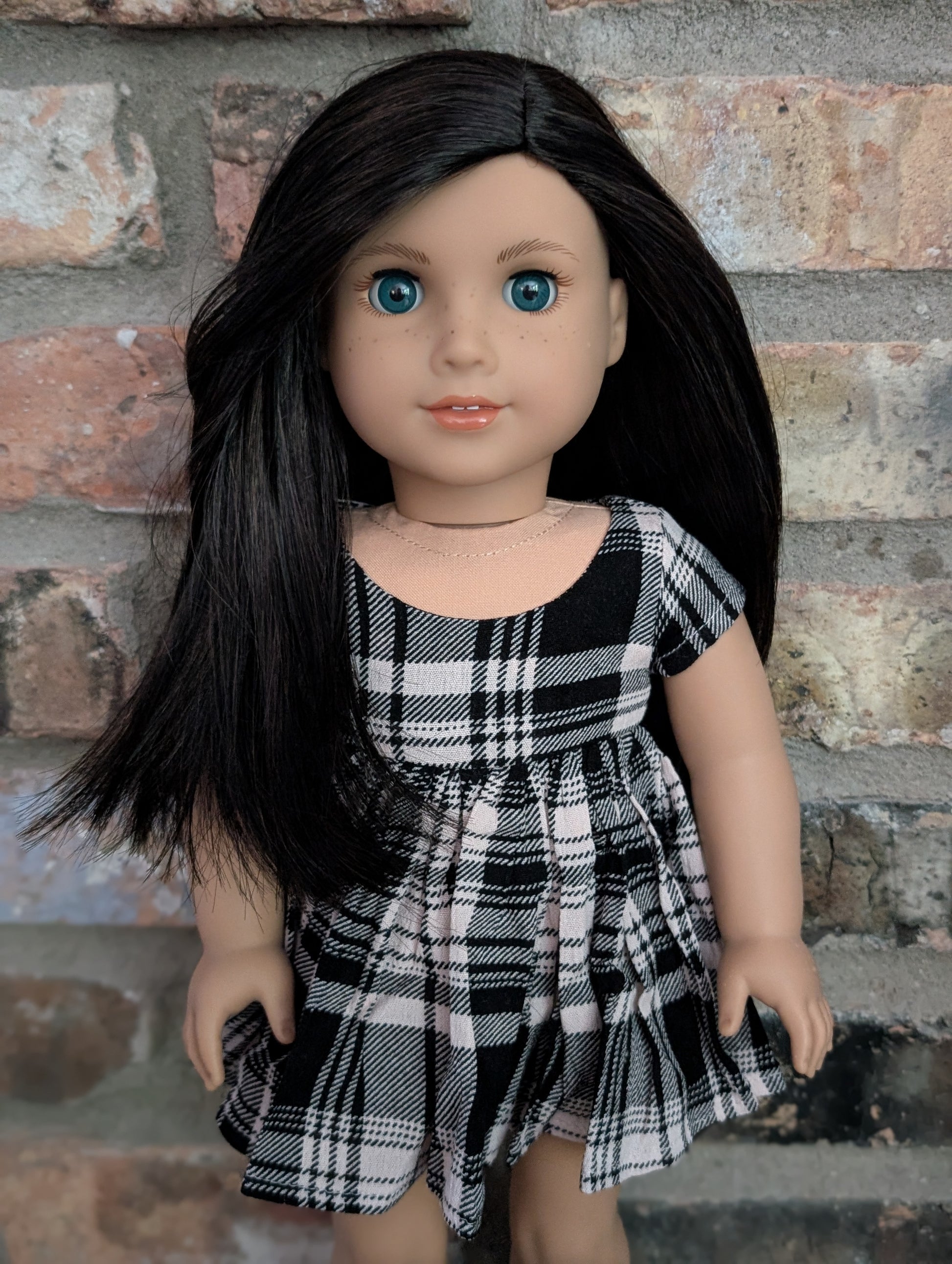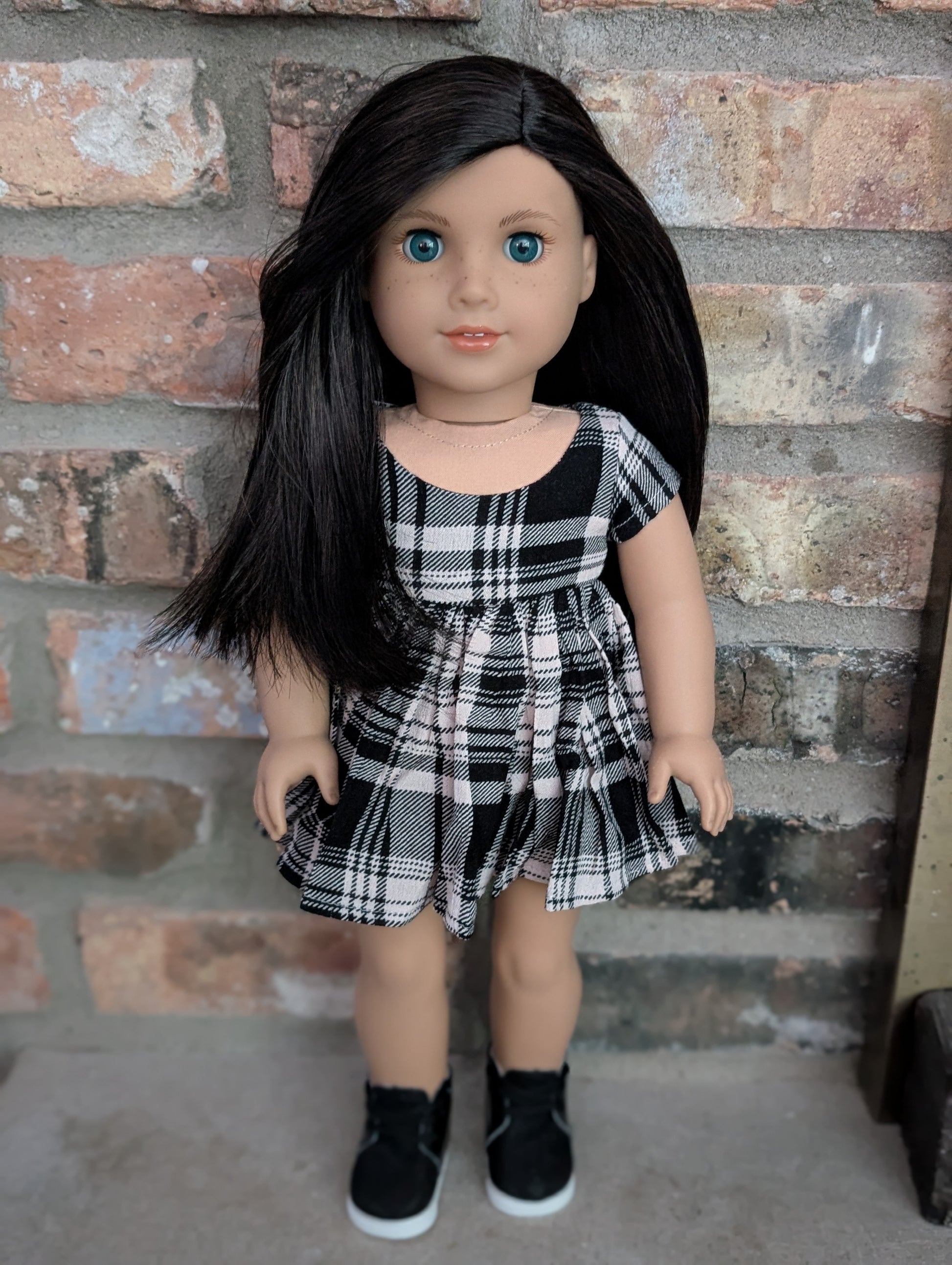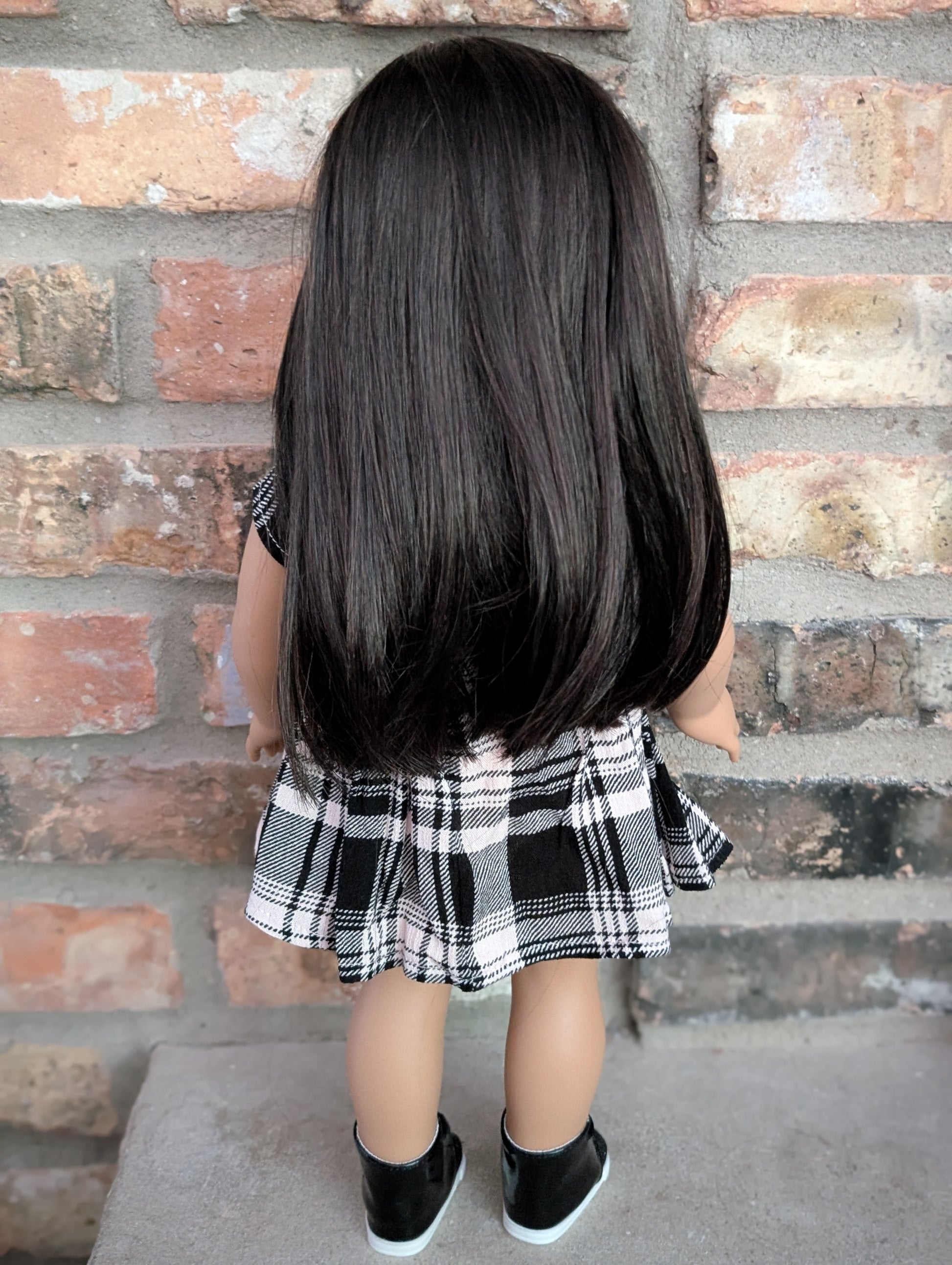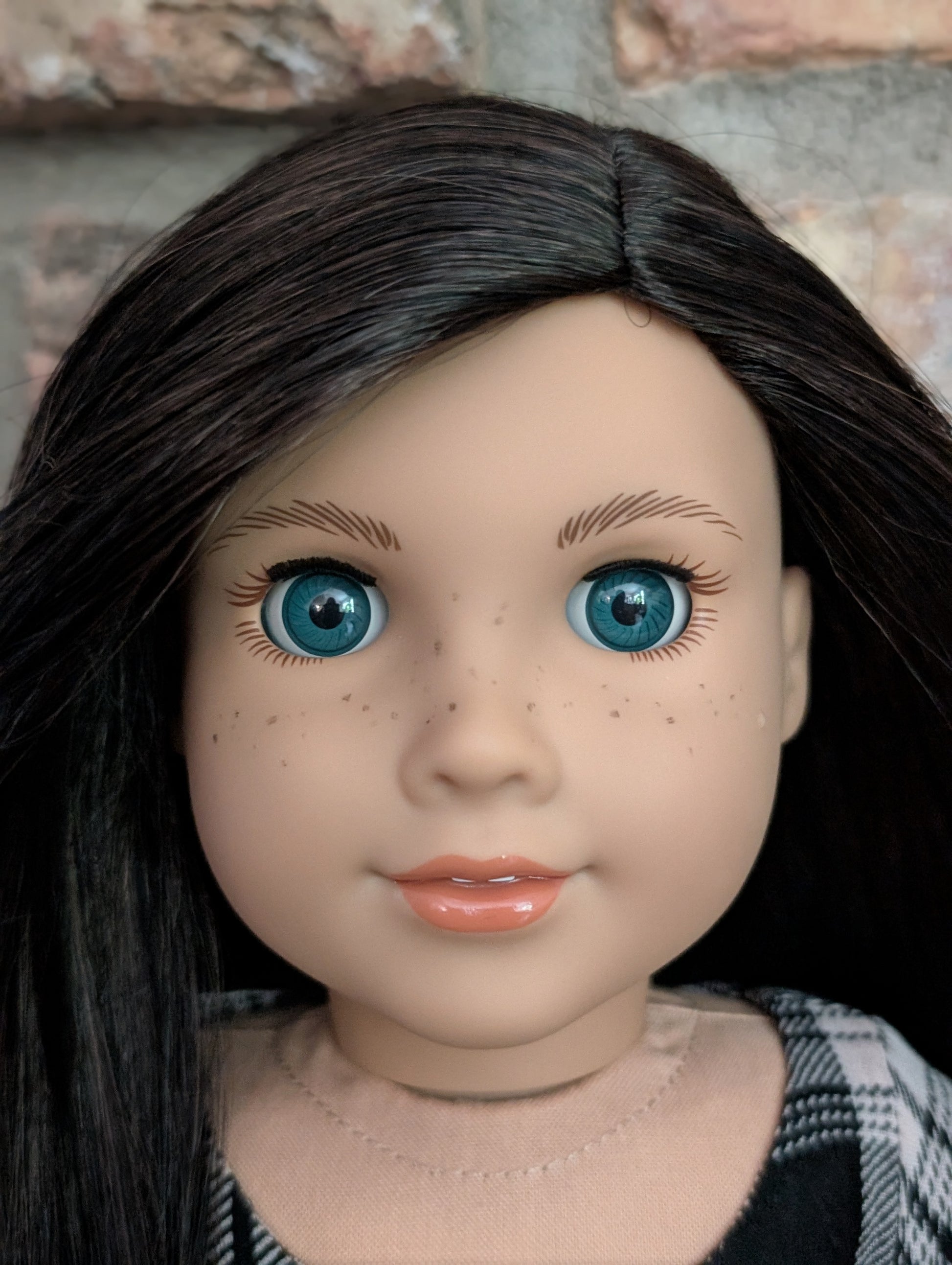This one of a kind OOAK custom American Girl doll was created with a brand new doll, a black wig, and blue eyes. She has lip gloss and freckles that were hand painted and sealed. She may have some minor shine marks from handling. She comes with the outfit pictured.