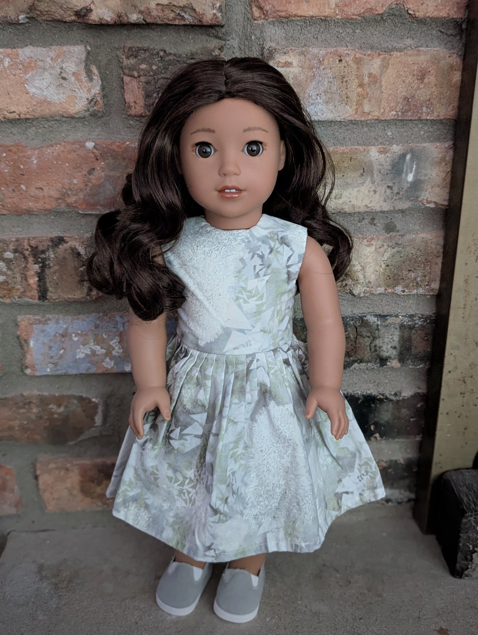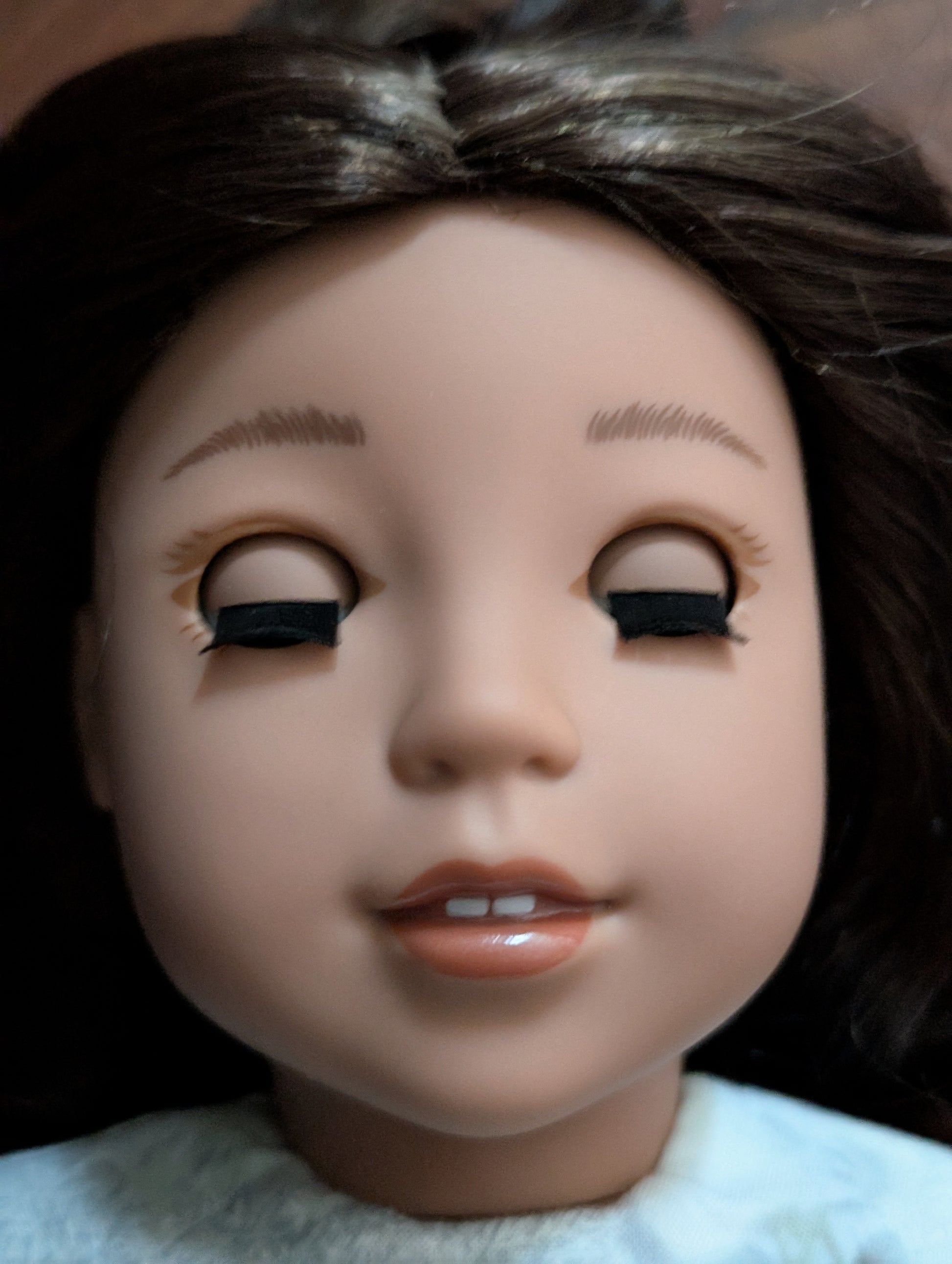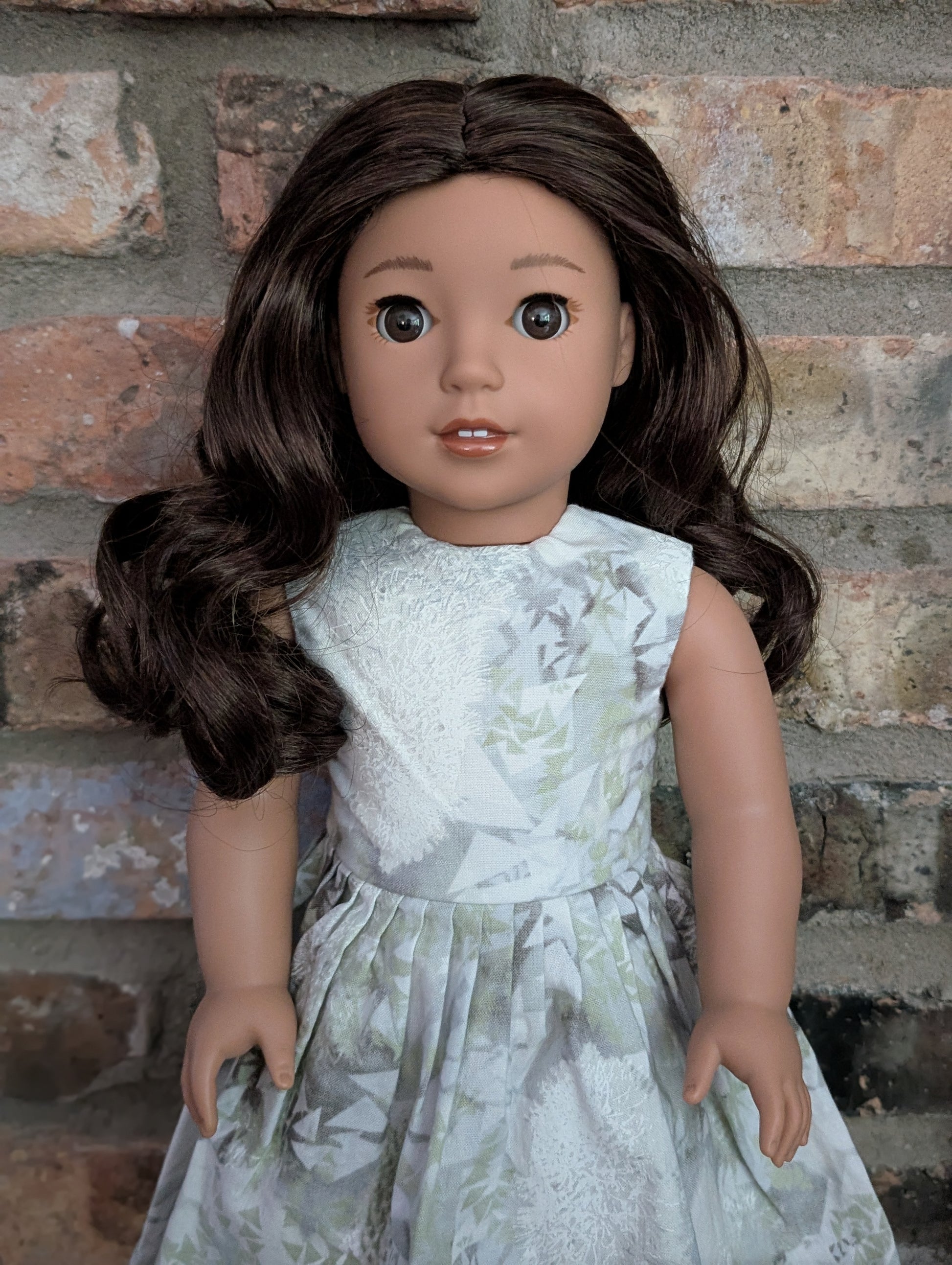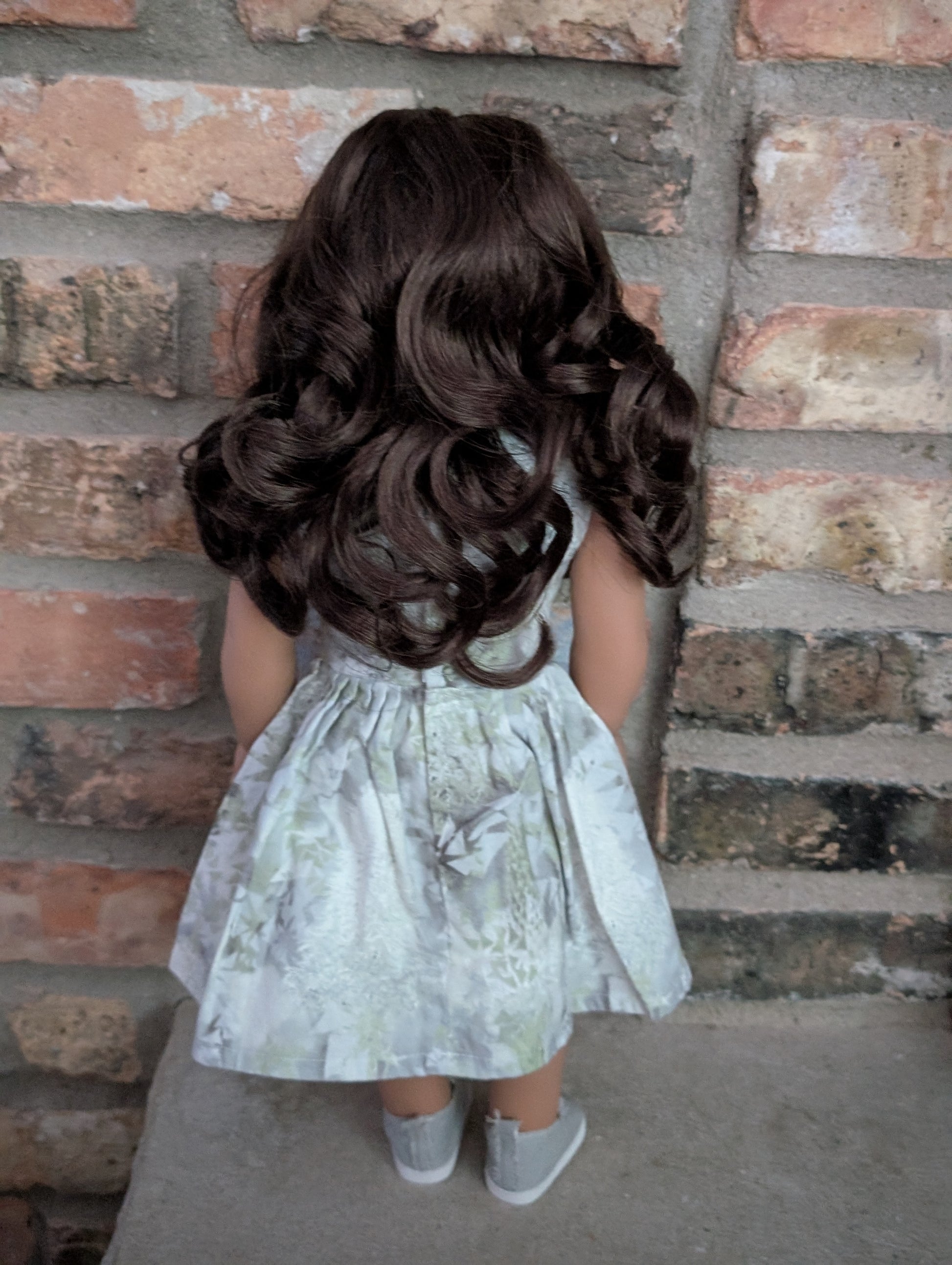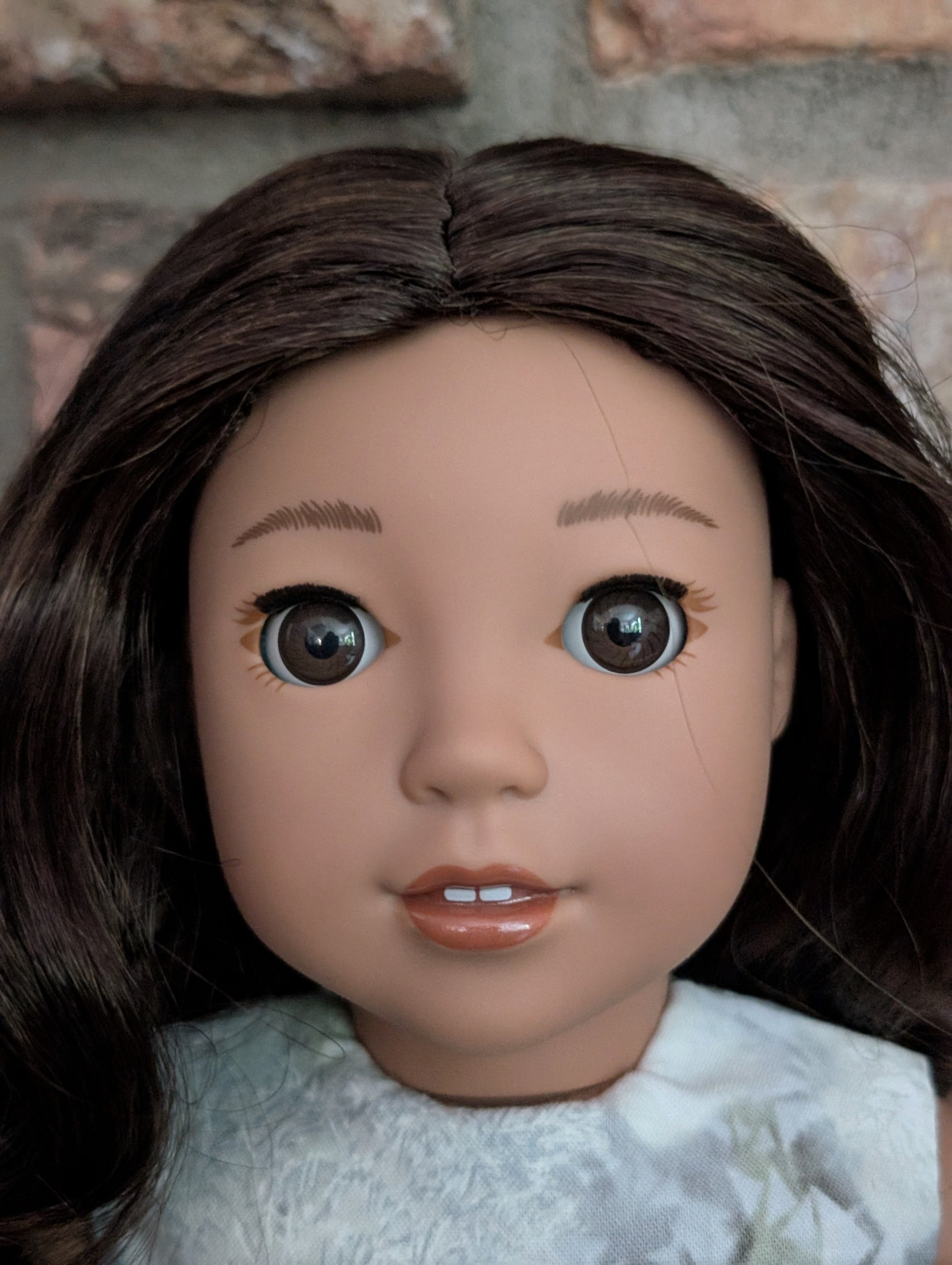 This one of a kind OOAK custom American Girl doll was created with a brand new doll, a brown wig, and brown eyes. She has lip gloss that was hand painted and sealed. She may have some minor shine marks from handling. She comes with the outfit pictured.