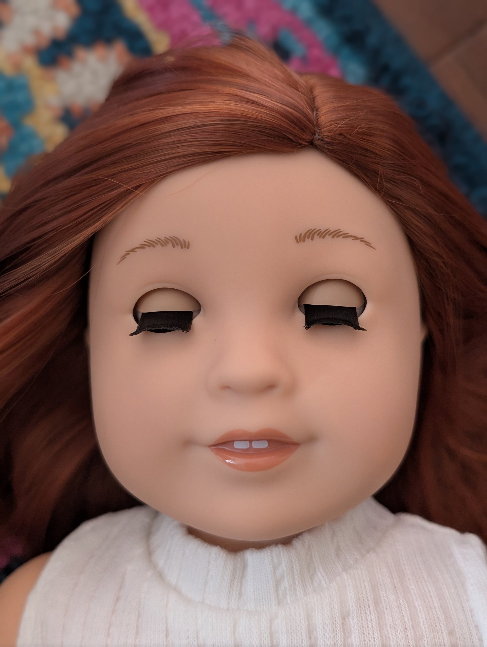 This one of a kind OOAK custom American Girl doll was created with a brand new doll, a red wig, and brown eyes. She has lip gloss that was hand painted and sealed. She may have some minor shine marks from handling. She comes with the outfit pictured.