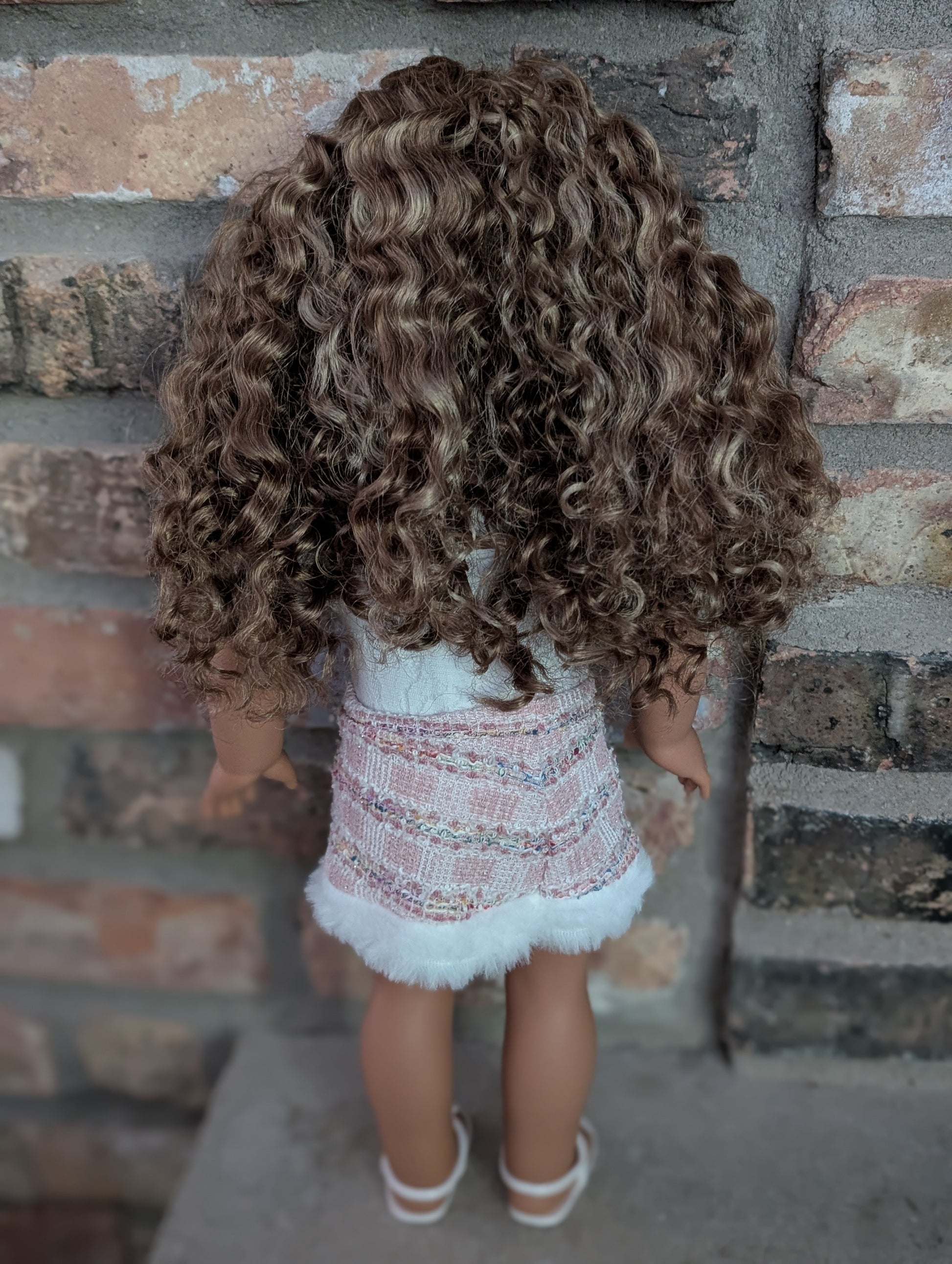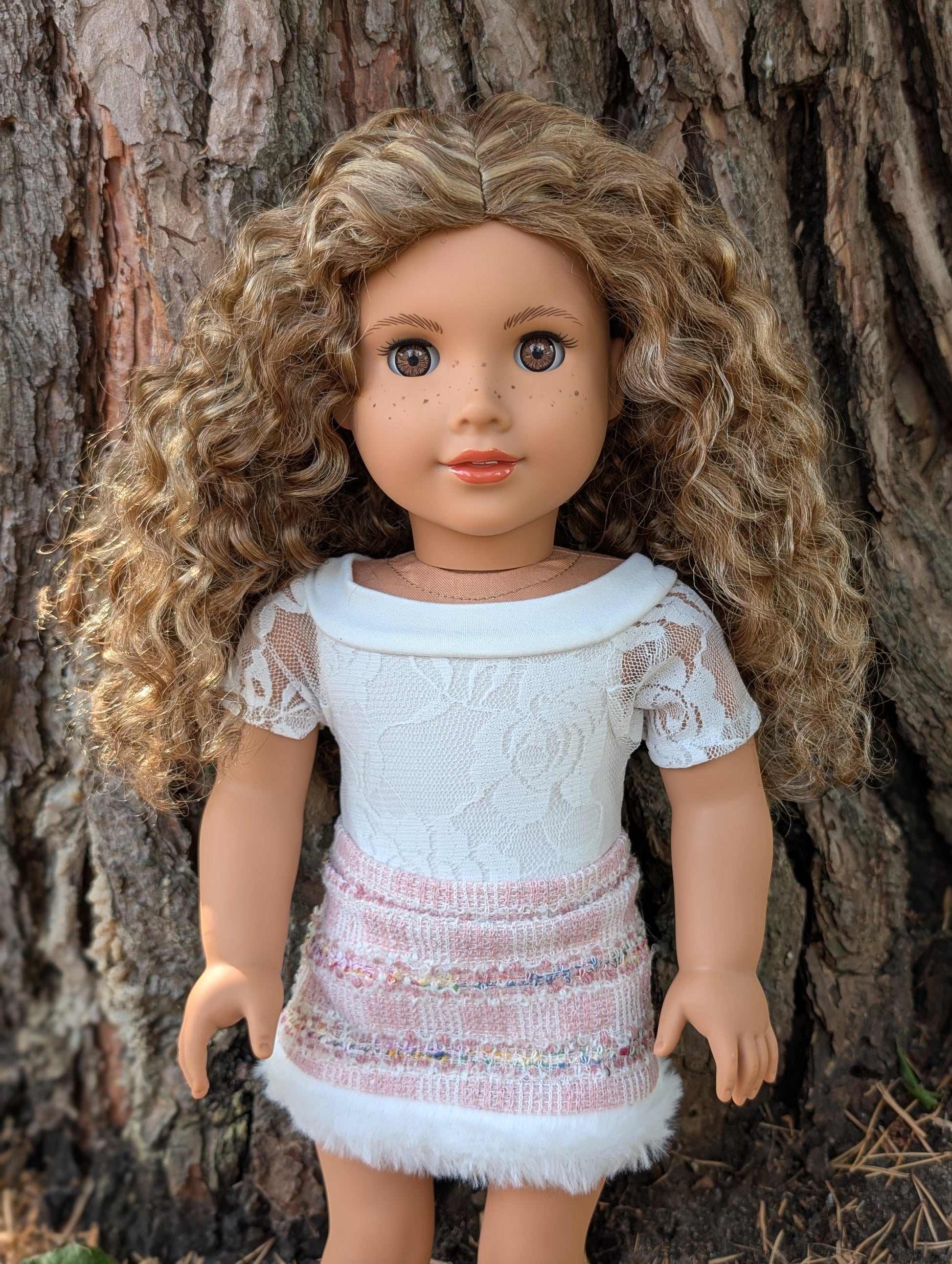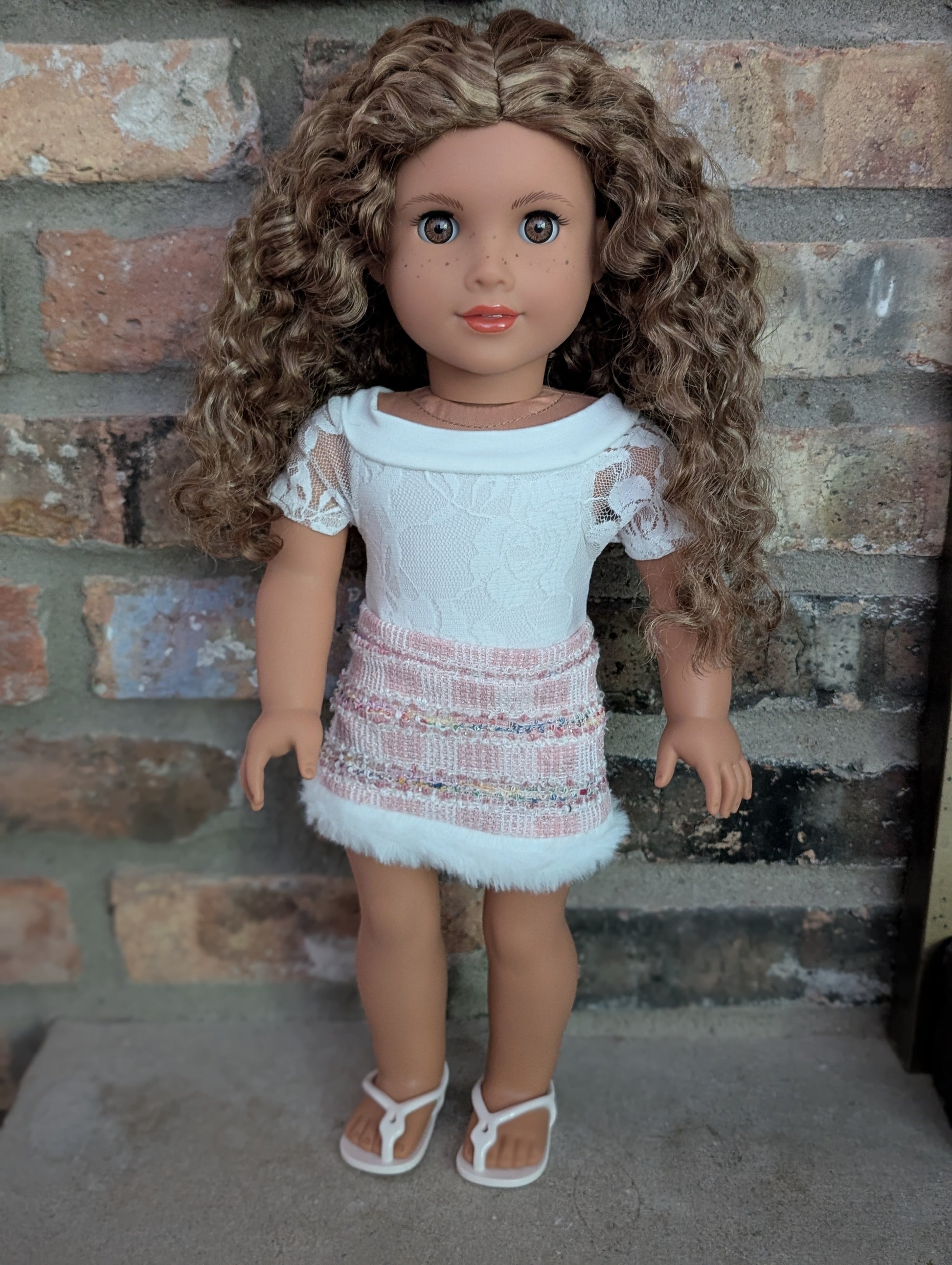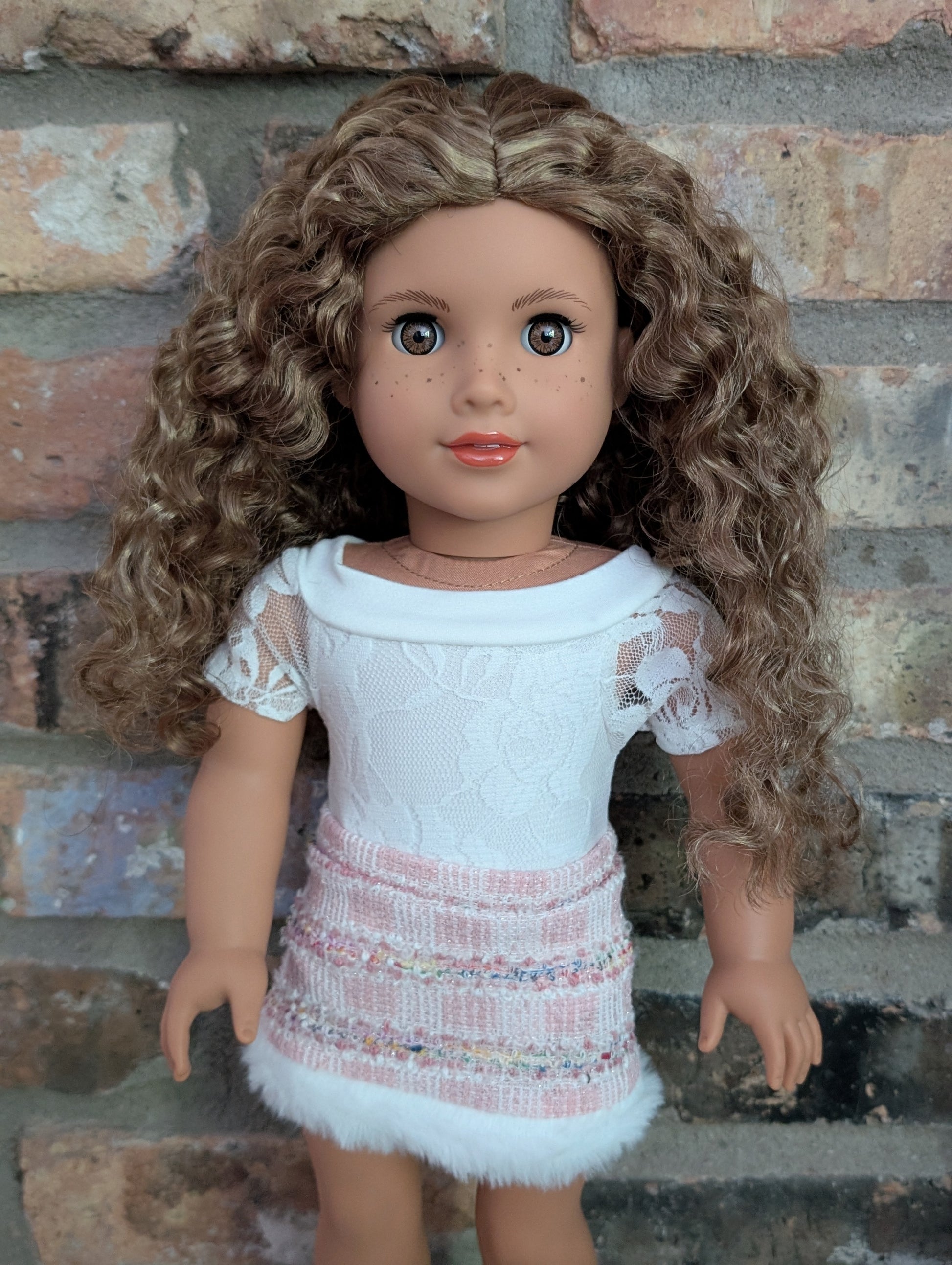 This one of a kind OOAK custom American Girl doll was created with a brand new doll, a caramel brown wig, and brown eyes. She has lip gloss and freckles that were hand painted and sealed. She may have some minor shine marks from handling. She comes with the outfit pictured.