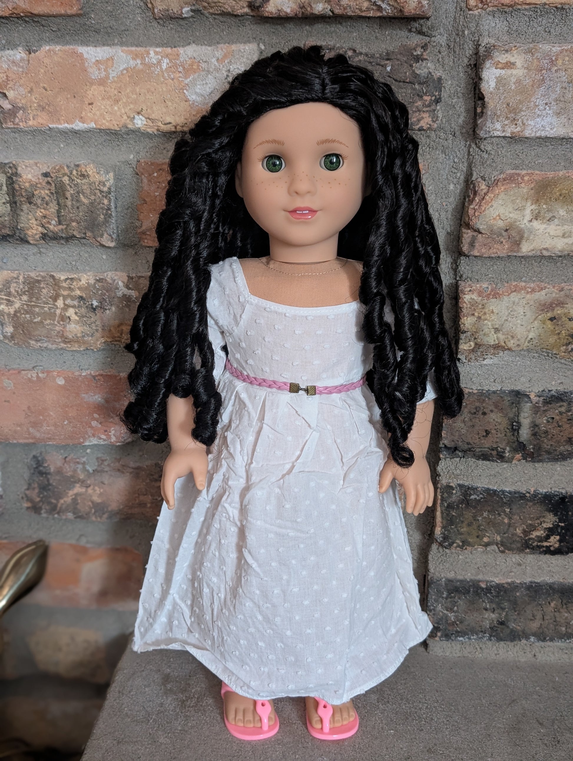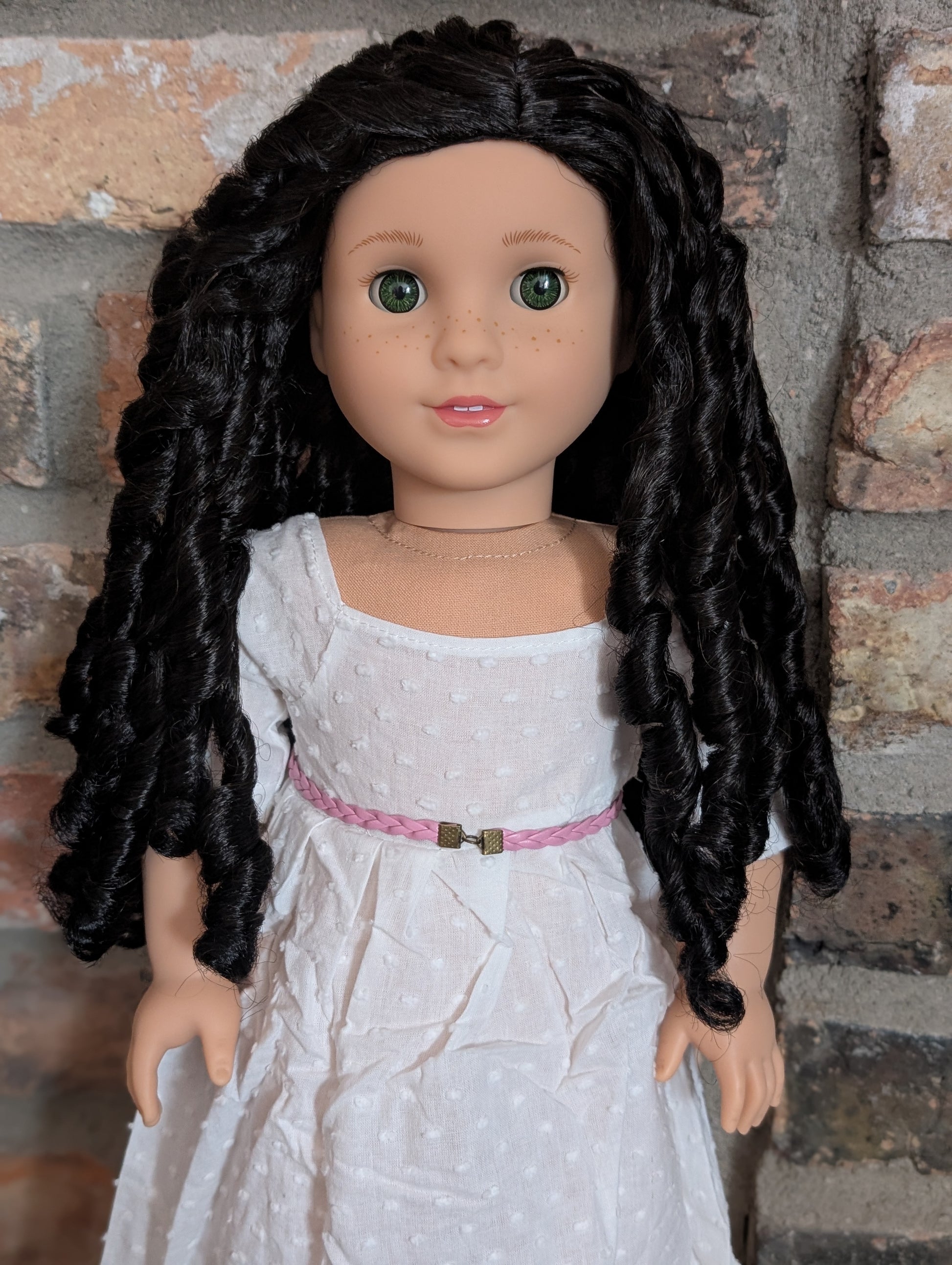 This one of a kind OOAK custom American Girl doll was created with a brand new doll, a black wig, and green eyes from a BeForever Felicity doll. She had lip gloss that was hand painted and sealed. She may have some minor shine marks from handling. She comes with the outfit pictured.