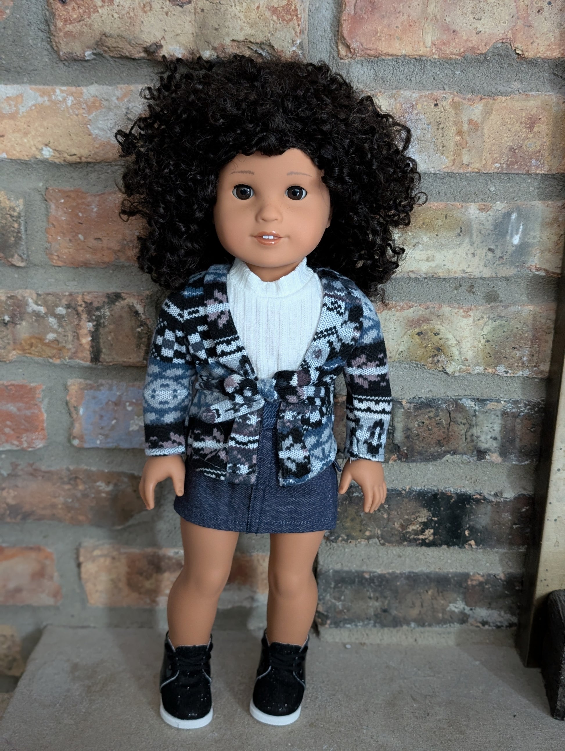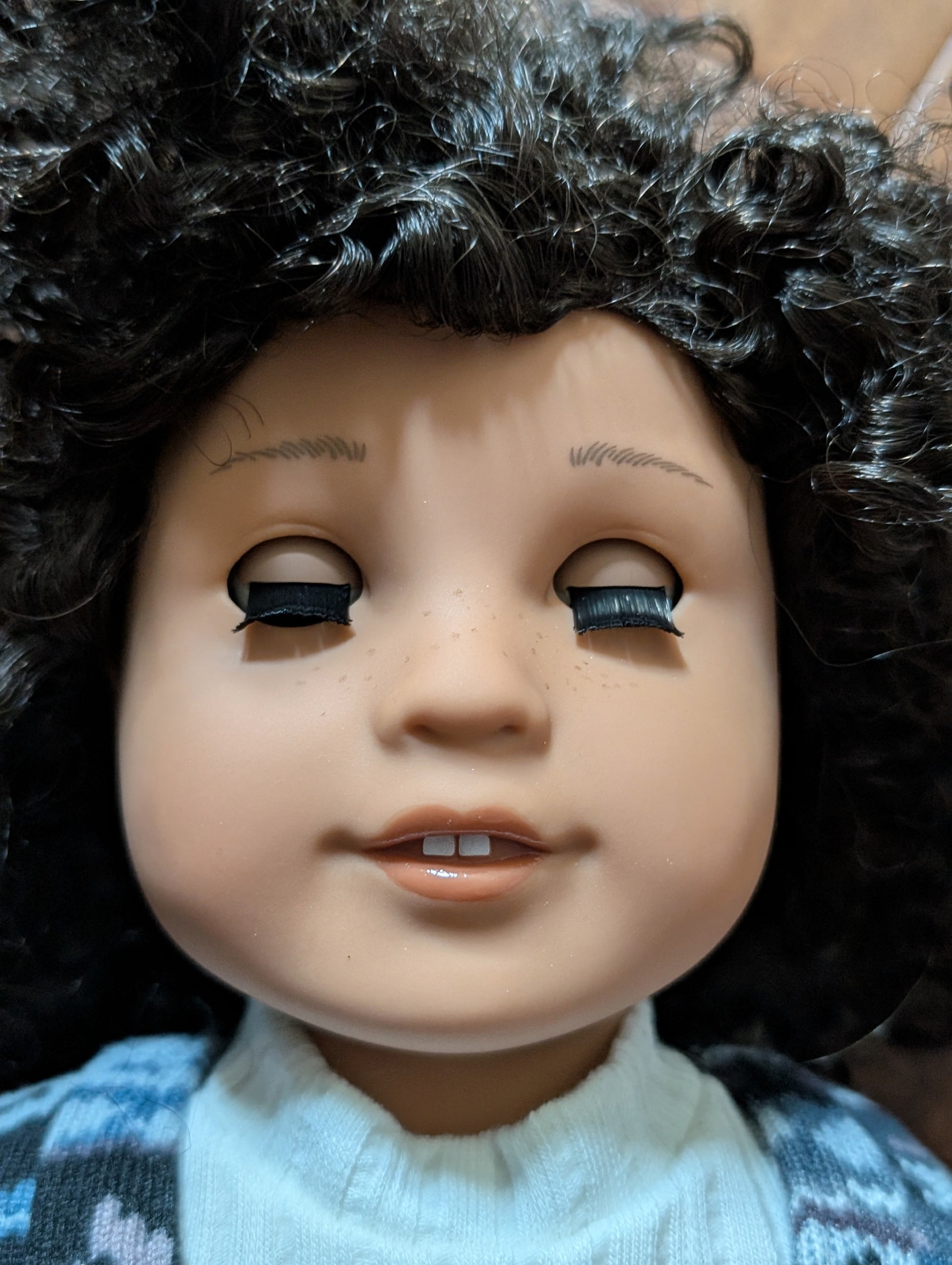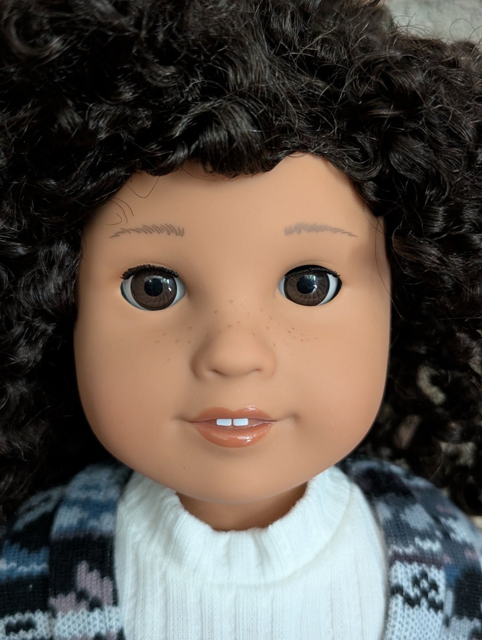 This one of a kind OOAK custom American Girl doll was created with a new doll, a dark brown wig, and brown eyes. She has lip gloss and freckles that were hand painted and sealed. She may have some minor shine marks from handling. She comes with the outfit pictured. She has the microfiber cloth body.