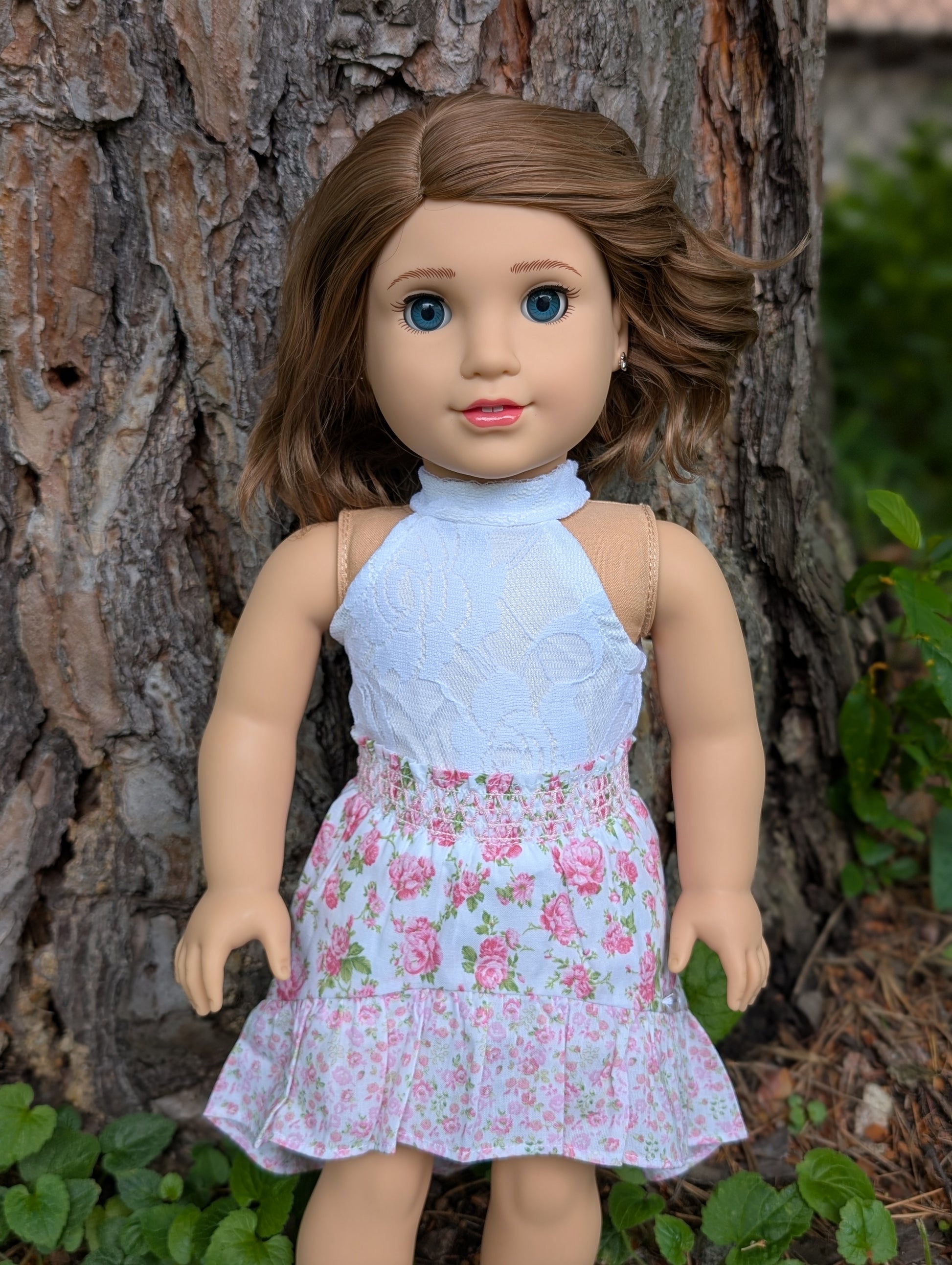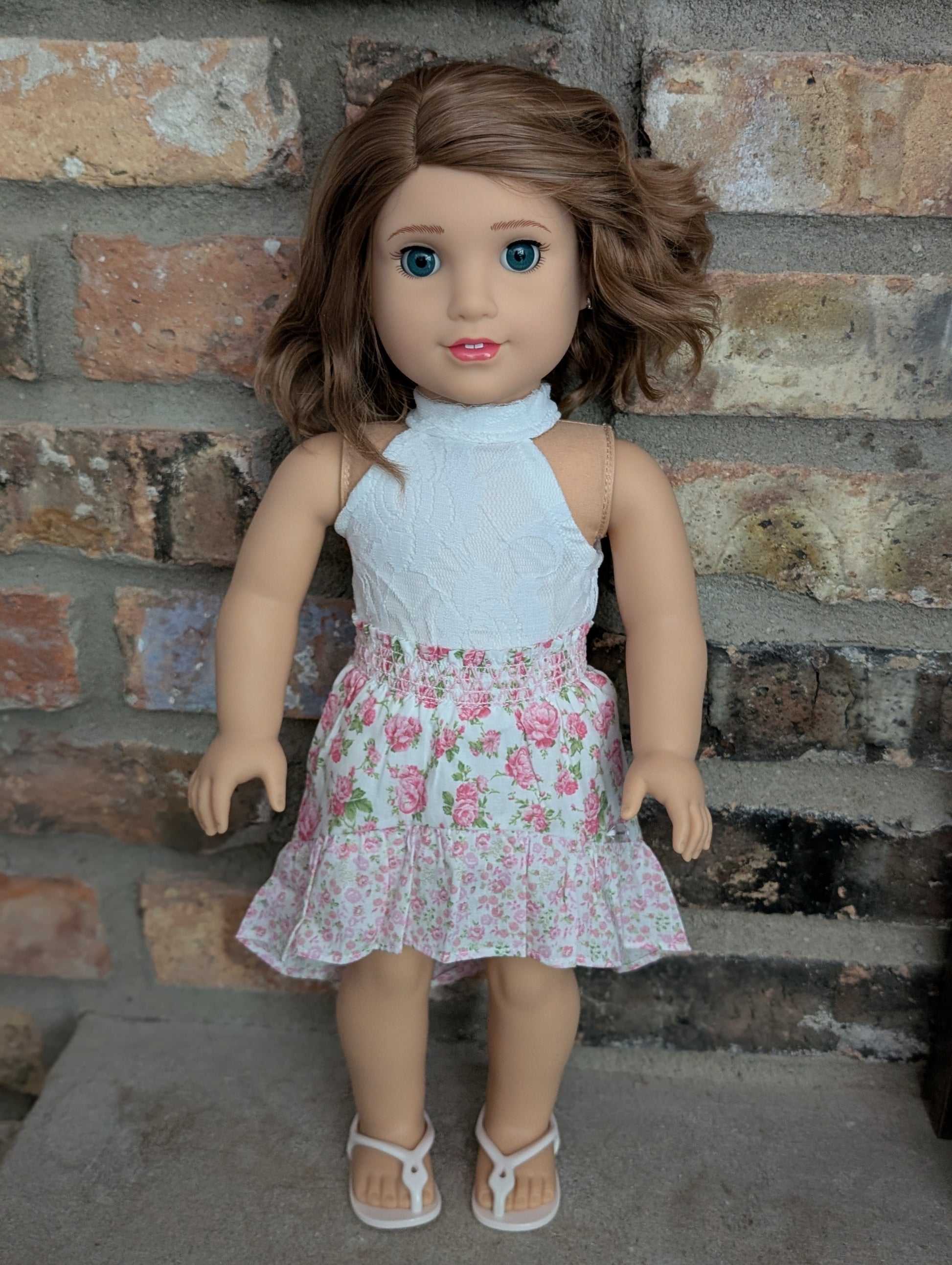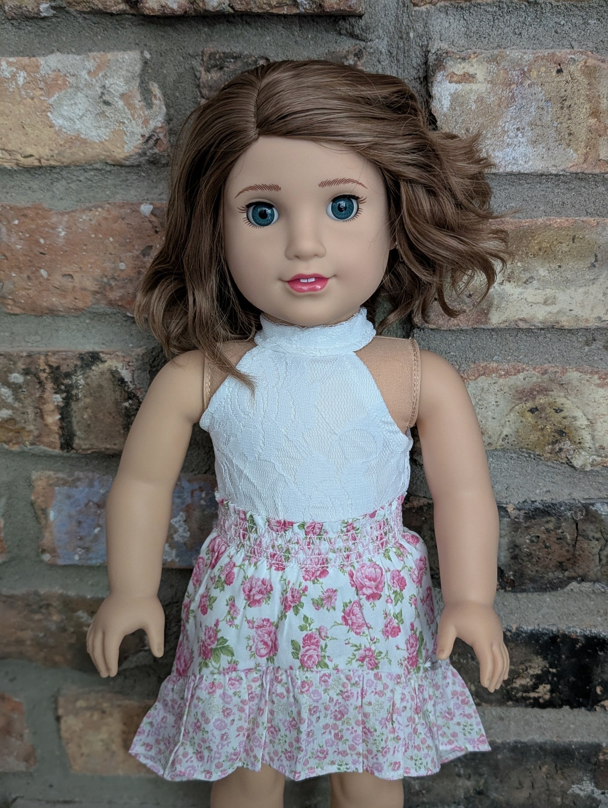 This one of a kind OOAK custom American Girl doll was created with a brand new Belle doll, a brown wig, and blue eyes. She has lip gloss that was hand painted and sealed. She may have some minor shine marks from handling. She comes with the outfit pictured. Her ears are pierced with American Girl doll sized earrings.