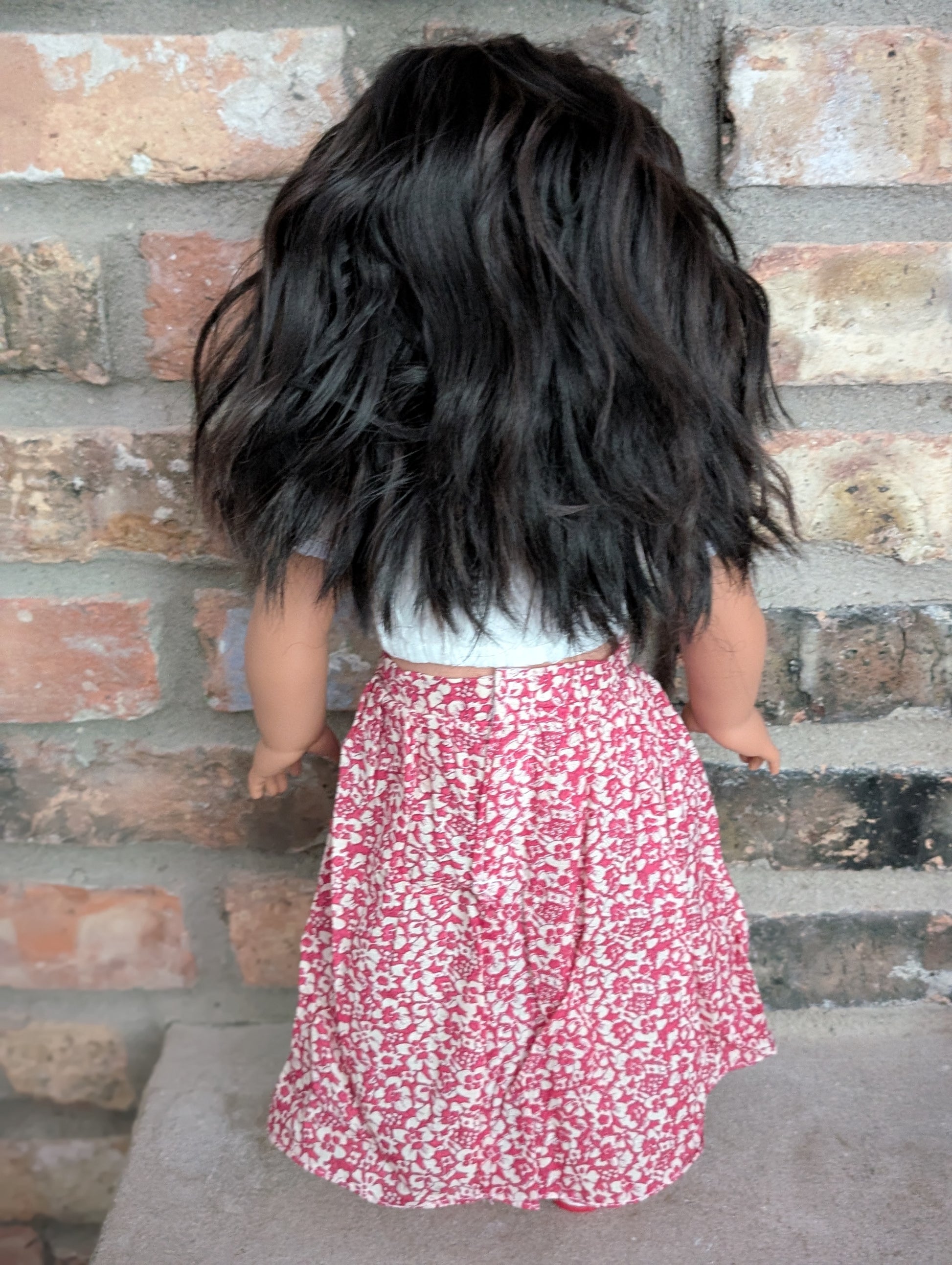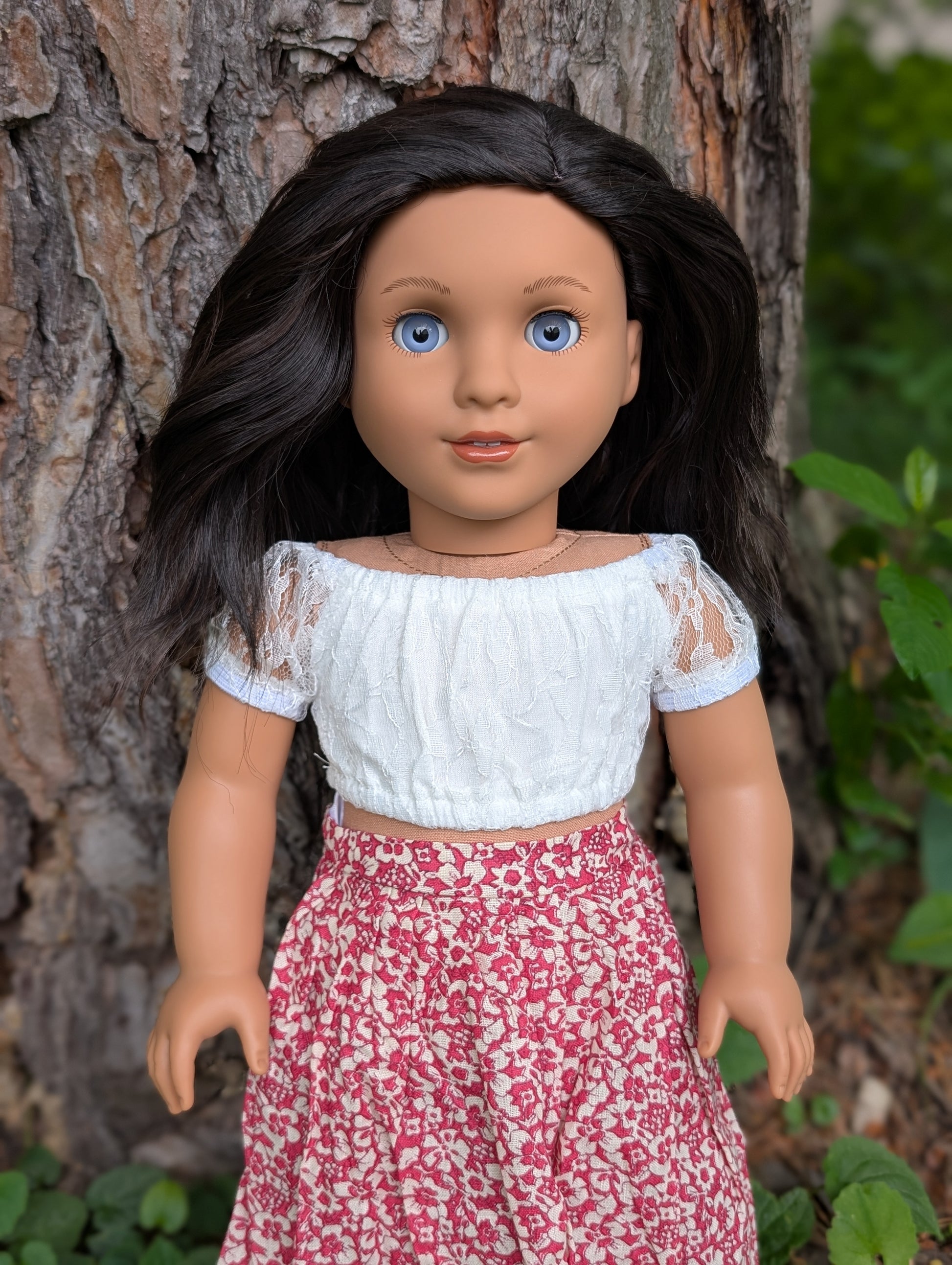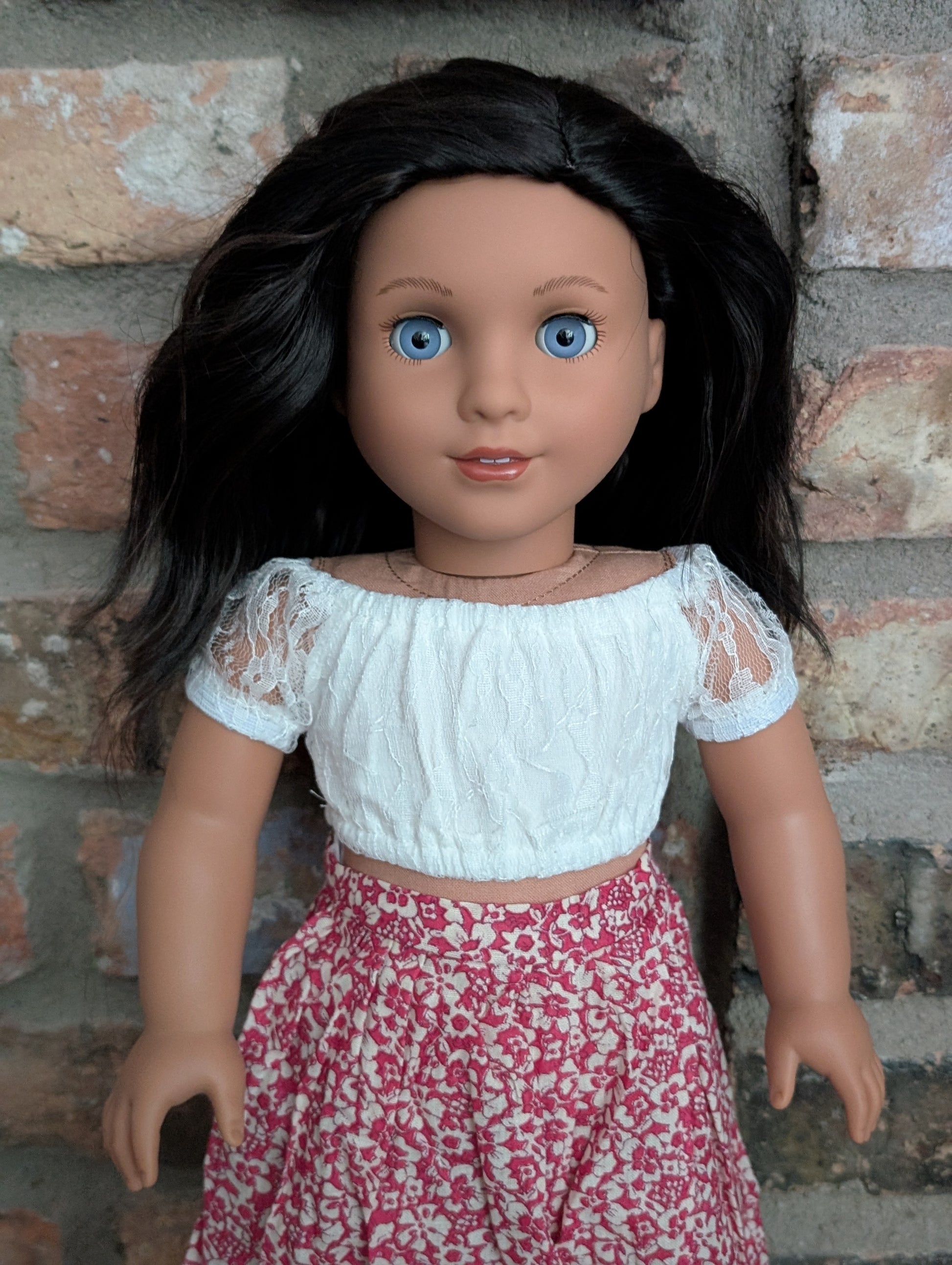 This one of a kind OOAK custom American Girl doll was created with a brand new doll, a dark brown wig, and blue from Etsy. She has lip gloss that was hand painted and sealed. She may have some minor shine marks from handling. She comes with the outfit pictured.