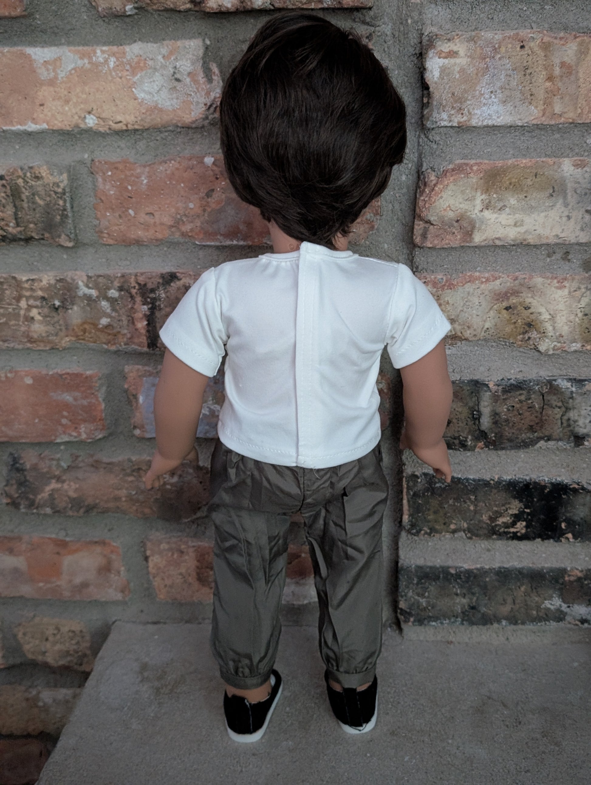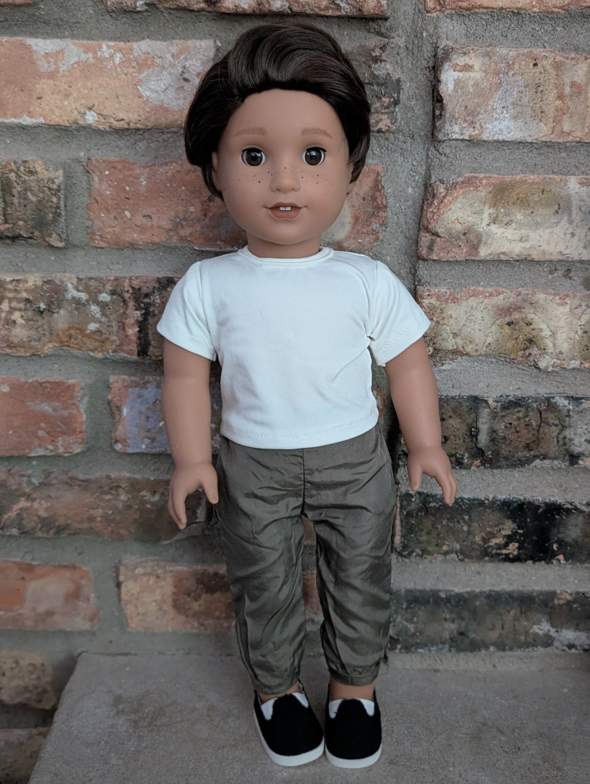 This one of a kind OOAK custom boy American Girl doll was created with a brand new doll, a dark brown wig, and brown eyes. His eyebrows have been removed and hand-painted. In addition, he has freckles that were hand-painted and sealed. He may have some minor shine marks from handling. He comes with the outfit pictured.