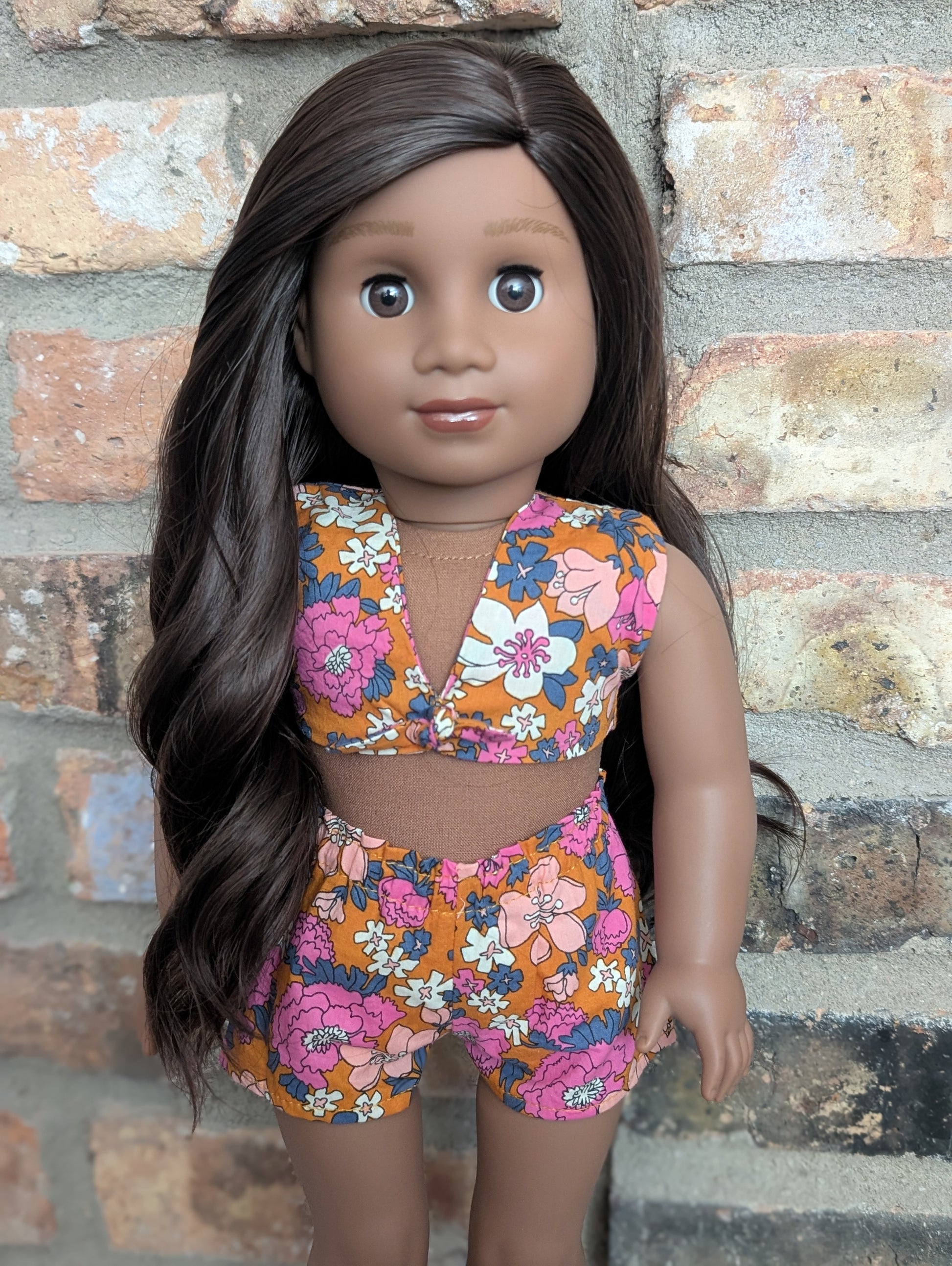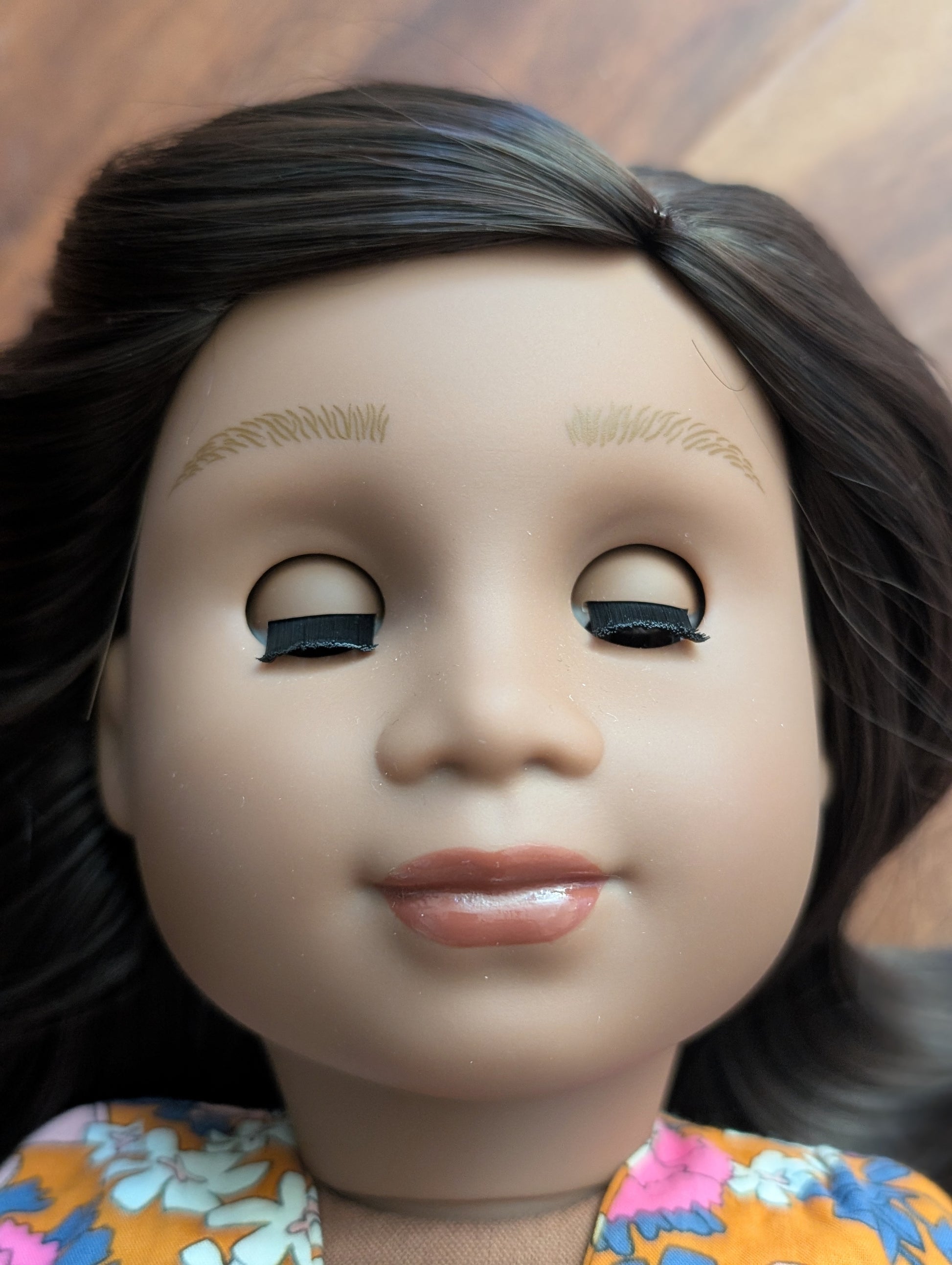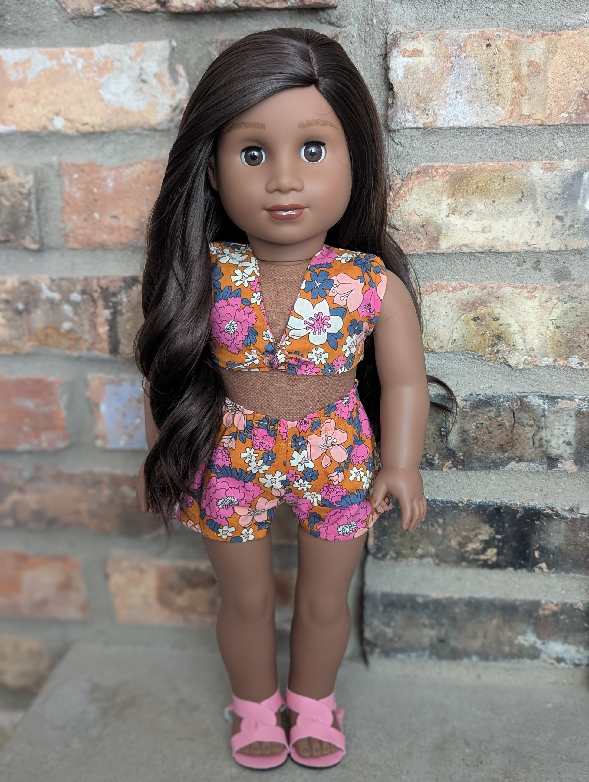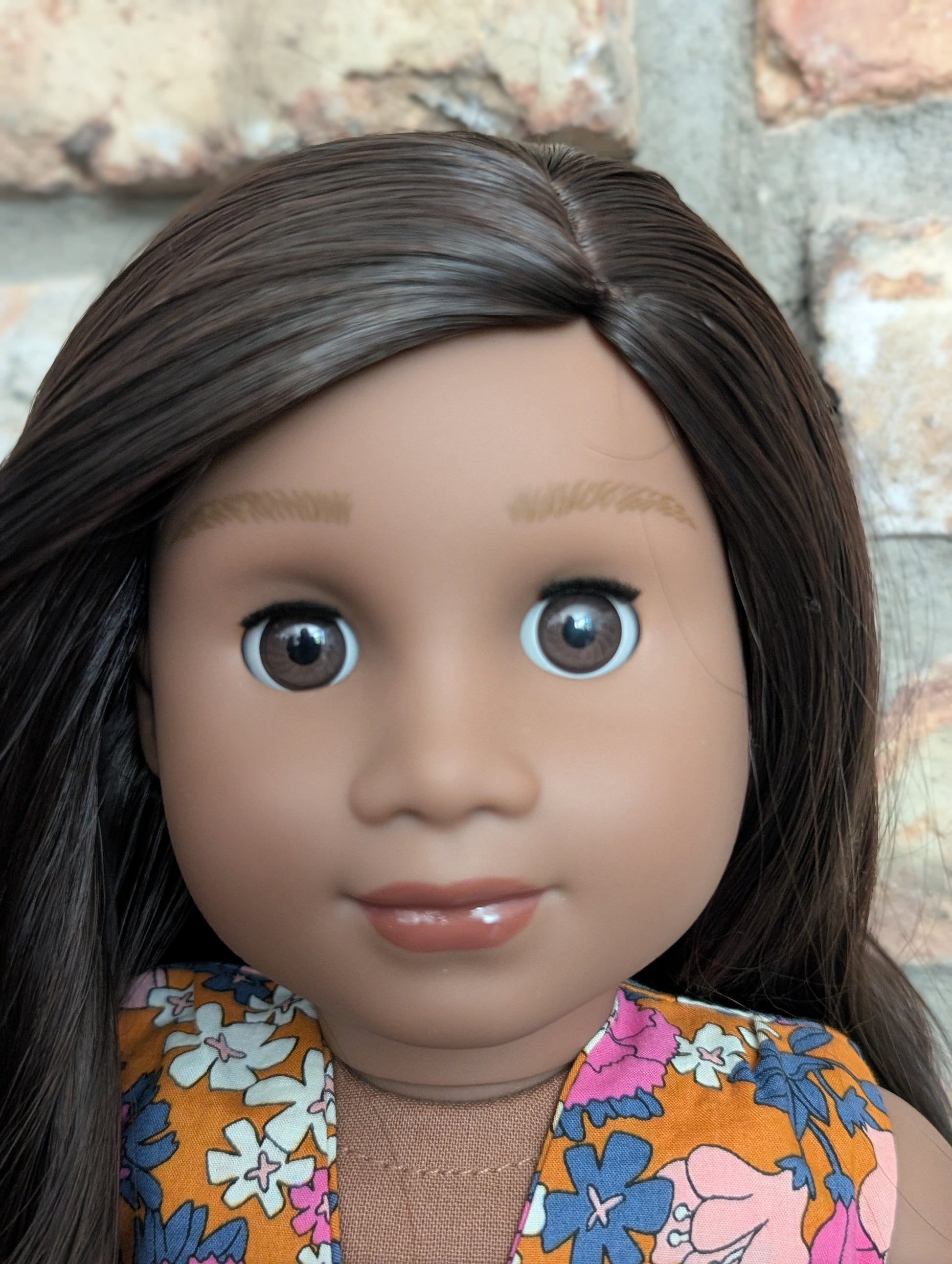 This one of a kind OOAK custom American Girl doll was created with a brand new doll, a brown wig, and brown eyes. She has lip gloss that was hand painted and sealed. She may have some minor shine marks from handling. She comes with the outfit pictured.