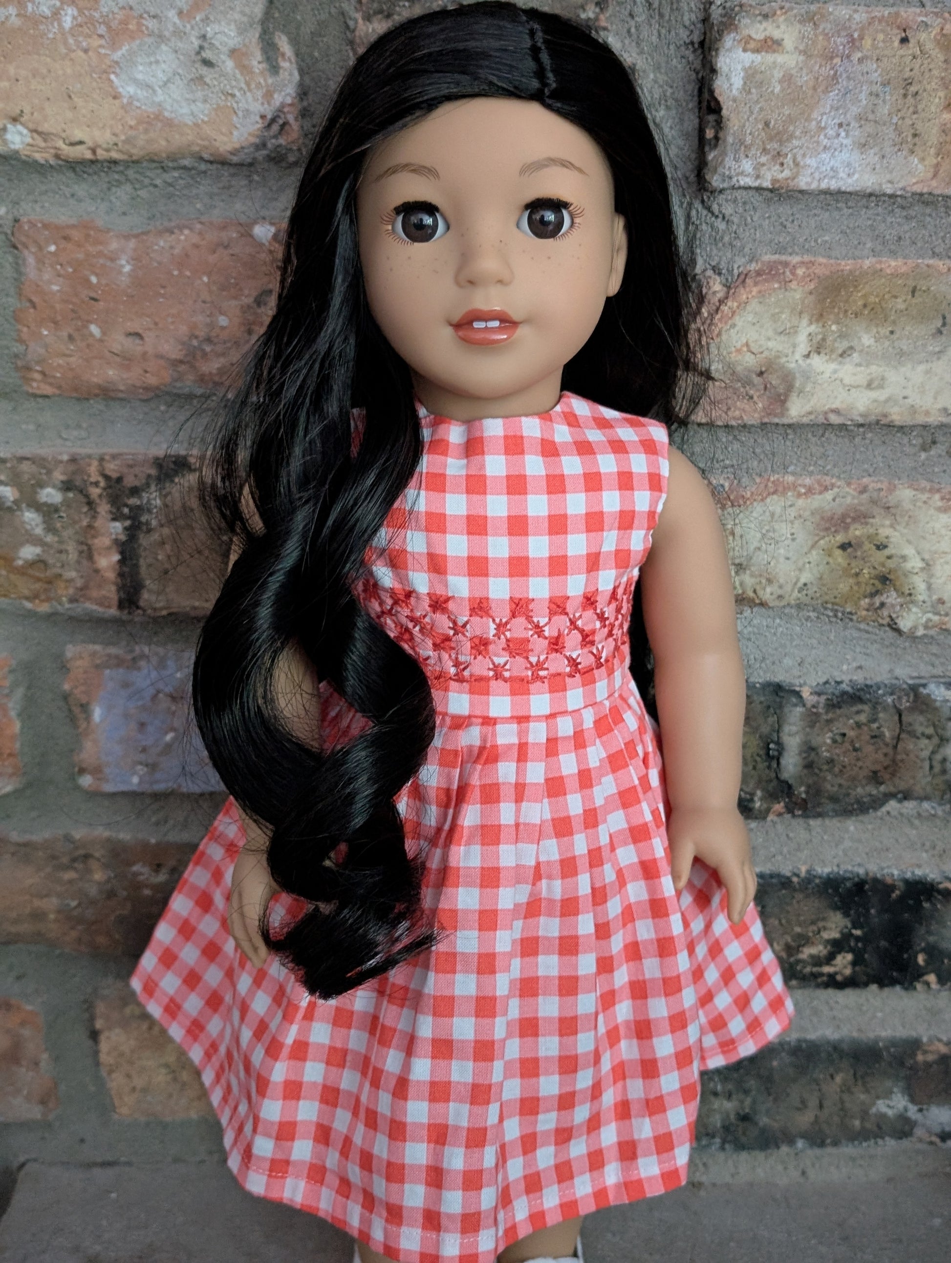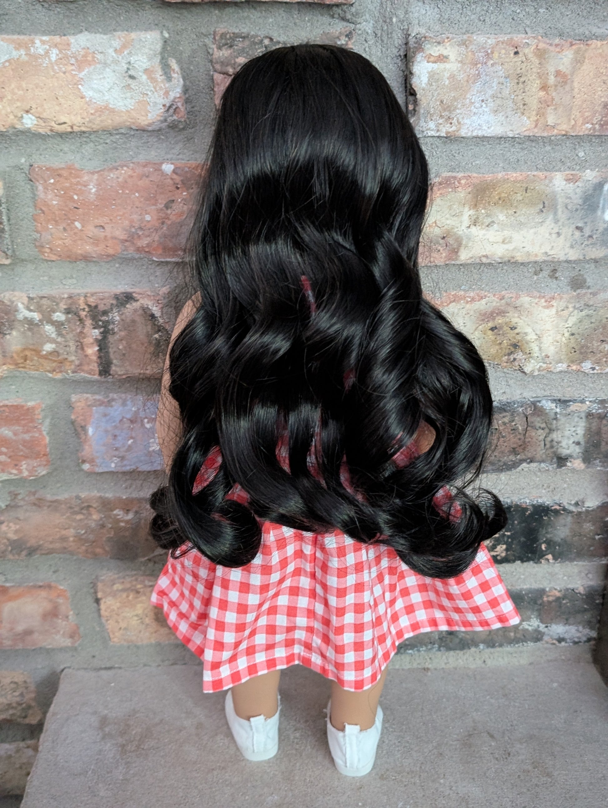 This one of a kind OOAK custom American Girl doll was created with a brand new doll, a black wig, and brown eyes. She has lip gloss and freckles that were hand painted and sealed. She may have some minor shine marks from handling. She comes with the outfit pictured.