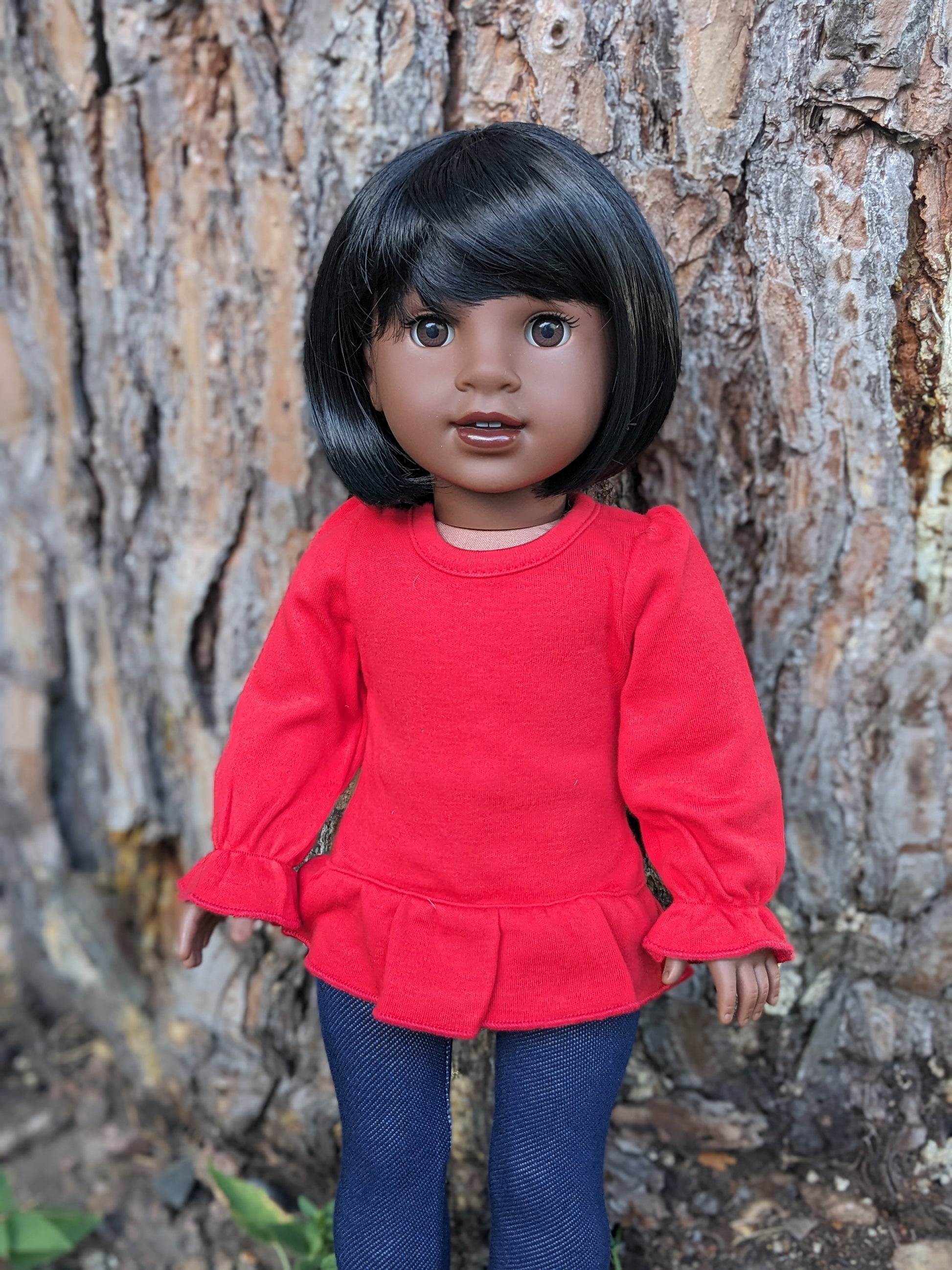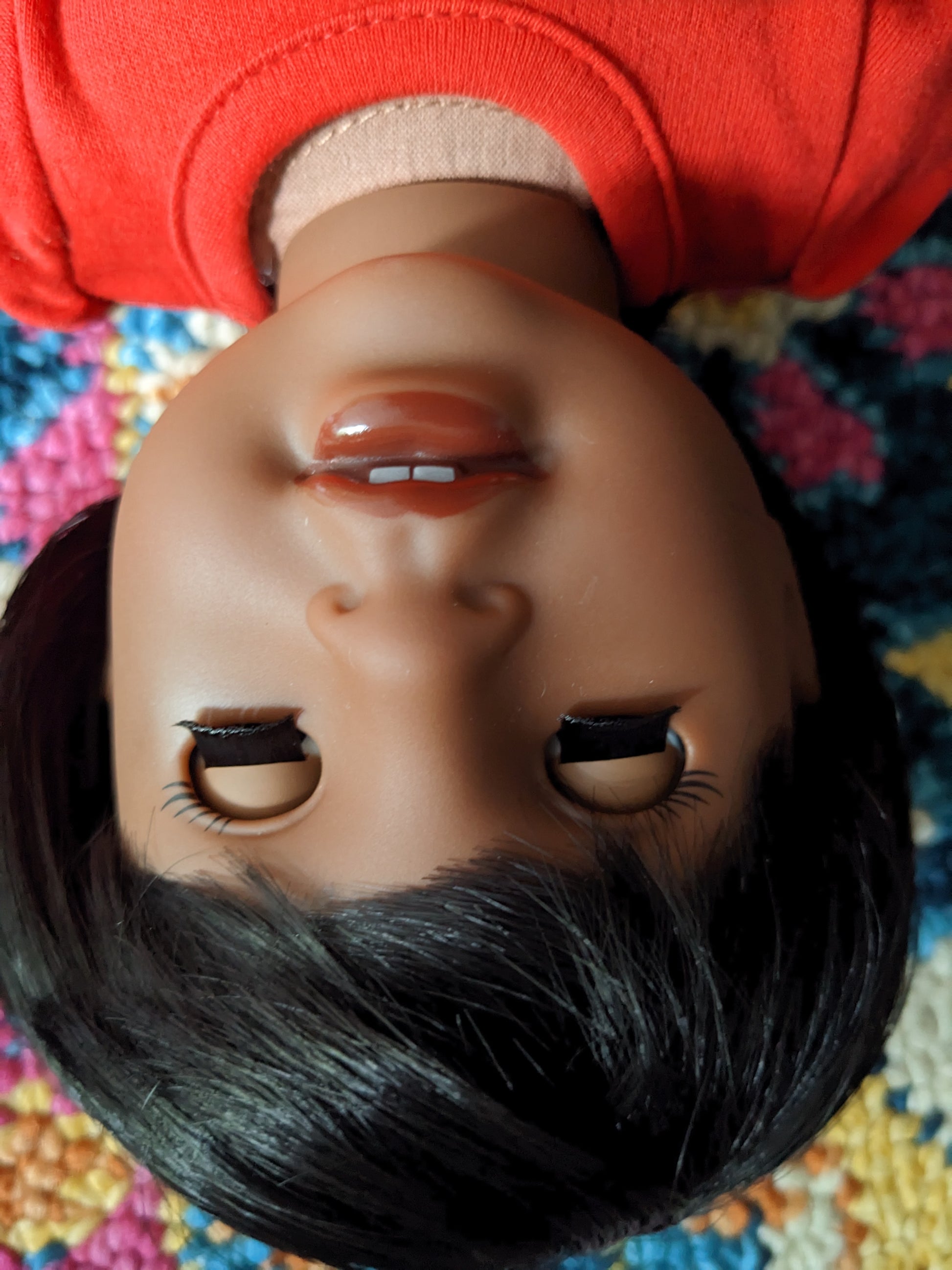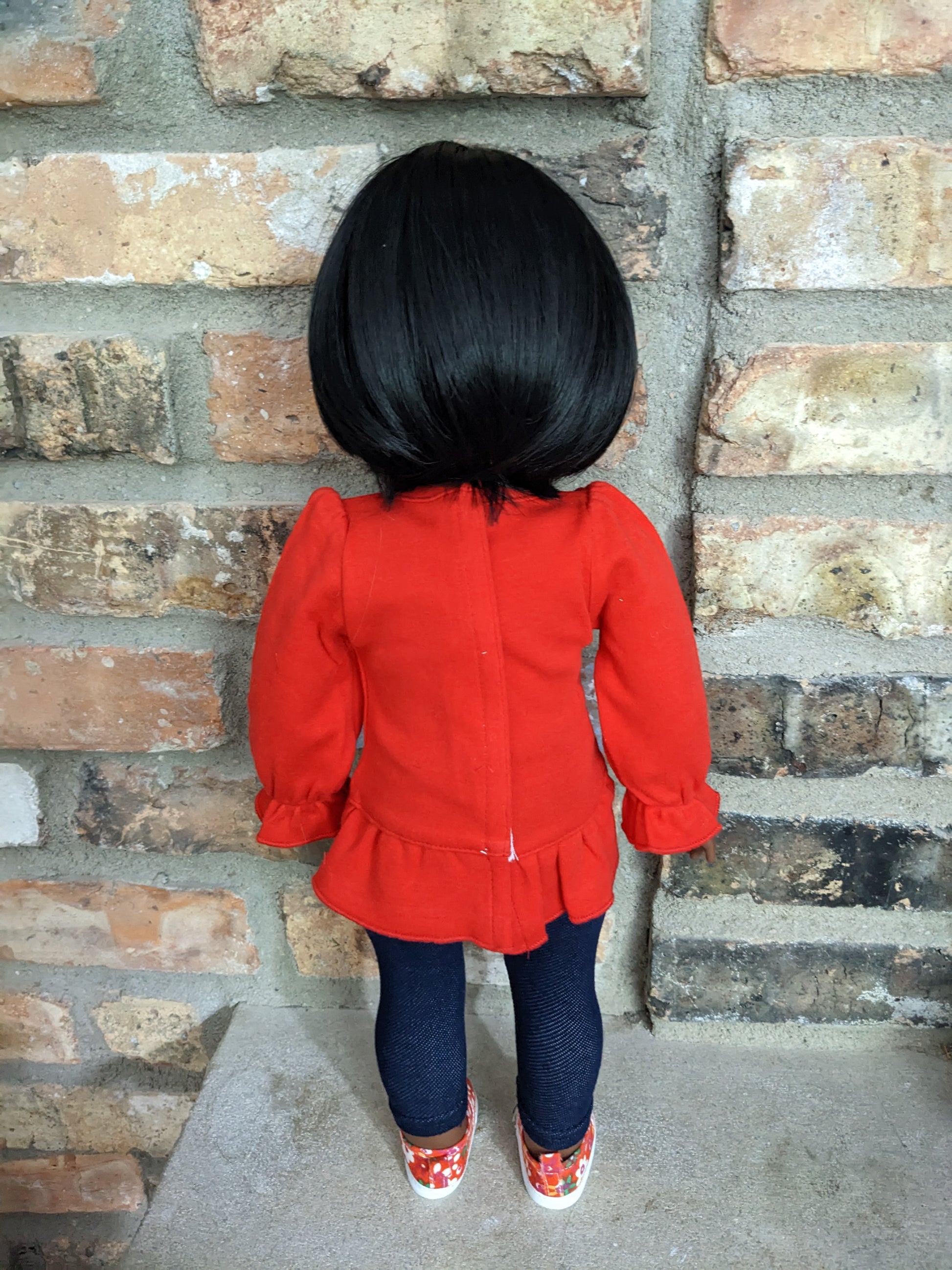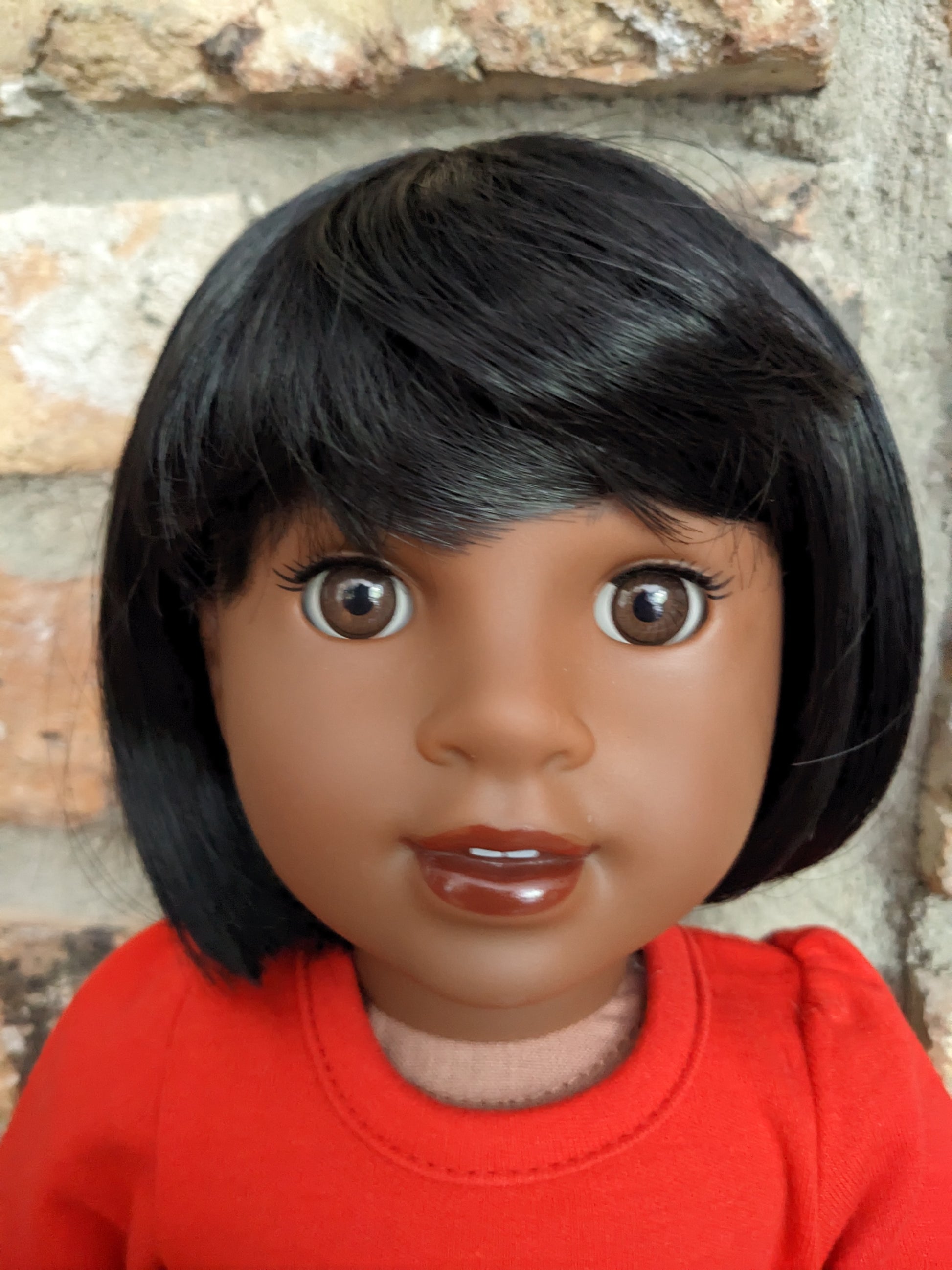 This one of a kind OOAK custom American Girl doll was created with a new doll, a black wig, and brown eyes. She has lip gloss that was hand painted and sealed. She may have some minor shine marks from handling. She comes with the outfit pictured. Her lower painted on eyelashes have been removed.