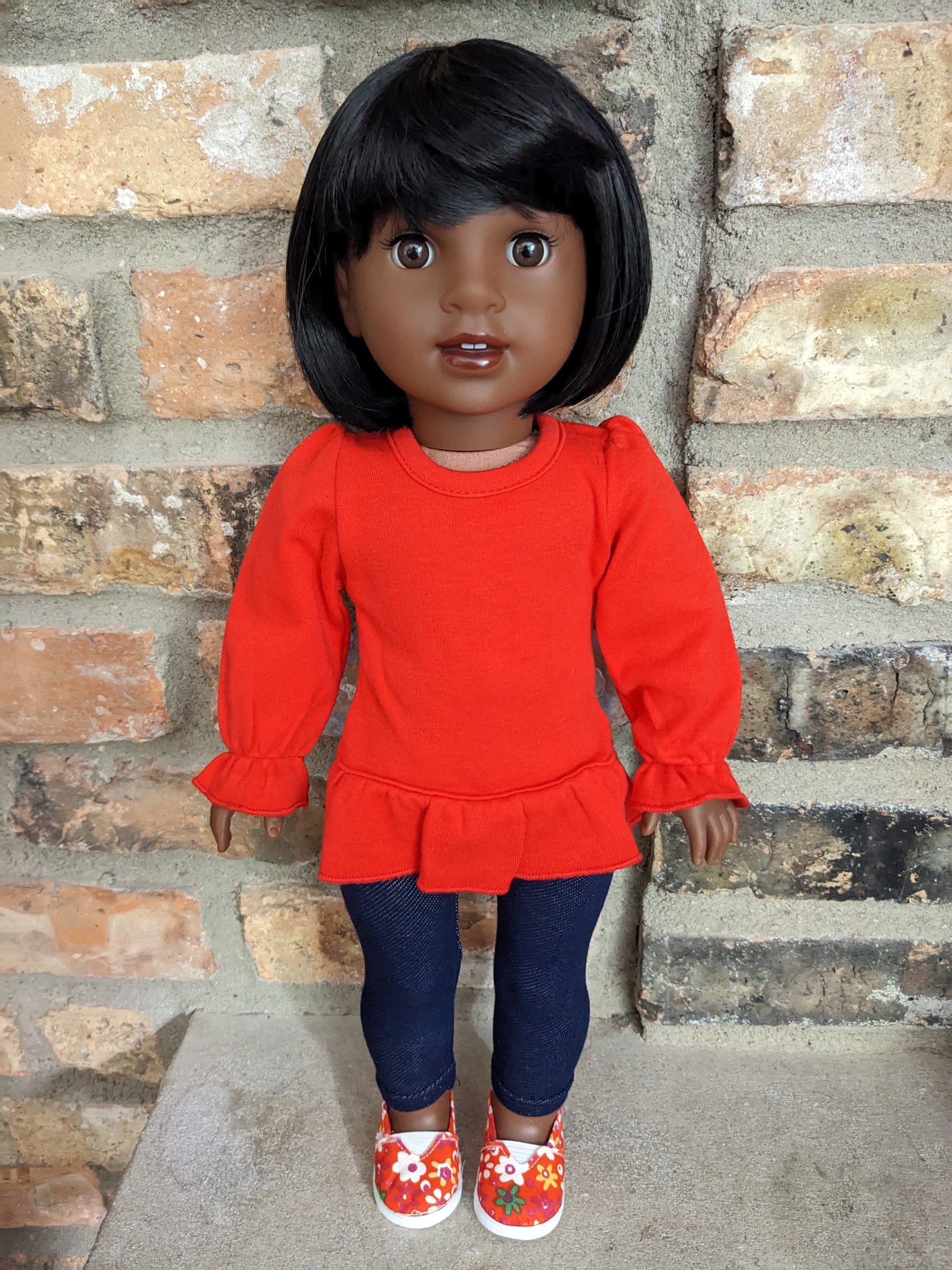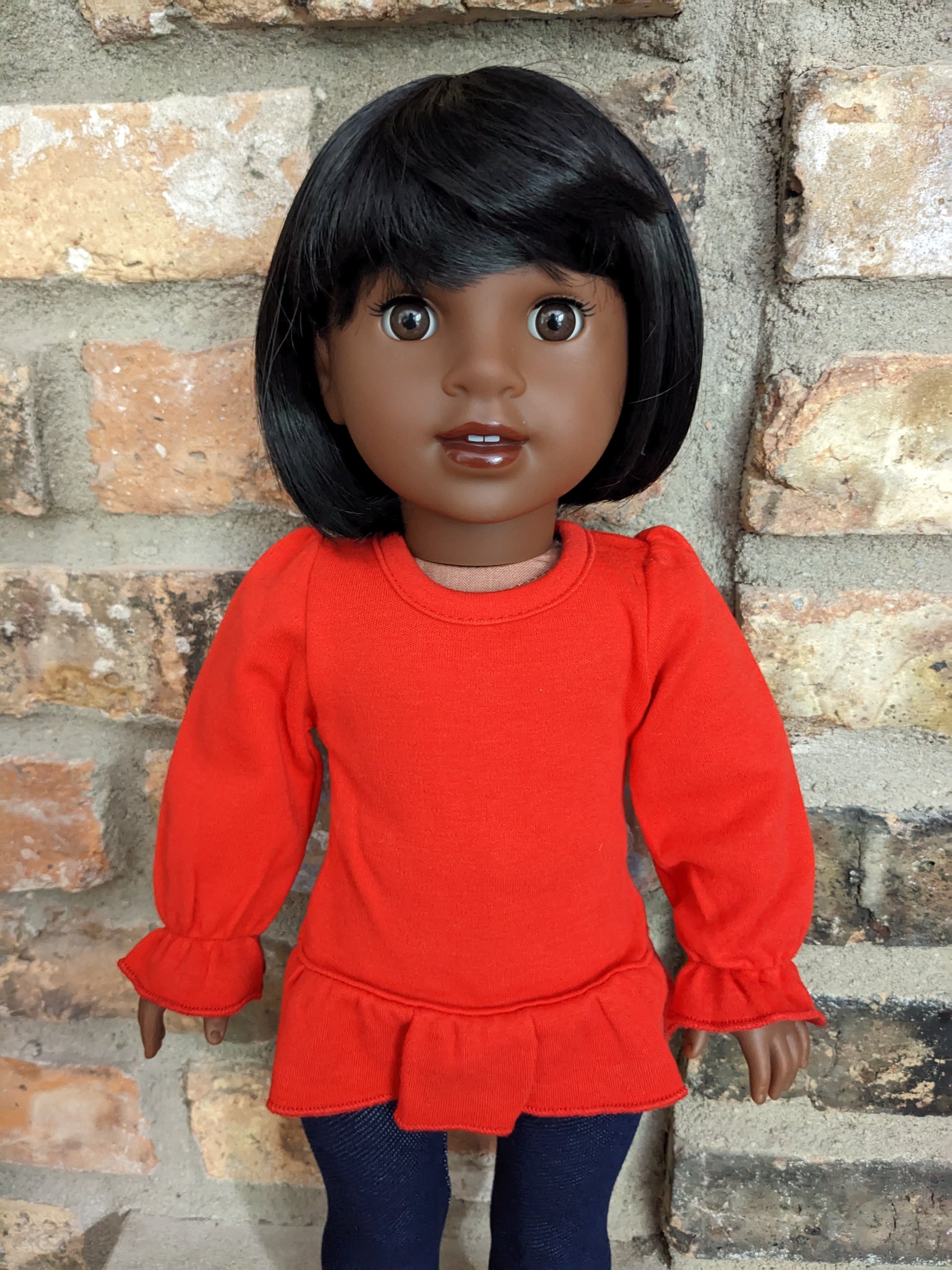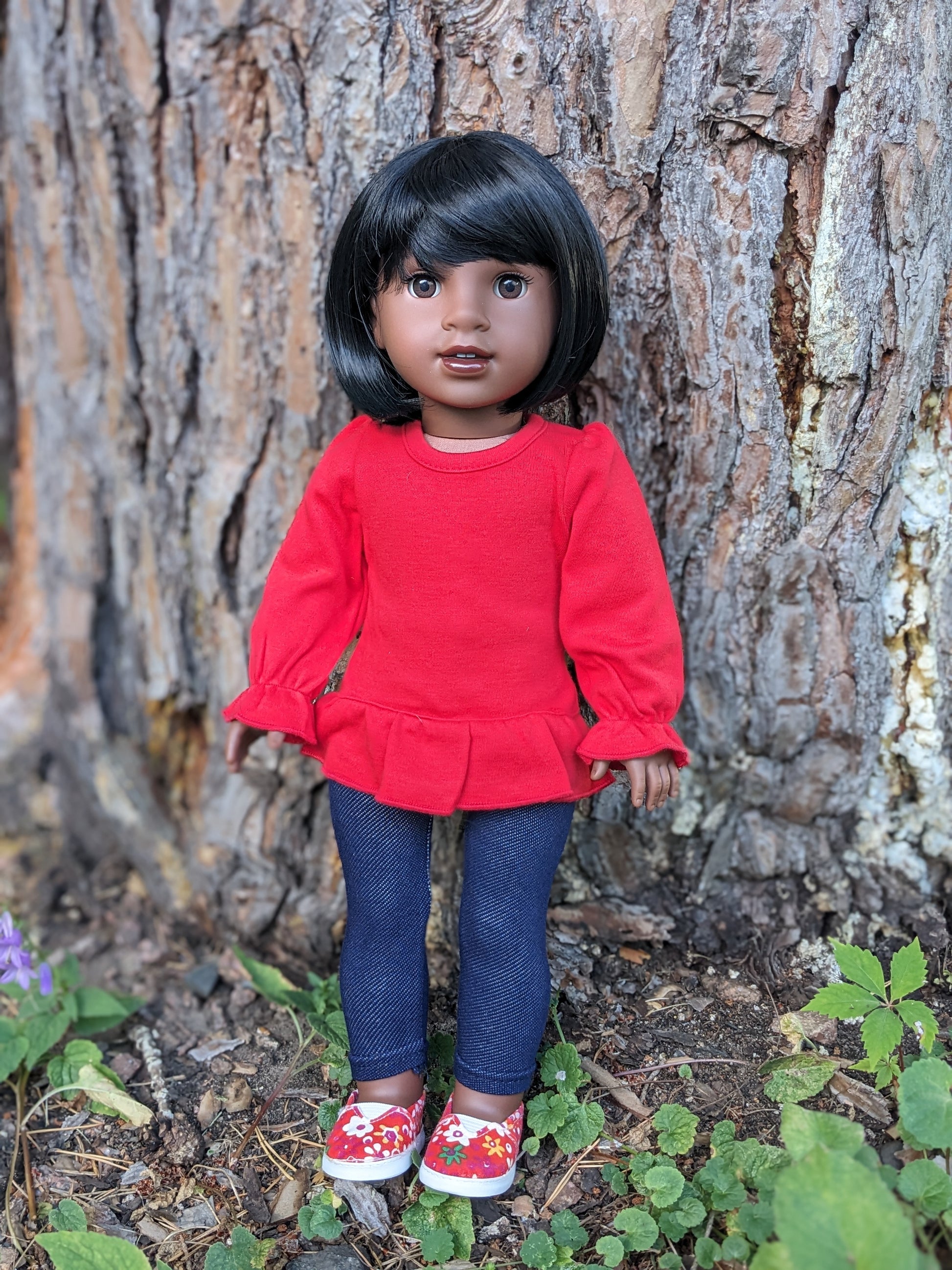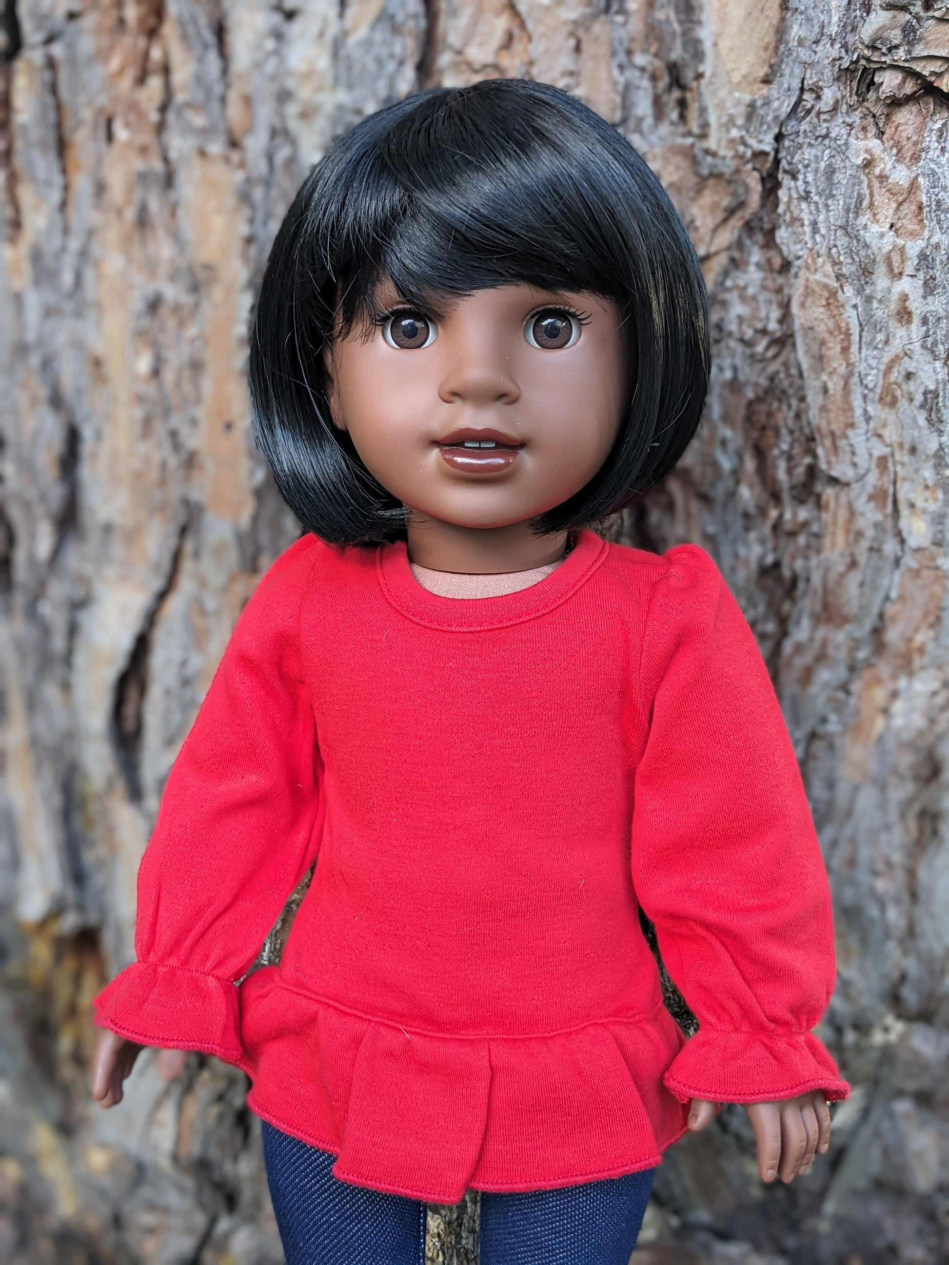 This one of a kind OOAK custom American Girl doll was created with a new doll, a black wig, and brown eyes. She has lip gloss that was hand painted and sealed. She may have some minor shine marks from handling. She comes with the outfit pictured. Her lower painted on eyelashes have been removed.
