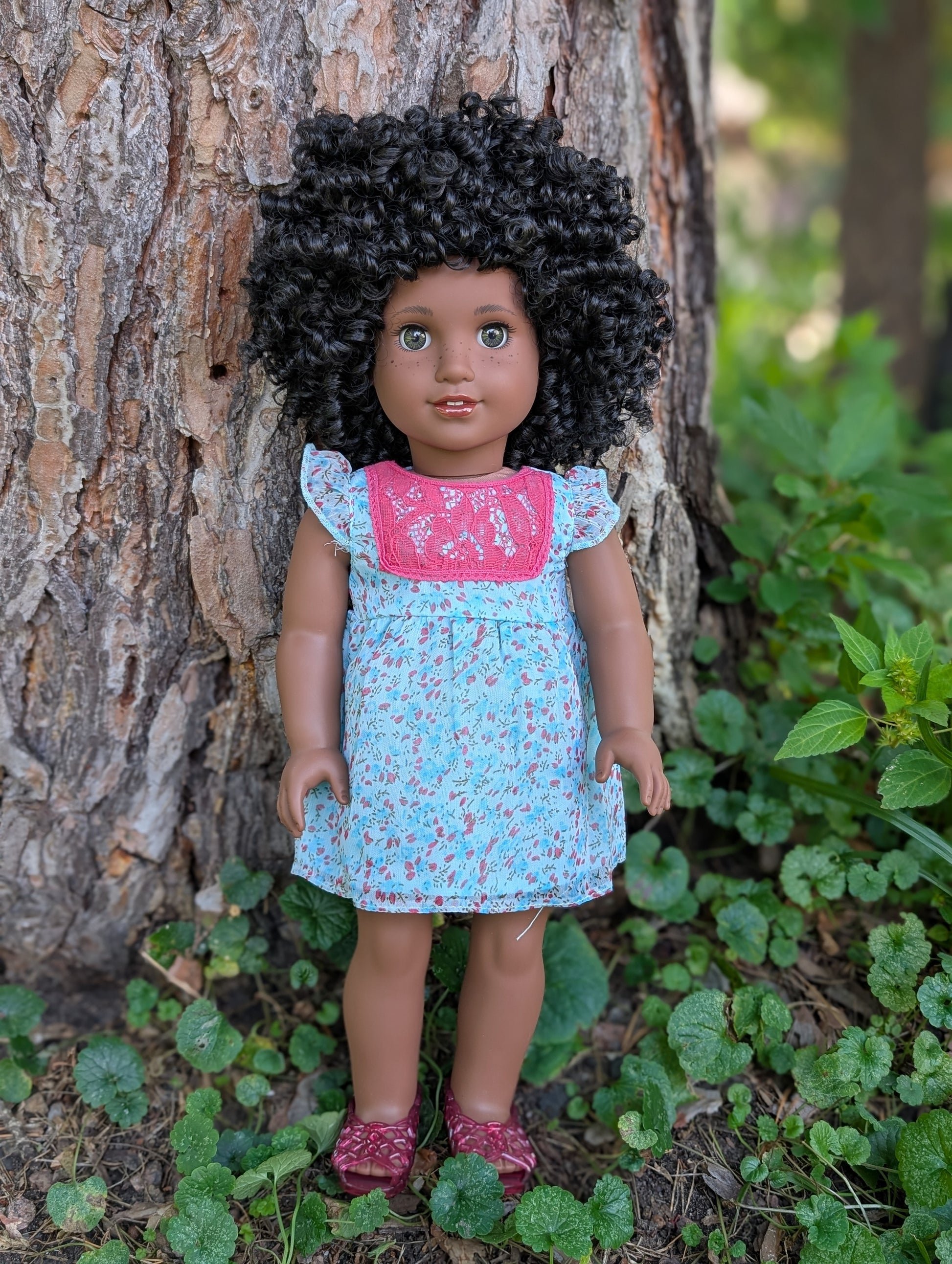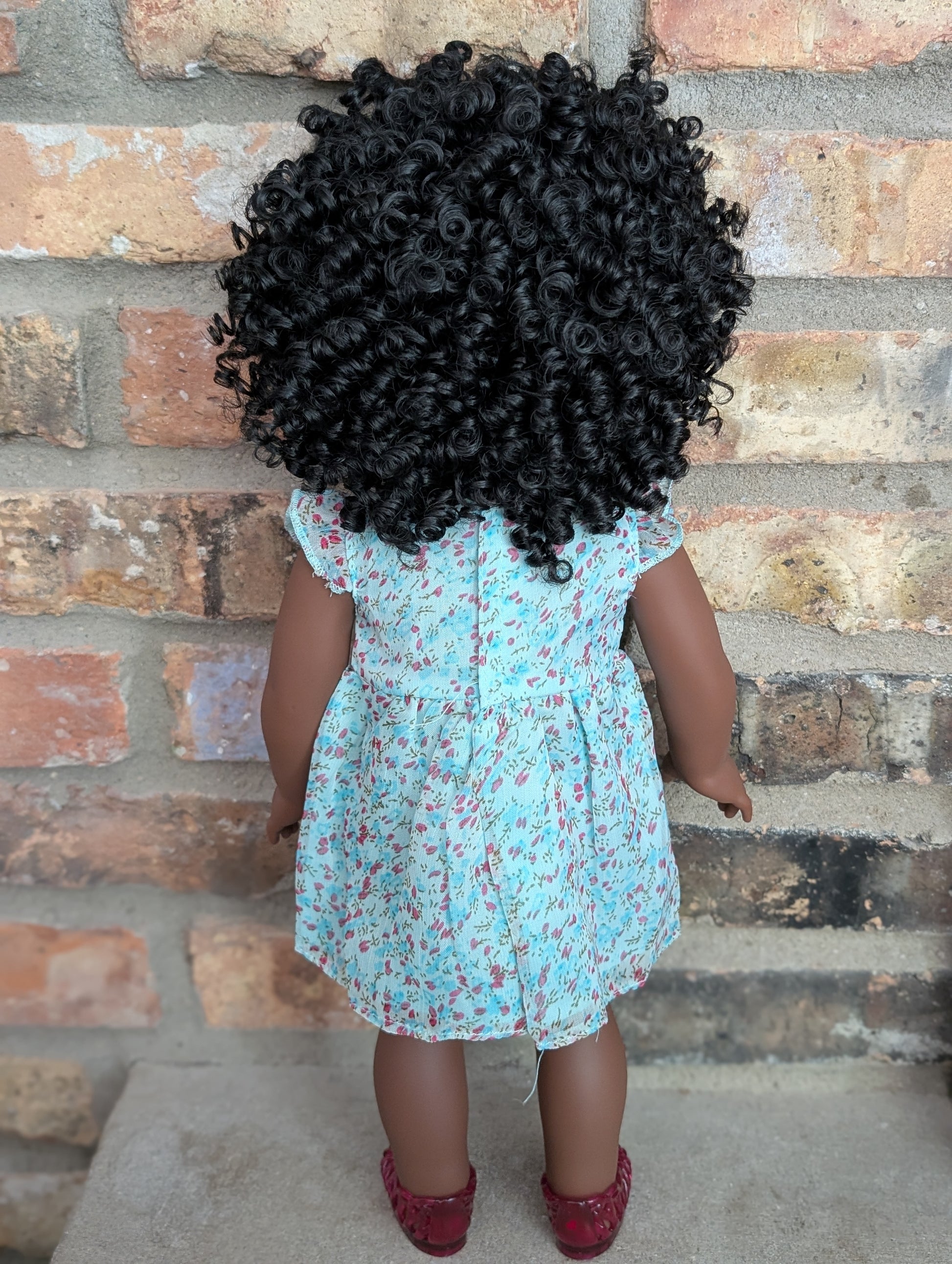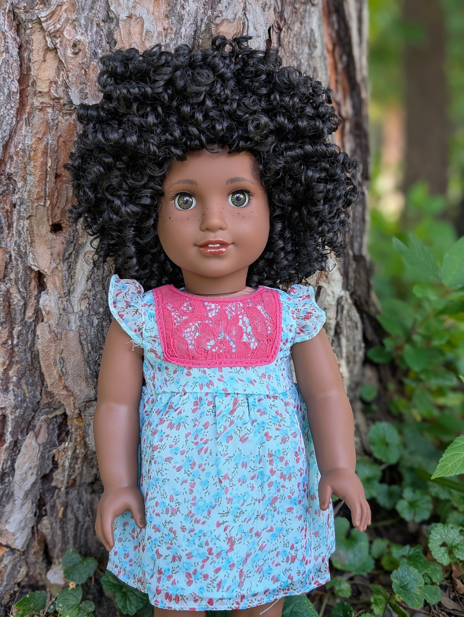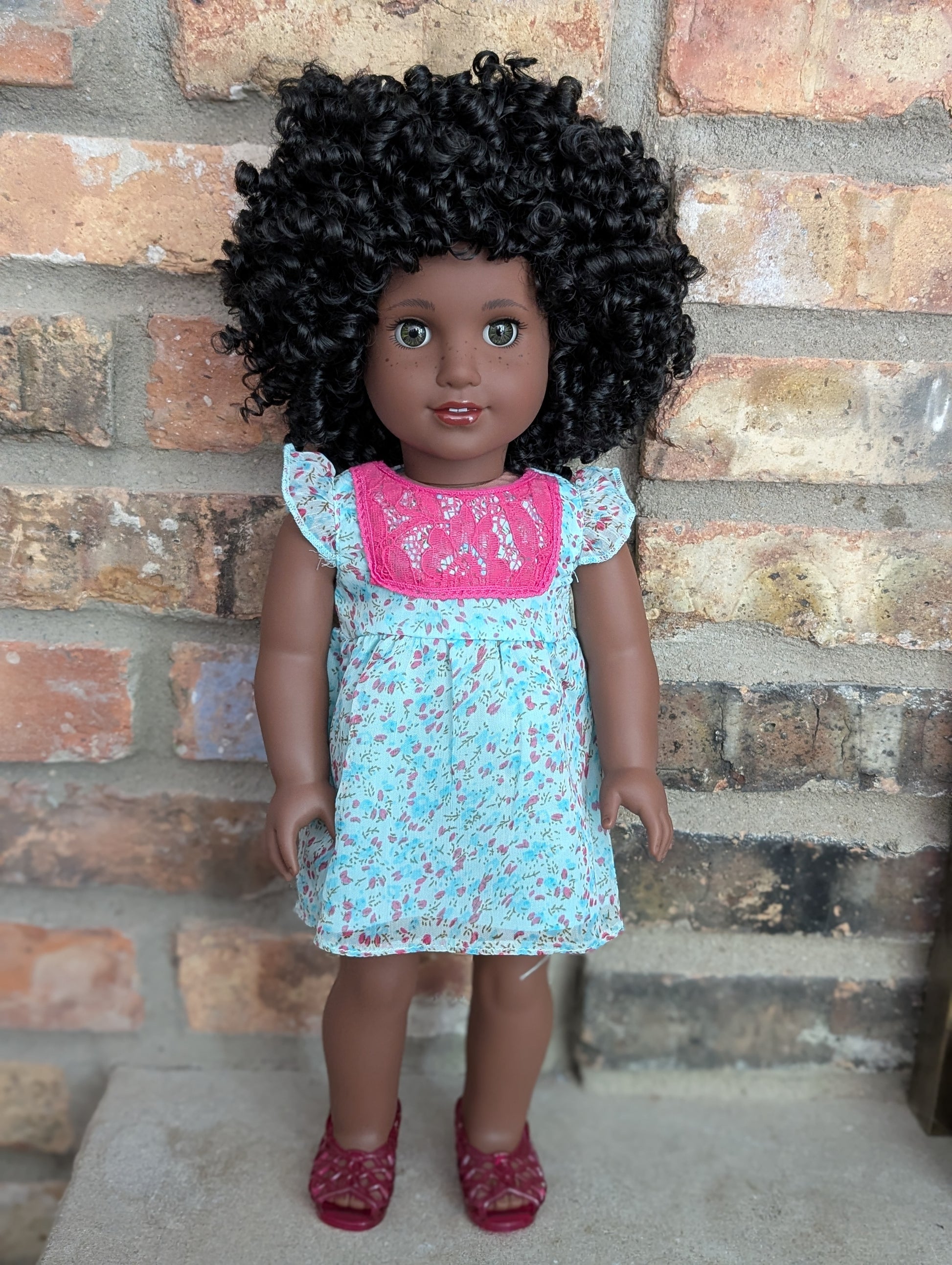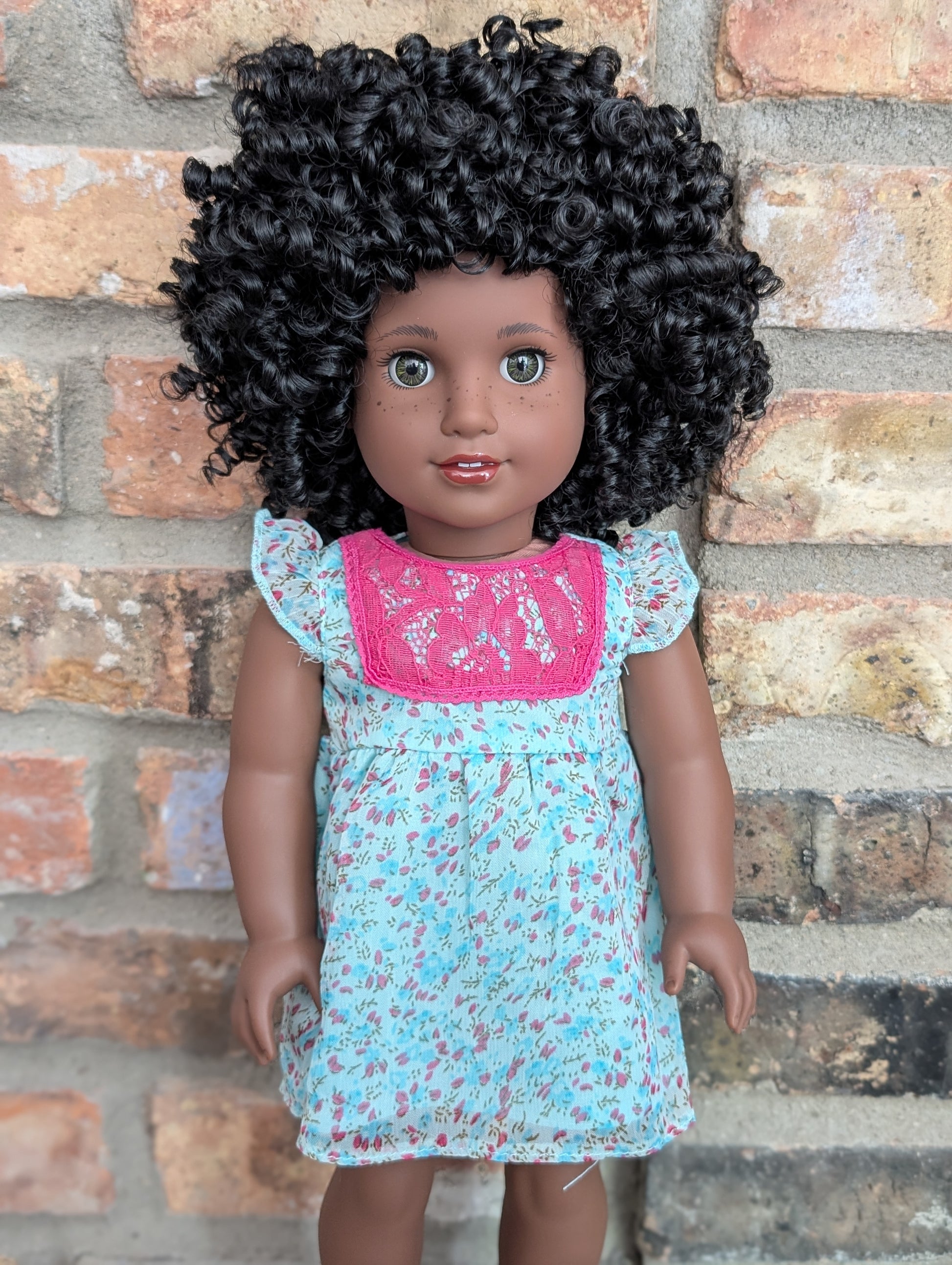 This one of a kind OOAK custom American Girl doll was created with a brand new doll, a black wig, and hazel eyes. She has lip gloss and freckles that were hand painted and sealed. She may have some minor shine marks from handling. She comes with the outfit pictured.
