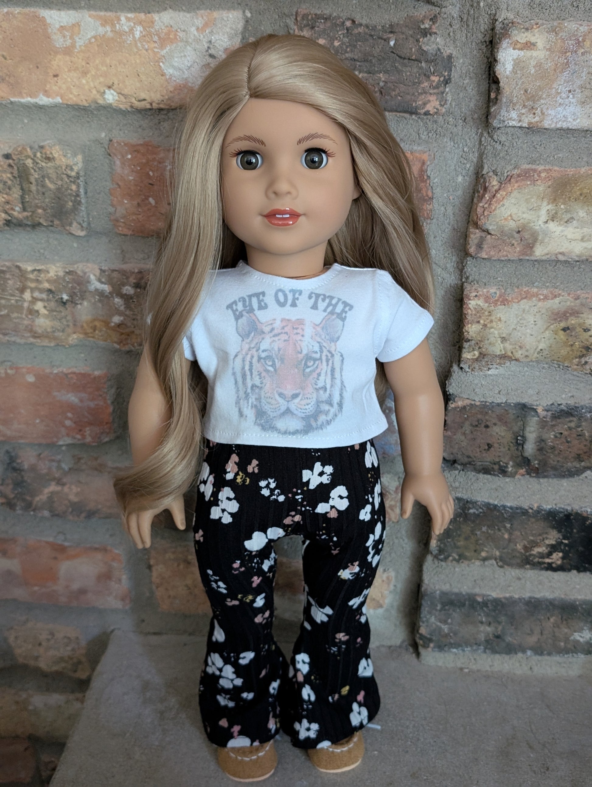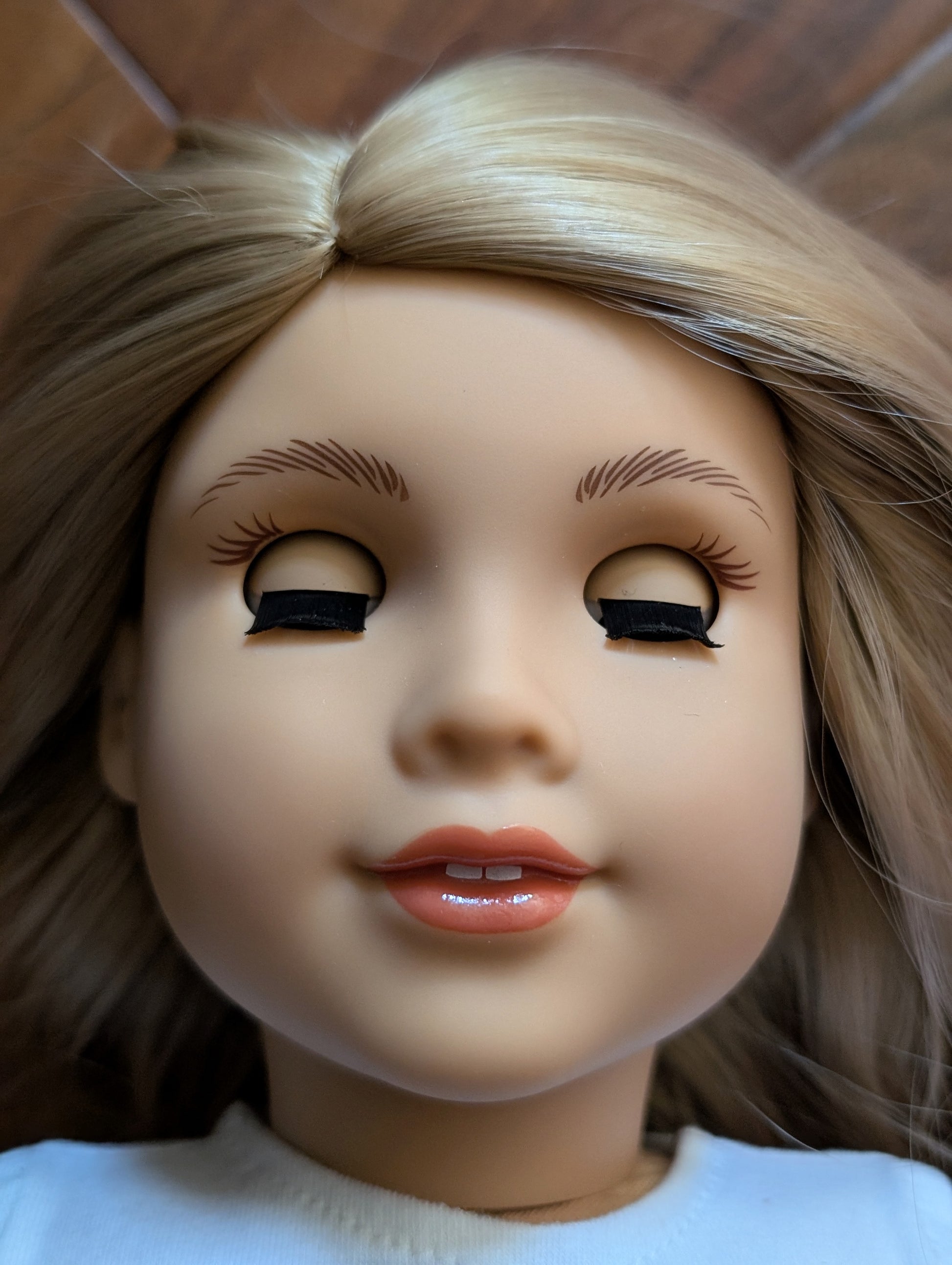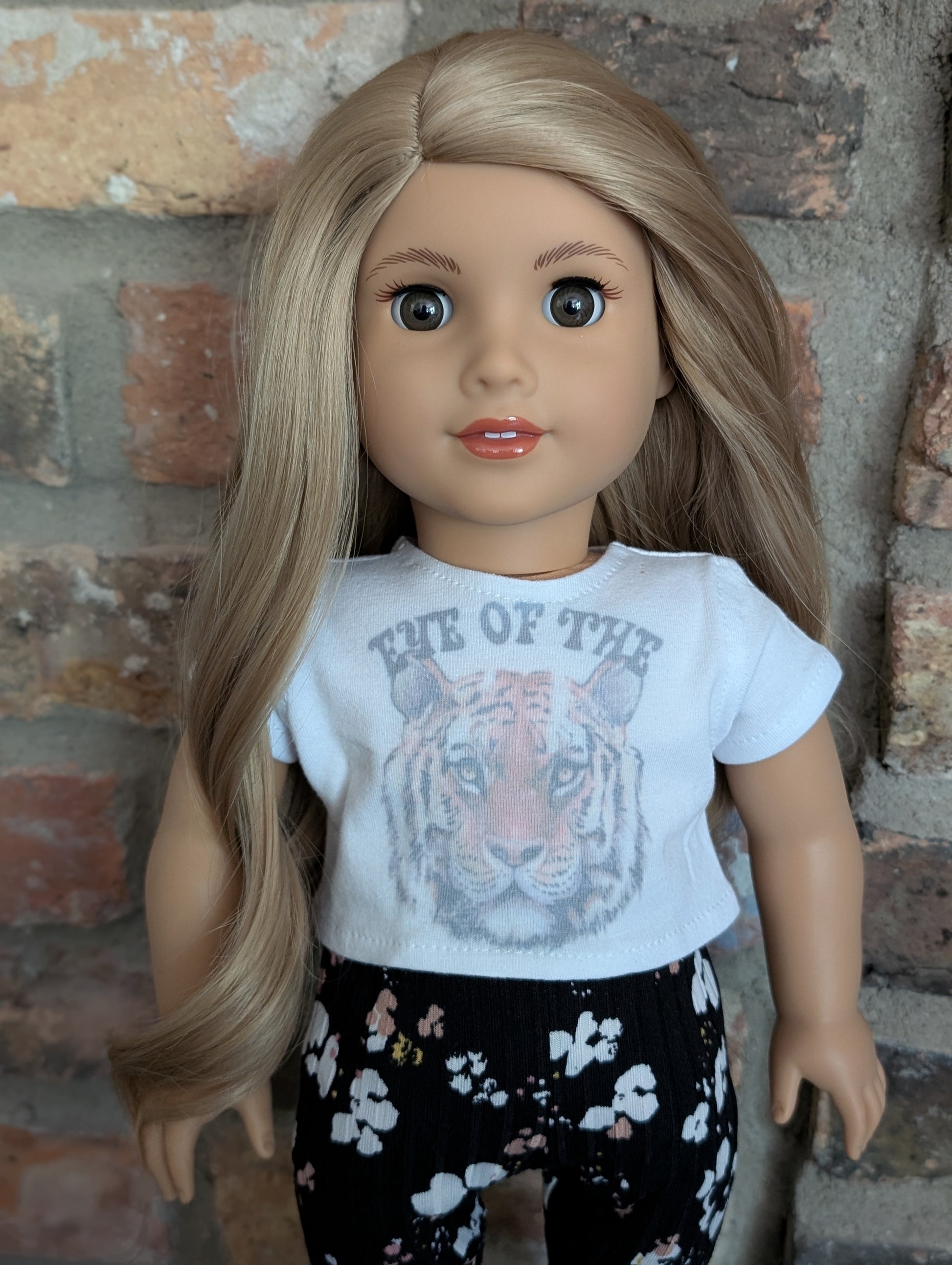 This one of a kind OOAK custom American Girl doll was created with a brand new doll, a blonde wig, and amber eyes. She has lip gloss that was hand painted and sealed. She may have some minor shine marks from handling. She comes with the outfit pictured.