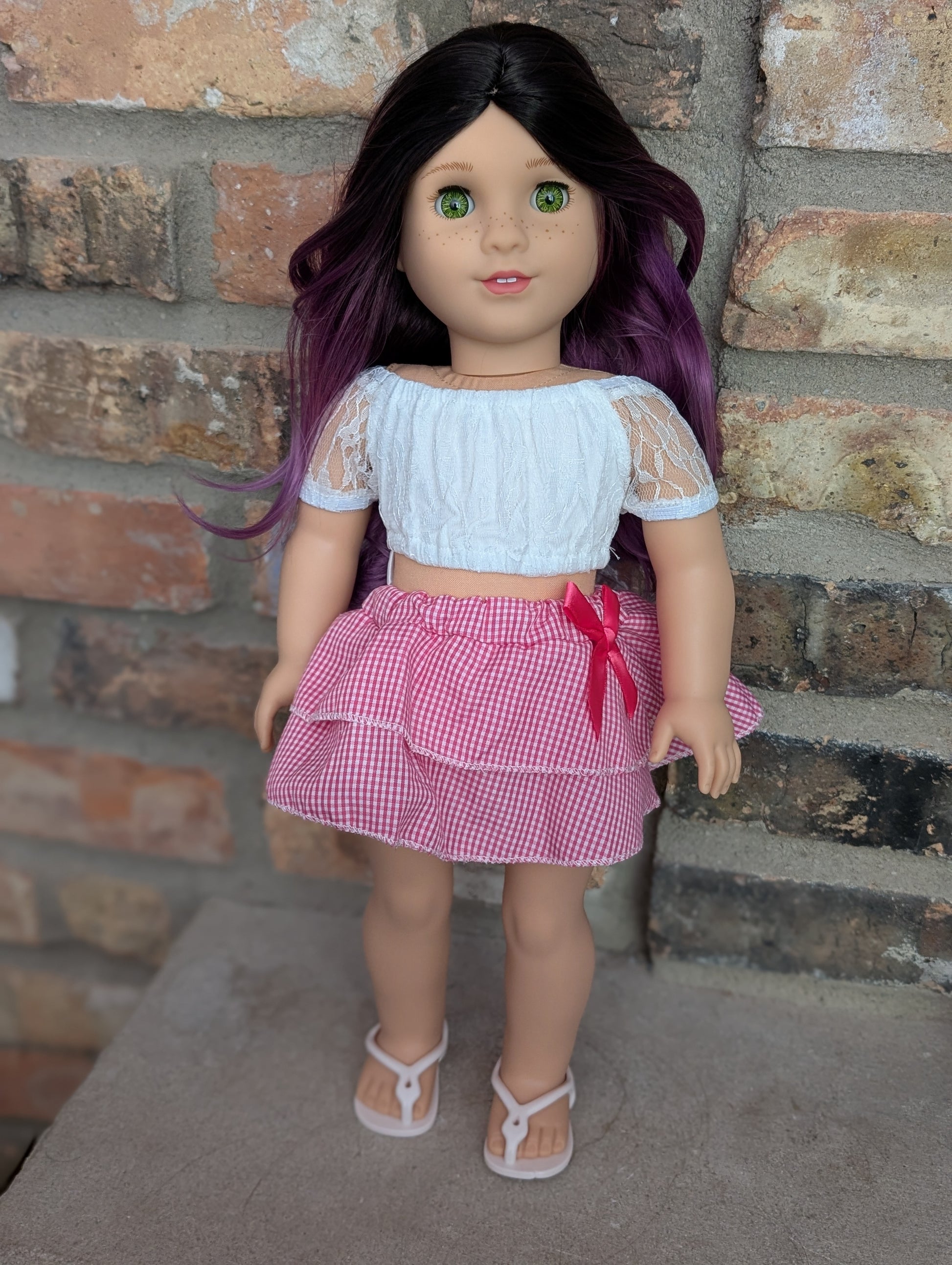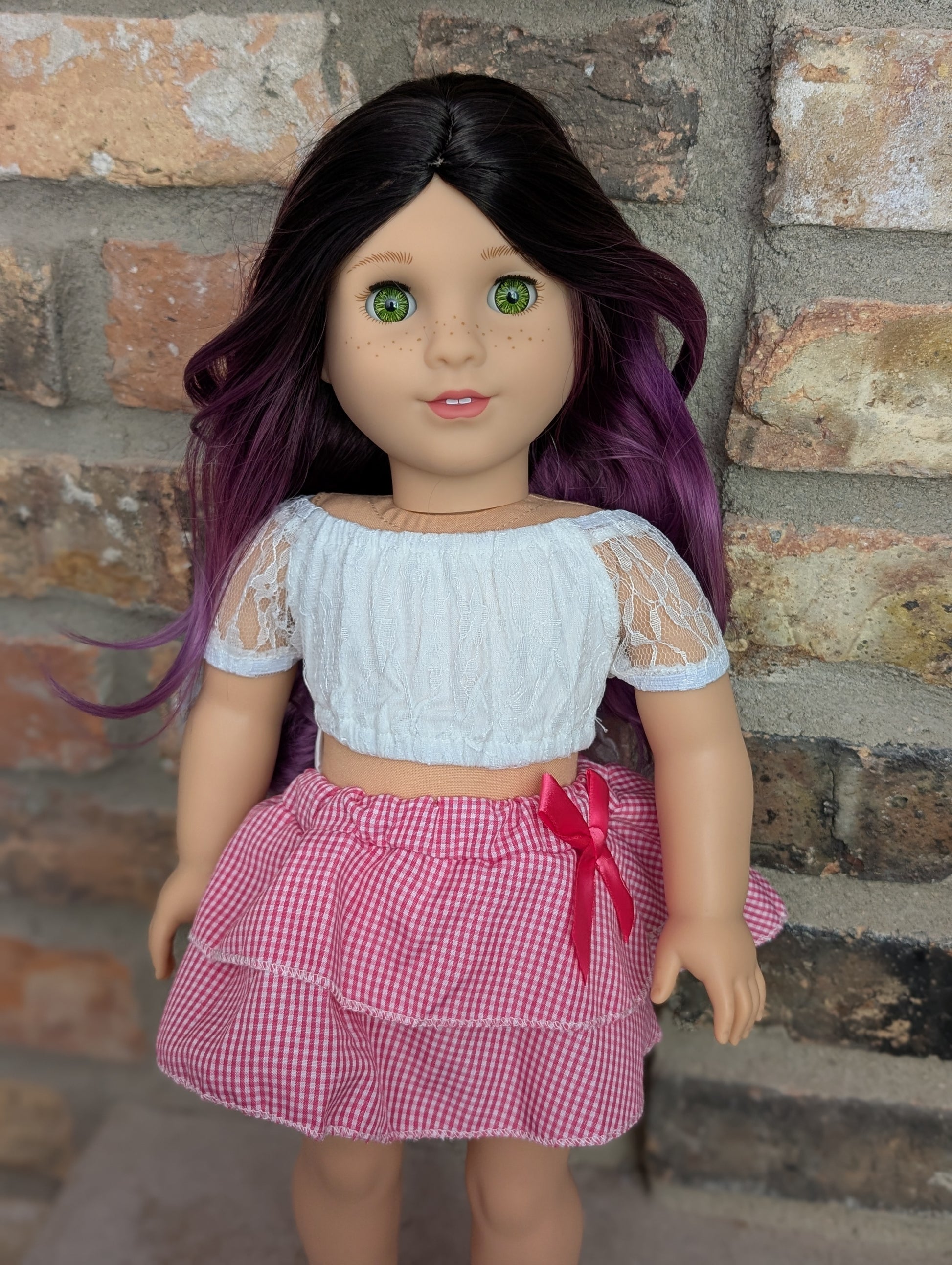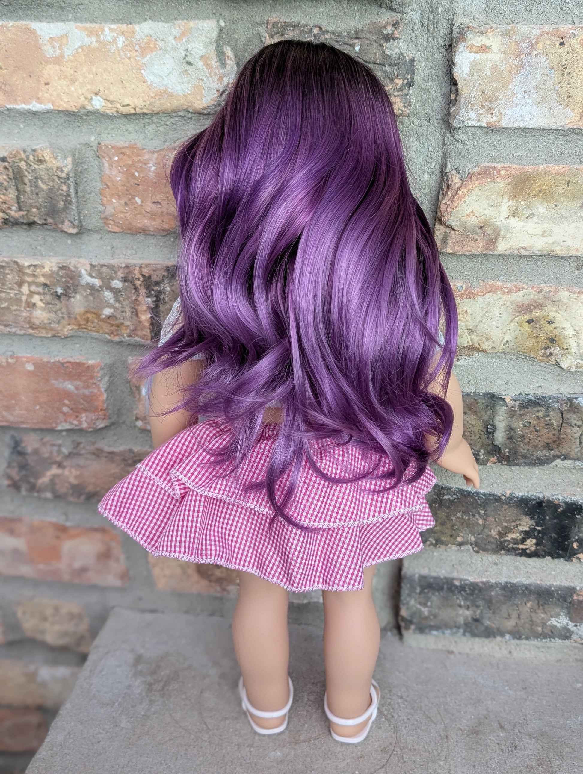 This one of a kind OOAK custom American Girl doll was created with a brand new Rapunzel doll, a purple wig, and green eyes. She may have some minor shine marks from handling. She comes with the outfit pictured. Her ears are pierced with American Girl doll sized earrings.