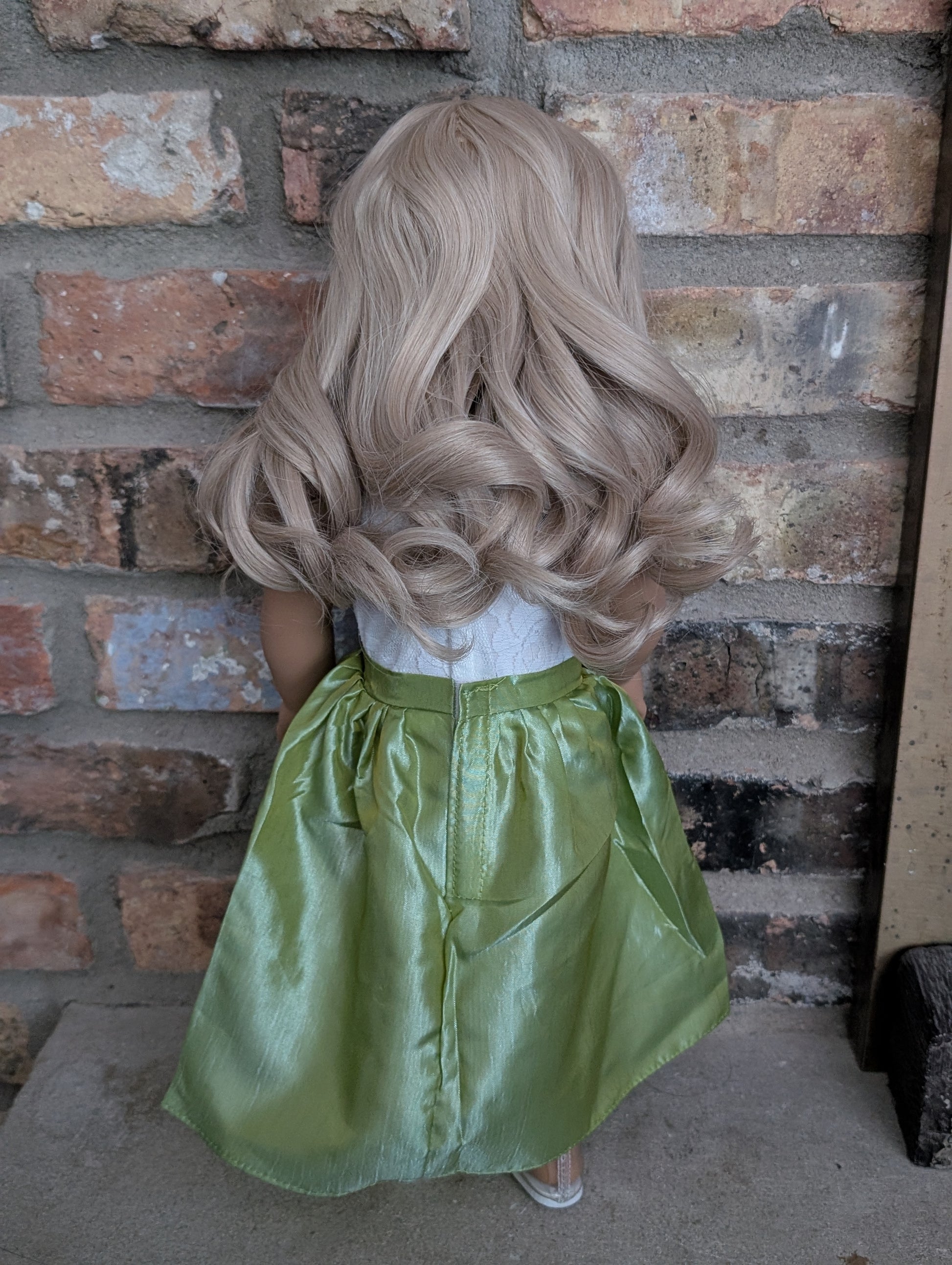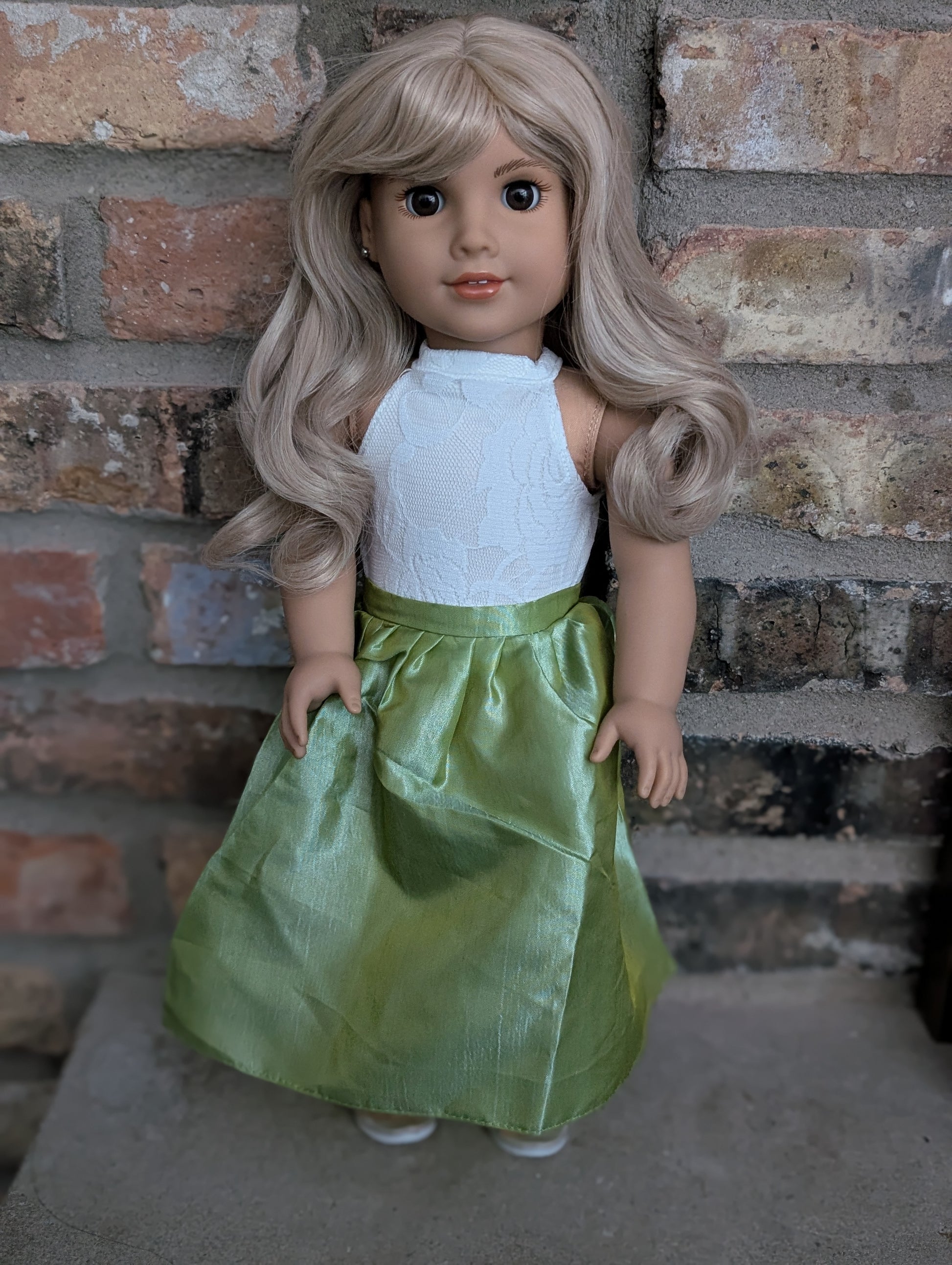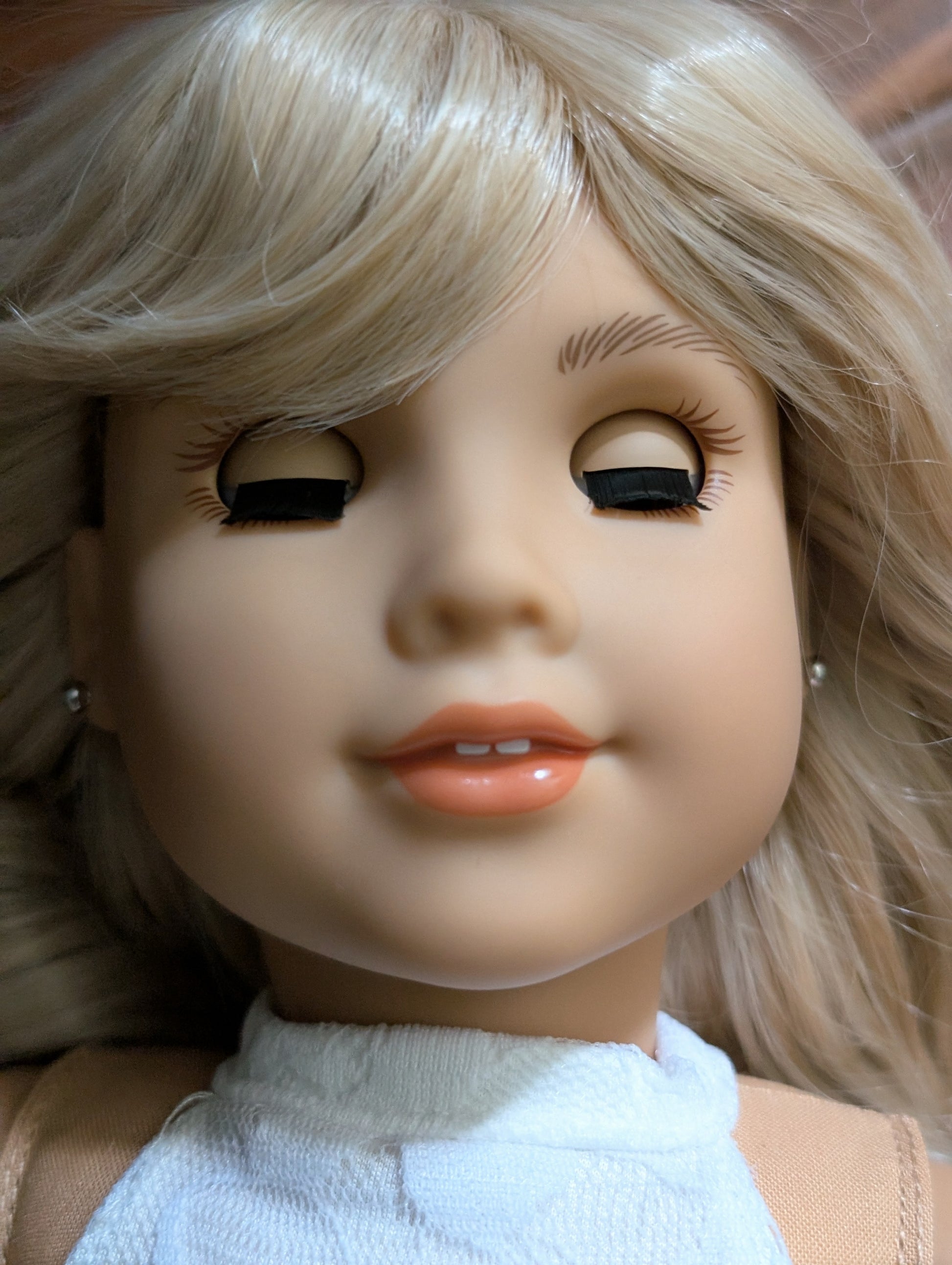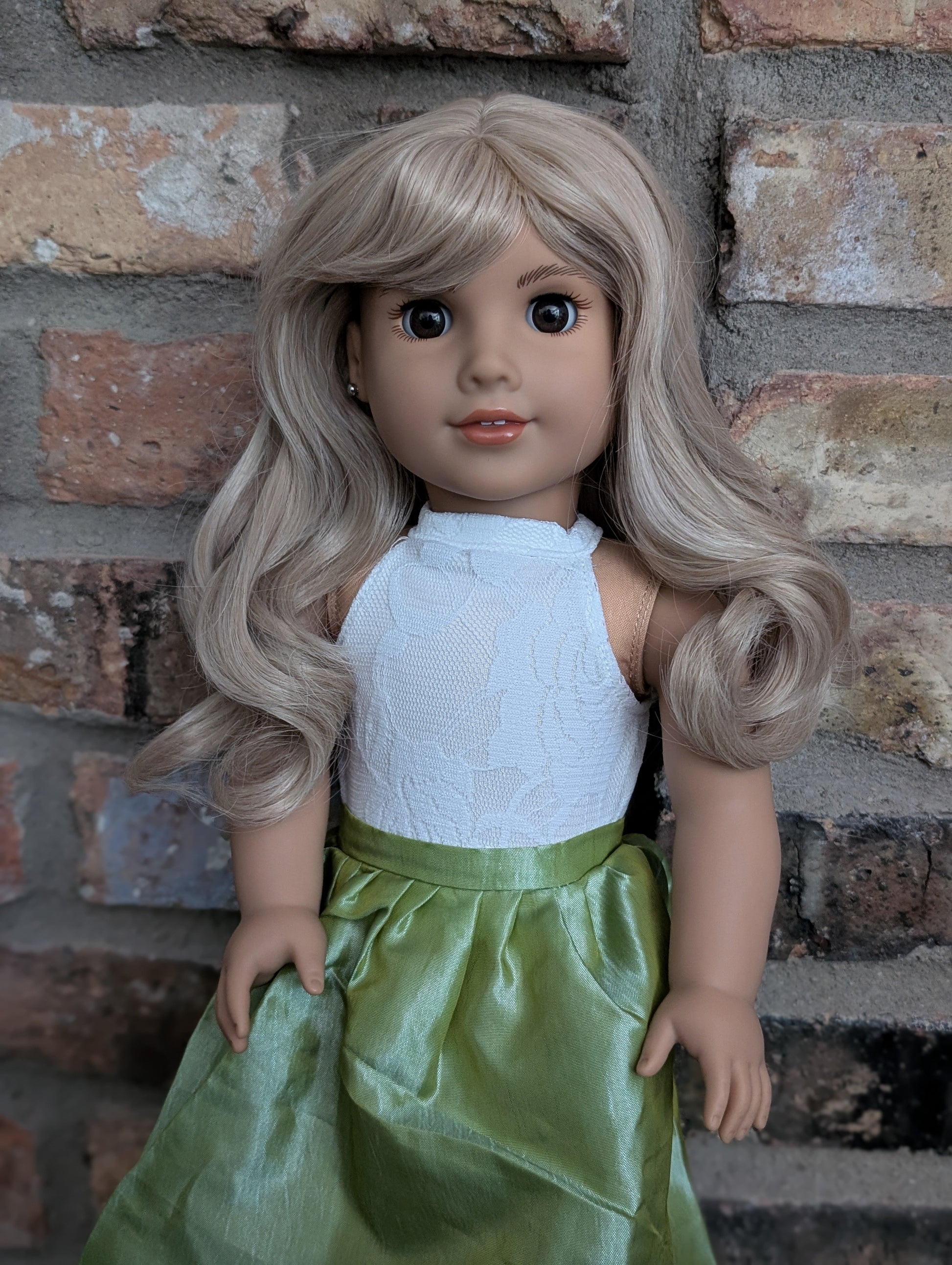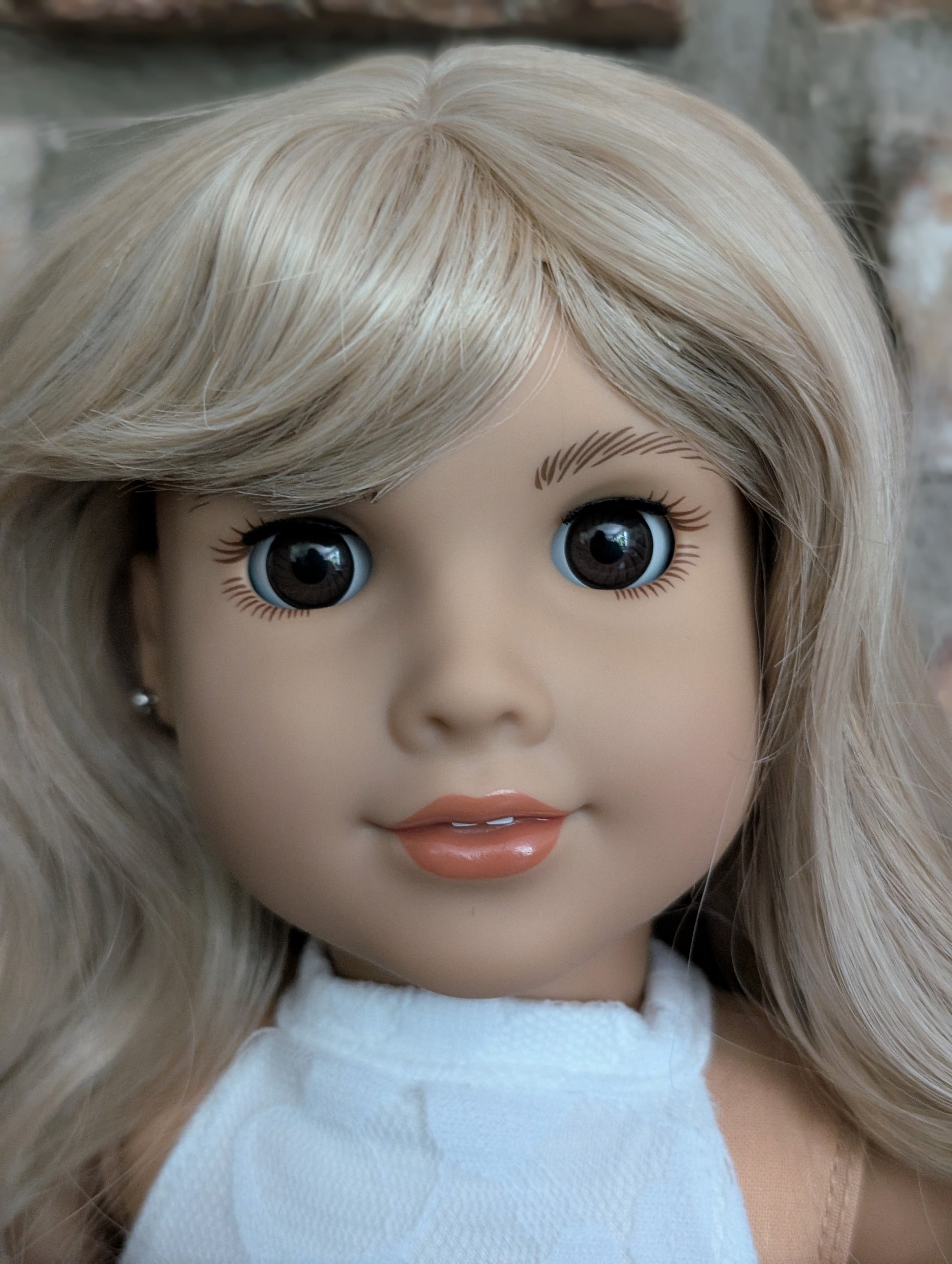 This one of a kind OOAK custom American Girl doll was created with a brand new doll, a blonde wig, and brown eyes. She has lip gloss that was hand painted and sealed. She may have some minor shine marks from handling. She comes with the outfit pictured. Her ears are pierced with American Girl doll sized earrings.
