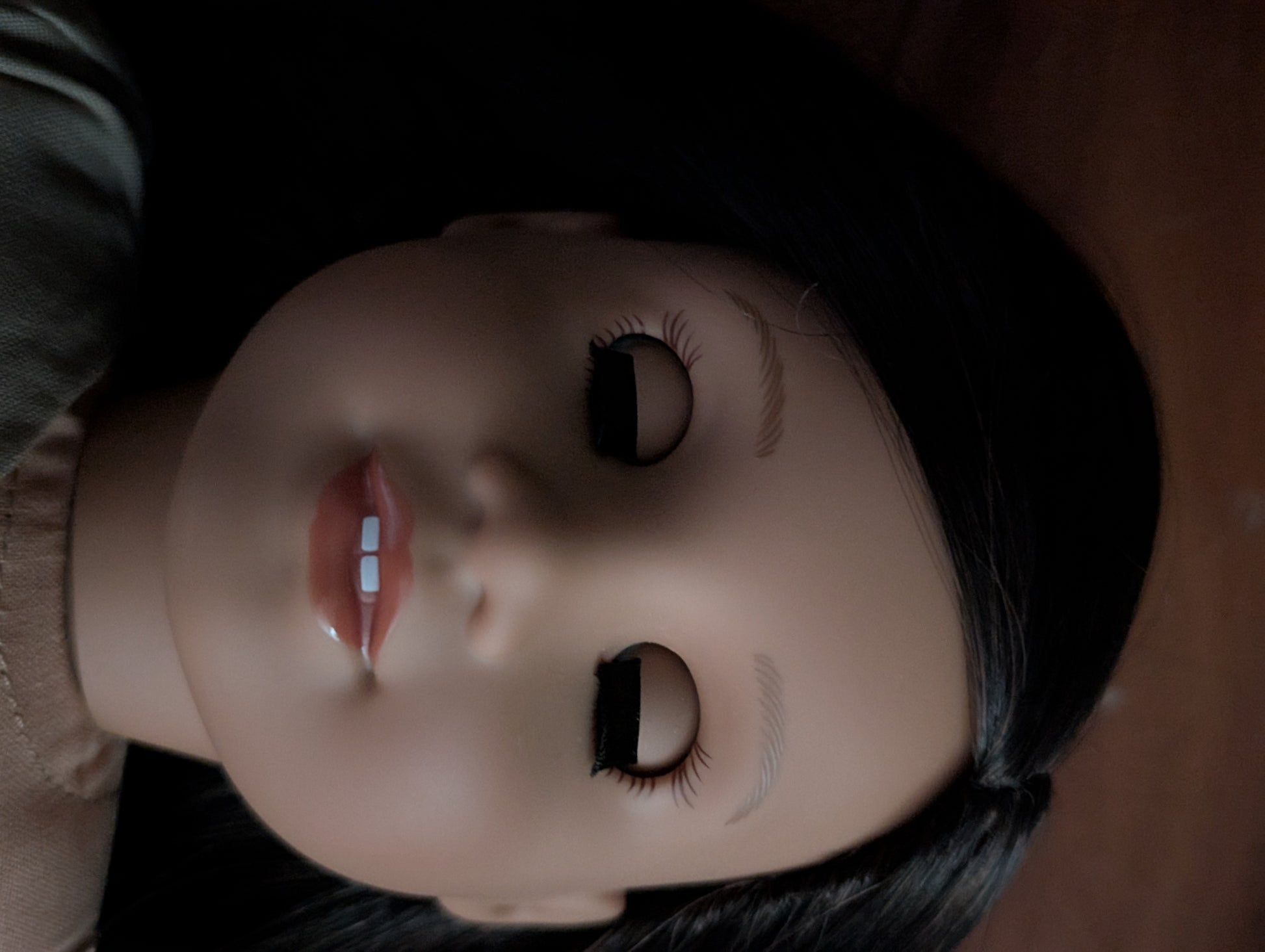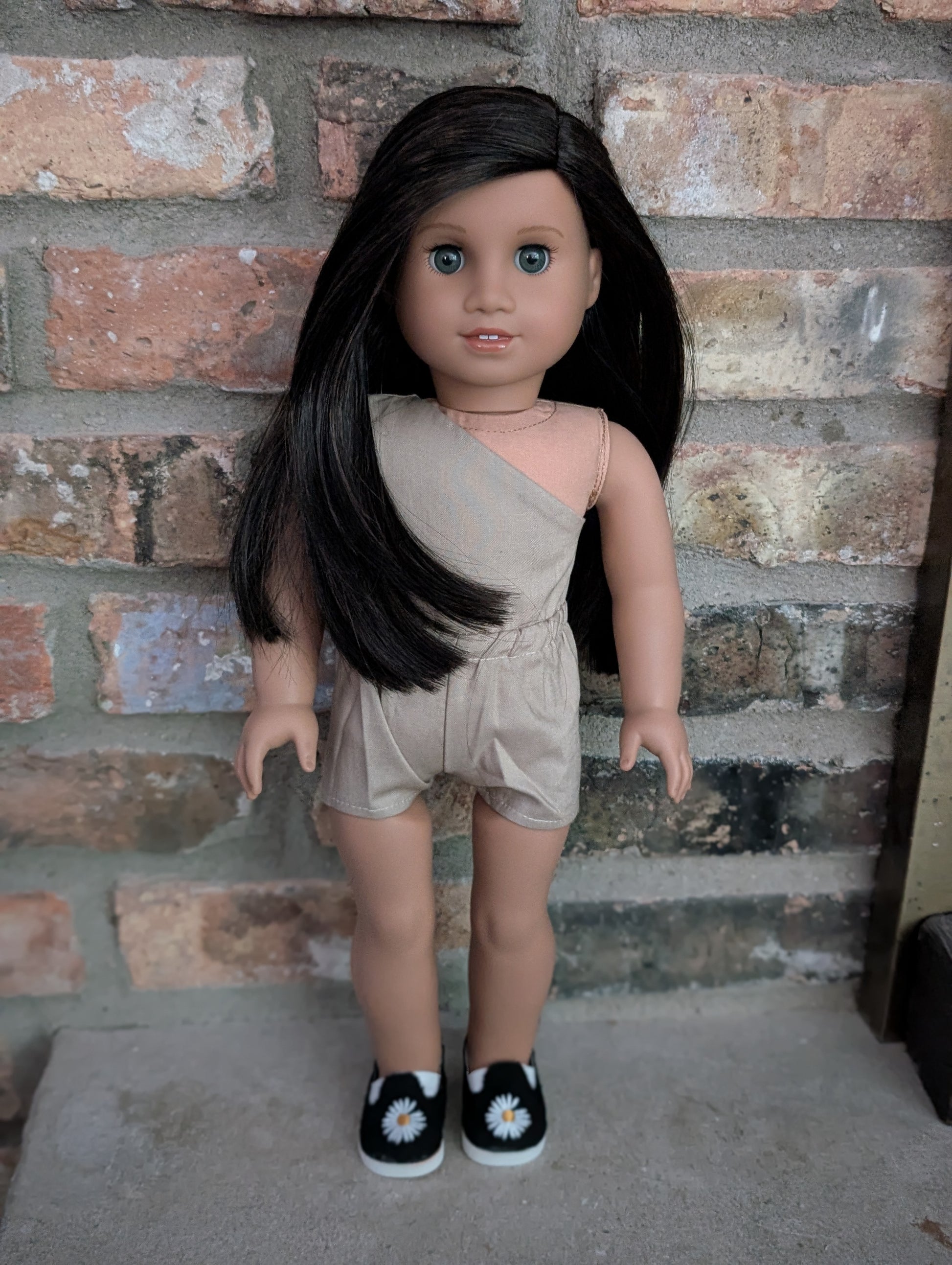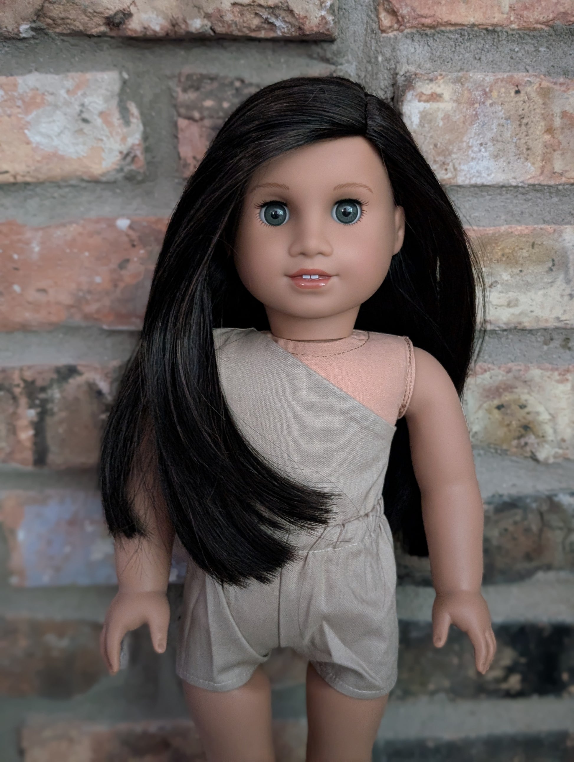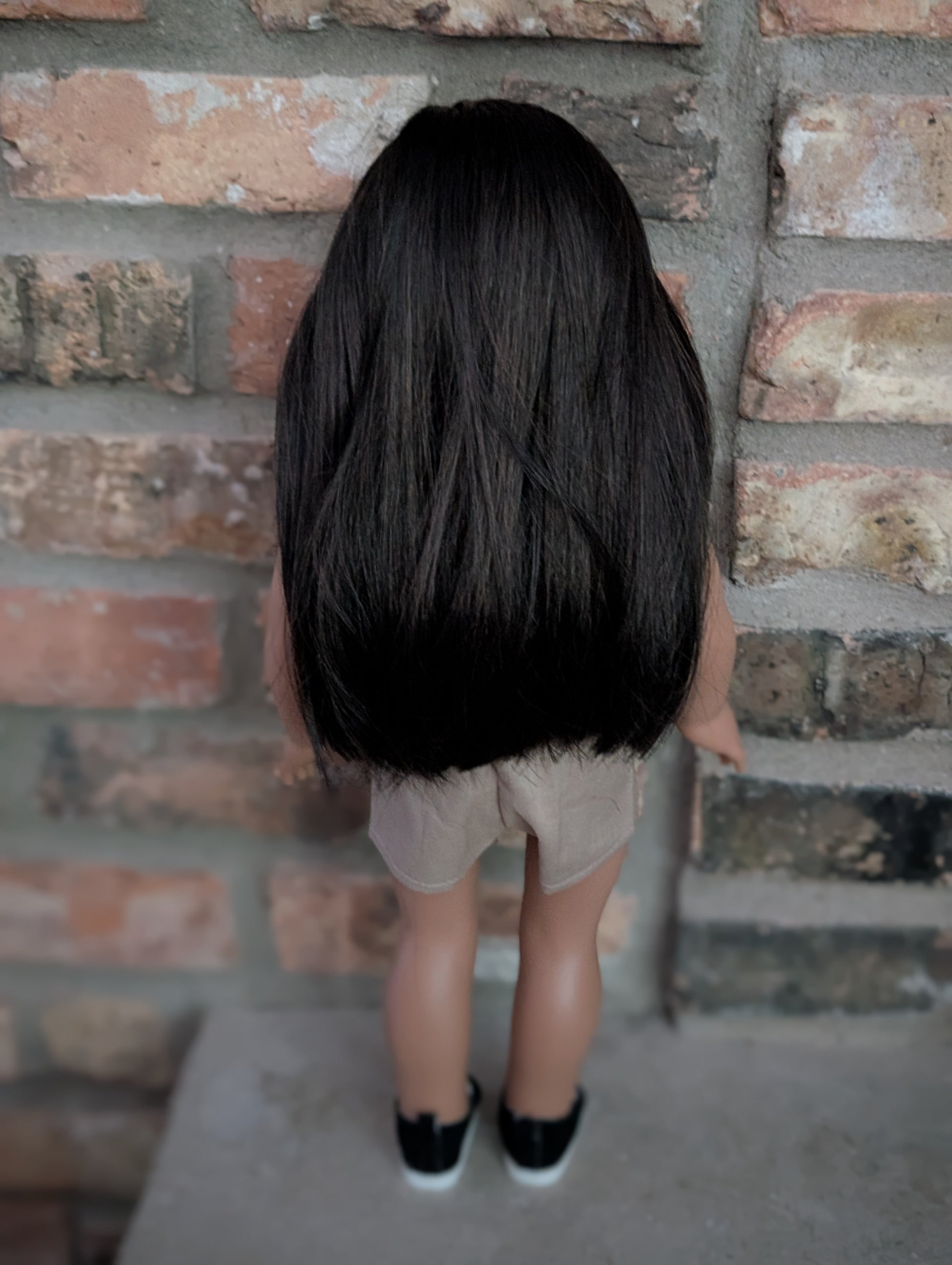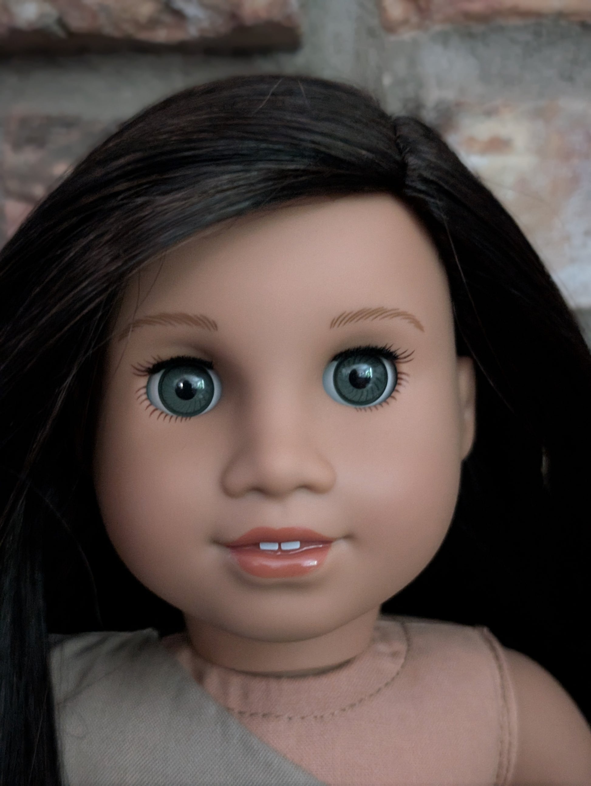 This one of a kind OOAK custom American Girl doll was created with a brand new doll, a black wig, and grey eyes. She has lip gloss that was hand painted and sealed. She may have some minor shine marks from handling. She comes with the outfit pictured.
