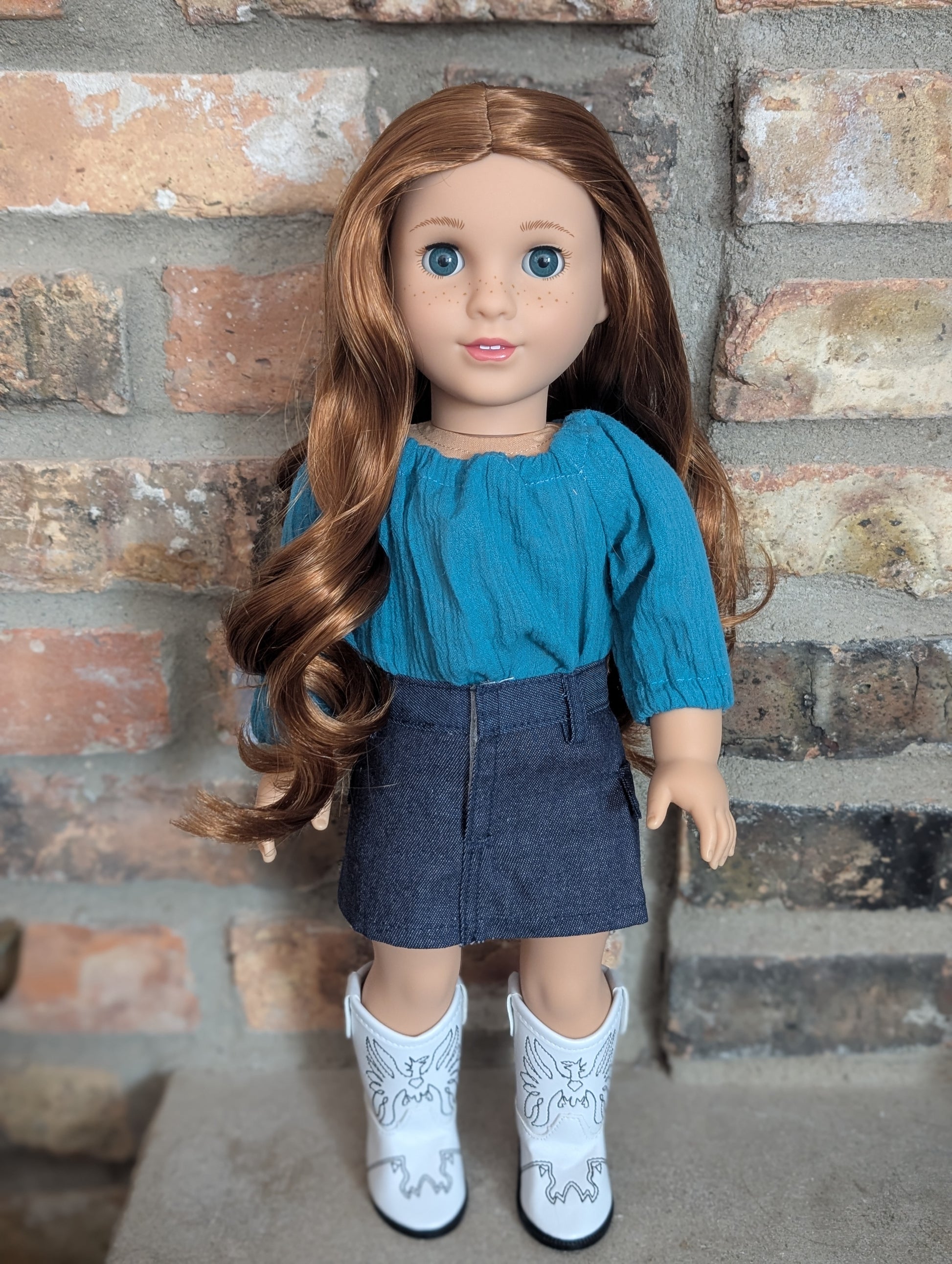This one of a kind OOAK custom American Girl doll was created with a brand new doll, a red wig, and blue eyes. She has lip gloss that was hand painted and sealed. She may have some minor shine marks from handling. She comes with the outfit pictured.