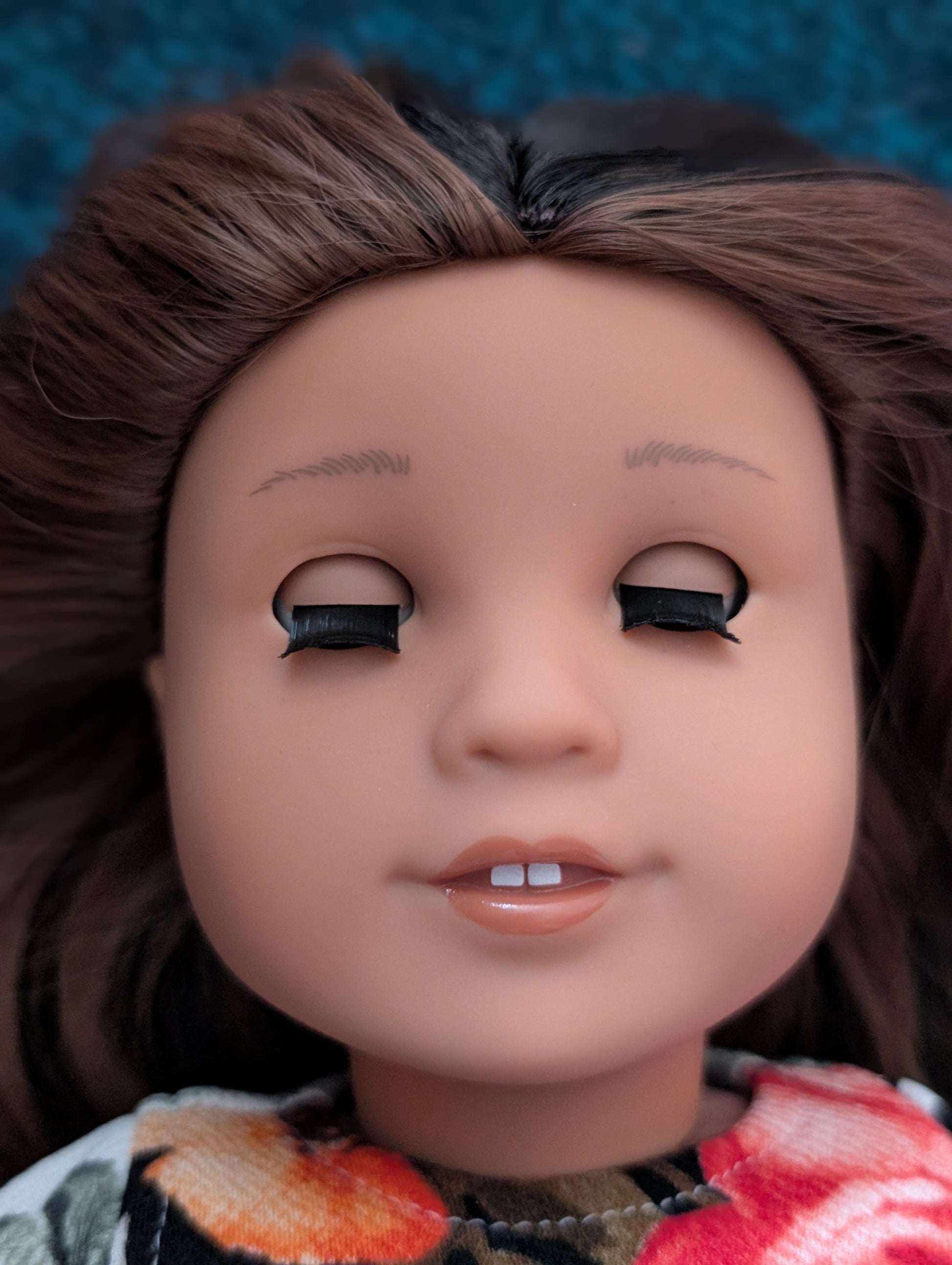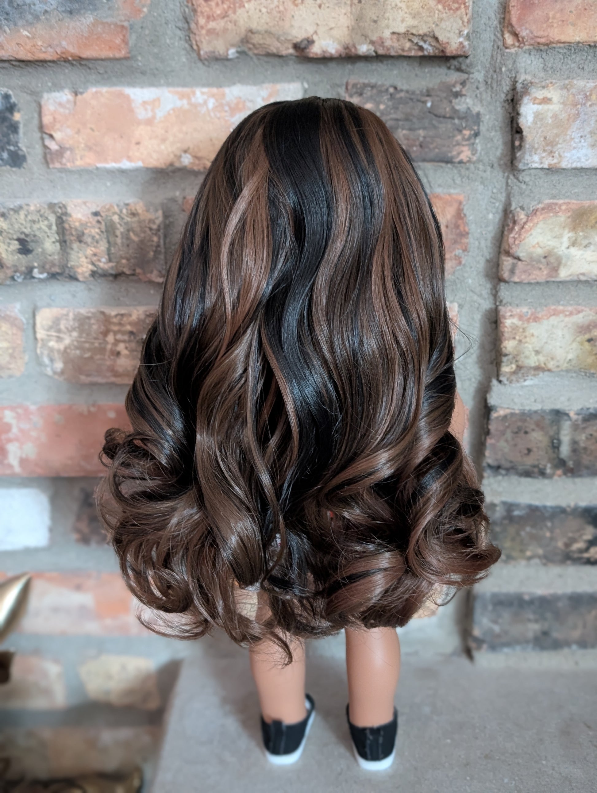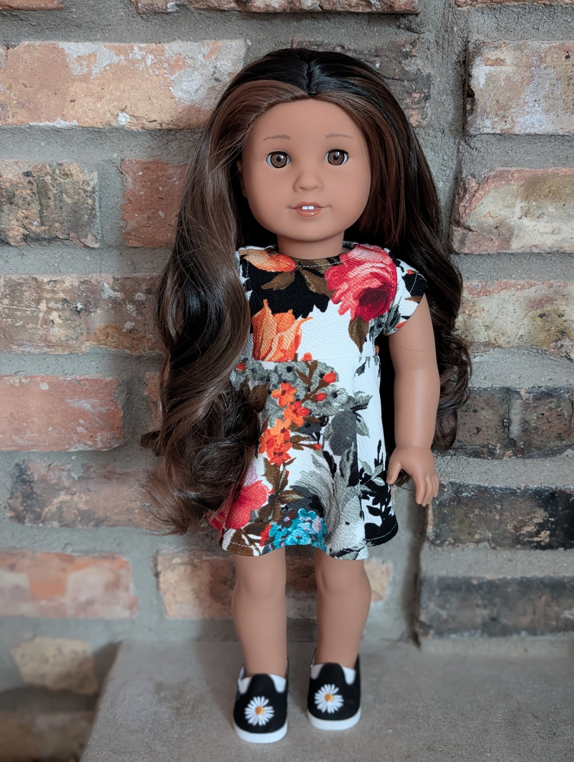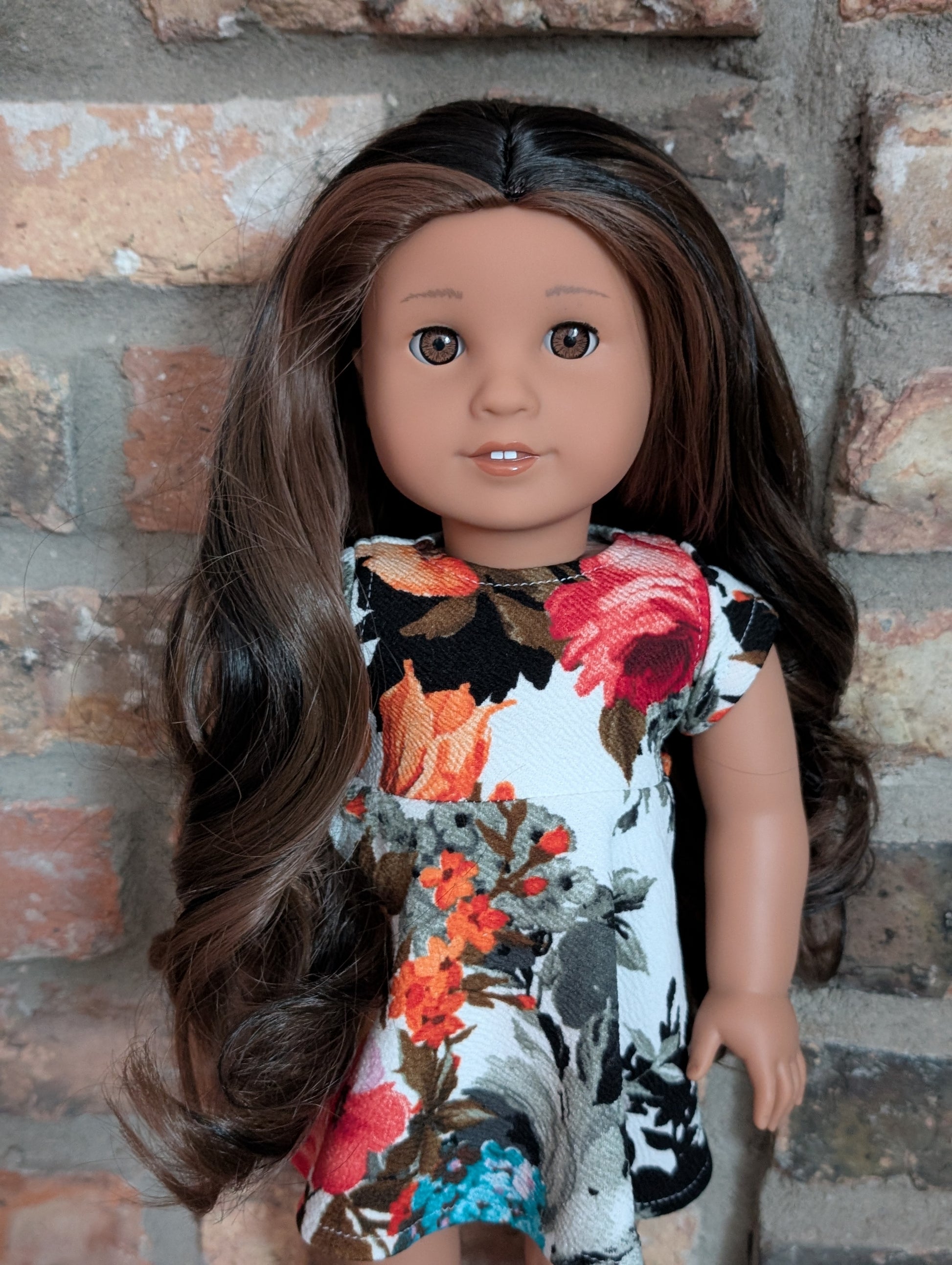 This one of a kind OOAK custom American Girl doll was created with a brand new doll, a brown and black wig, and light brown eyes. She has lip gloss that was hand painted and sealed. She may have some minor shine marks from handling. She comes with the outfit pictured.