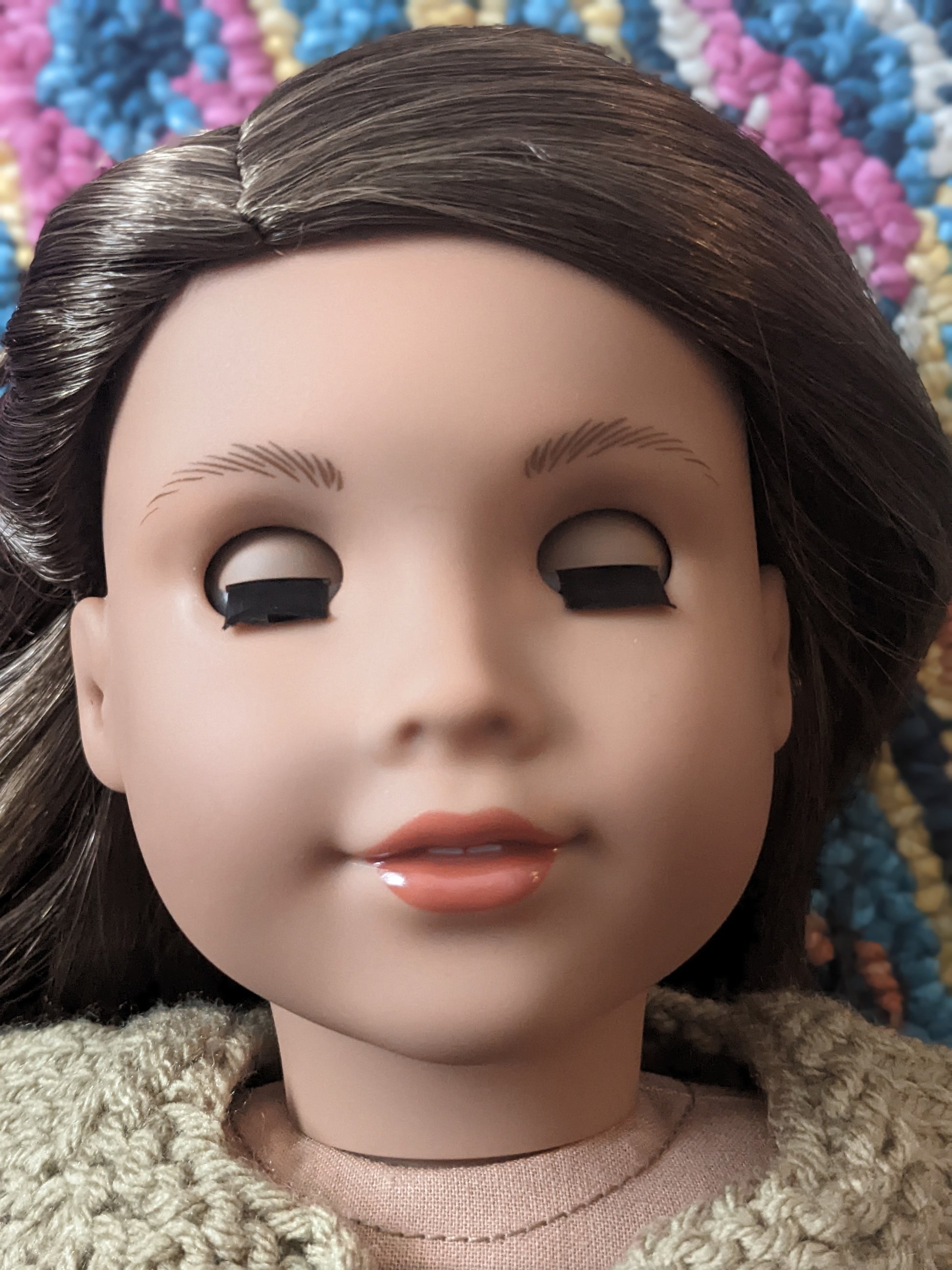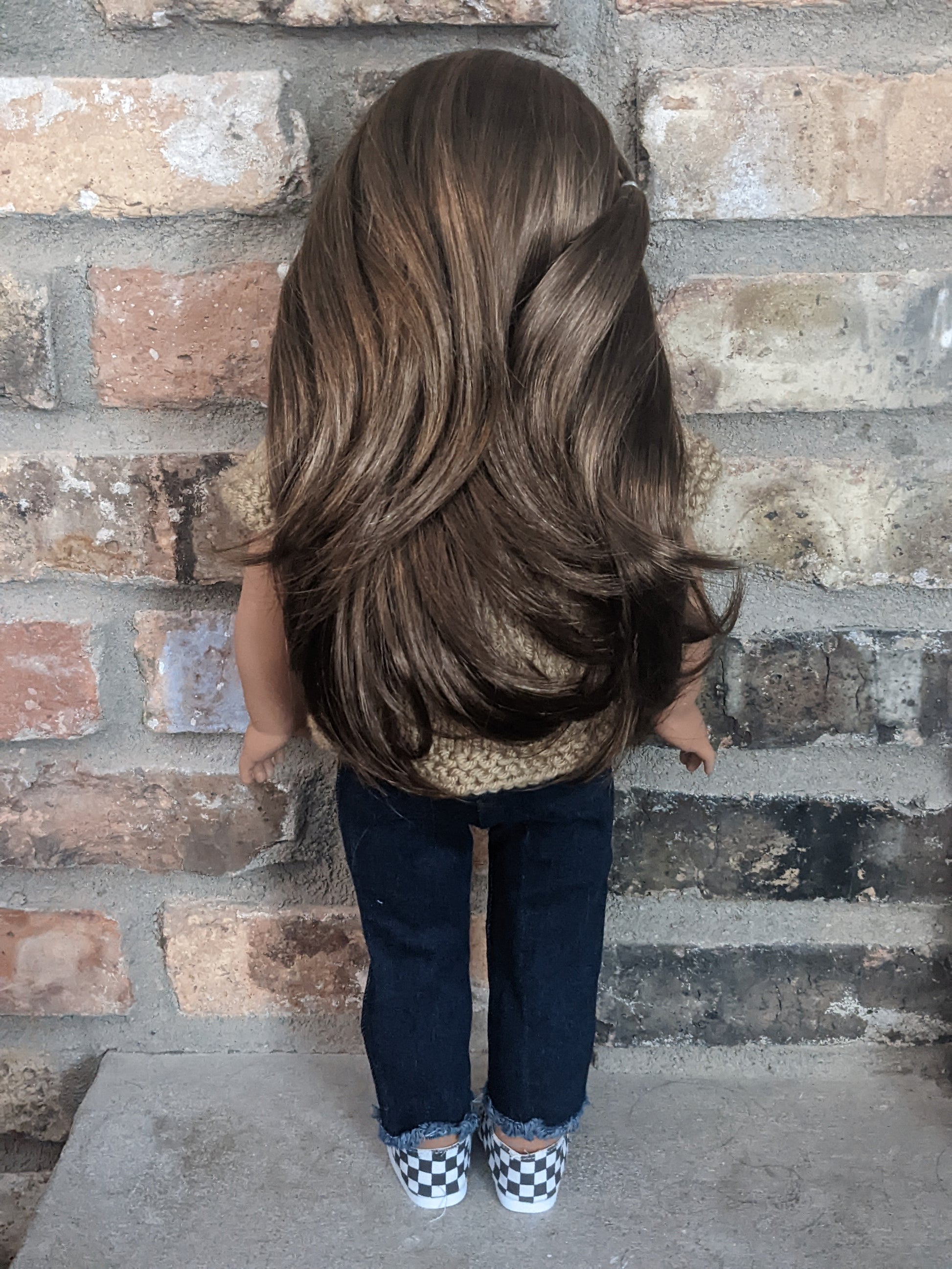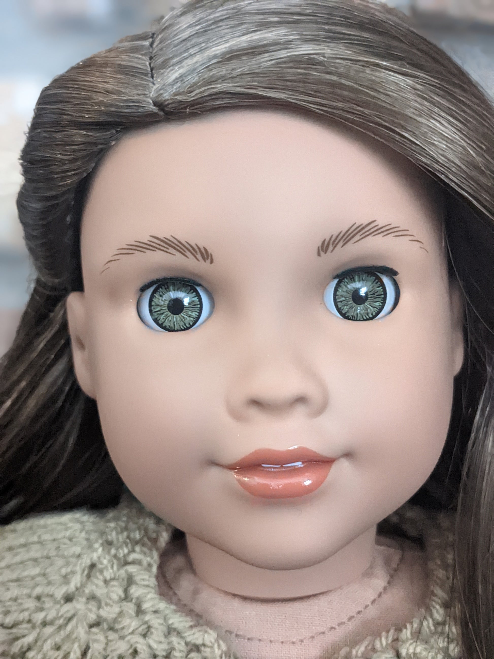 This one of a kind OOAK custom American Girl doll was created with a brand new Maritza doll, a brown wig from a new Joss doll, and light hazel eyes. She has lip gloss that was hand painted and sealed. She may have some minor shine marks from handling. She comes with the outfit pictured. Her painted on eyelashes have been removed.