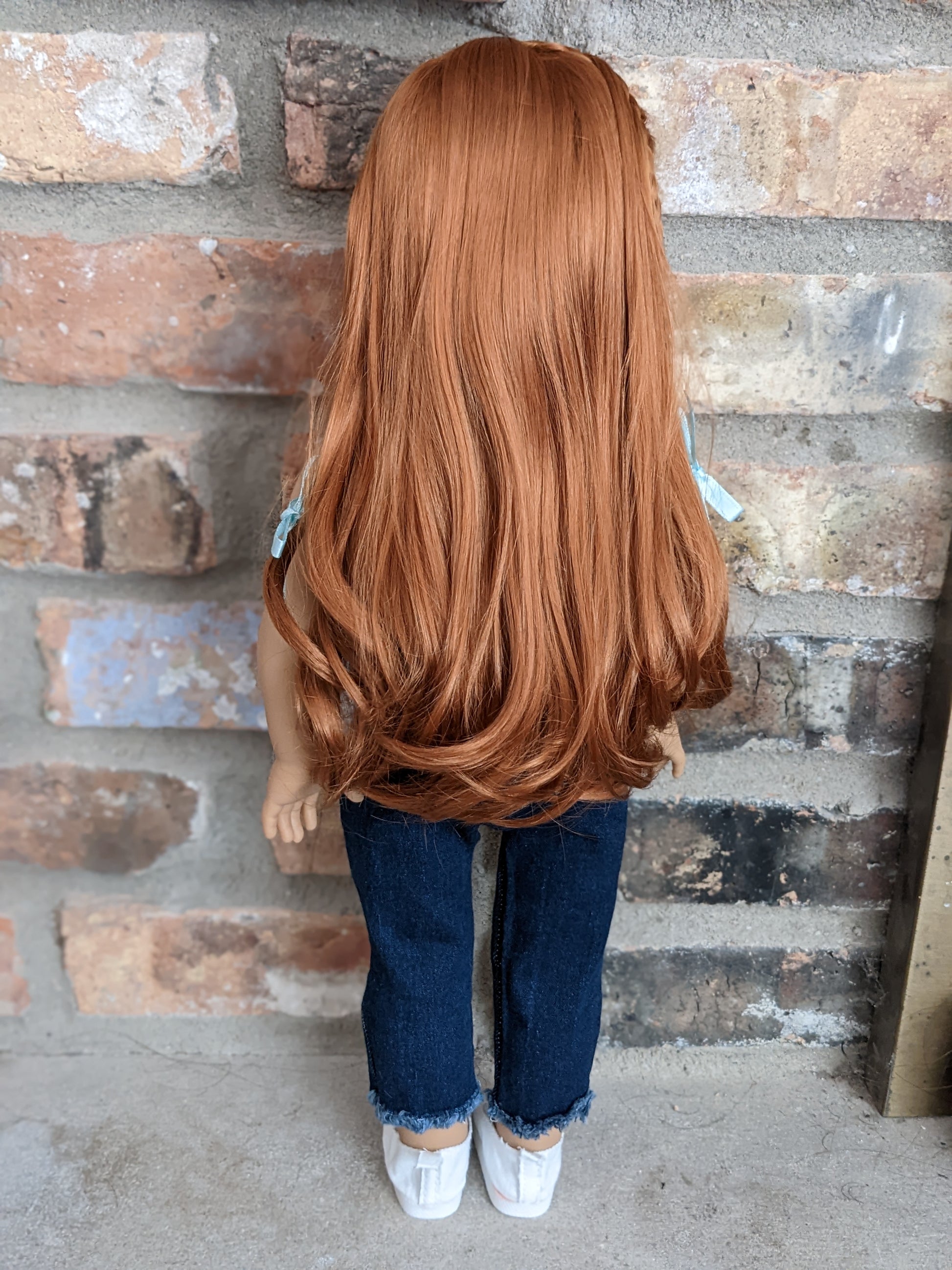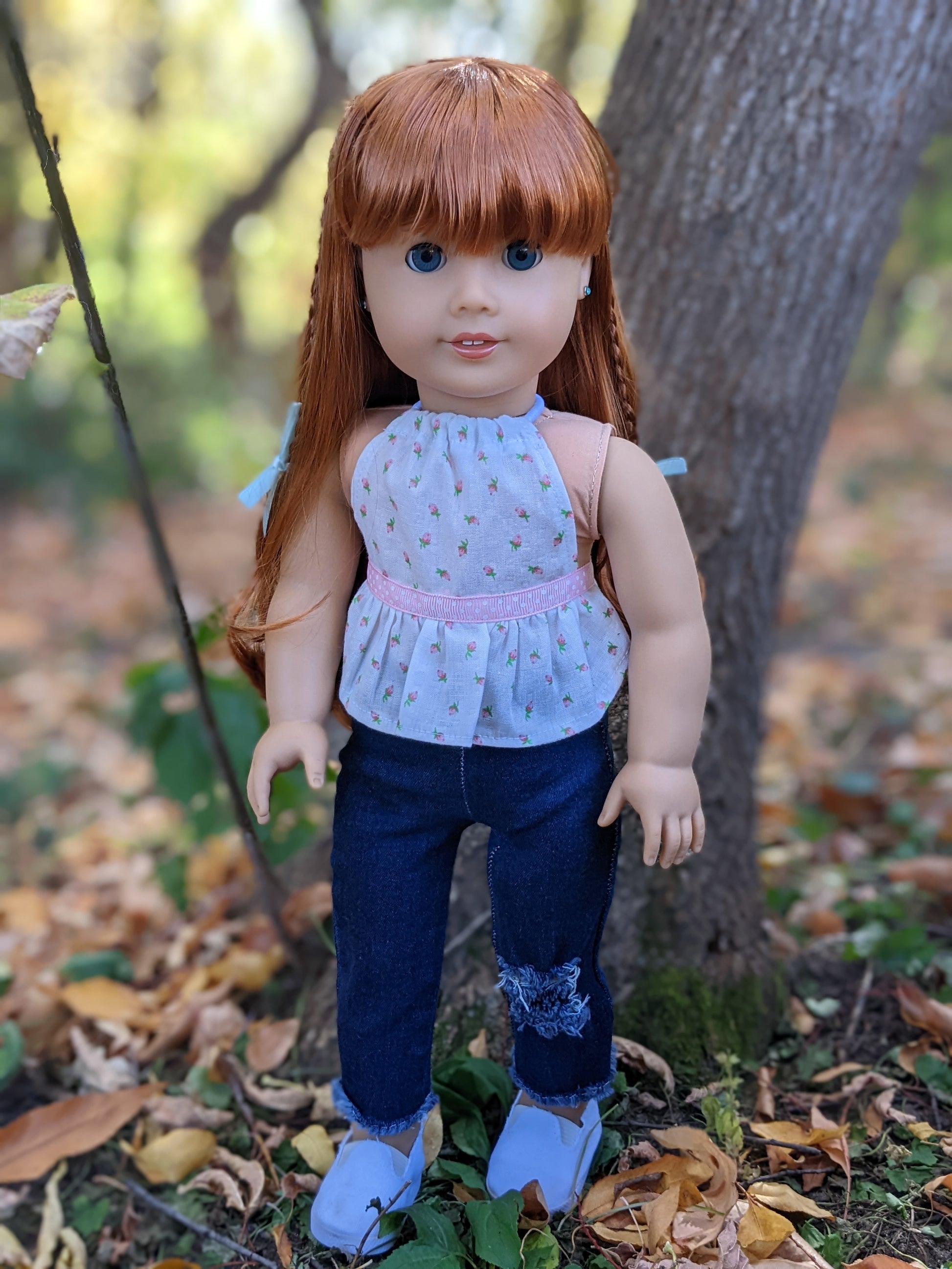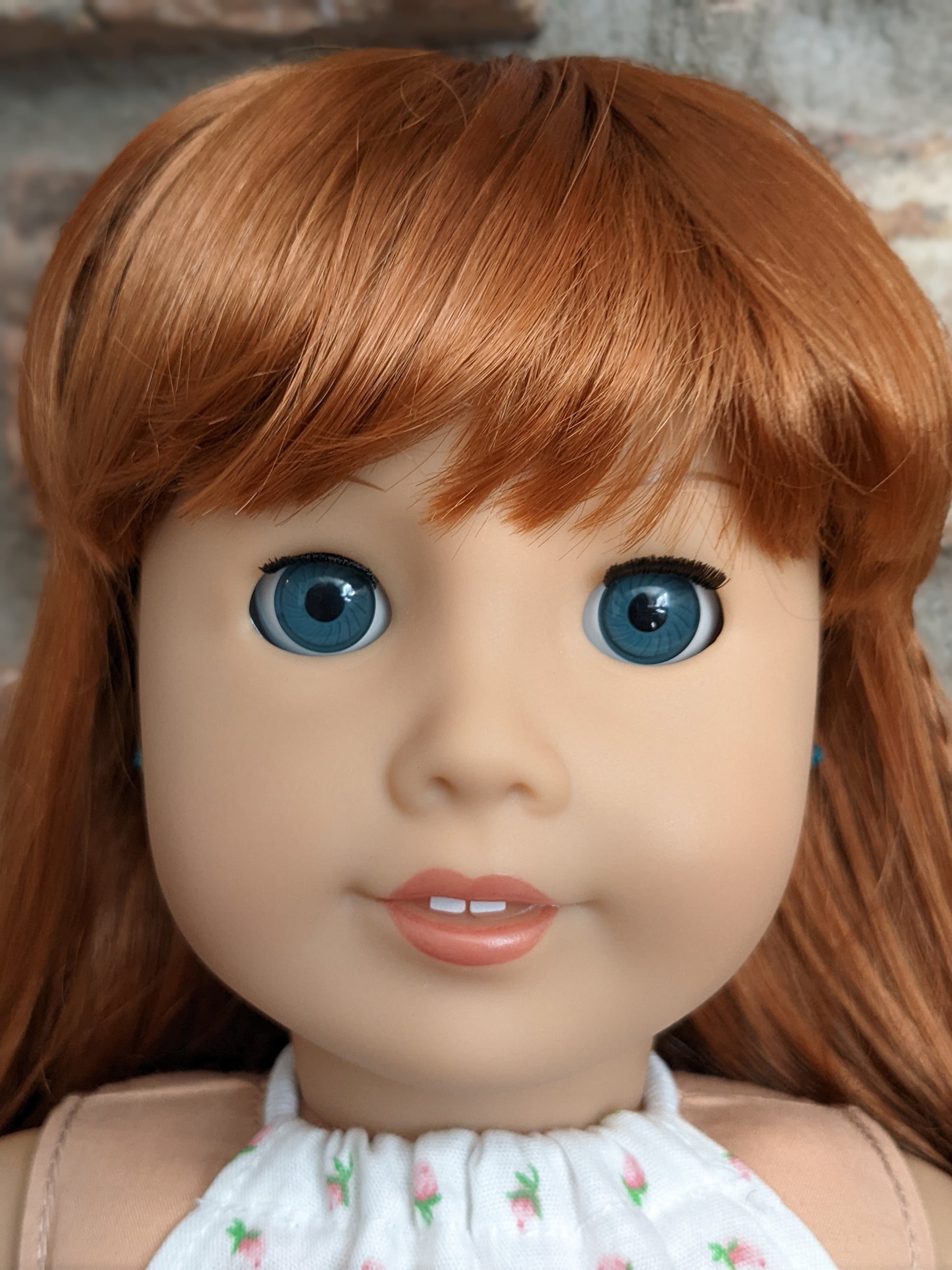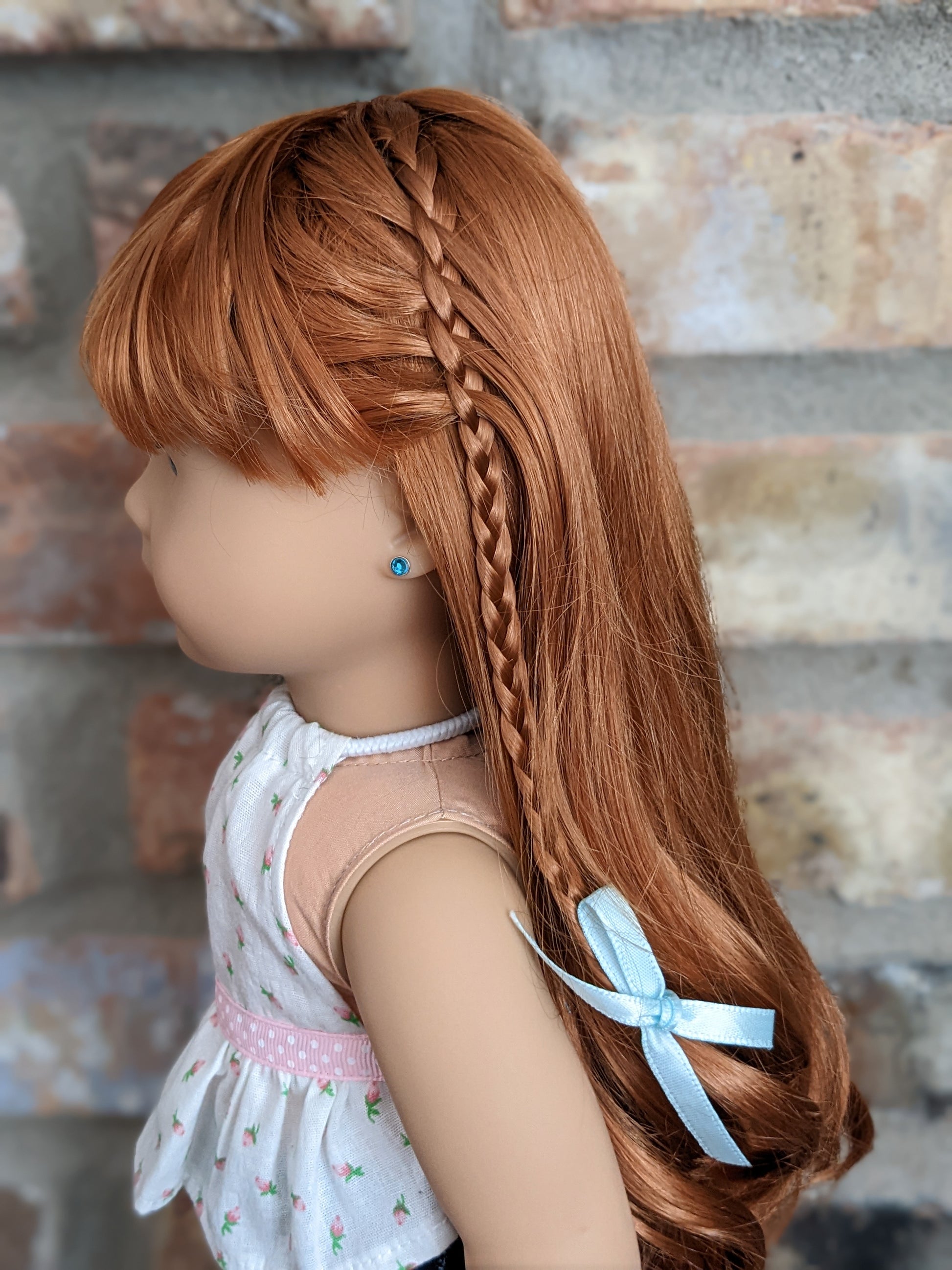 This one of a kind OOAK custom American Girl doll was created with a brand new Truly Me doll, a red vegan mohair wig with bangs, and blue eyes. She has lip gloss that was hand painted and sealed. She may have some minor shine marks from handling. She comes with the outfit pictured. Her ears are pierced with American Girl brand earrings and the studs are included. She has a microfiber cloth body with a tiny x on her bum and permapanties.