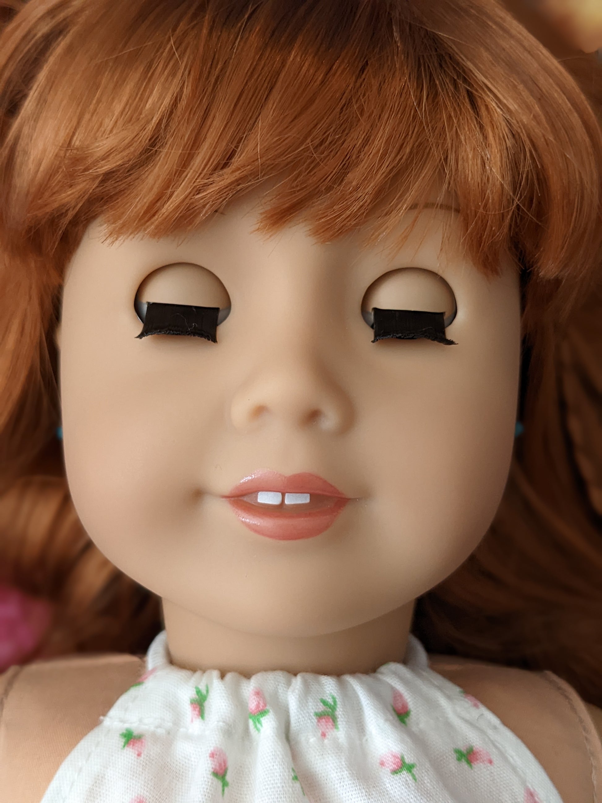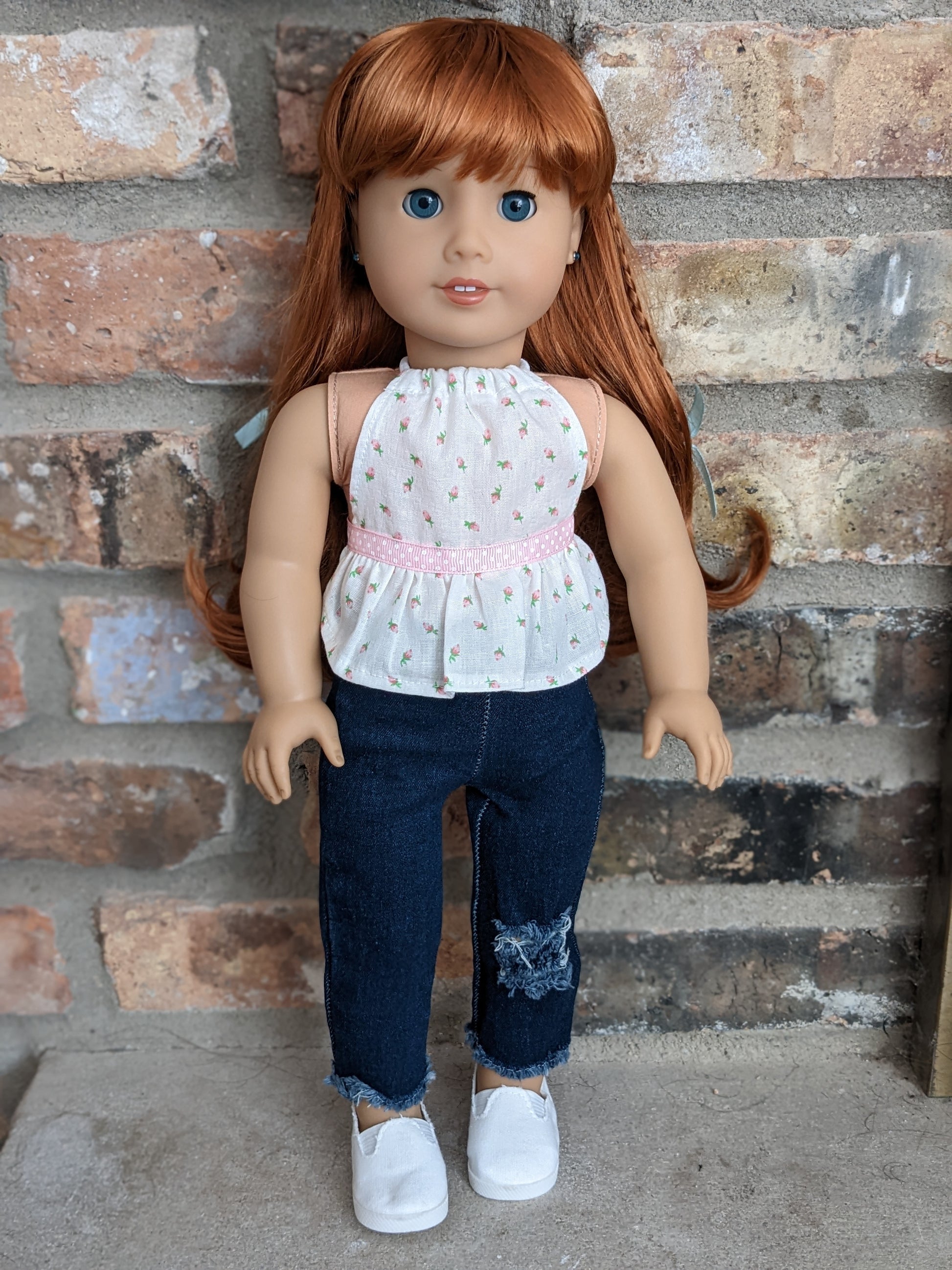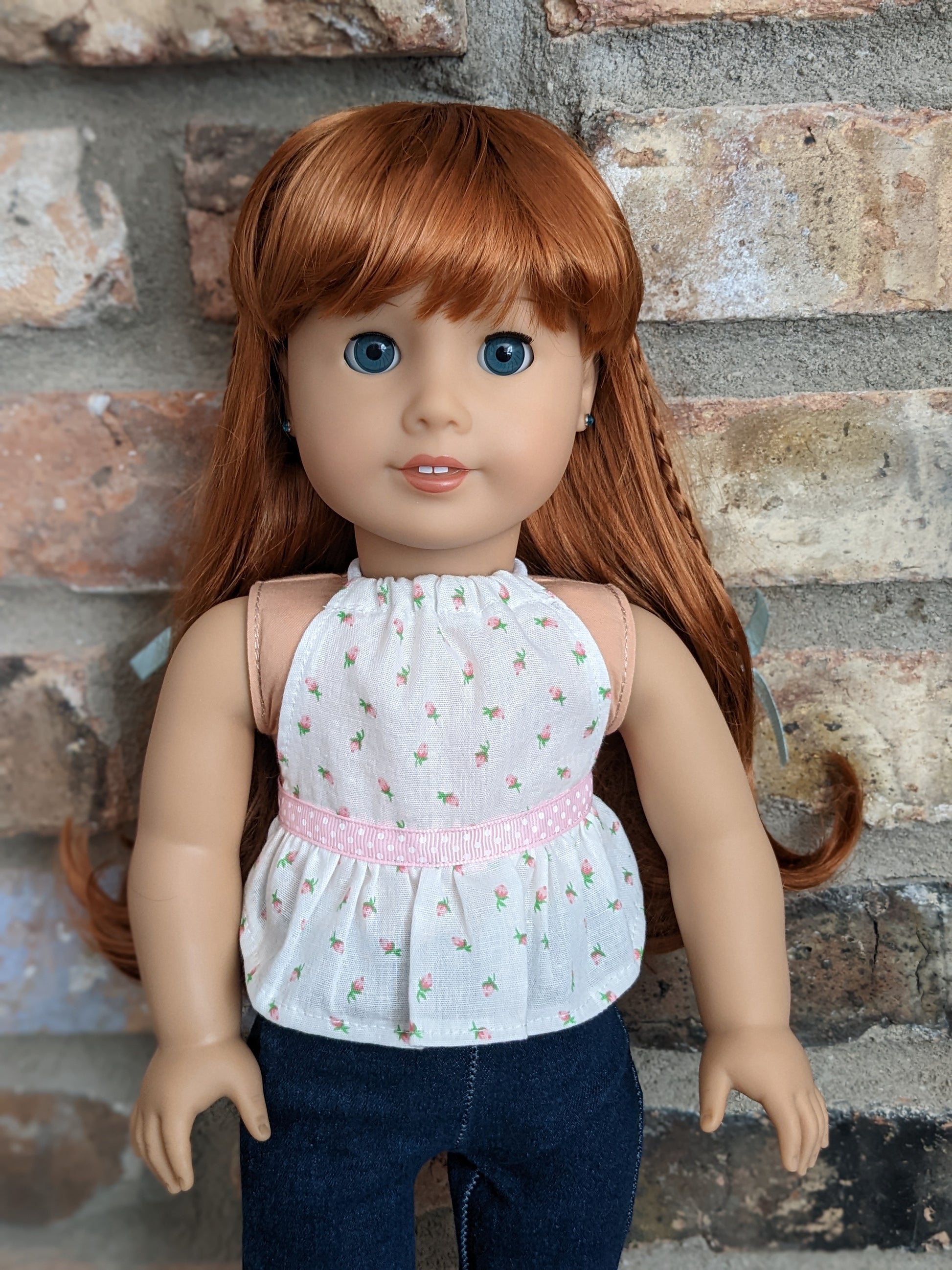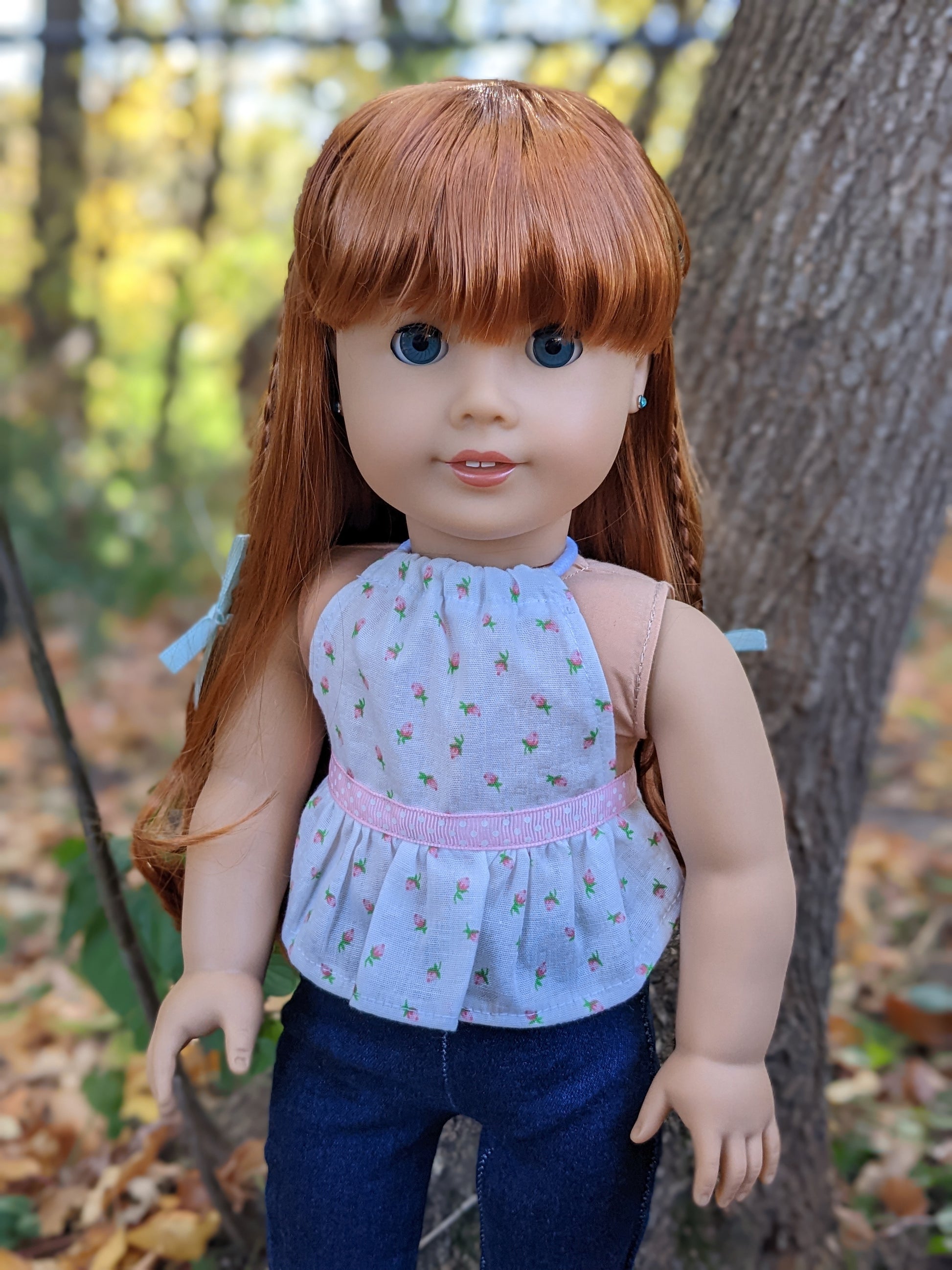 This one of a kind OOAK custom American Girl doll was created with a brand new Truly Me doll, a red vegan mohair wig with bangs, and blue eyes. She has lip gloss that was hand painted and sealed. She may have some minor shine marks from handling. She comes with the outfit pictured. Her ears are pierced with American Girl brand earrings and the studs are included. She has a microfiber cloth body with a tiny x on her bum and permapanties.