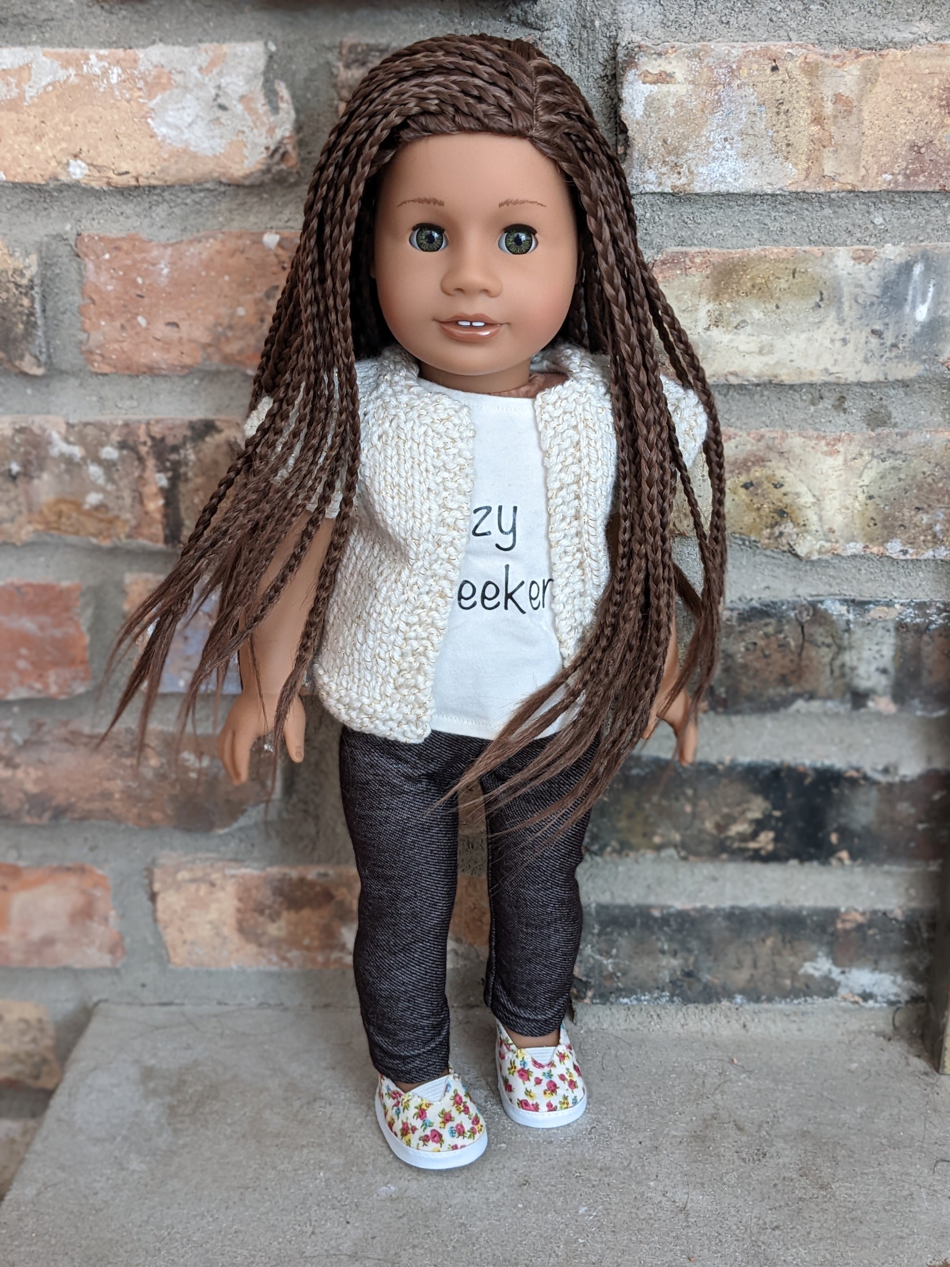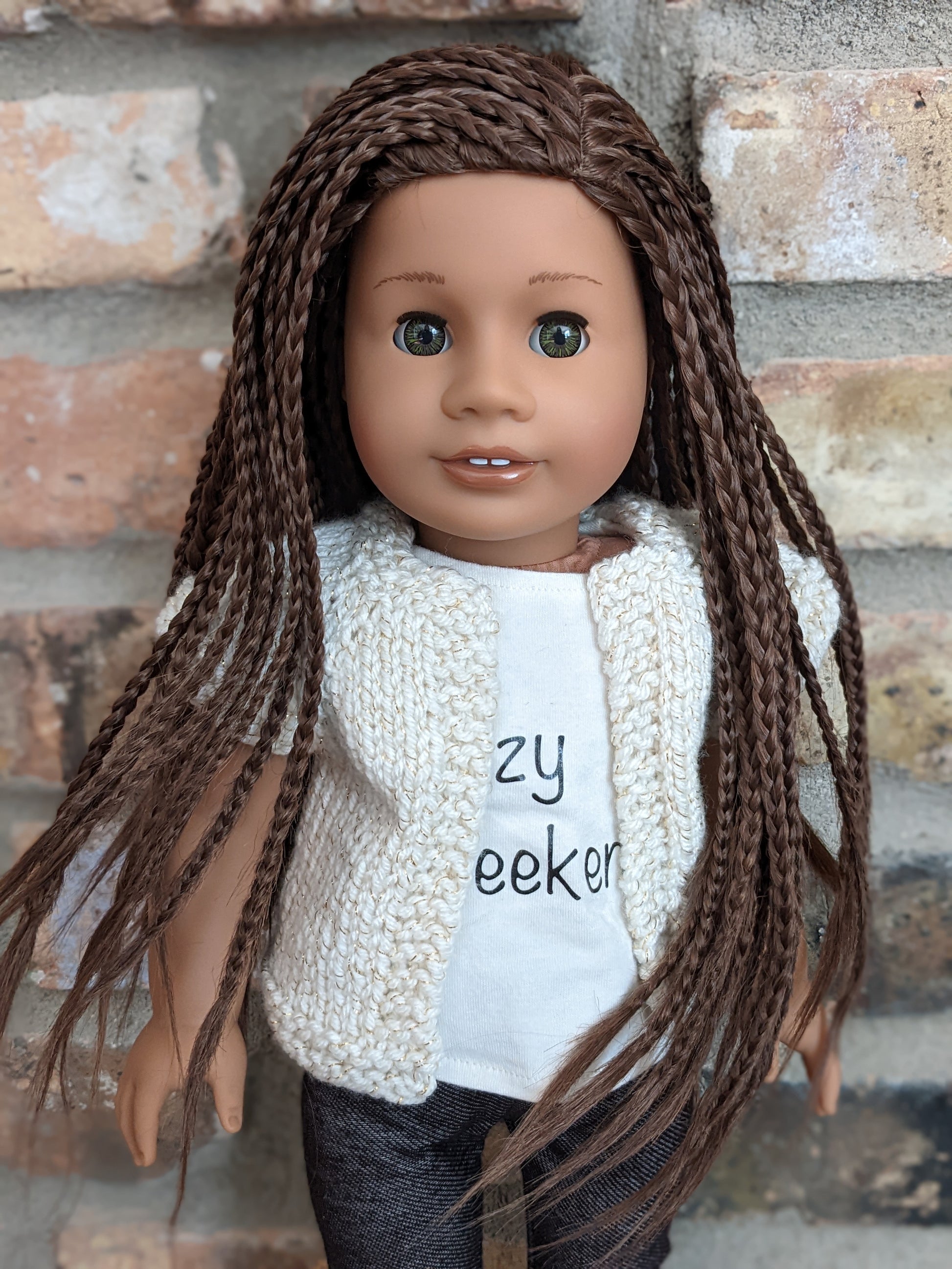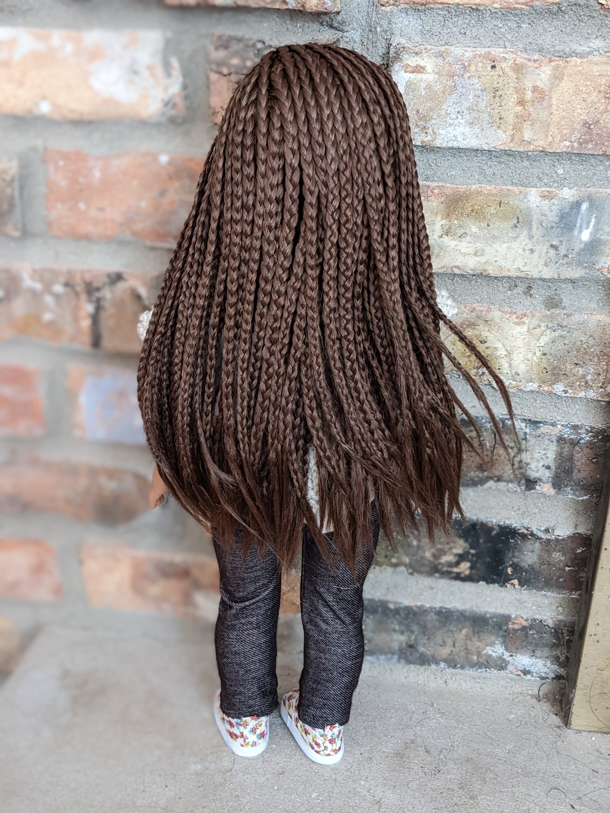 This one of a kind OOAK custom American Girl doll was created with a brand new Truly Me 26 doll, a brown braided wig, and hazel eyes. She has lip gloss that was hand painted and sealed. She may have some minor shine marks from handling. She comes with the outfit pictured. She has the microfiber cloth body with permapanties and a tiny x on her bum.