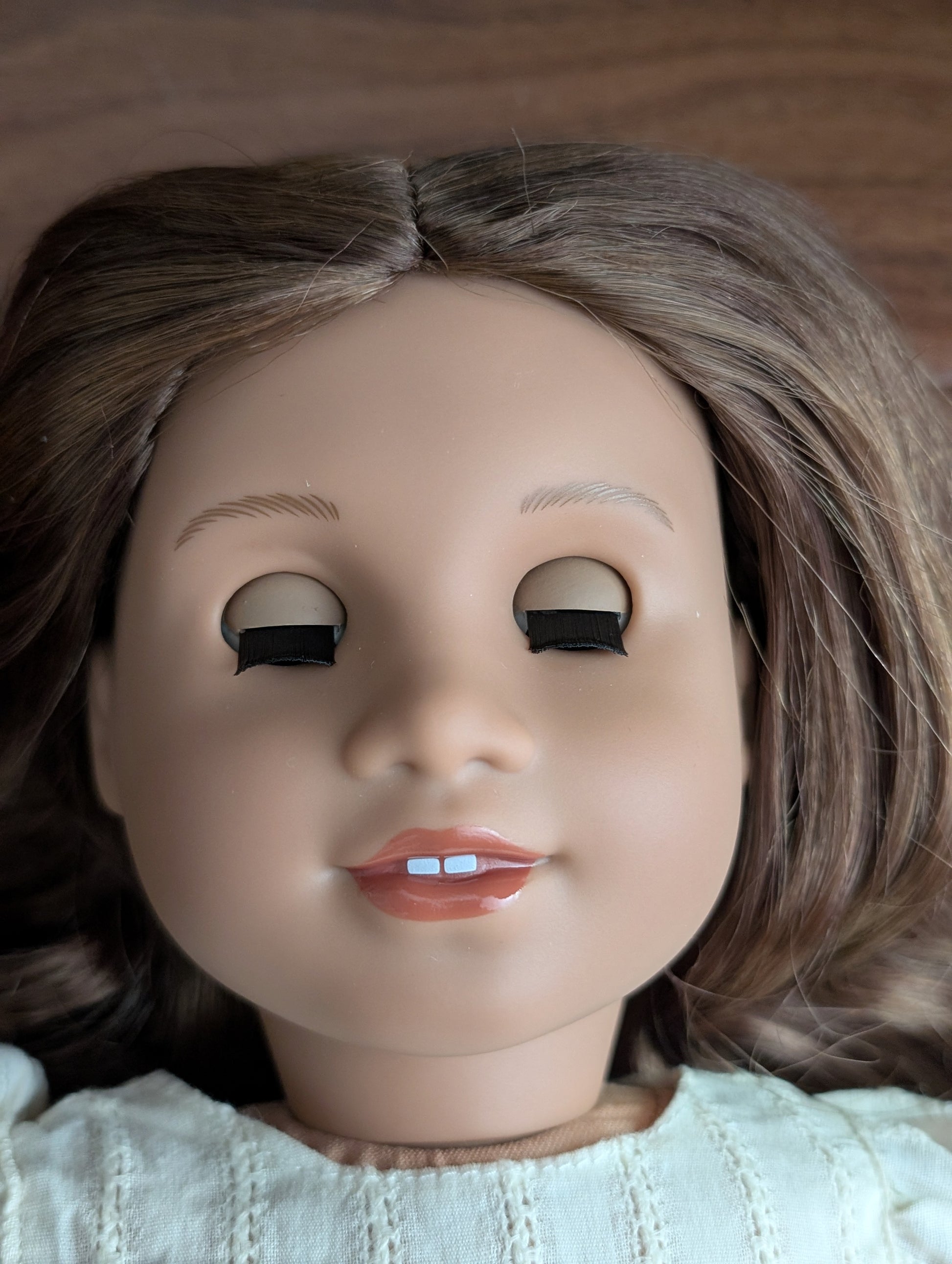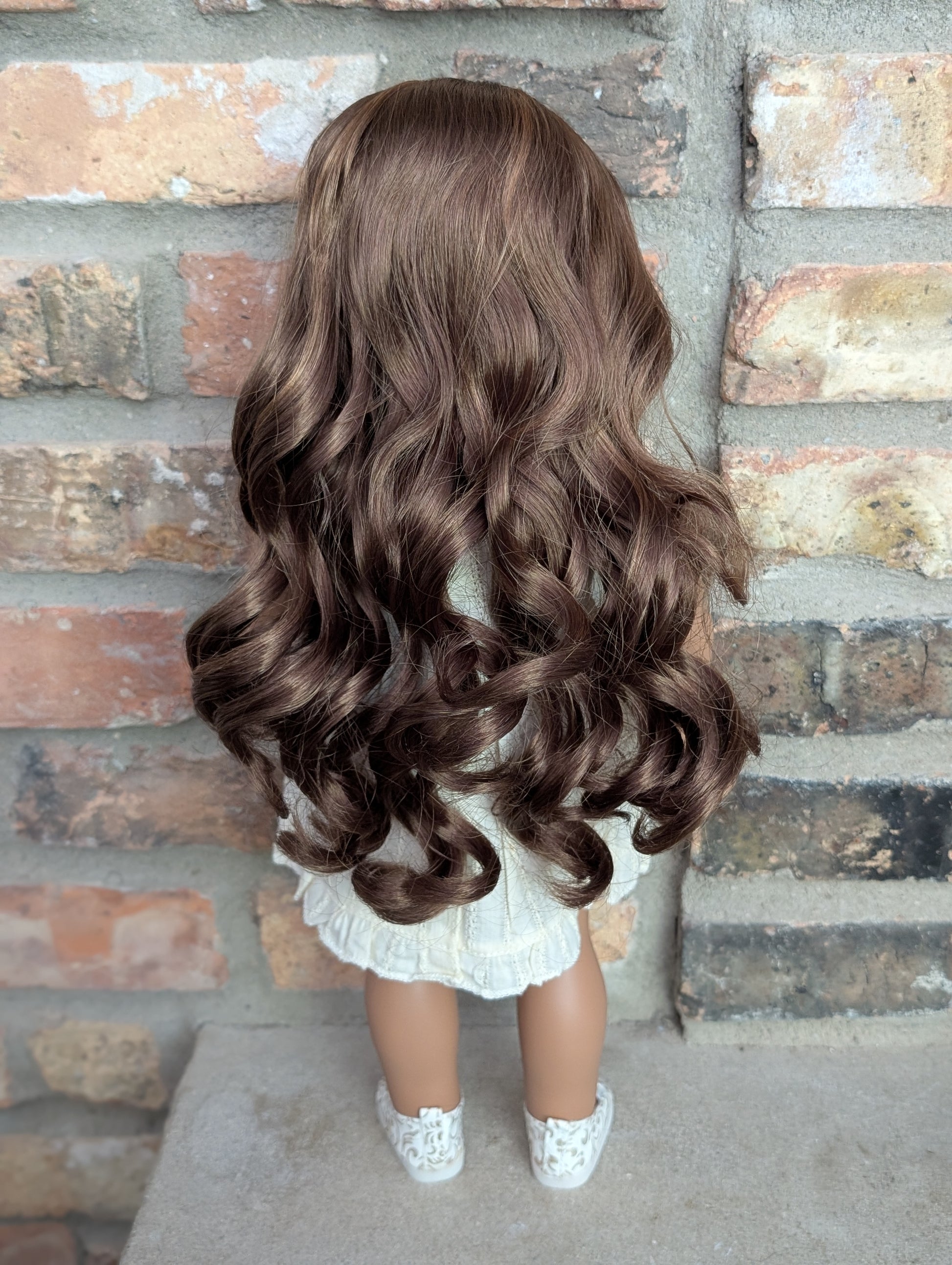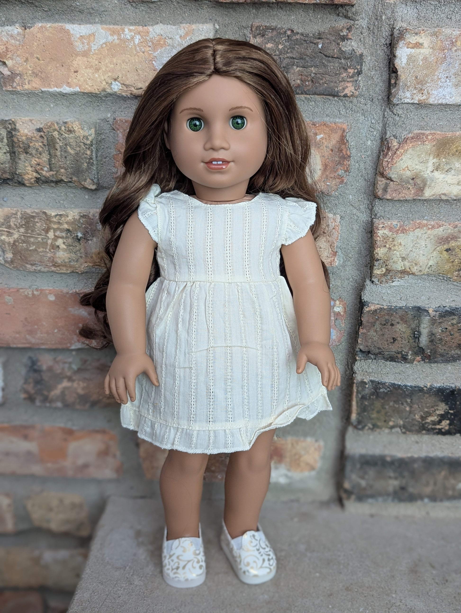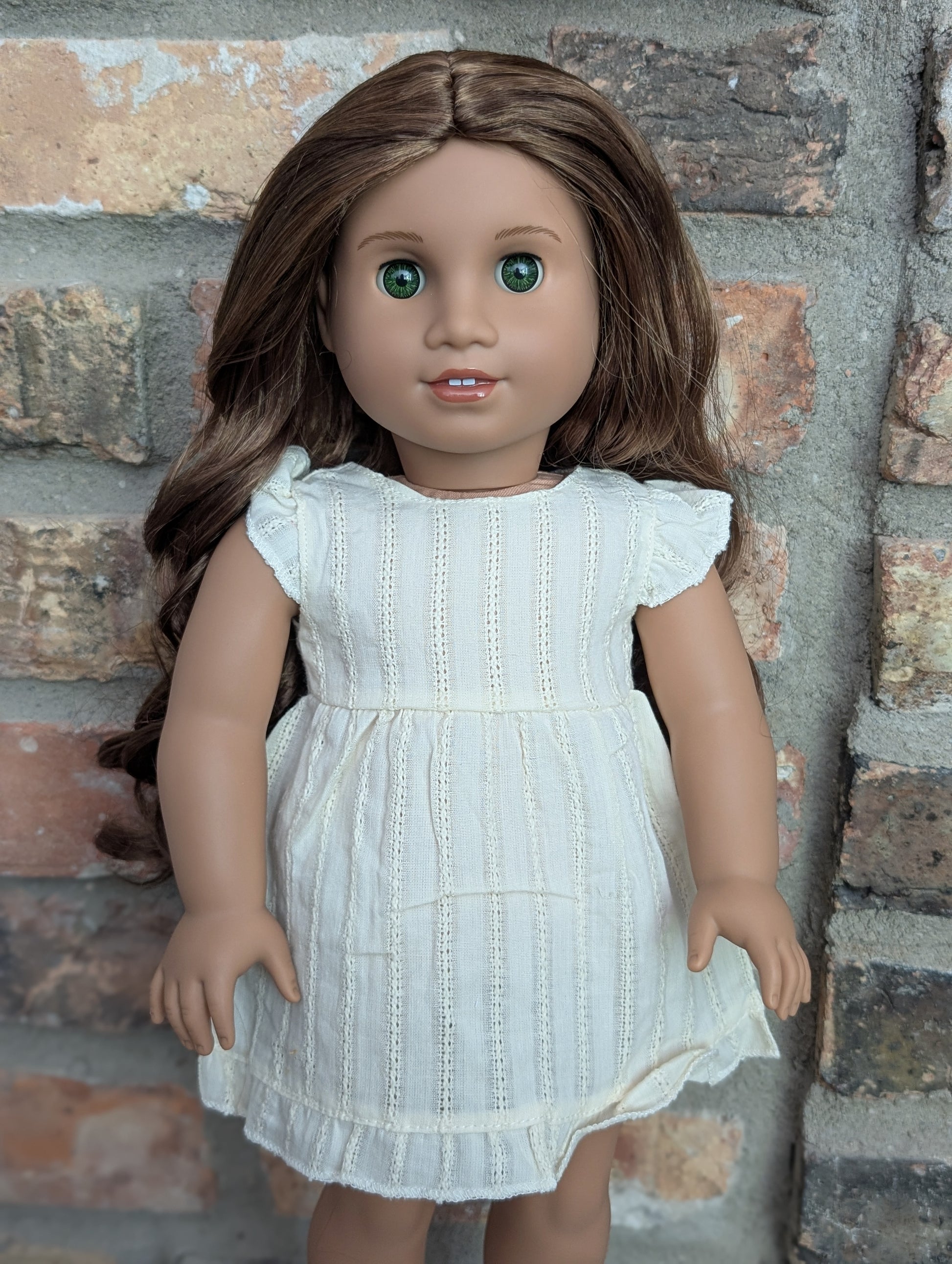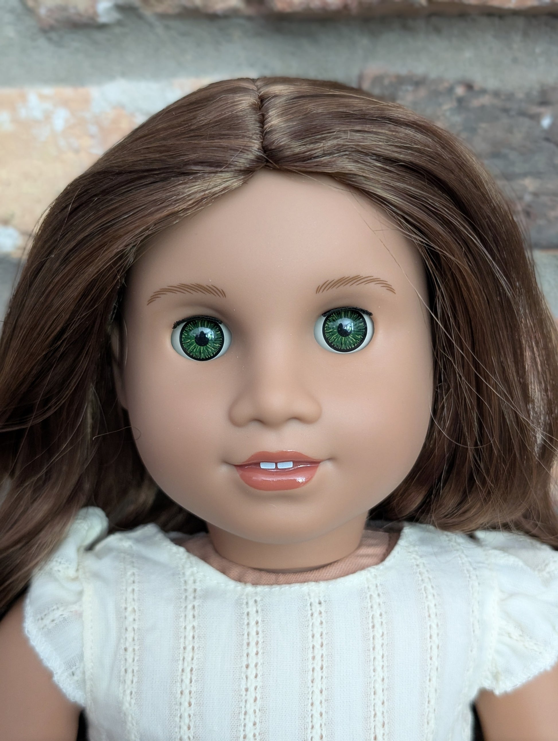 This one of a kind OOAK custom American Girl doll was created with a brand new doll, a brown wig, and green from a BeForever Felicity. She has lip gloss that was hand painted and sealed. She may have some minor shine marks from handling. She comes with the outfit pictured.