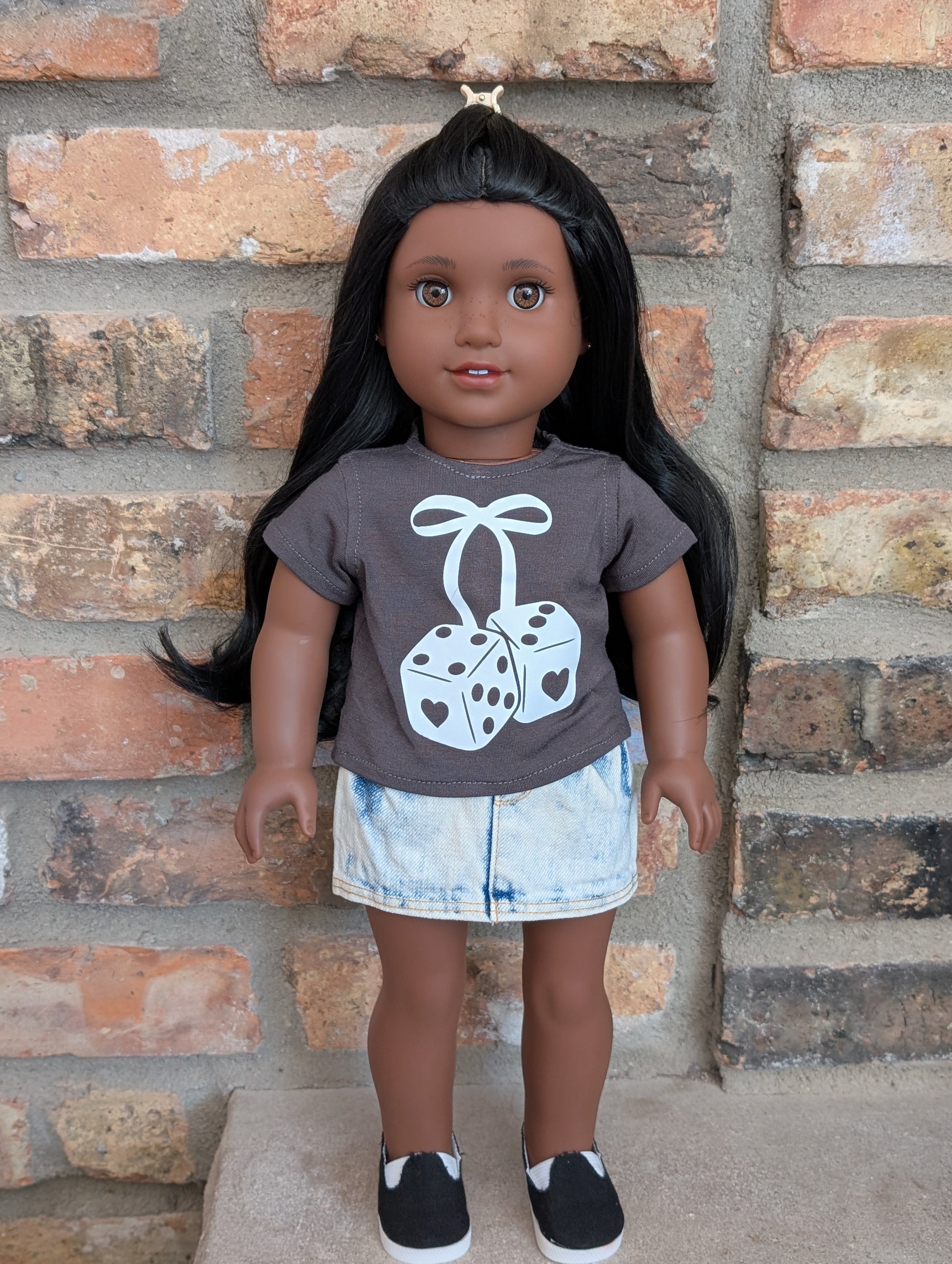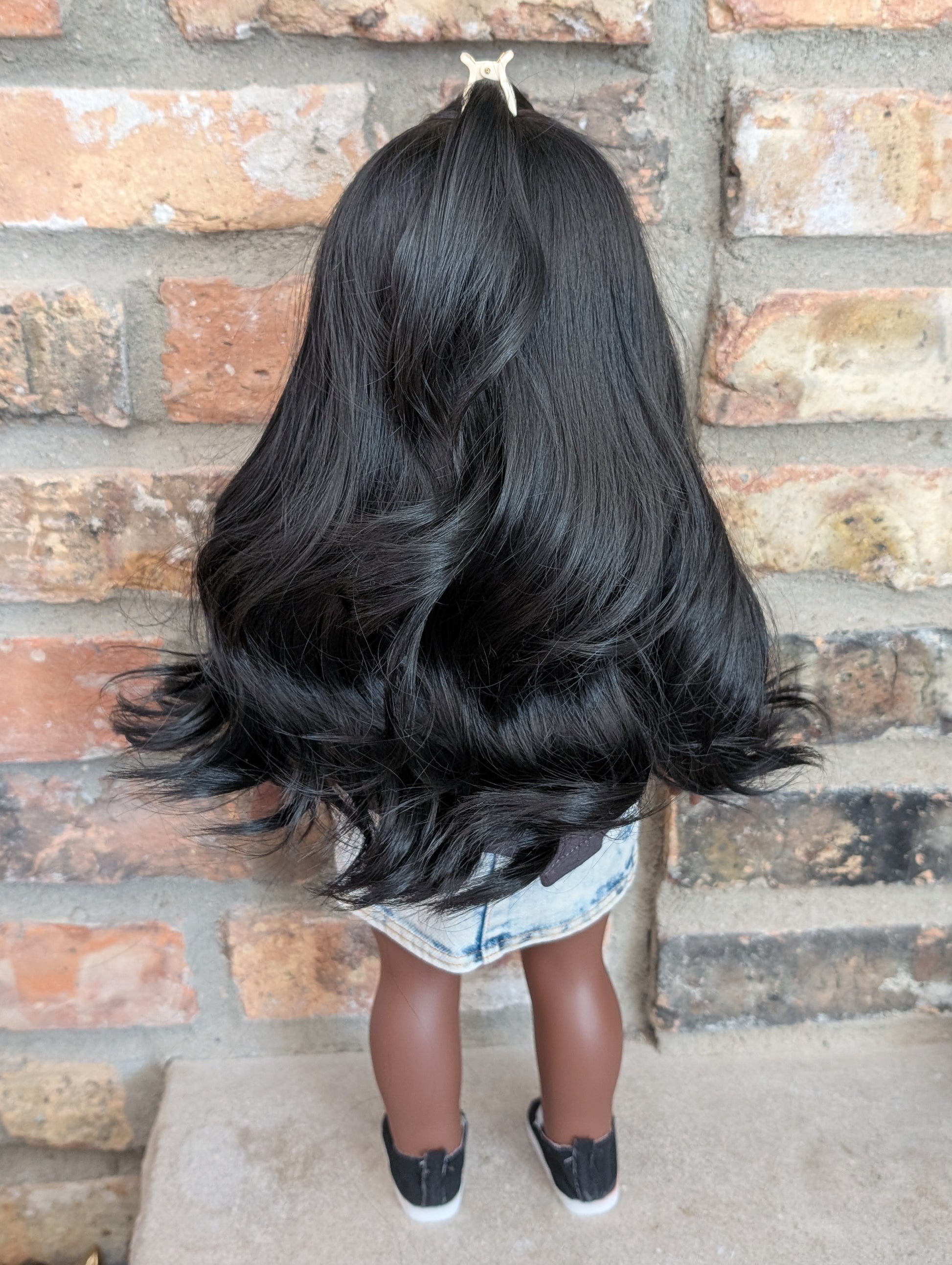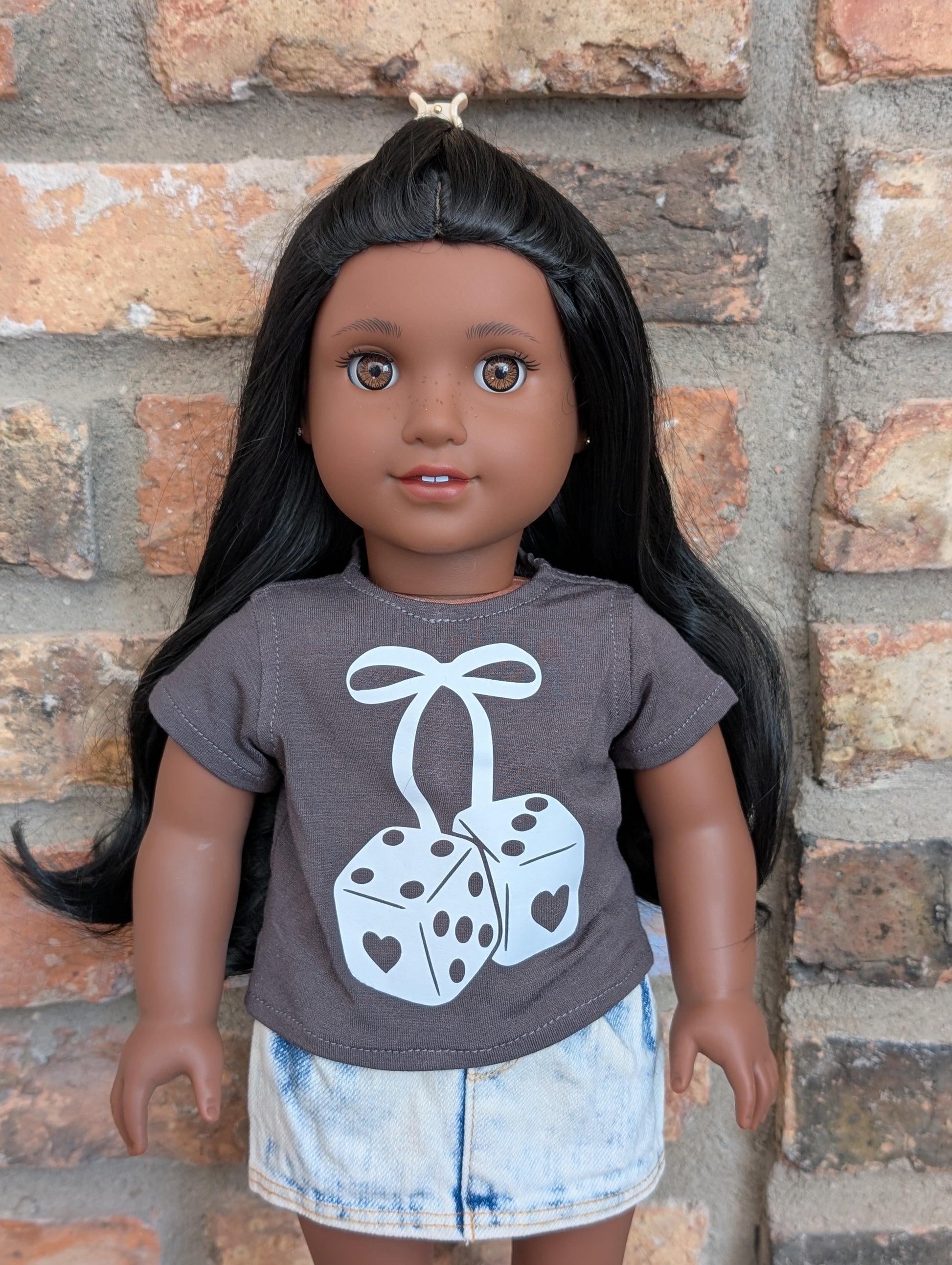 This one of a kind OOAK custom American Girl doll was created with a brand new doll, a black wig, and light brown decal eyes. She may have some minor shine marks from handling. She comes with the outfit pictured. Her ears are pierced with normal earrings and the tiny diamond look studs are included.