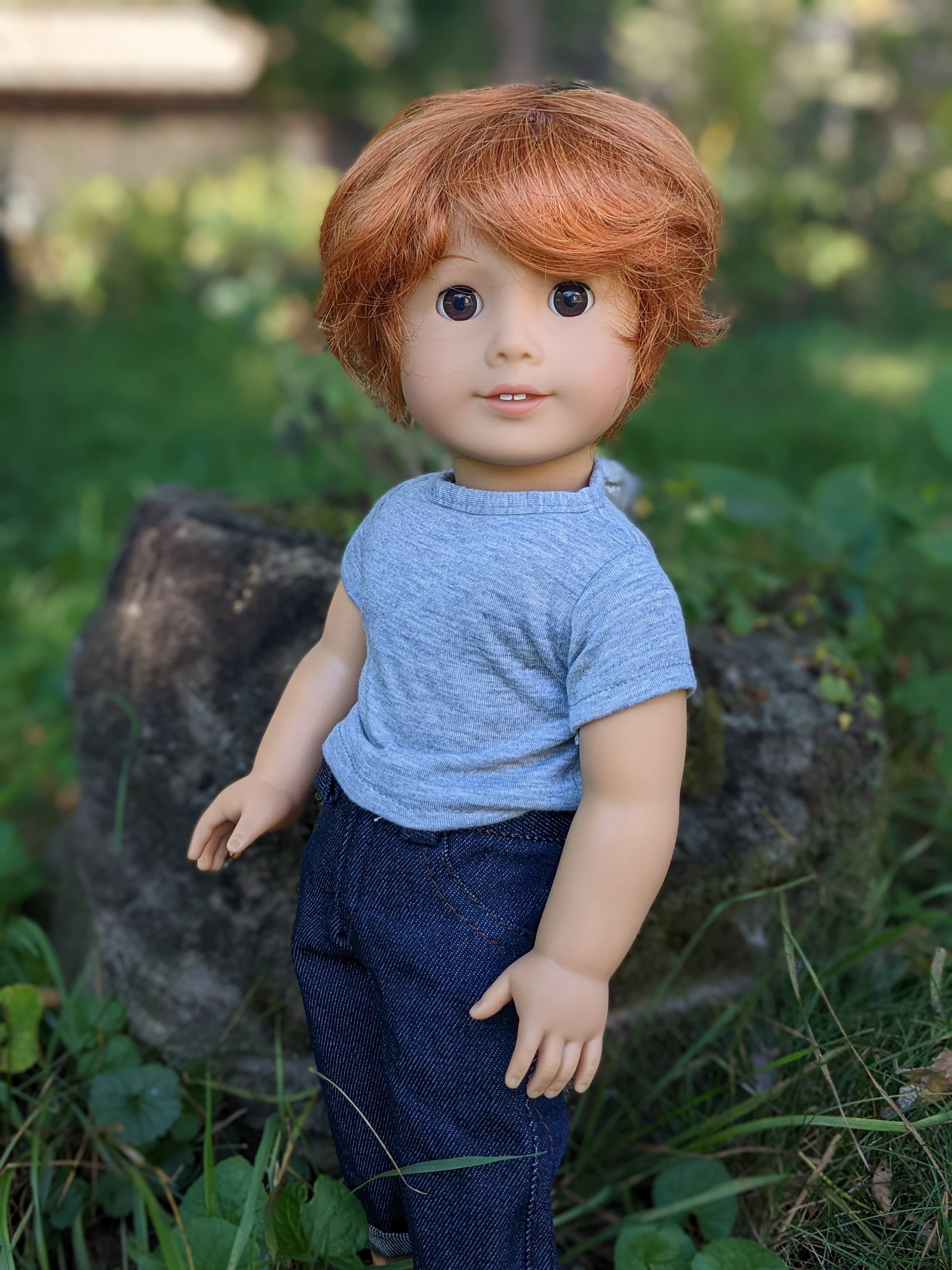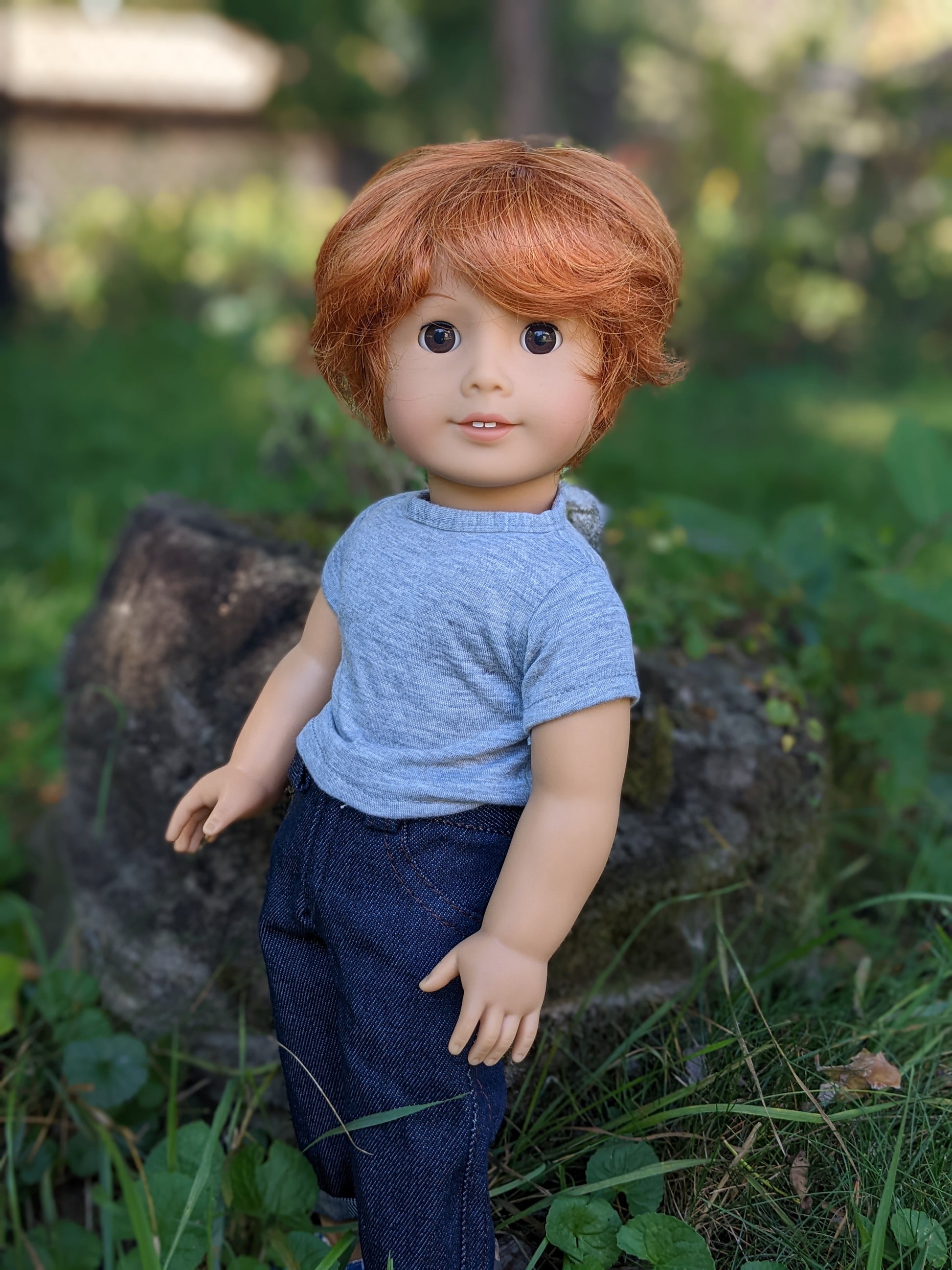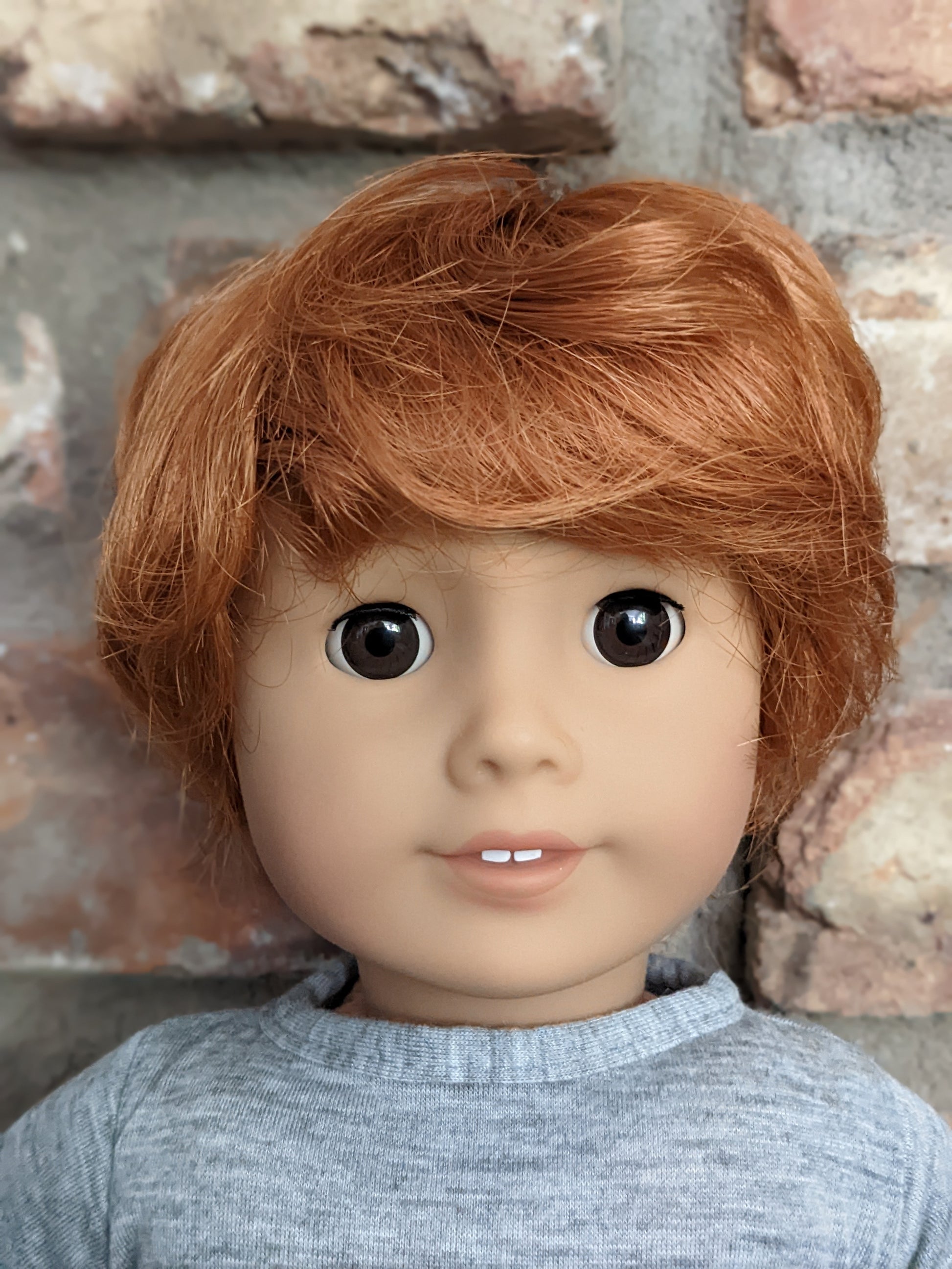 This one of a kind OOAK custom American Girl doll was created with a brand new Truly Me doll, a red wig, and brown eyes. He may have some minor shine marks from handling. He comes with the outfit pictured. He has a microfiber cloth body.