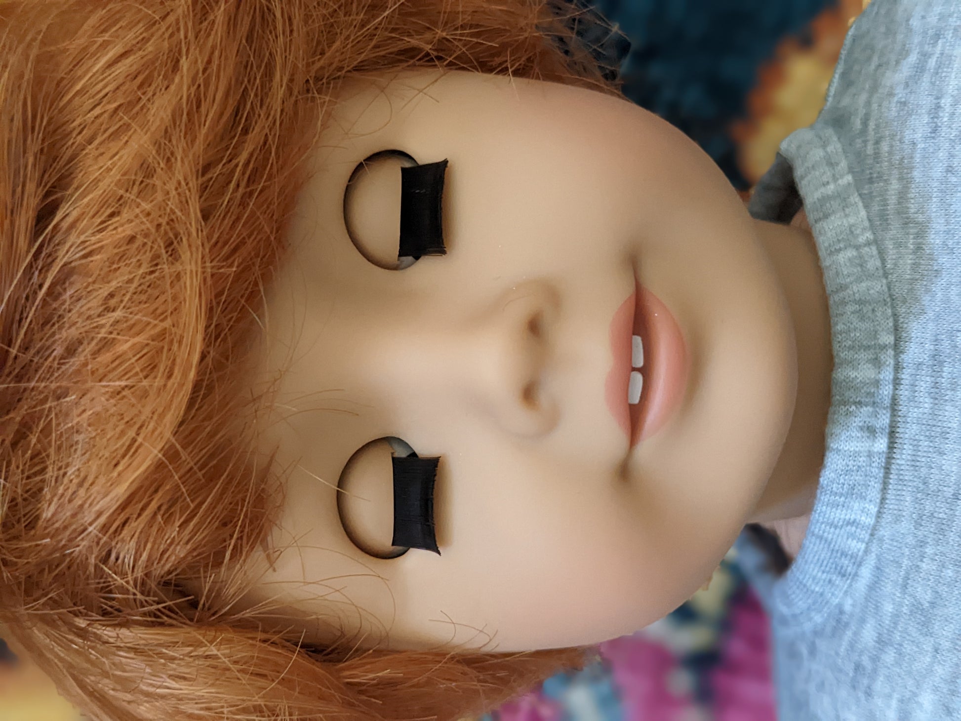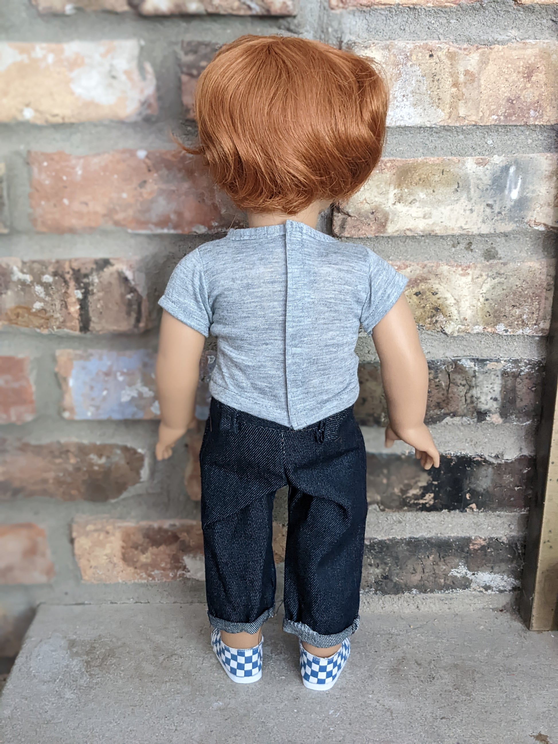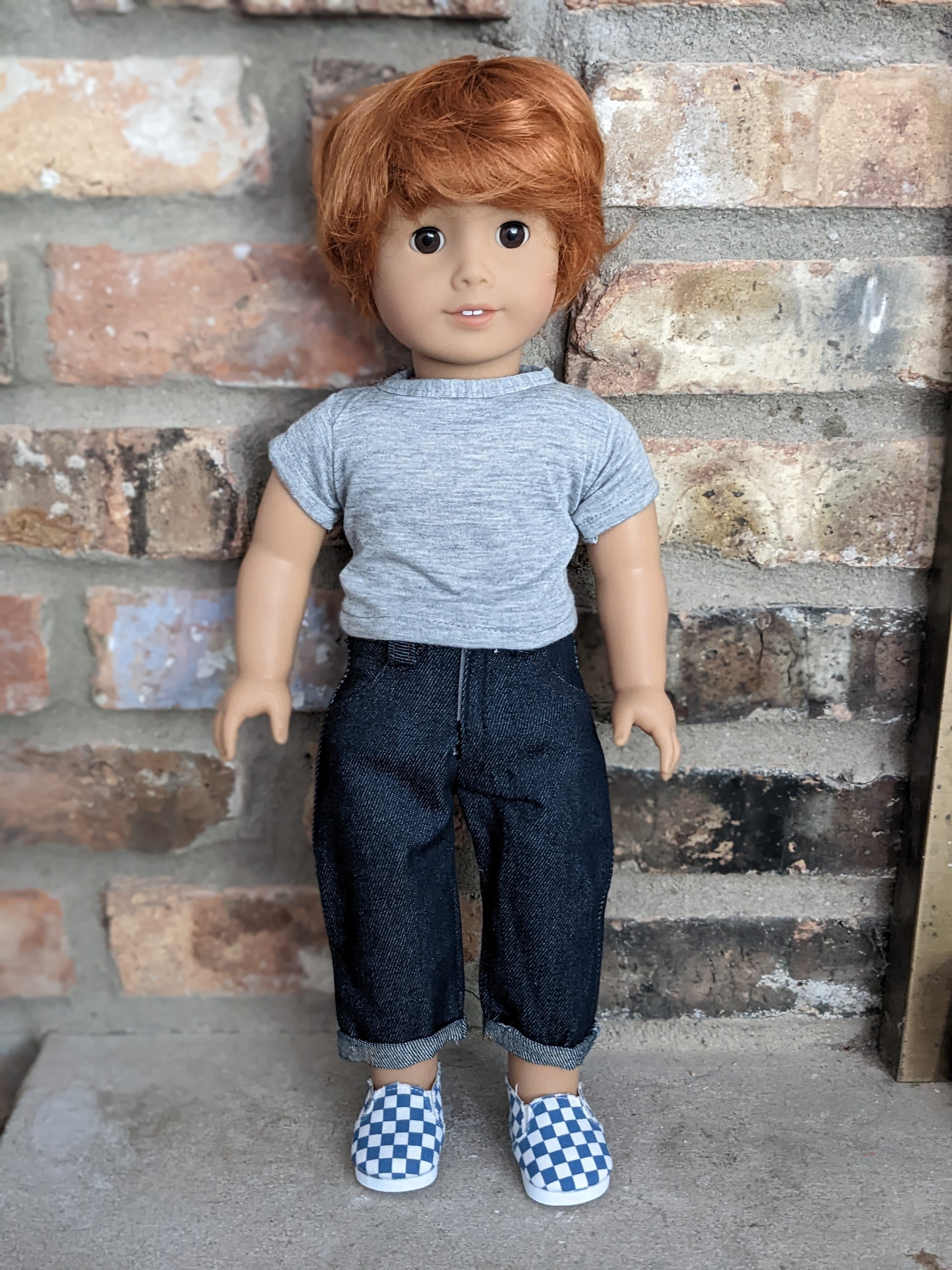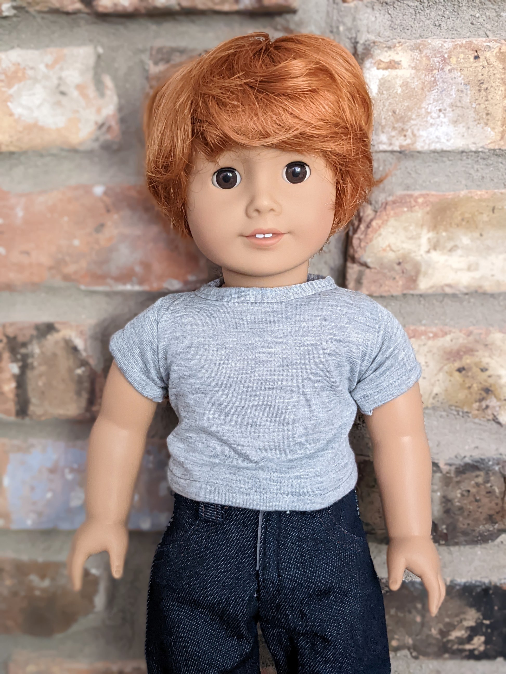 This one of a kind OOAK custom American Girl doll was created with a brand new Truly Me doll, a red wig, and brown eyes. He may have some minor shine marks from handling. He comes with the outfit pictured. He has a microfiber cloth body.