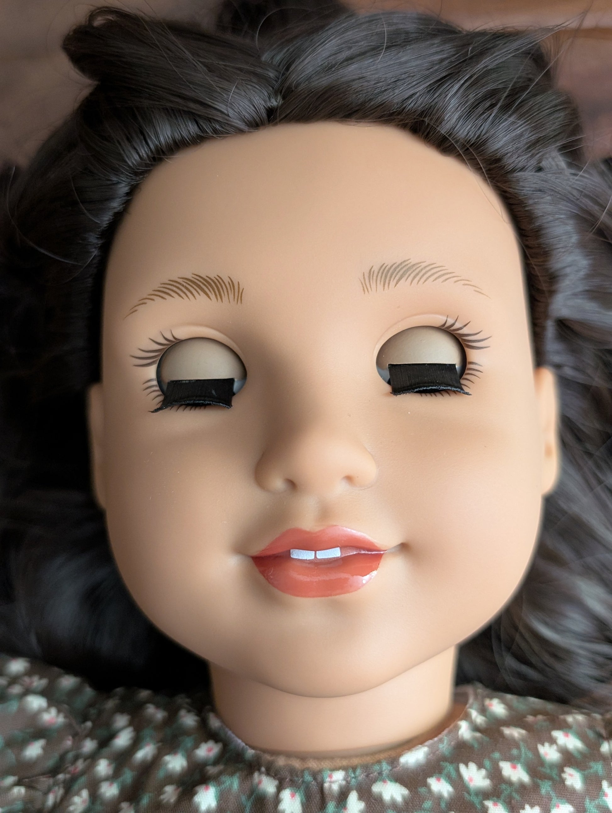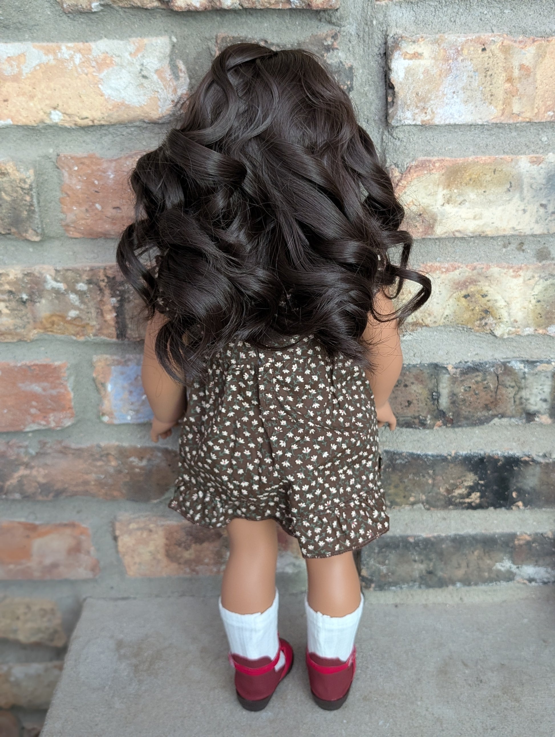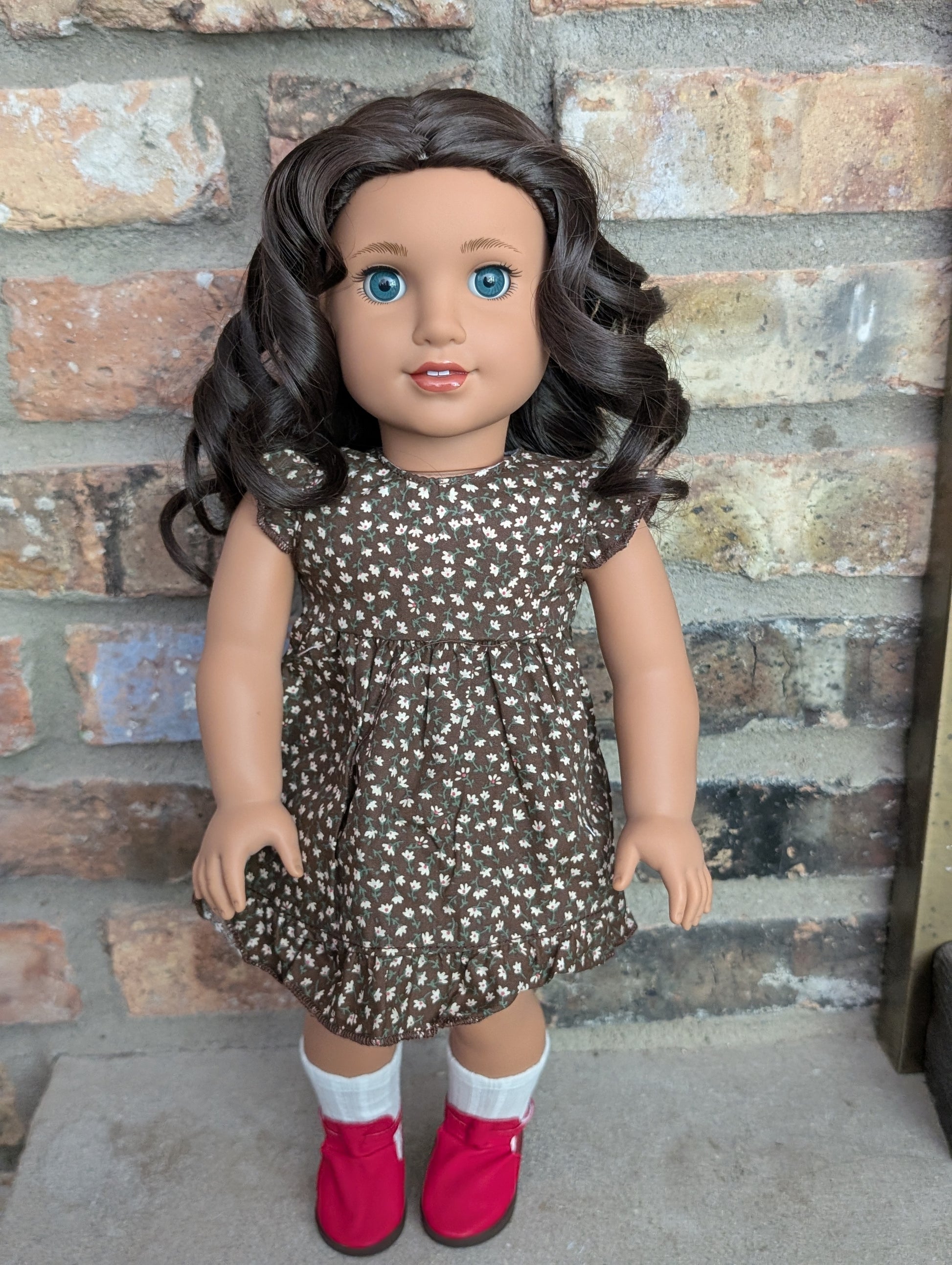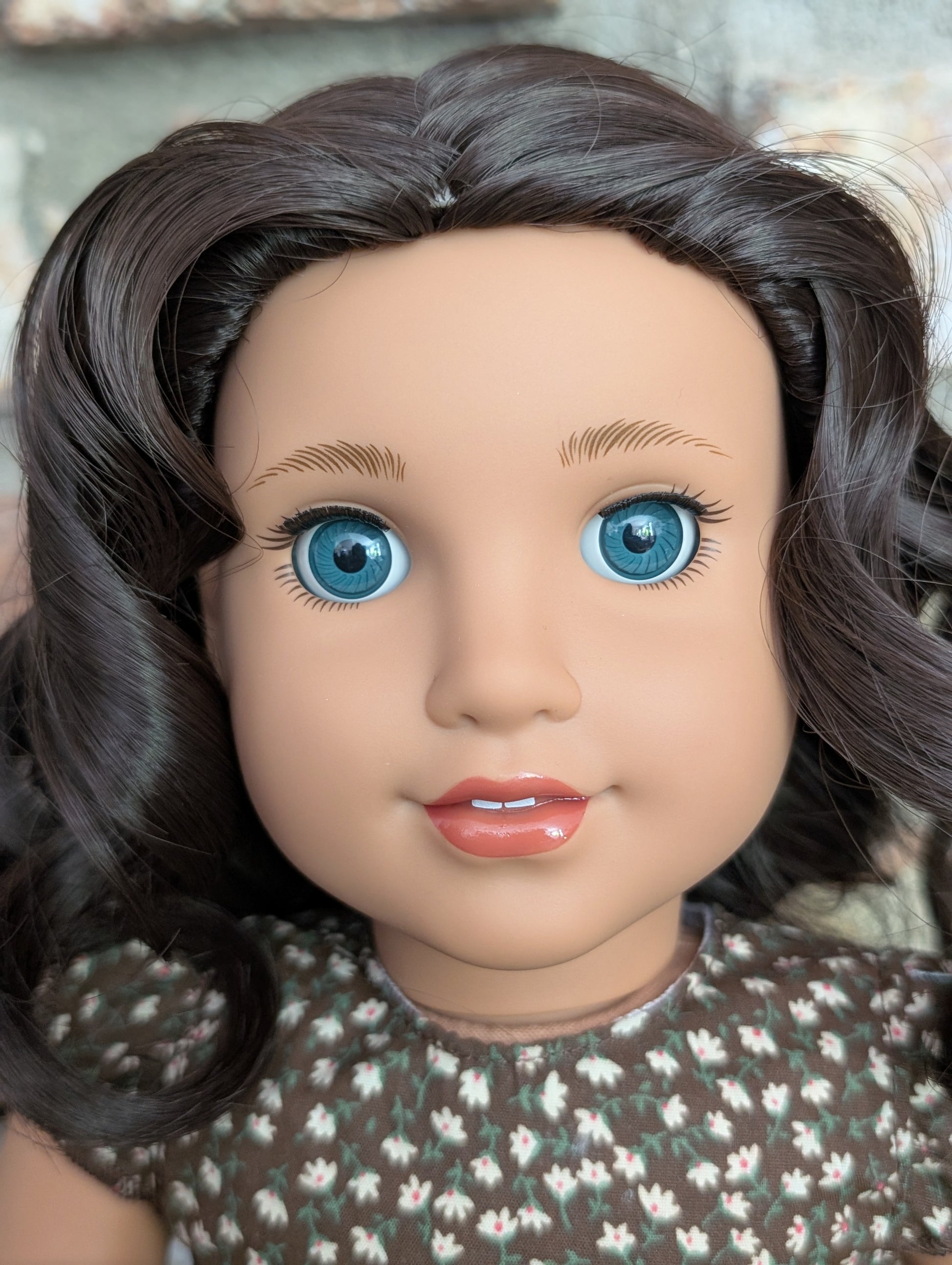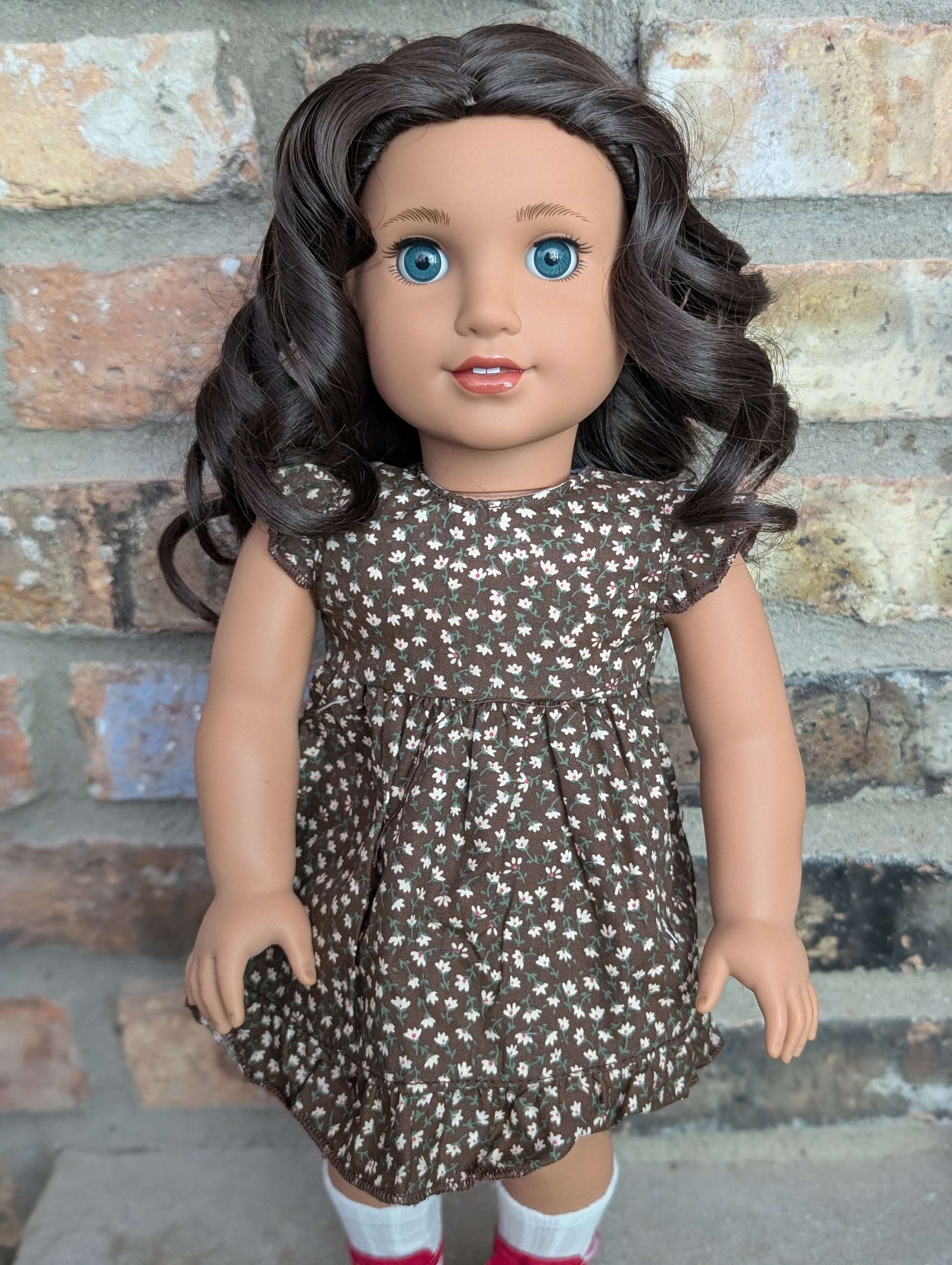 This one of a kind OOAK custom American Girl doll was created with a brand new doll, a dark brown wig, and blue eyes. She has lip gloss that was hand painted and sealed. She may have some minor shine marks from handling. She comes with the outfit pictured.