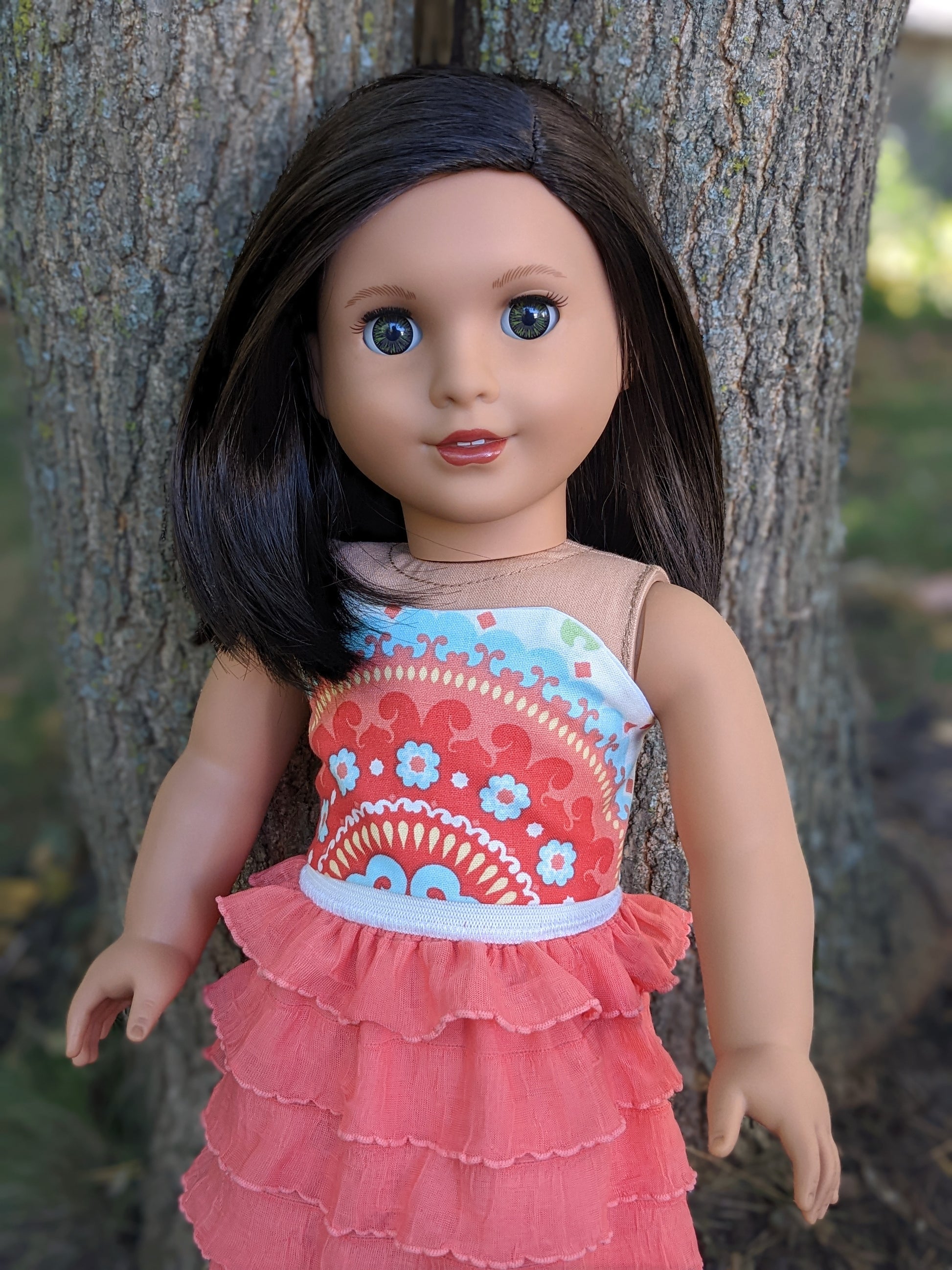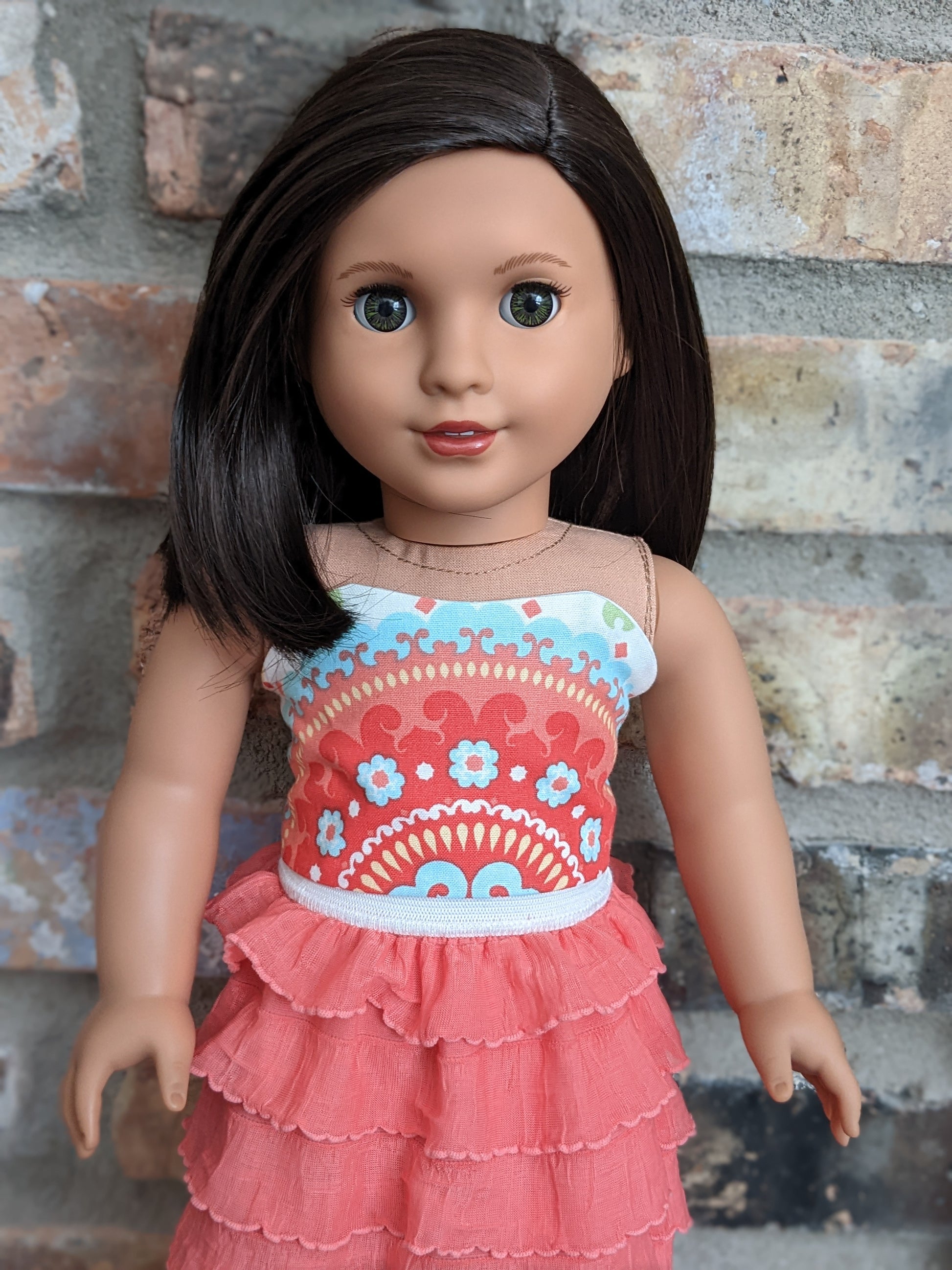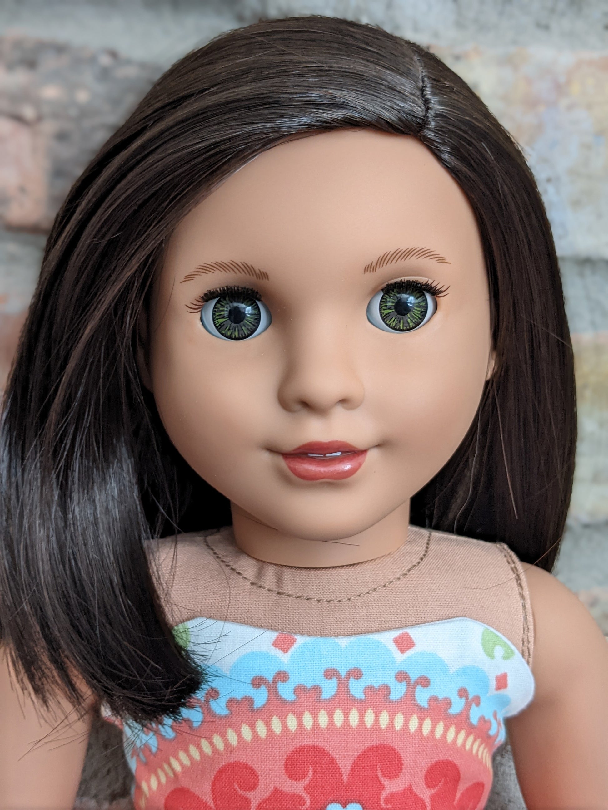This one of a kind OOAK custom American Girl doll was created with a brand new Truly Me doll, a dark brown black wig, and hazel eyes. She has lip gloss that was hand painted and sealed. She may have some minor shine marks from handling. She comes with the outfit pictured. Her bottom painted on eyelashes have been removed.
