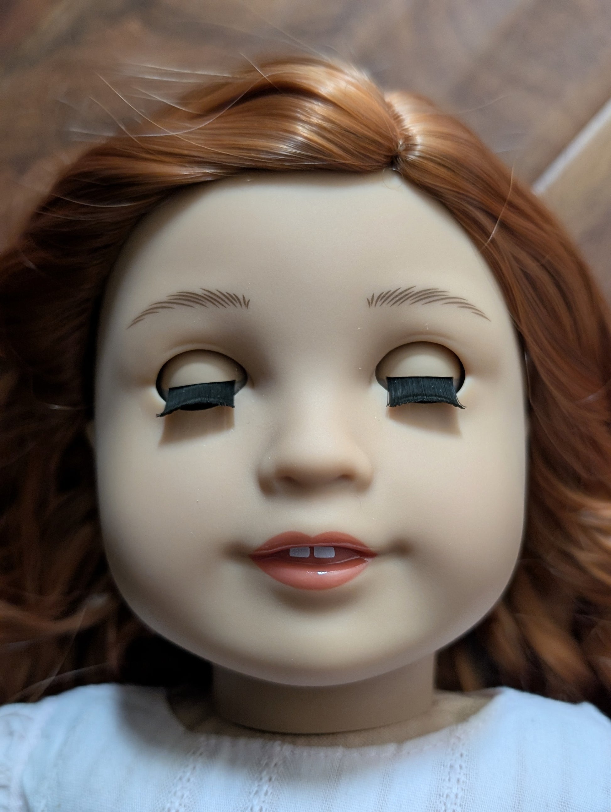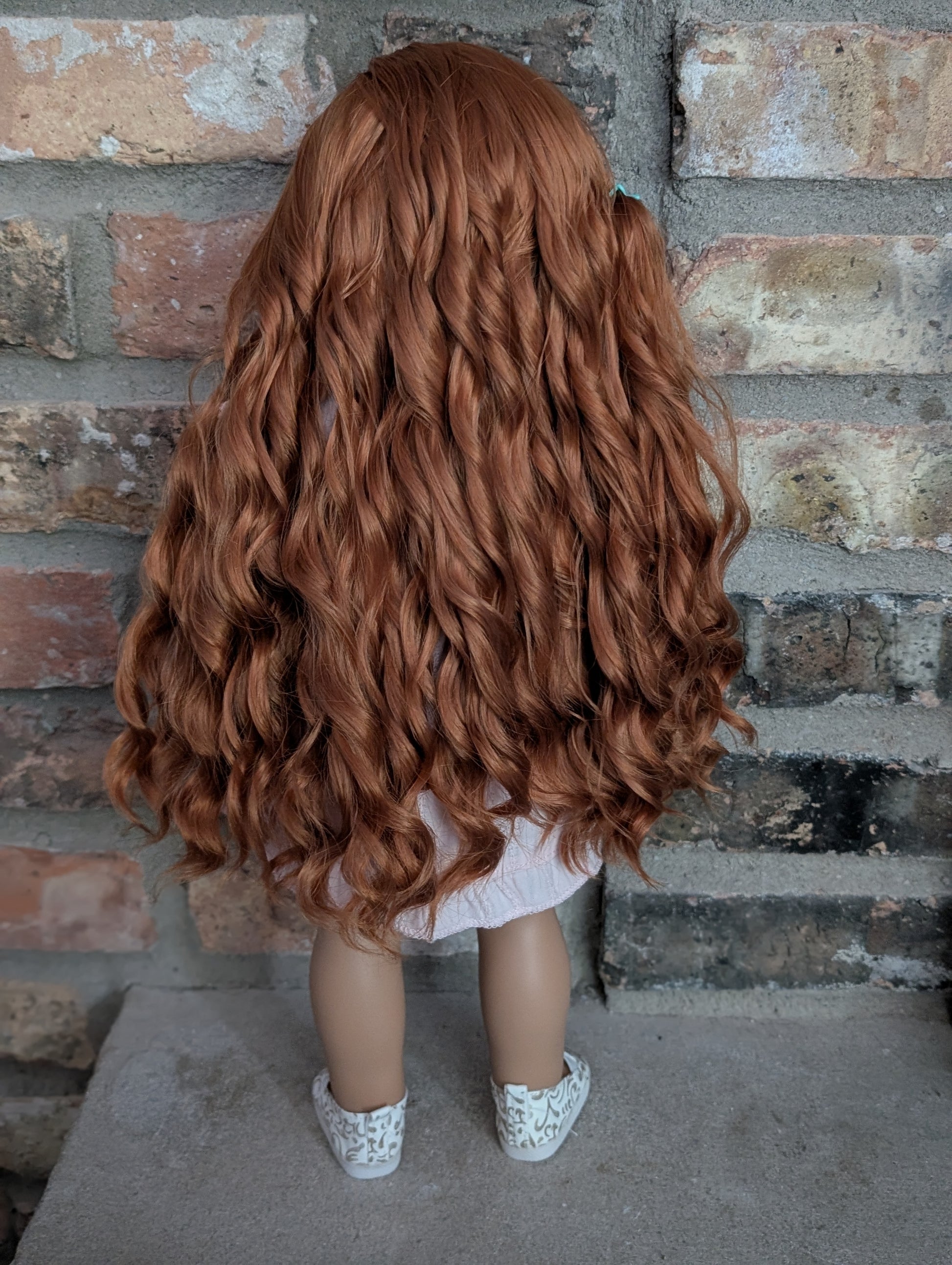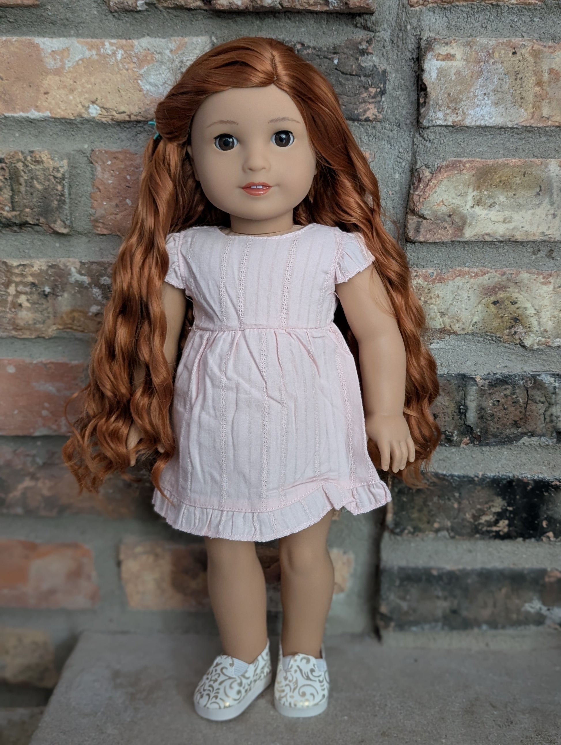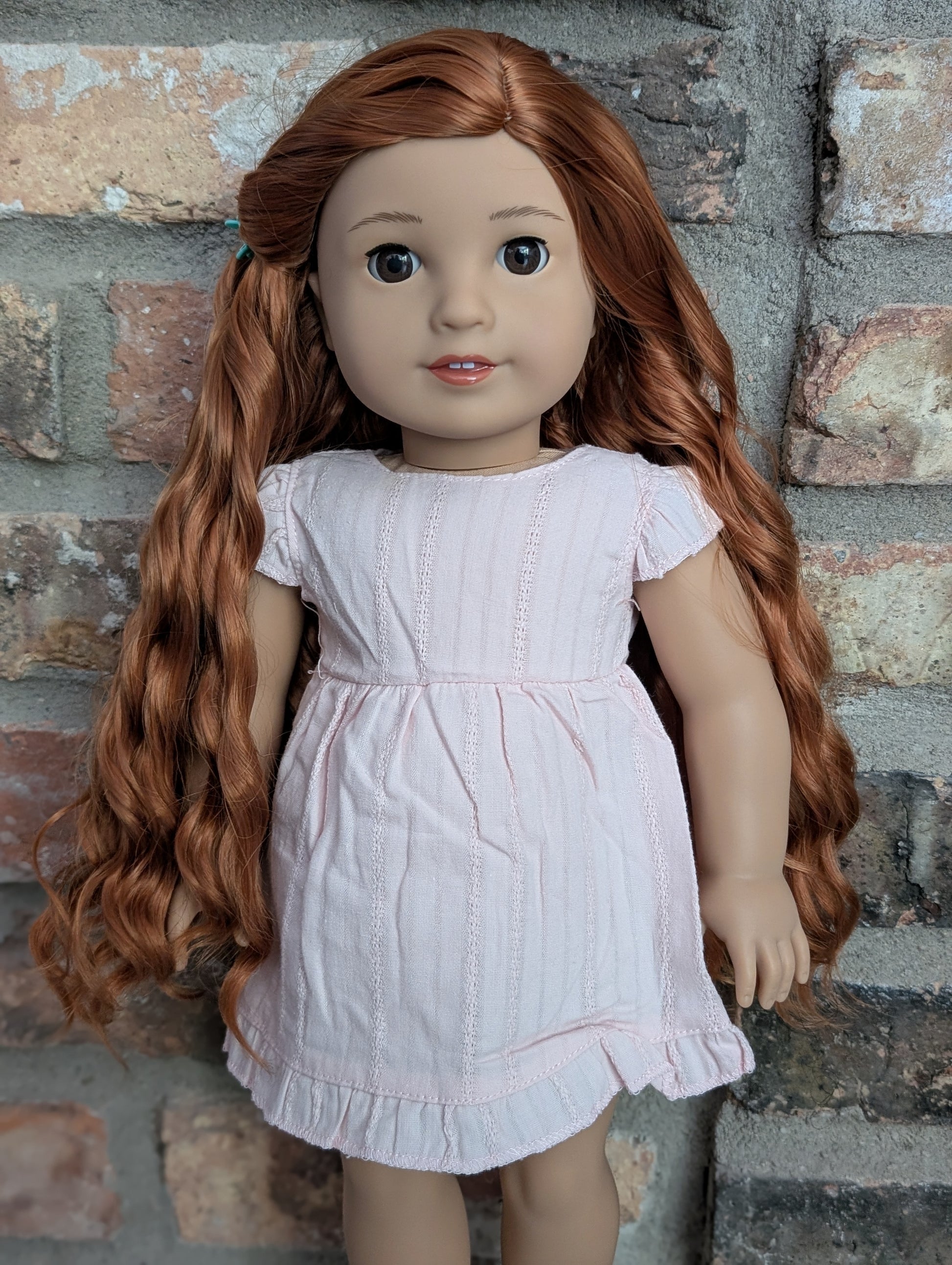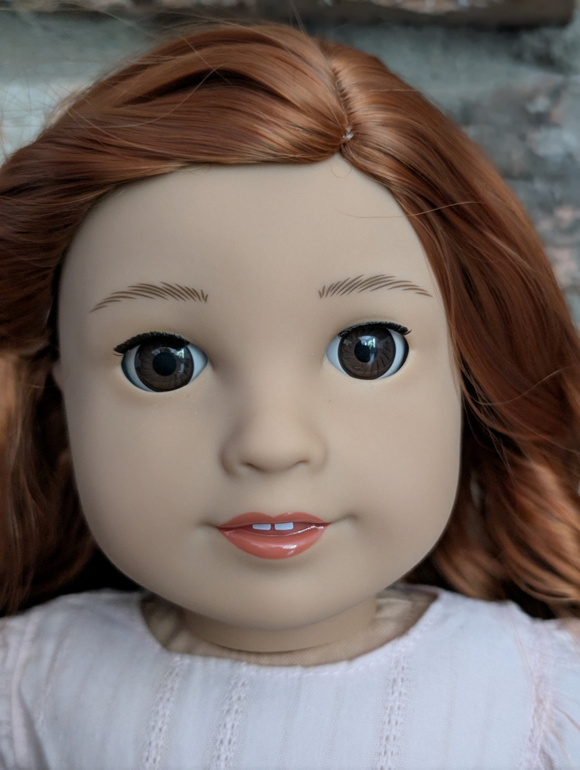 This one of a kind OOAK custom American Girl doll was created with a brand new doll, a red wig, and brown eyes. She has lip gloss that was hand painted and sealed. She may have some minor shine marks from handling. She comes with the outfit pictured.