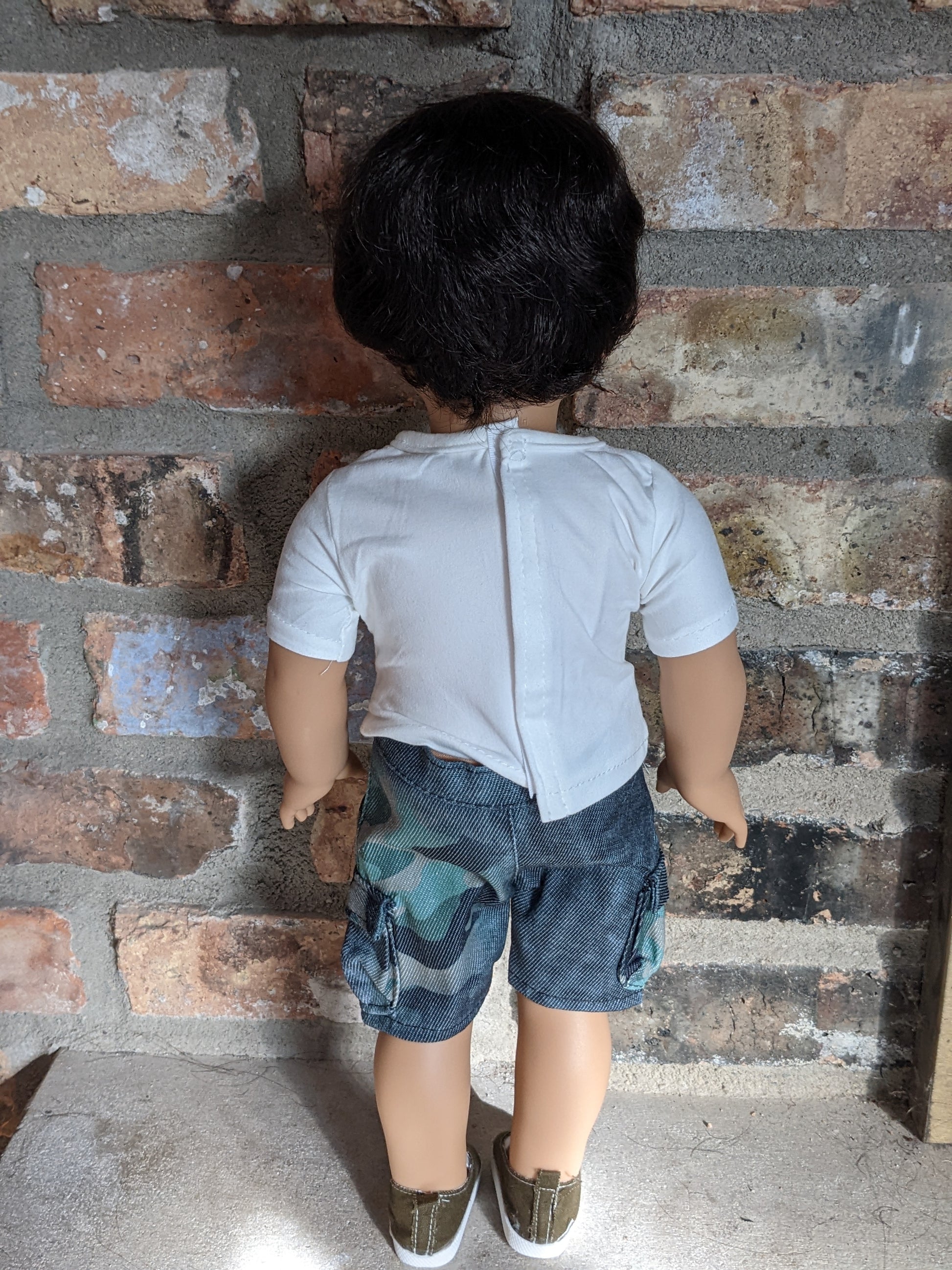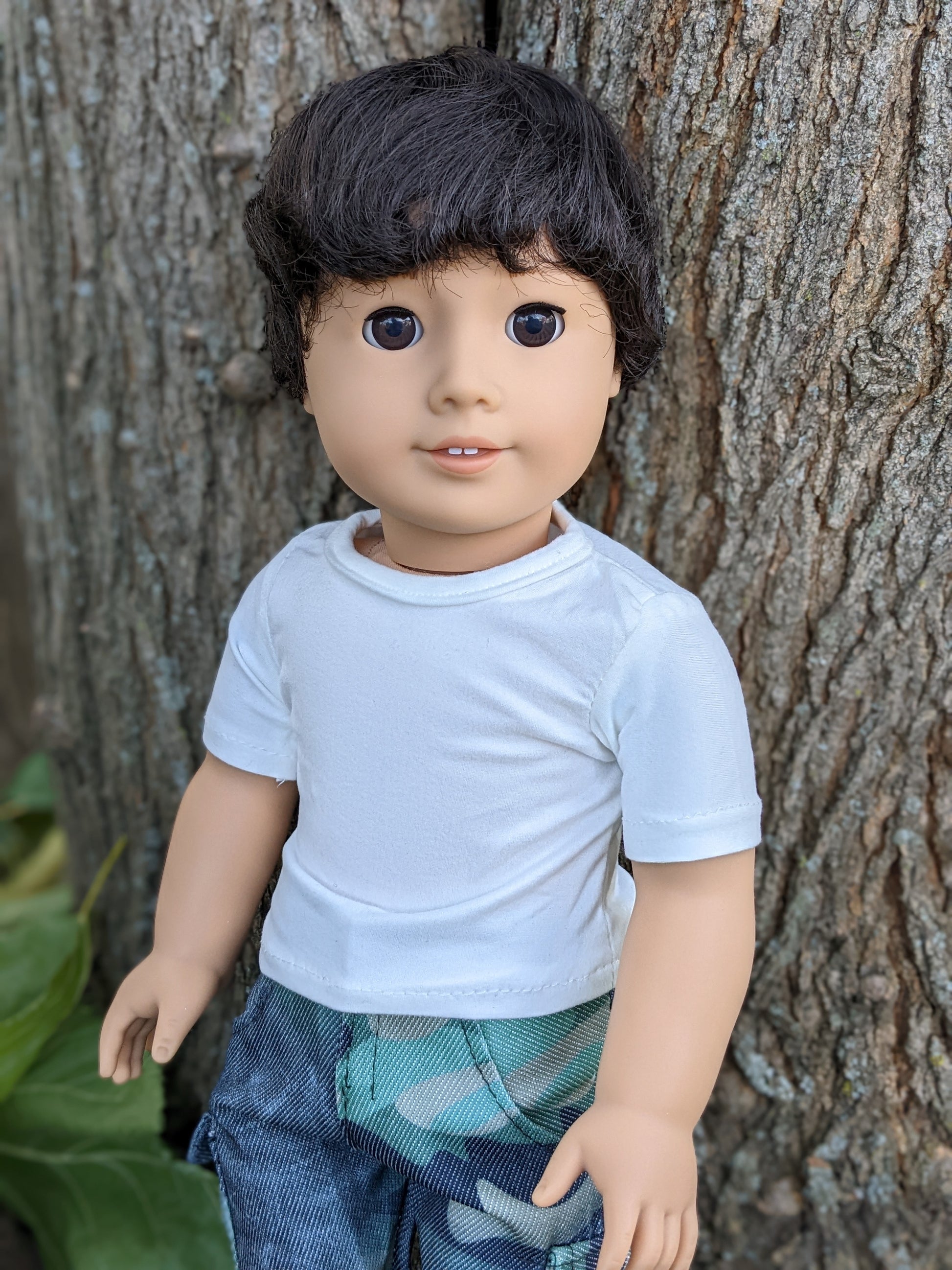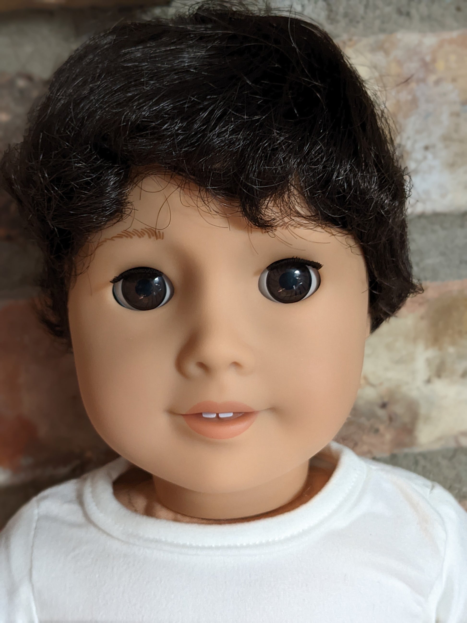 This one of a kind OOAK custom American Girl doll was created with a brand new Truly Me doll, a black wig, and brown eyes. He may have some minor shine marks from handling. He comes with the outfit pictured.