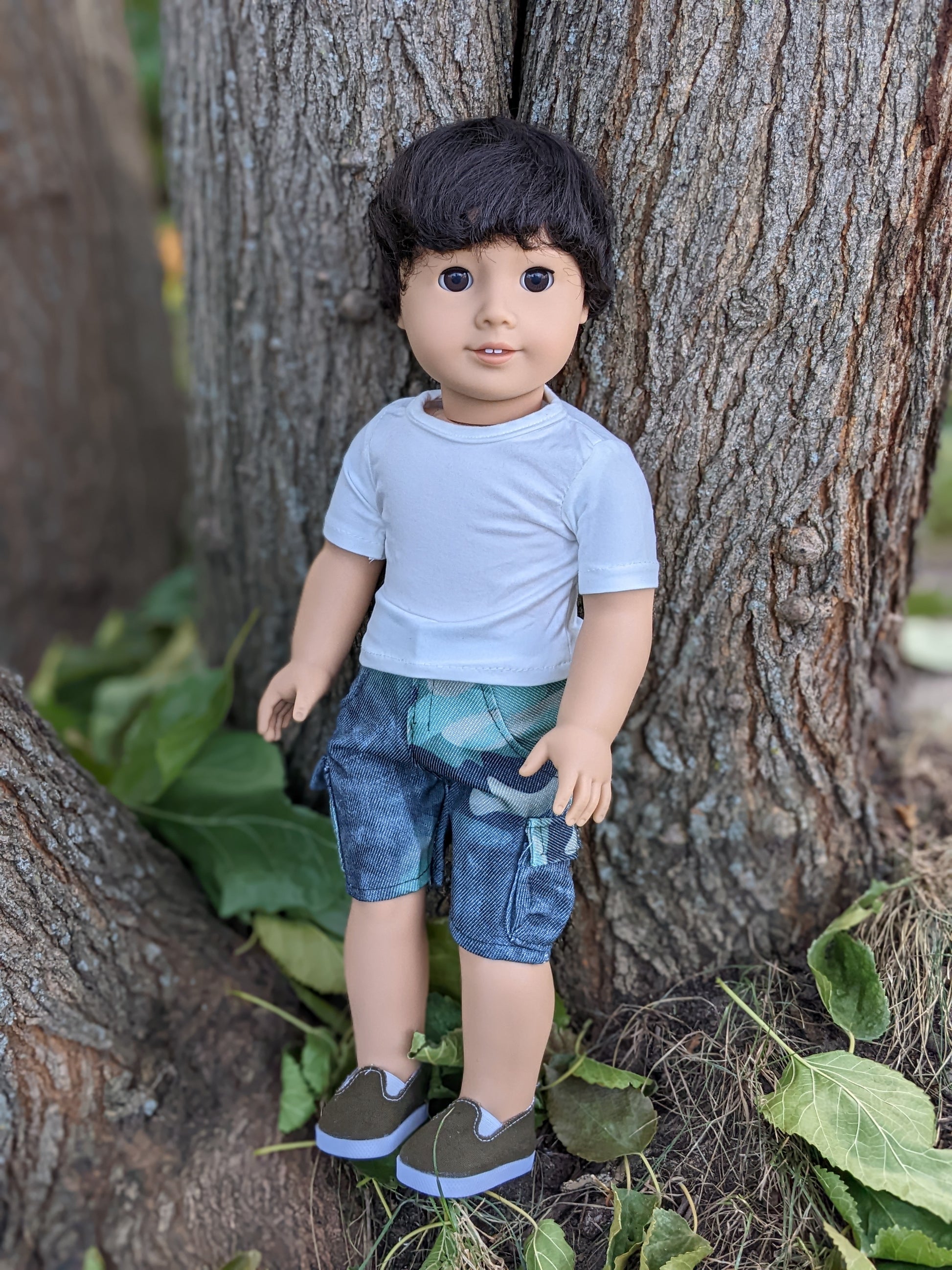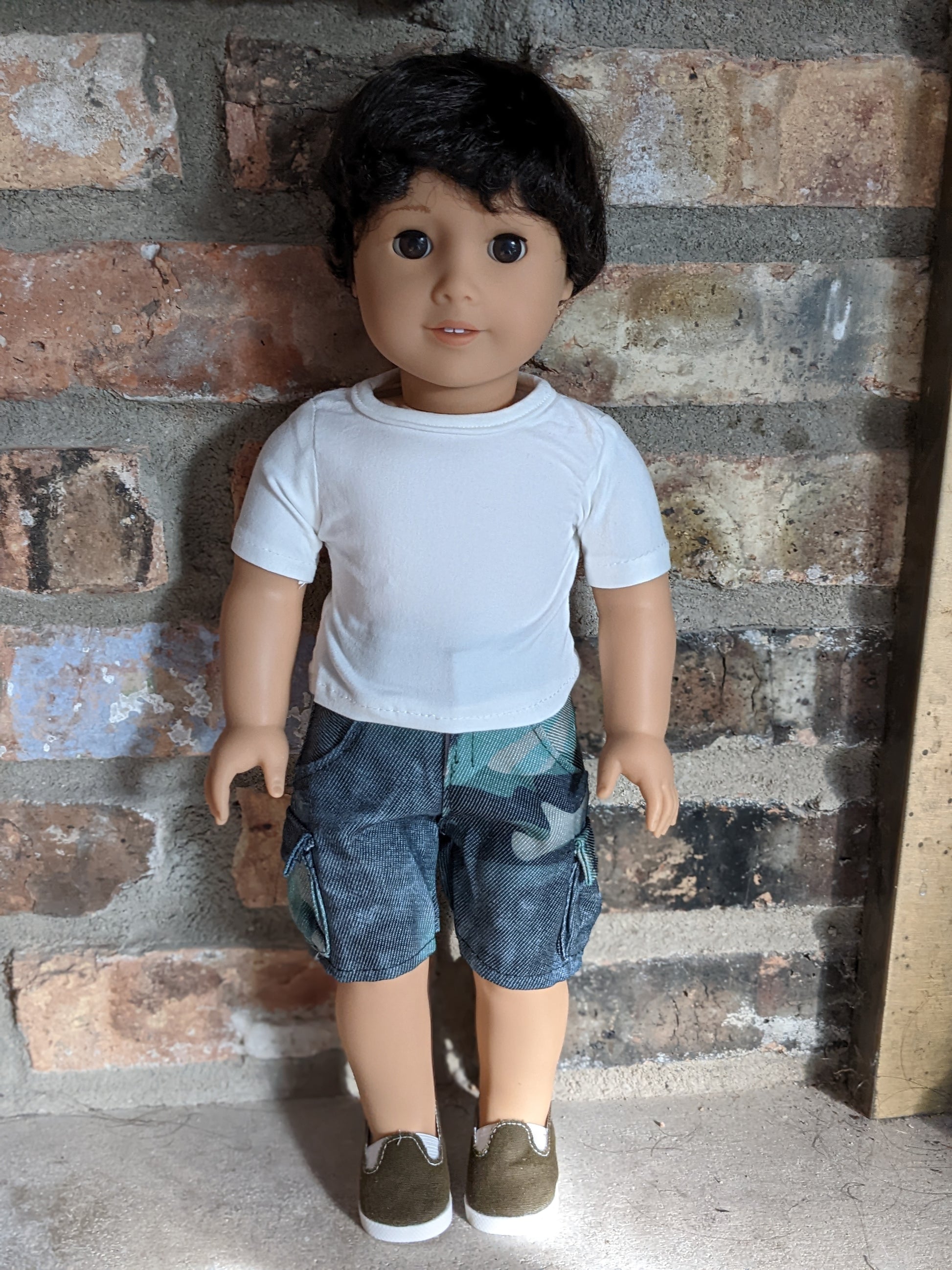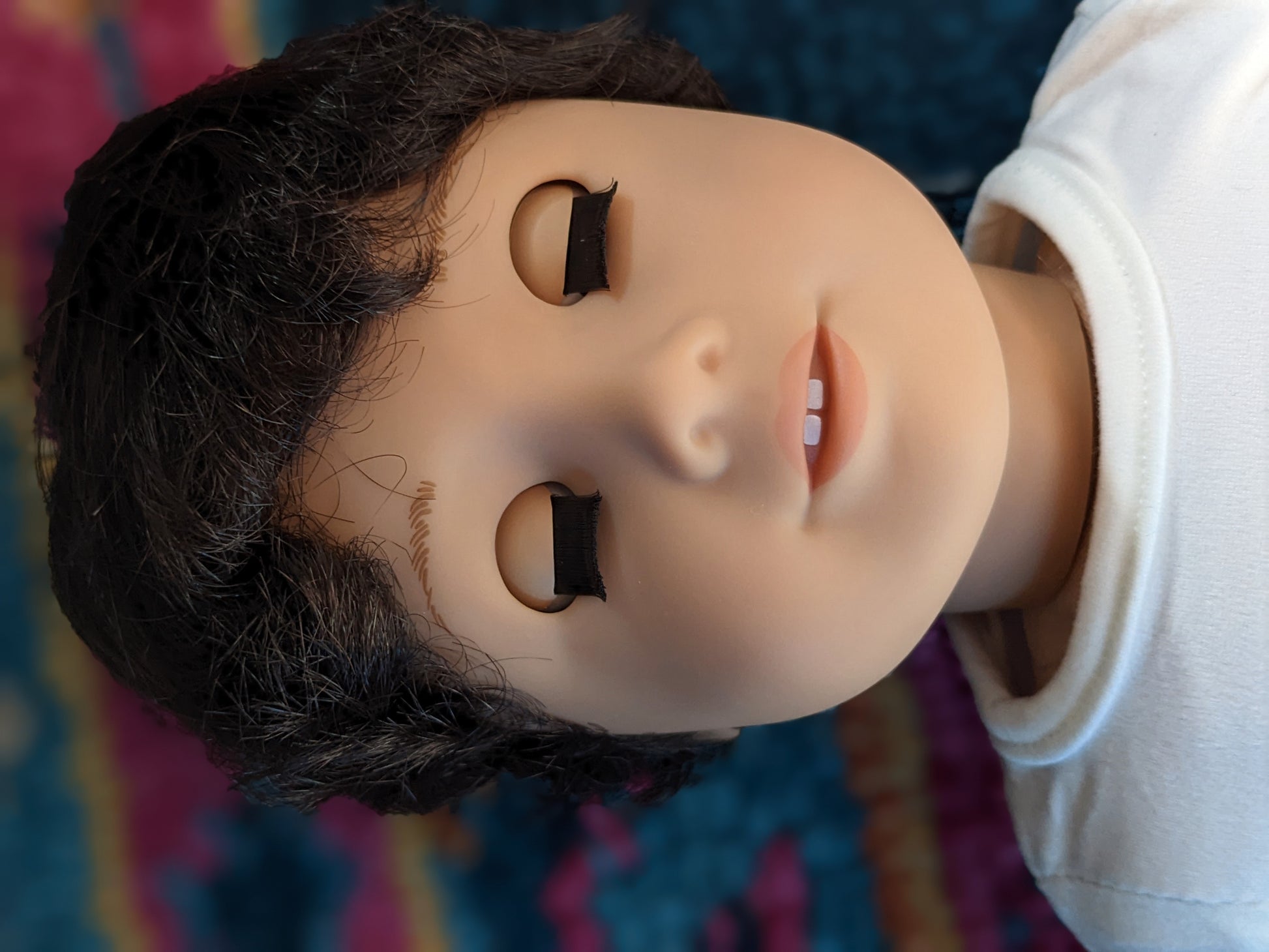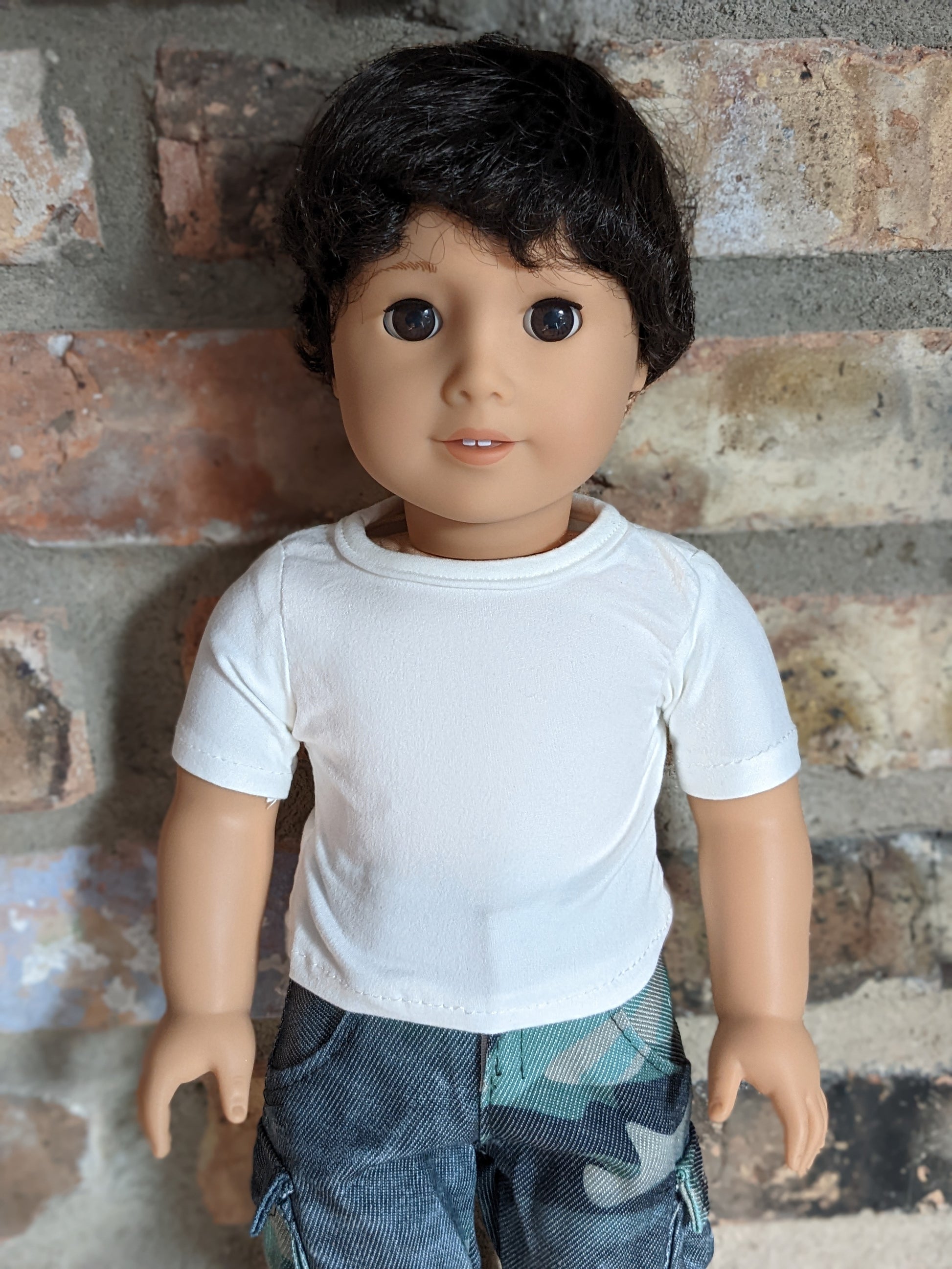 This one of a kind OOAK custom American Girl doll was created with a brand new Truly Me doll, a black wig, and brown eyes. He may have some minor shine marks from handling. He comes with the outfit pictured.