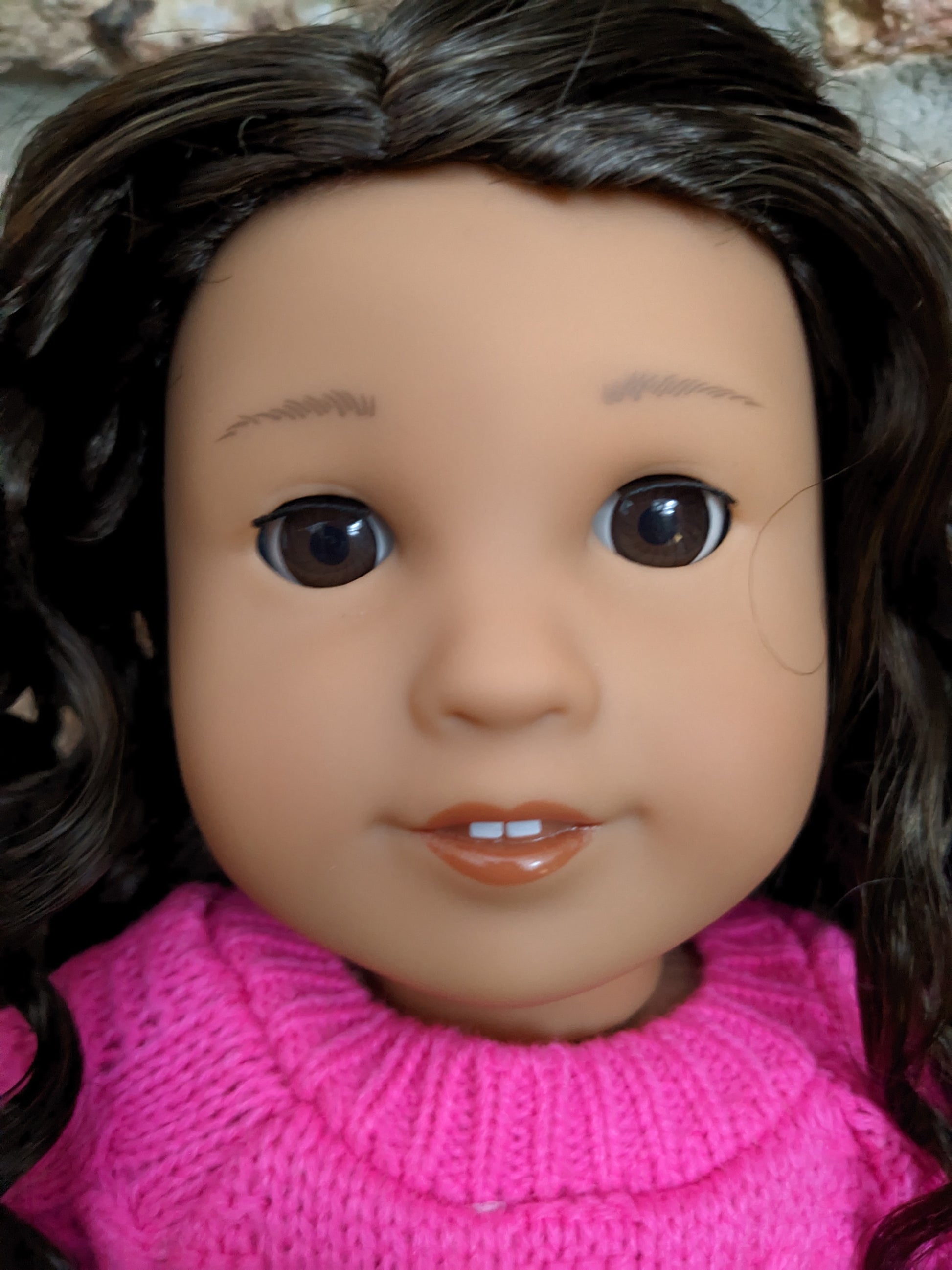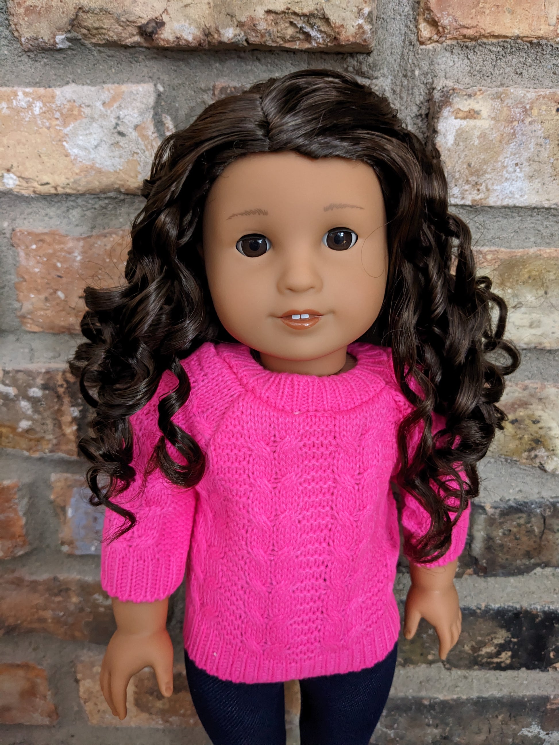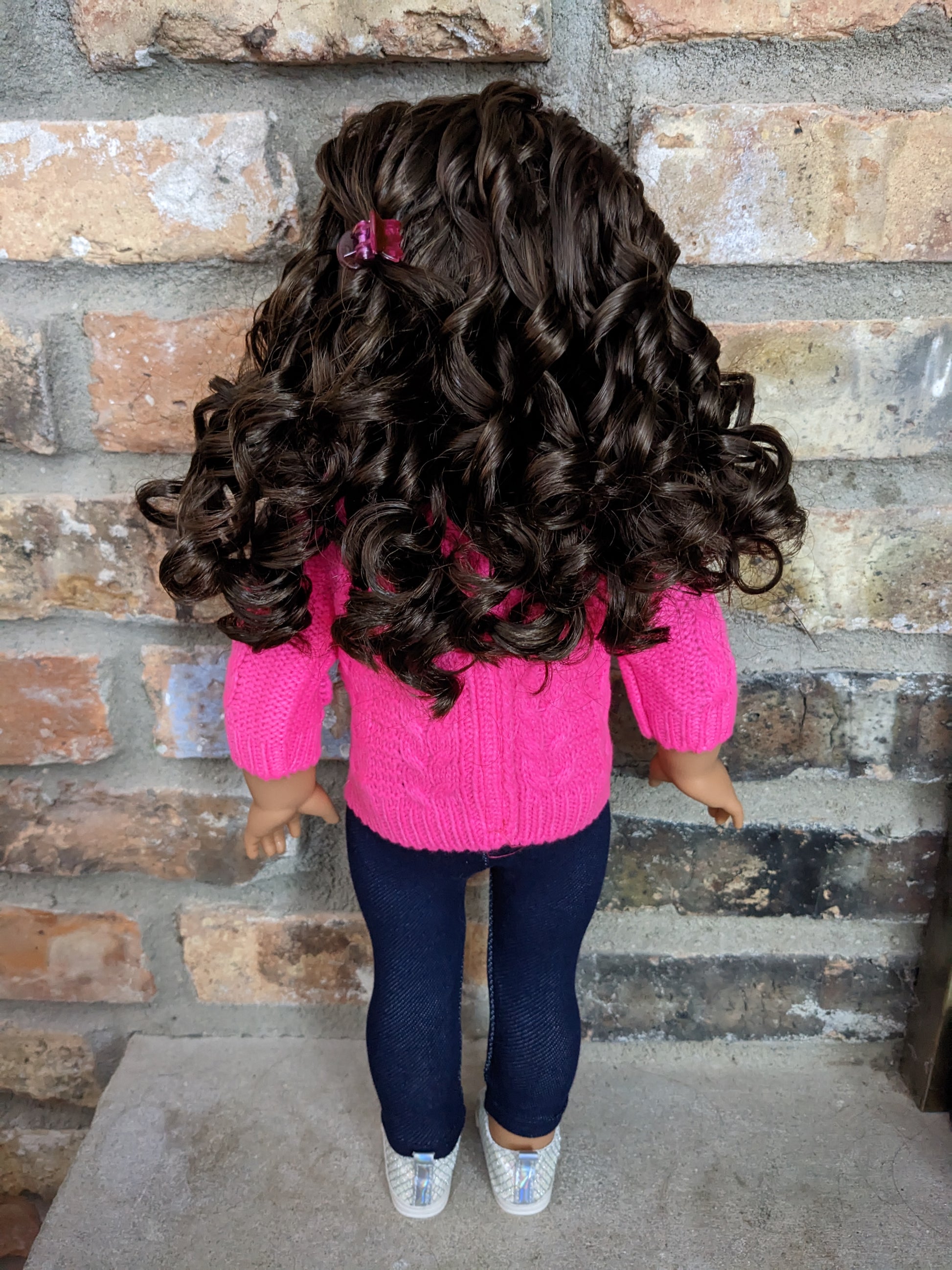 This one of a kind OOAK custom American Girl doll was created with a brand new TM 79 doll, a dark brown curly wig from a new Gabriela doll and brown eyes. She has lip gloss that was hand painted and sealed. She may have some minor shine marks from handling. She comes with the outfit pictured. She has a microfiber cloth body.