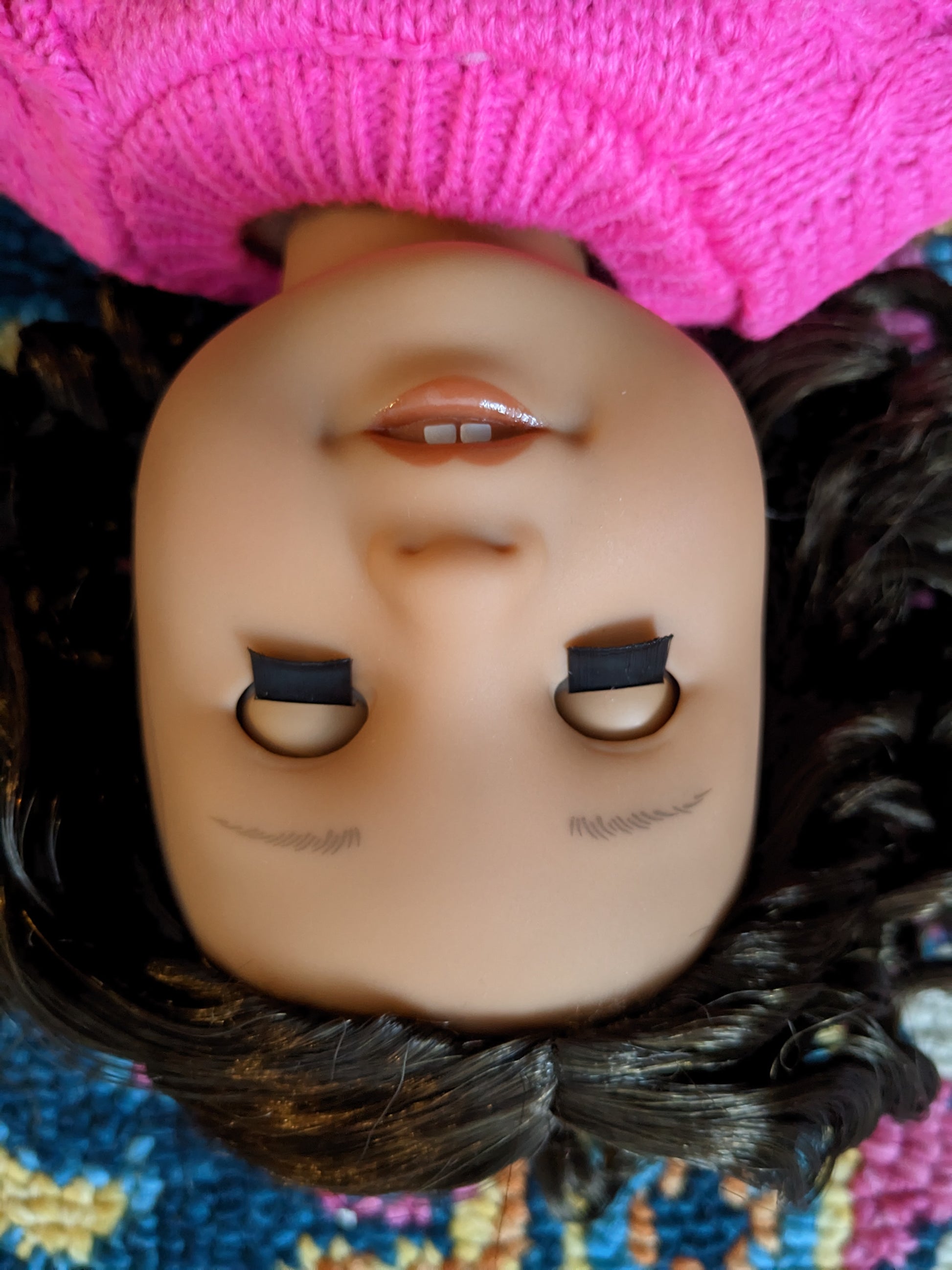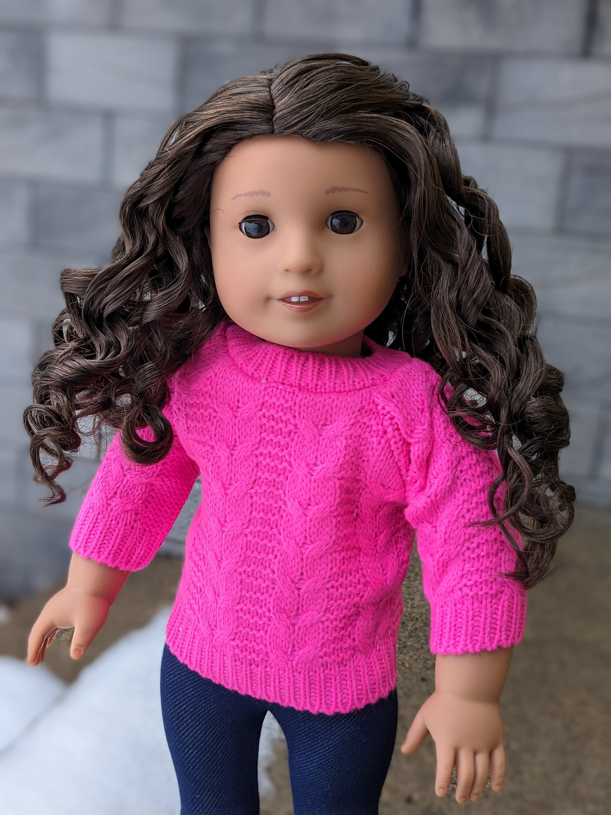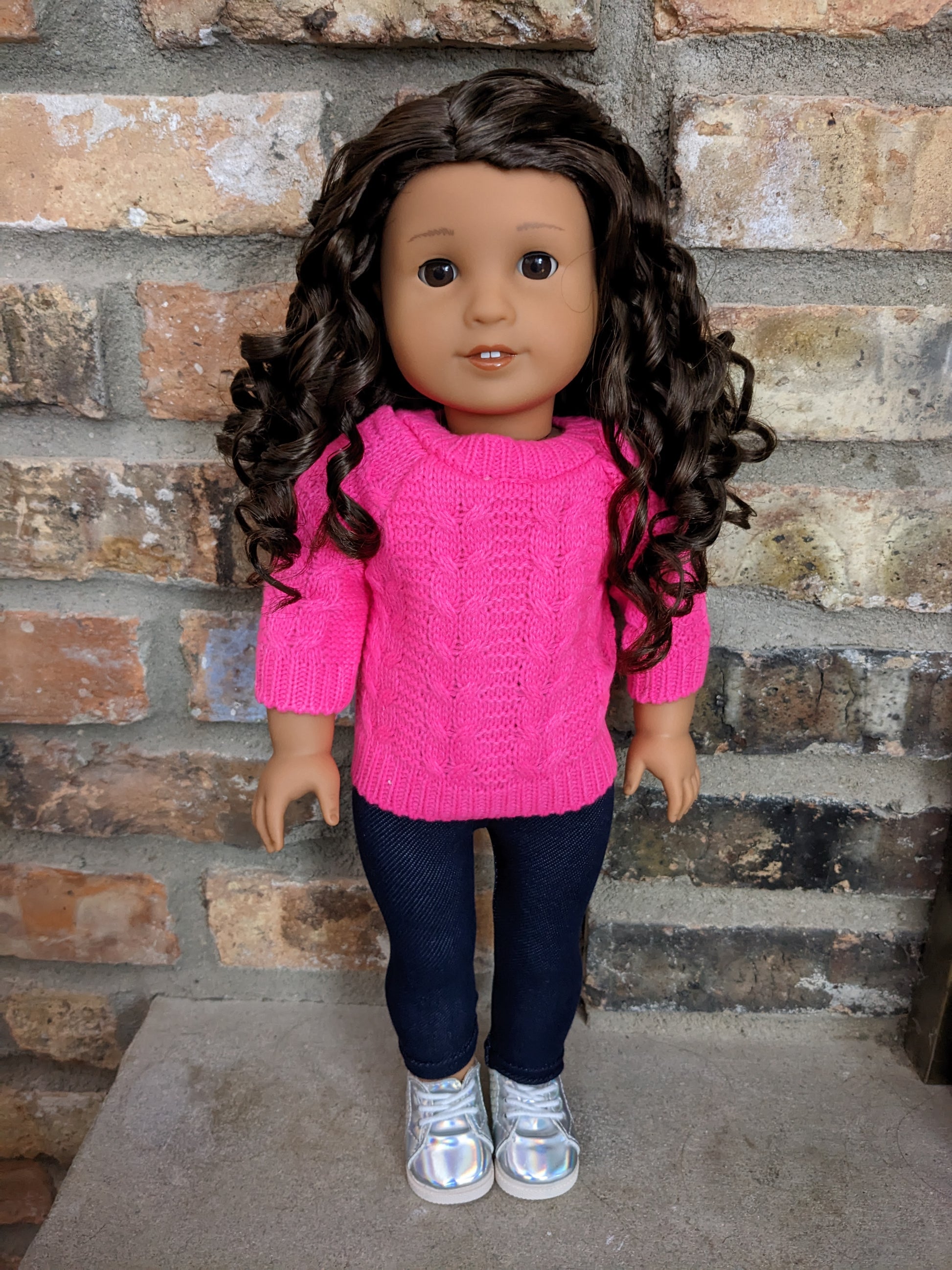 This one of a kind OOAK custom American Girl doll was created with a brand new TM 79 doll, a dark brown curly wig from a new Gabriela doll and brown eyes. She has lip gloss that was hand painted and sealed. She may have some minor shine marks from handling. She comes with the outfit pictured. She has a microfiber cloth body.