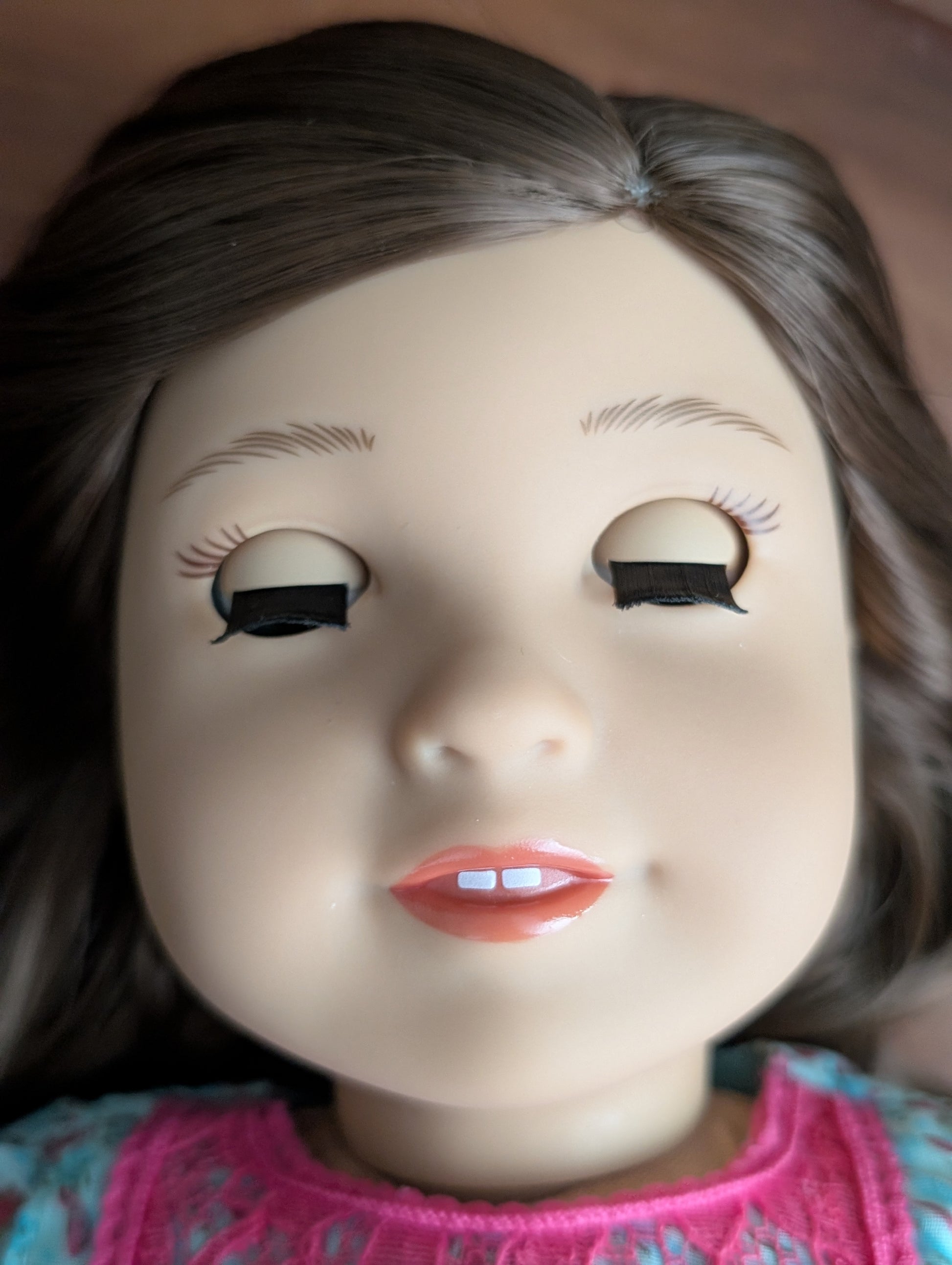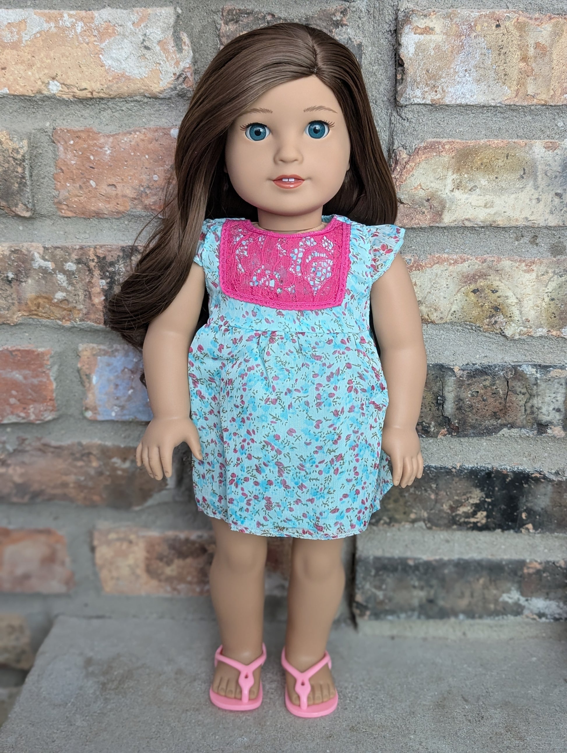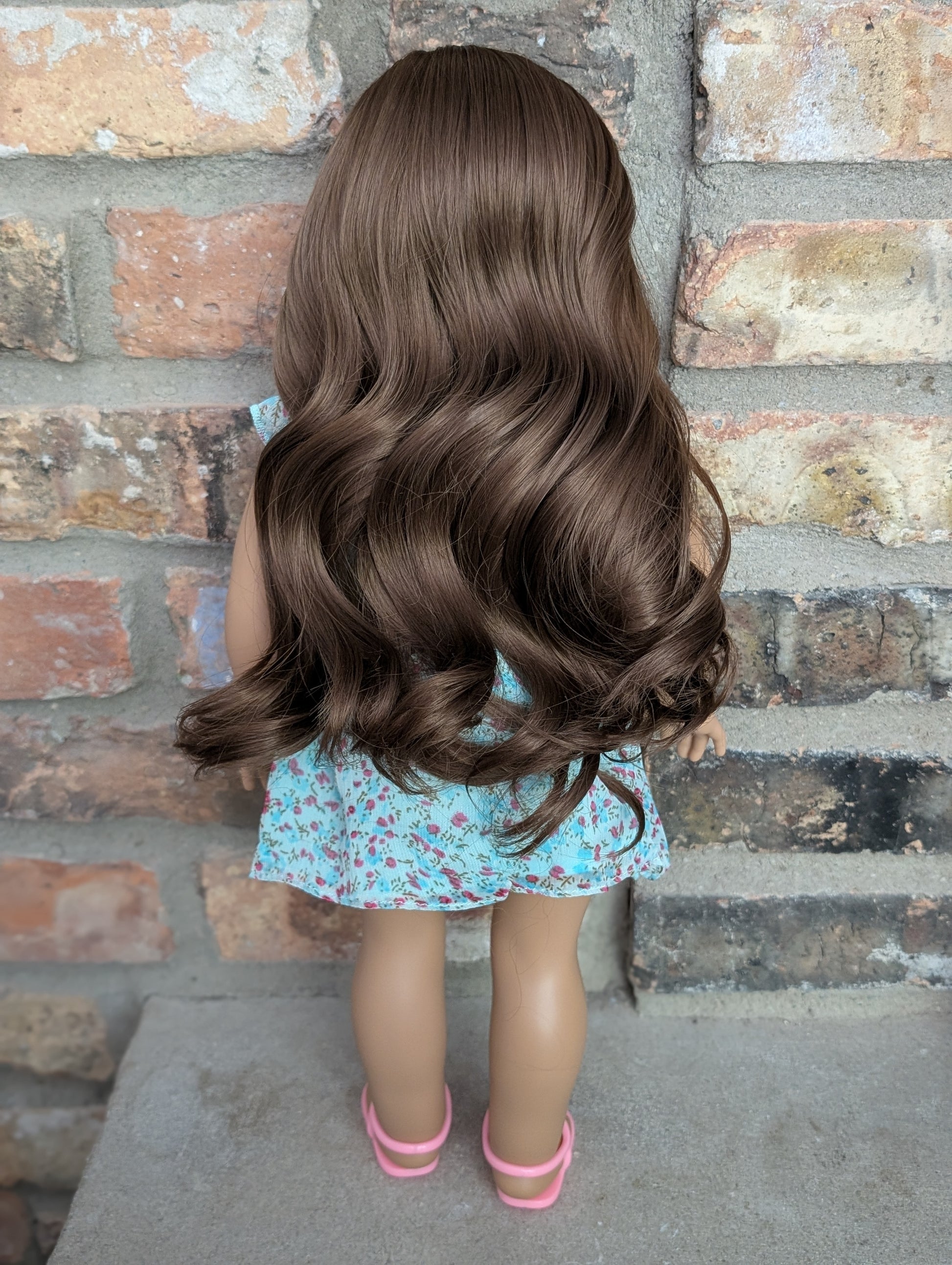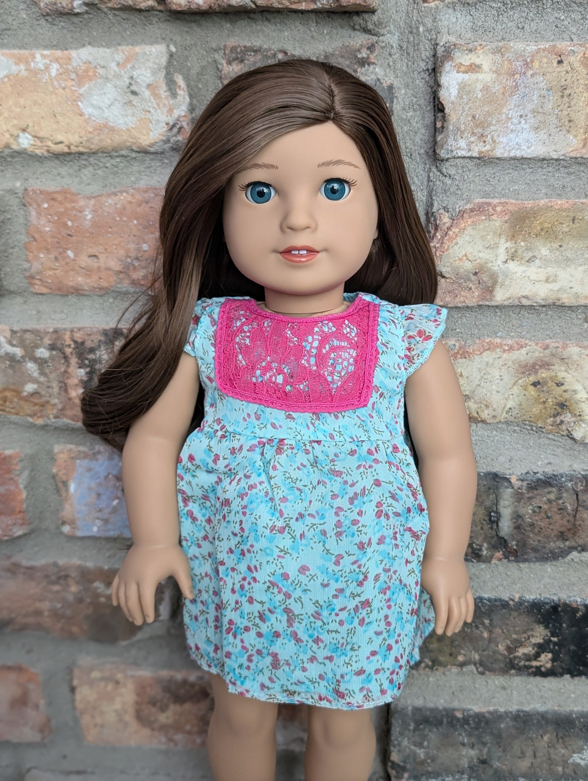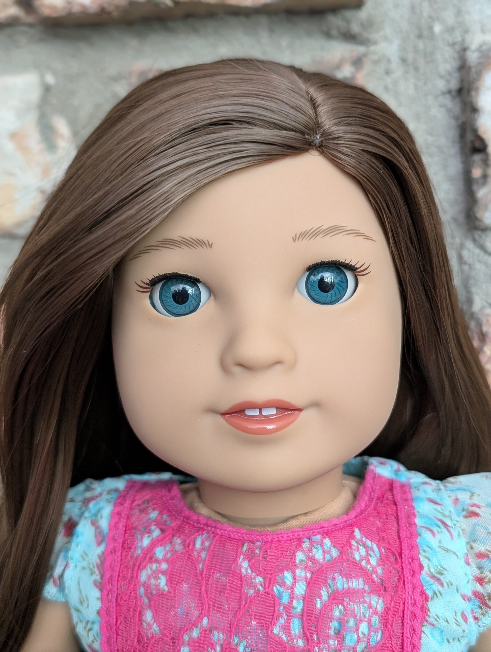 This one of a kind OOAK custom American Girl doll was created with a brand new doll, a brown wig, and blue eyes. She has lip gloss that was hand painted and sealed. She may have some minor shine marks from handling. She comes with the outfit pictured.