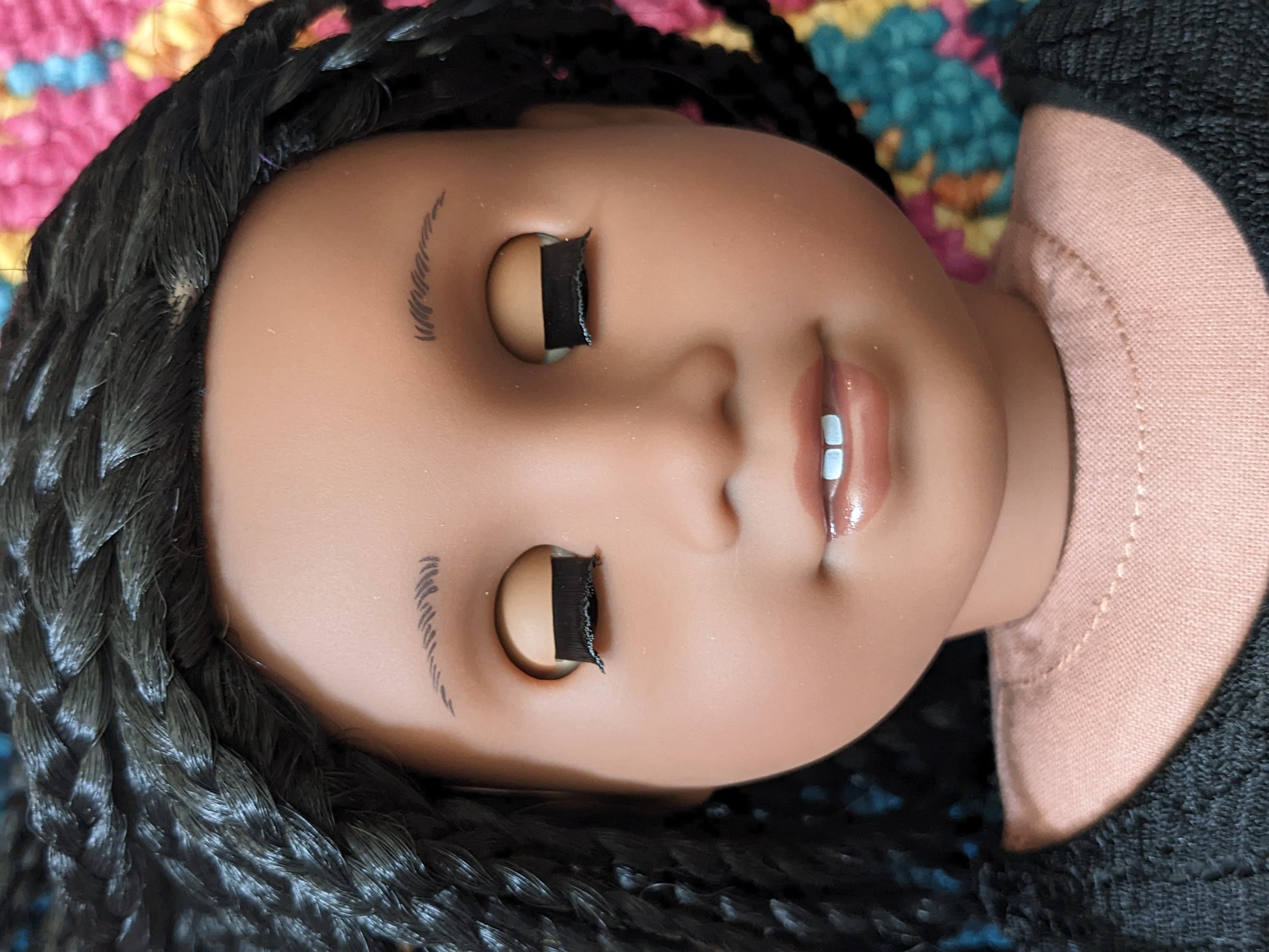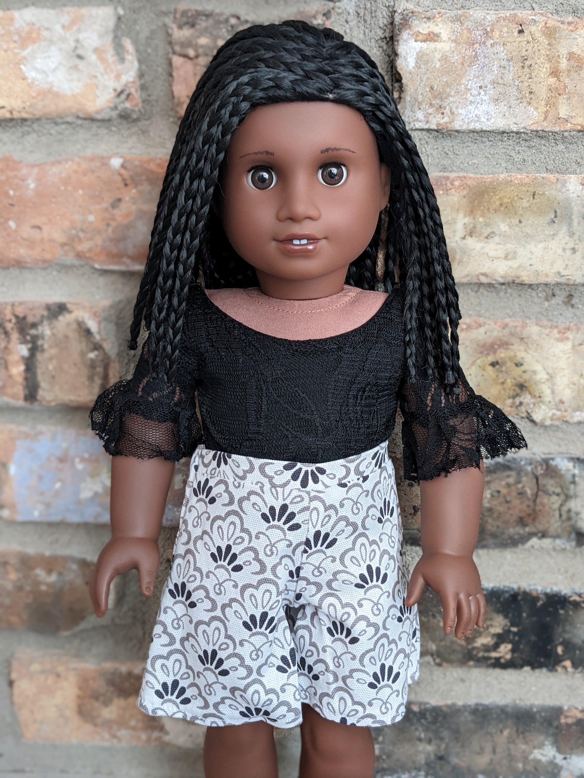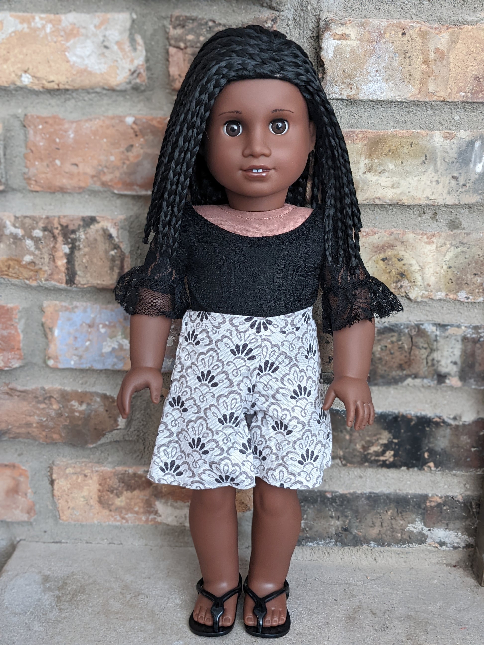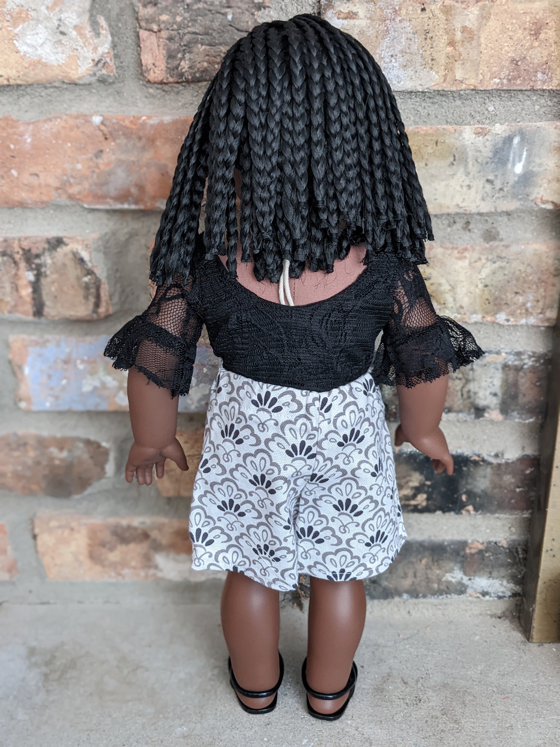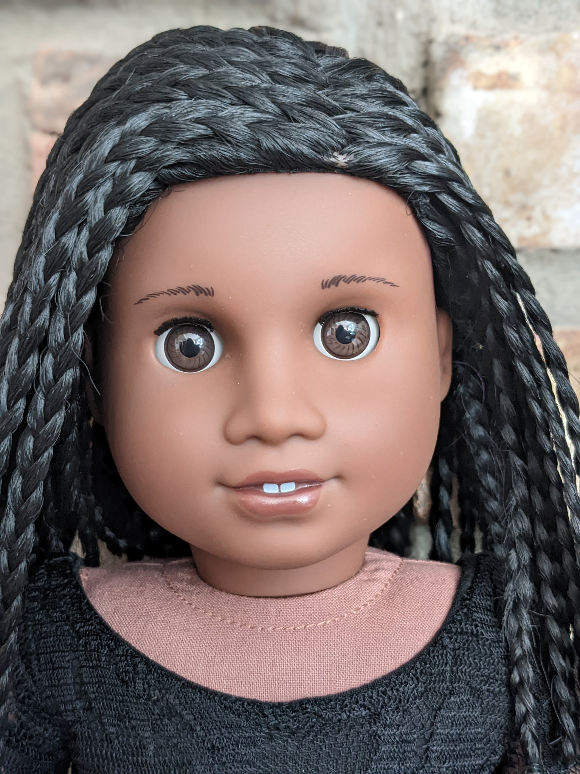 This one of a kind OOAK custom American Girl doll was created with a brand new Truly Me doll, a black braided wig, and brown eyes. She has lip gloss that was hand painted and sealed. She may have some minor shine marks from handling. She comes with the outfit pictured.