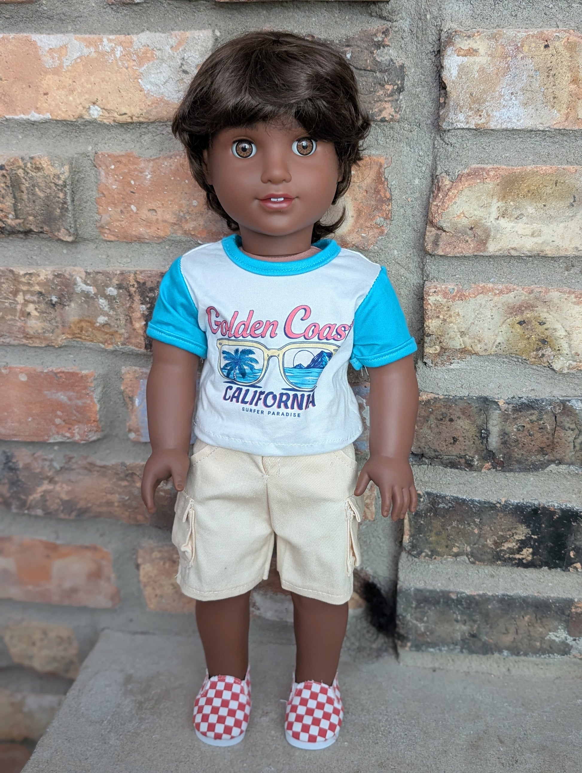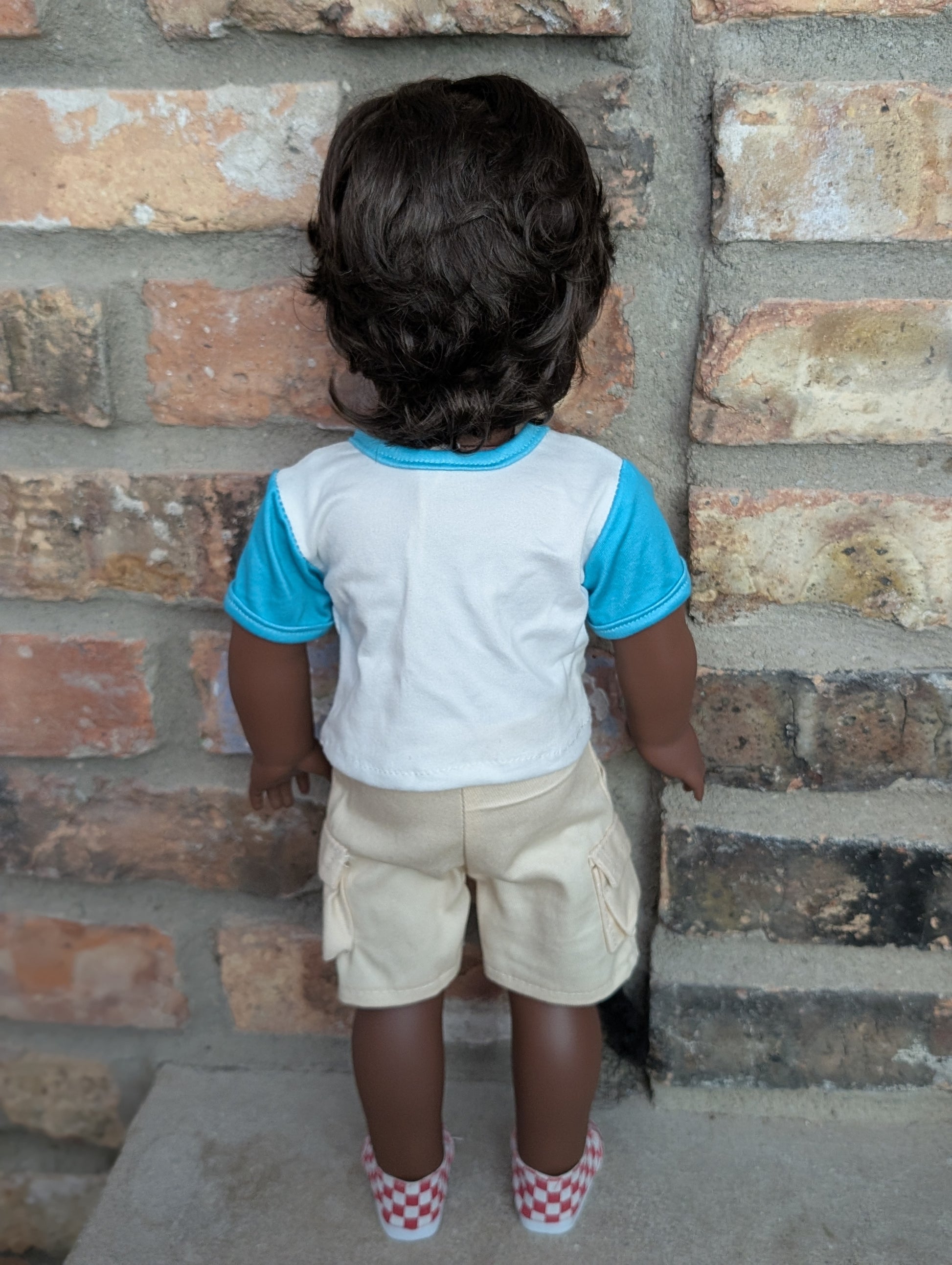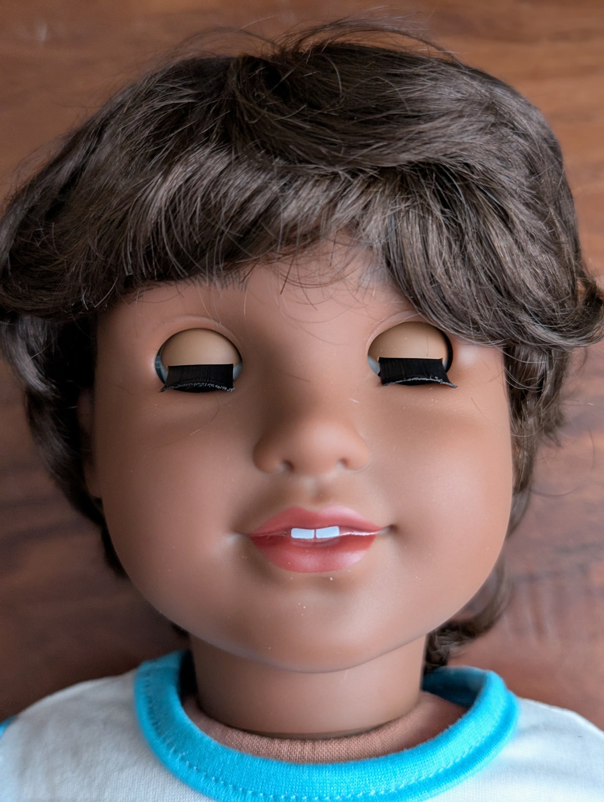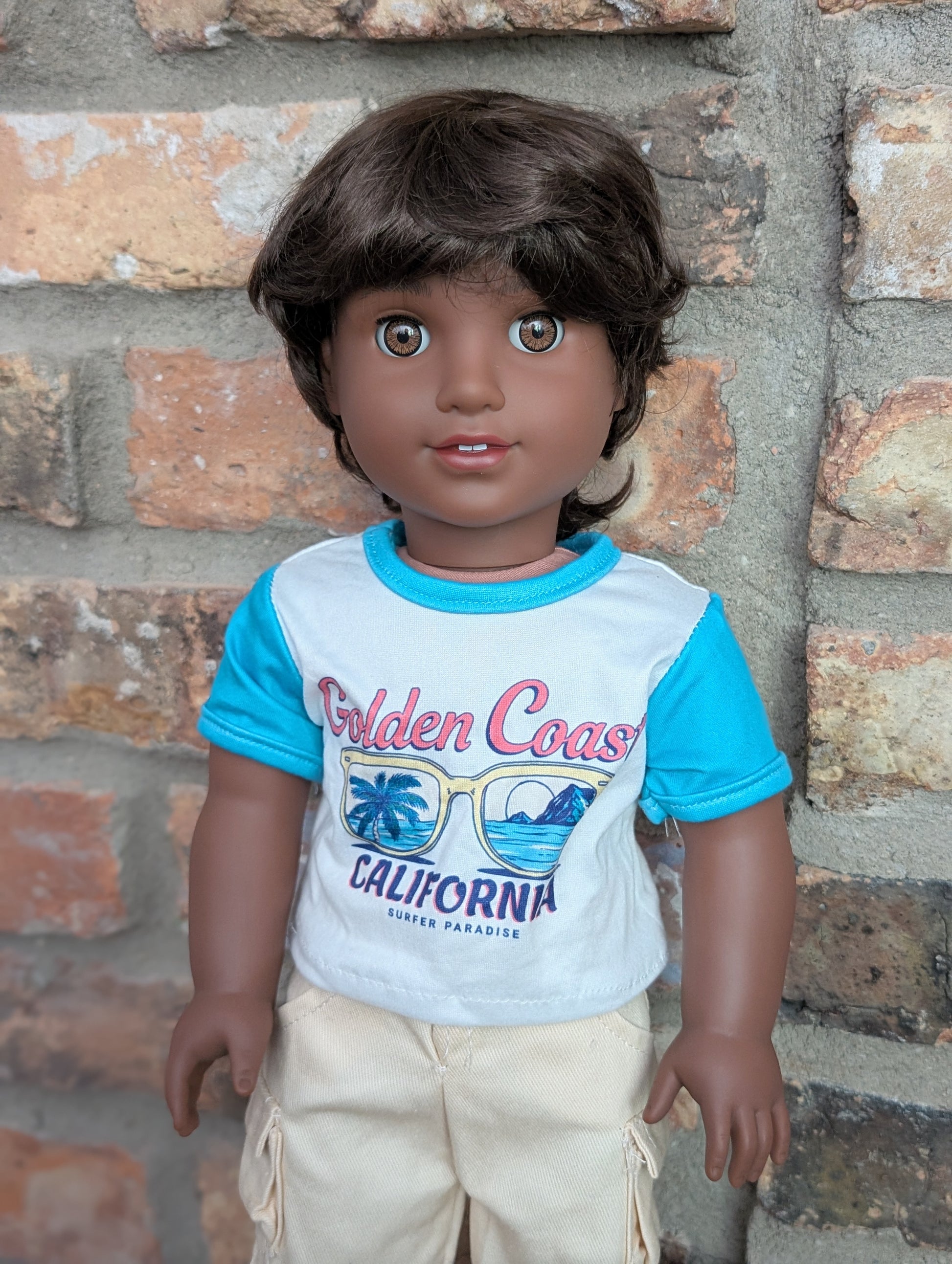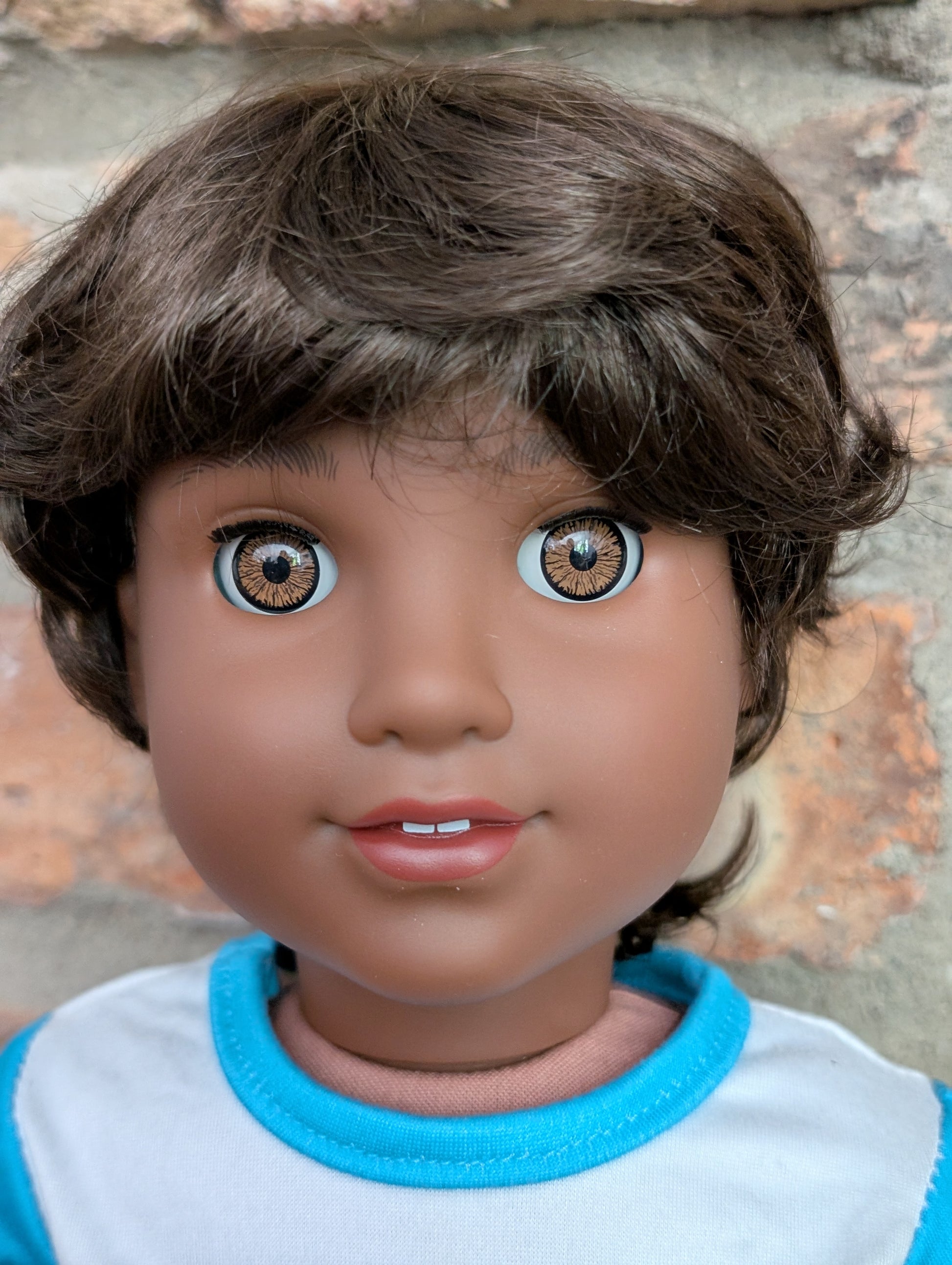This one of a kind OOAK custom boy American Girl doll was created with a brand new doll, a dark brown wig, and light brown eyes. He may have some minor shine marks from handling. He comes with the outfit pictured.