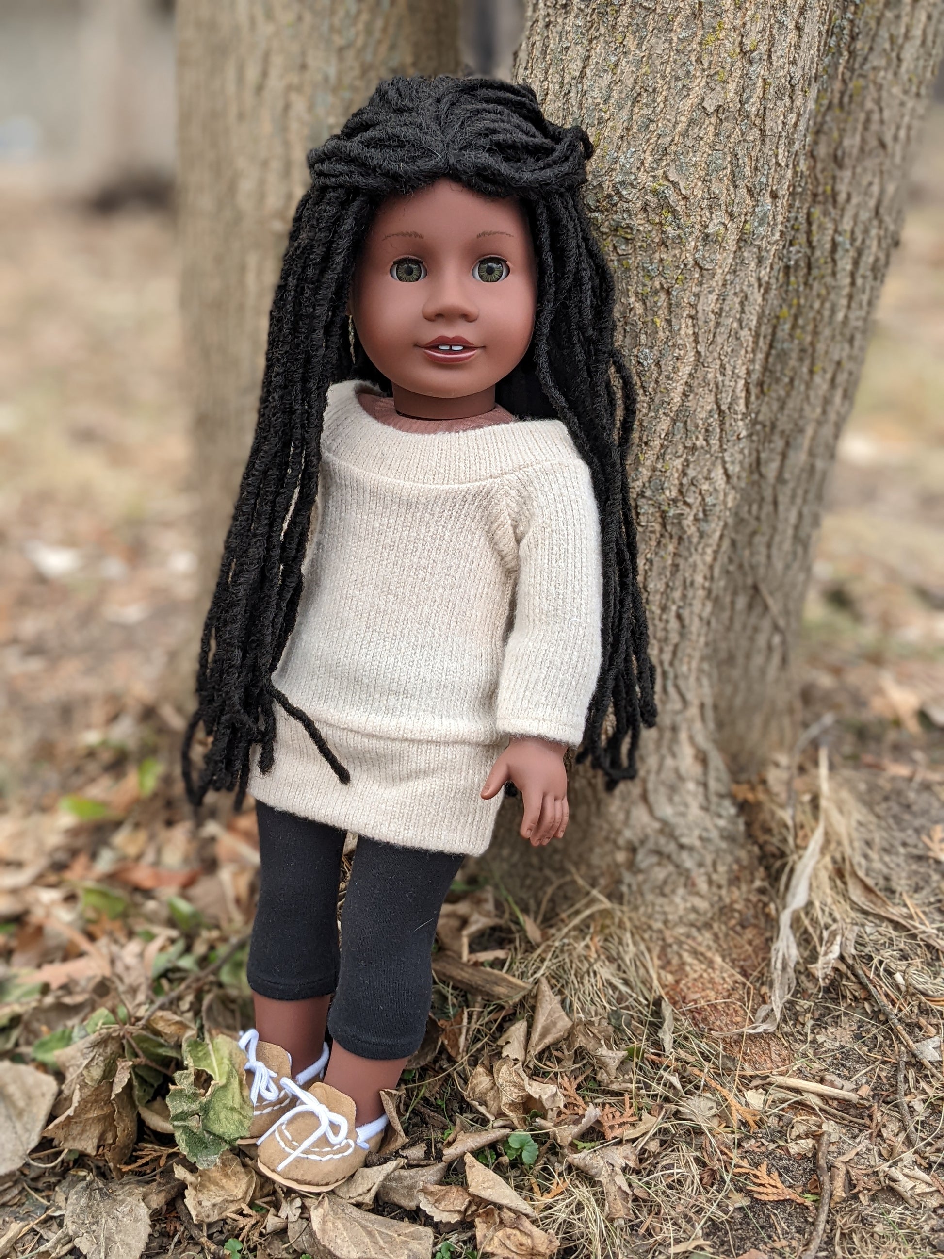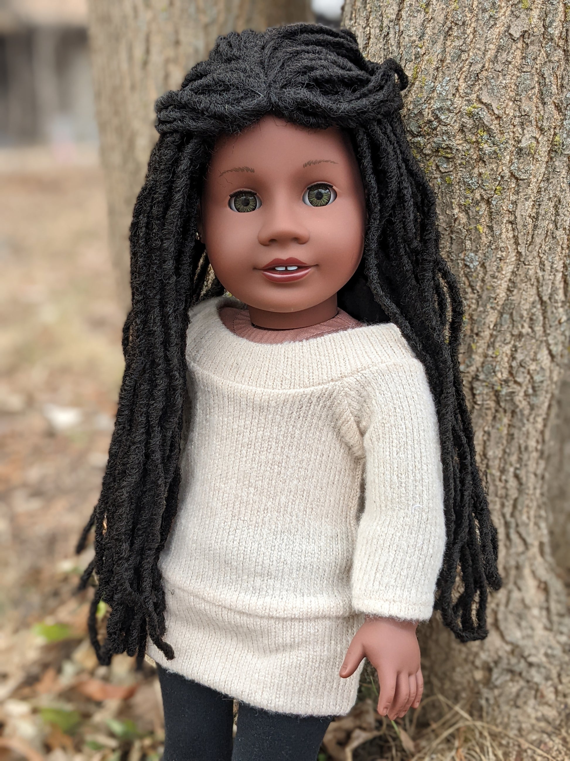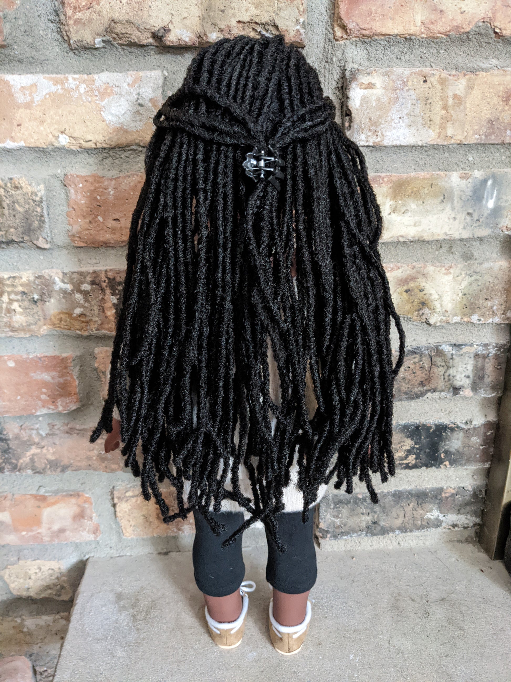 This one of a kind OOAK custom American Girl doll was created with a new Addy doll, a black dreadlock wig, and hazel eyes. The doll is in great condition. She may have some minor shine marks from handling and she has a tiny x on her bum. She has custom lip gloss which has been sealed. She comes with the outfit pictured. I removed her hoop earrings and replaced them with silver studs from American Girl. Please make a note in the "Order Special Instructions" box upon checkout if you would like the wig left unattached, otherwise I will glue on the wig with a heavy duty permanent adhesive for a strong hold.