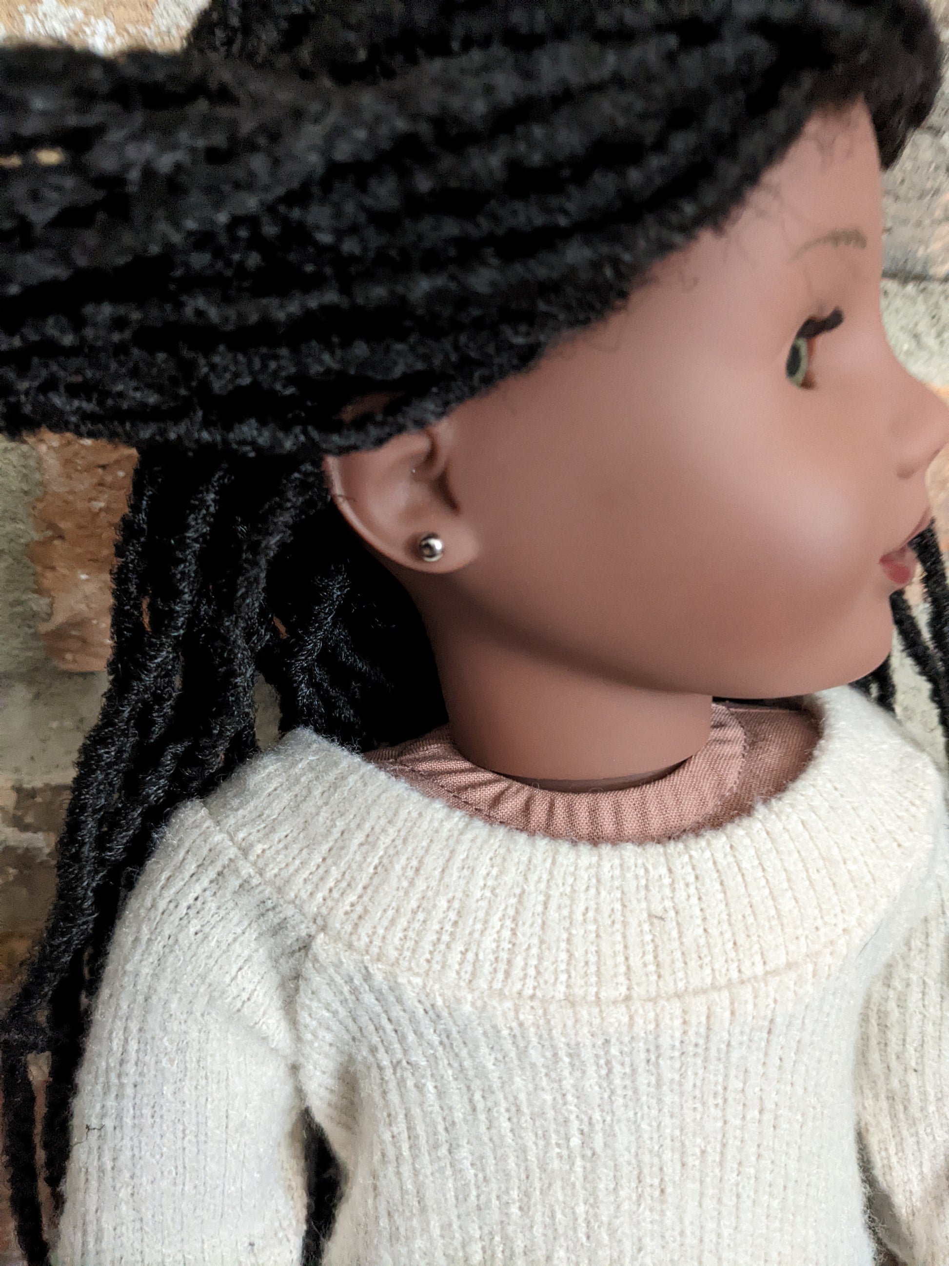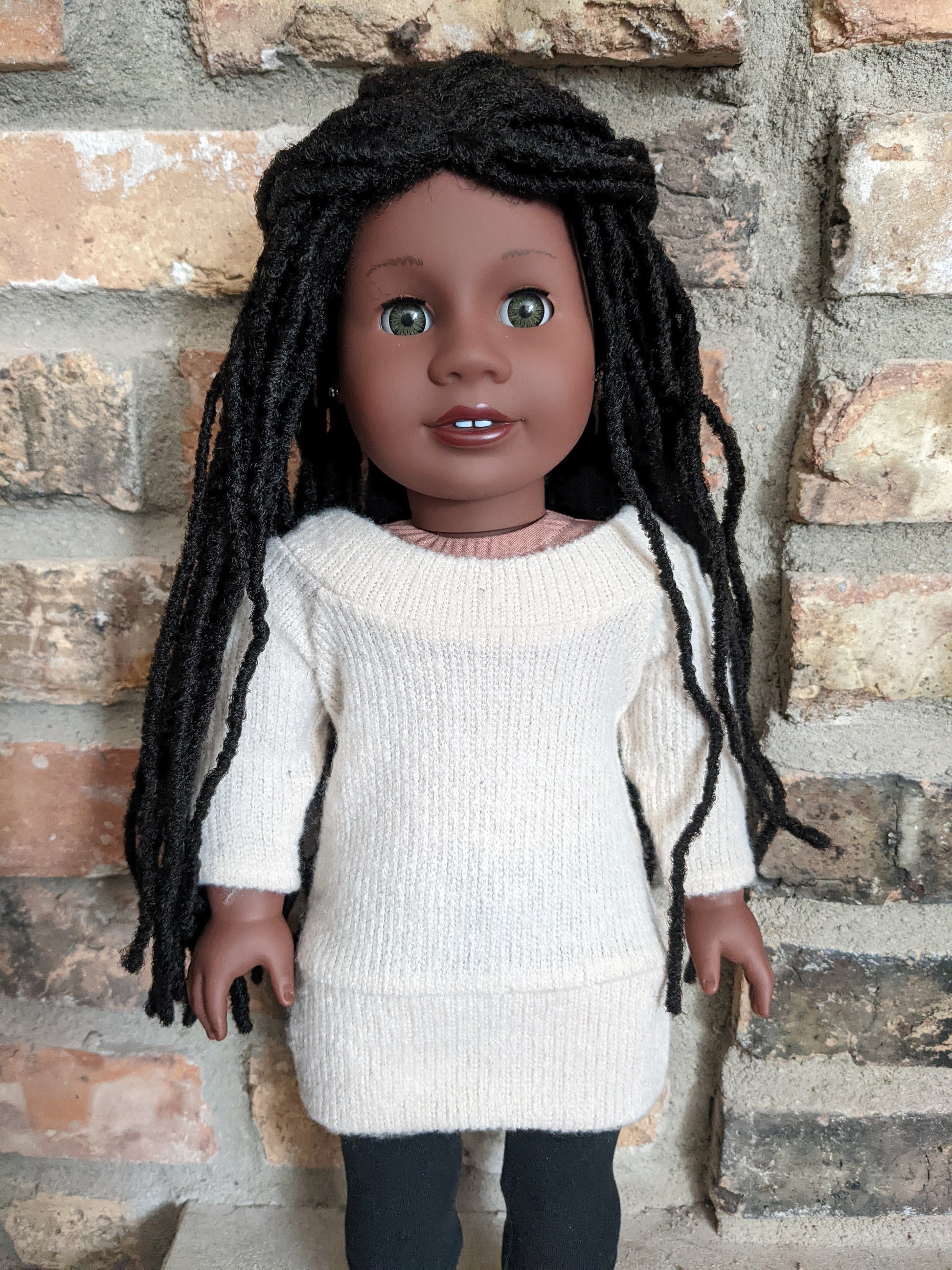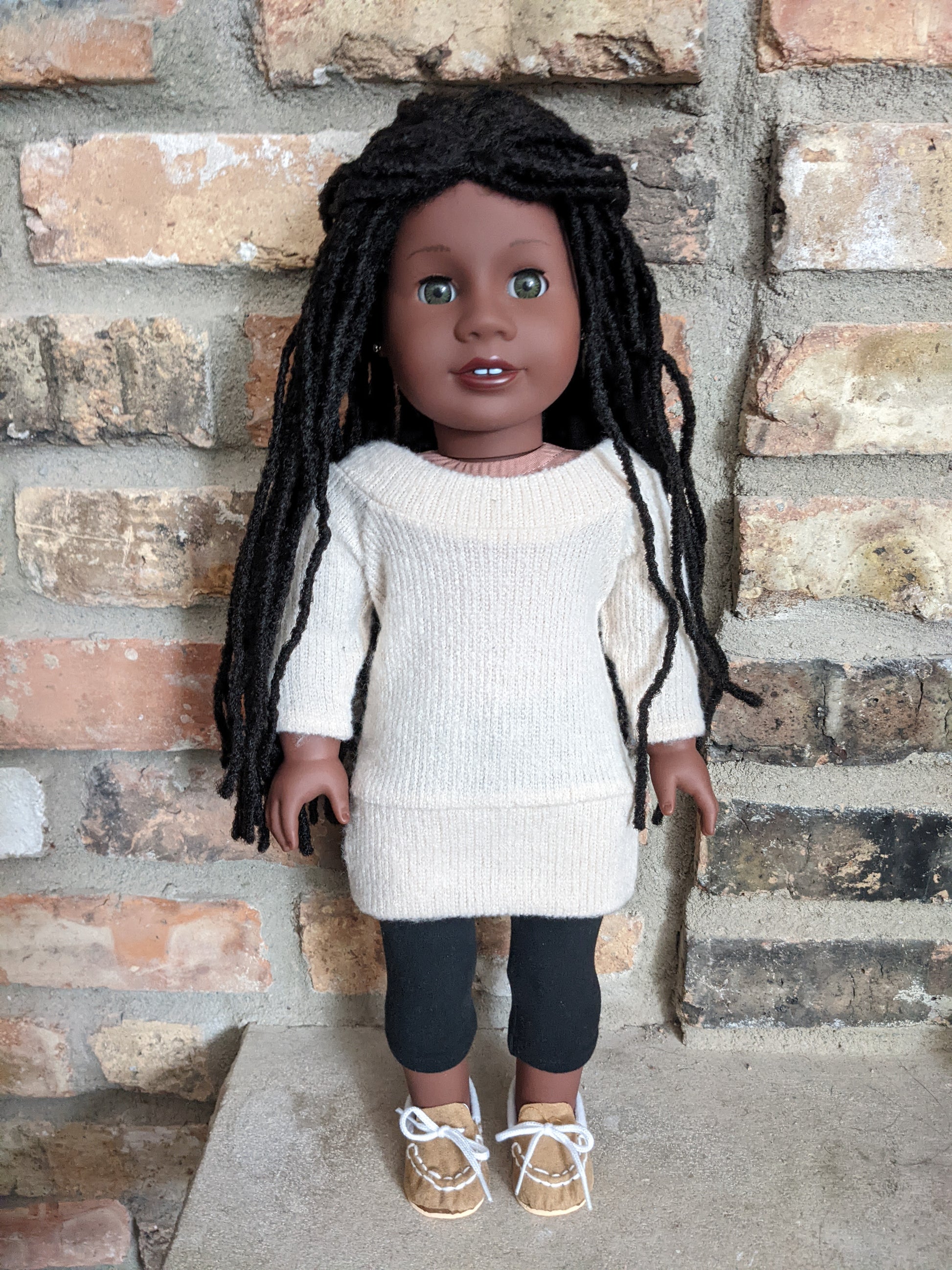 This one of a kind OOAK custom American Girl doll was created with a new Addy doll, a black dreadlock wig, and hazel eyes. The doll is in great condition. She may have some minor shine marks from handling and she has a tiny x on her bum. She has custom lip gloss which has been sealed. She comes with the outfit pictured. I removed her hoop earrings and replaced them with silver studs from American Girl. Please make a note in the "Order Special Instructions" box upon checkout if you would like the wig left unattached, otherwise I will glue on the wig with a heavy duty permanent adhesive for a strong hold.