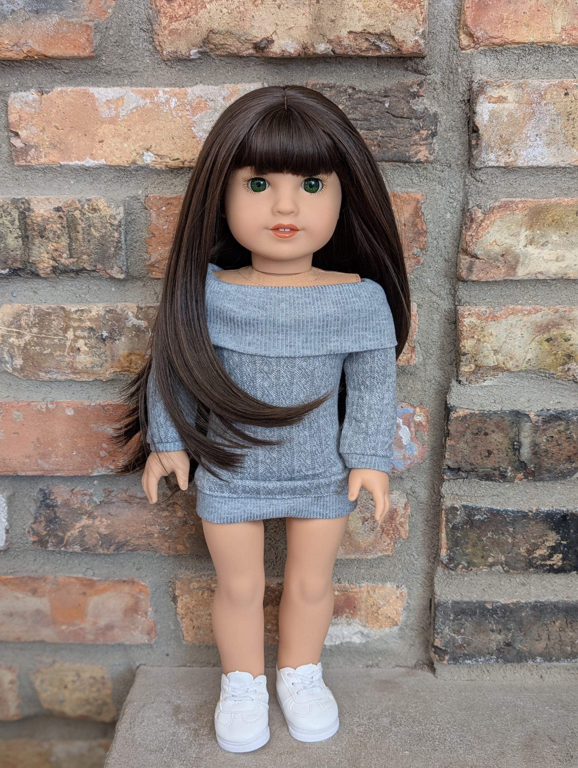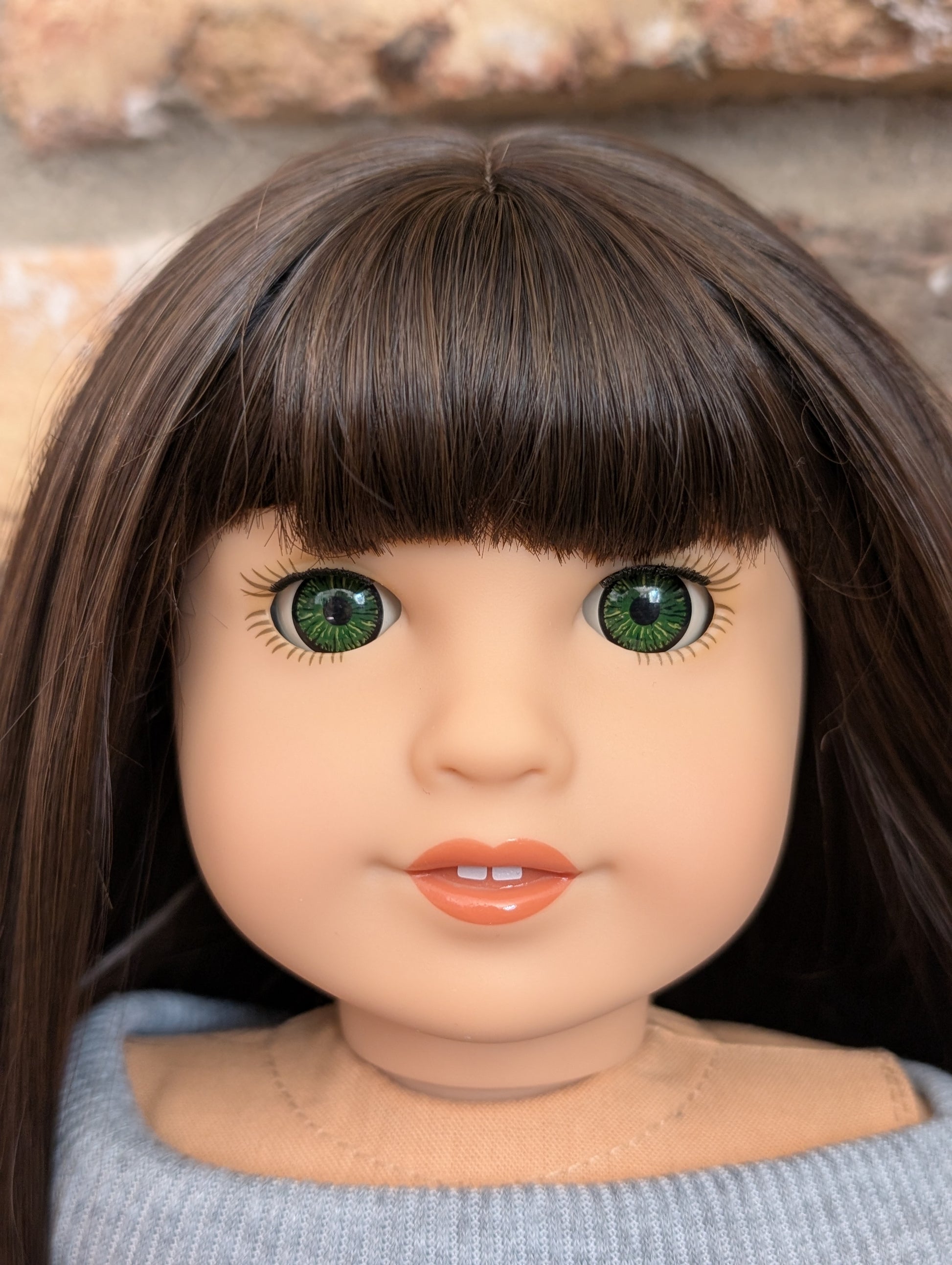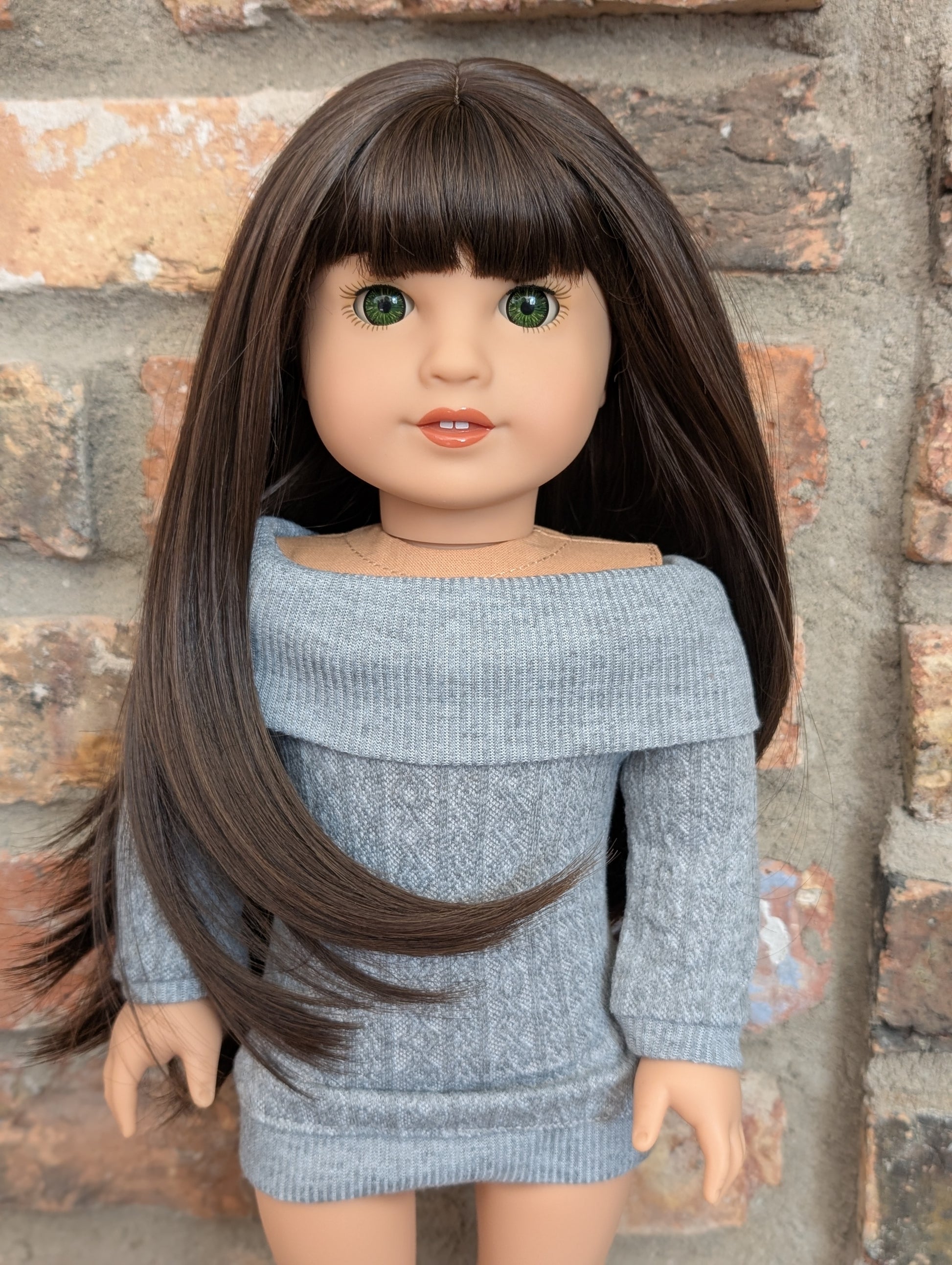 This one of a kind OOAK custom American Girl doll was created with a brand new doll, a brown wig, and green eyes from a BeForever Felicity doll. She has lip gloss that was hand painted and sealed. She may have some minor shine marks from handling. She comes with the outfit pictured.