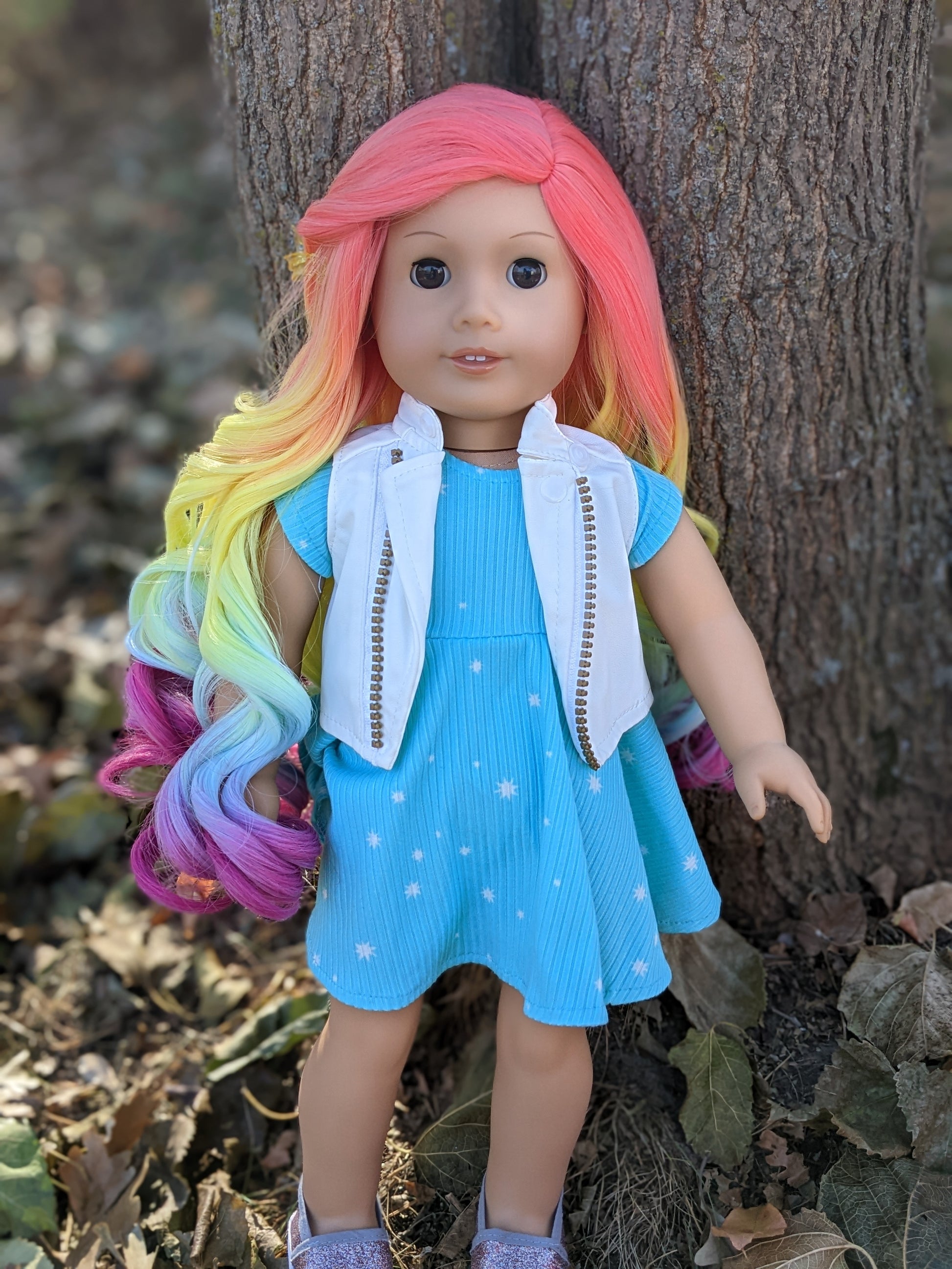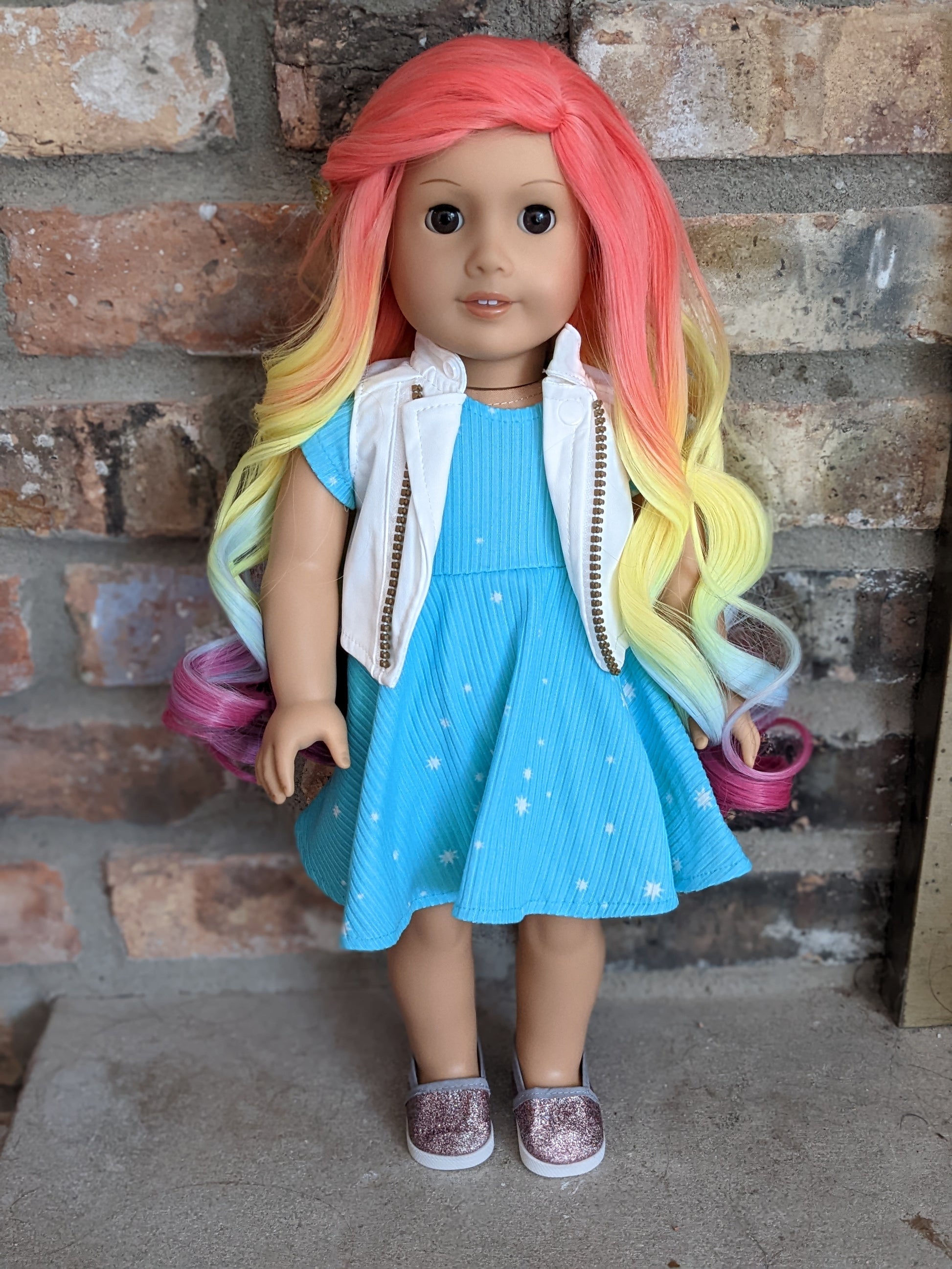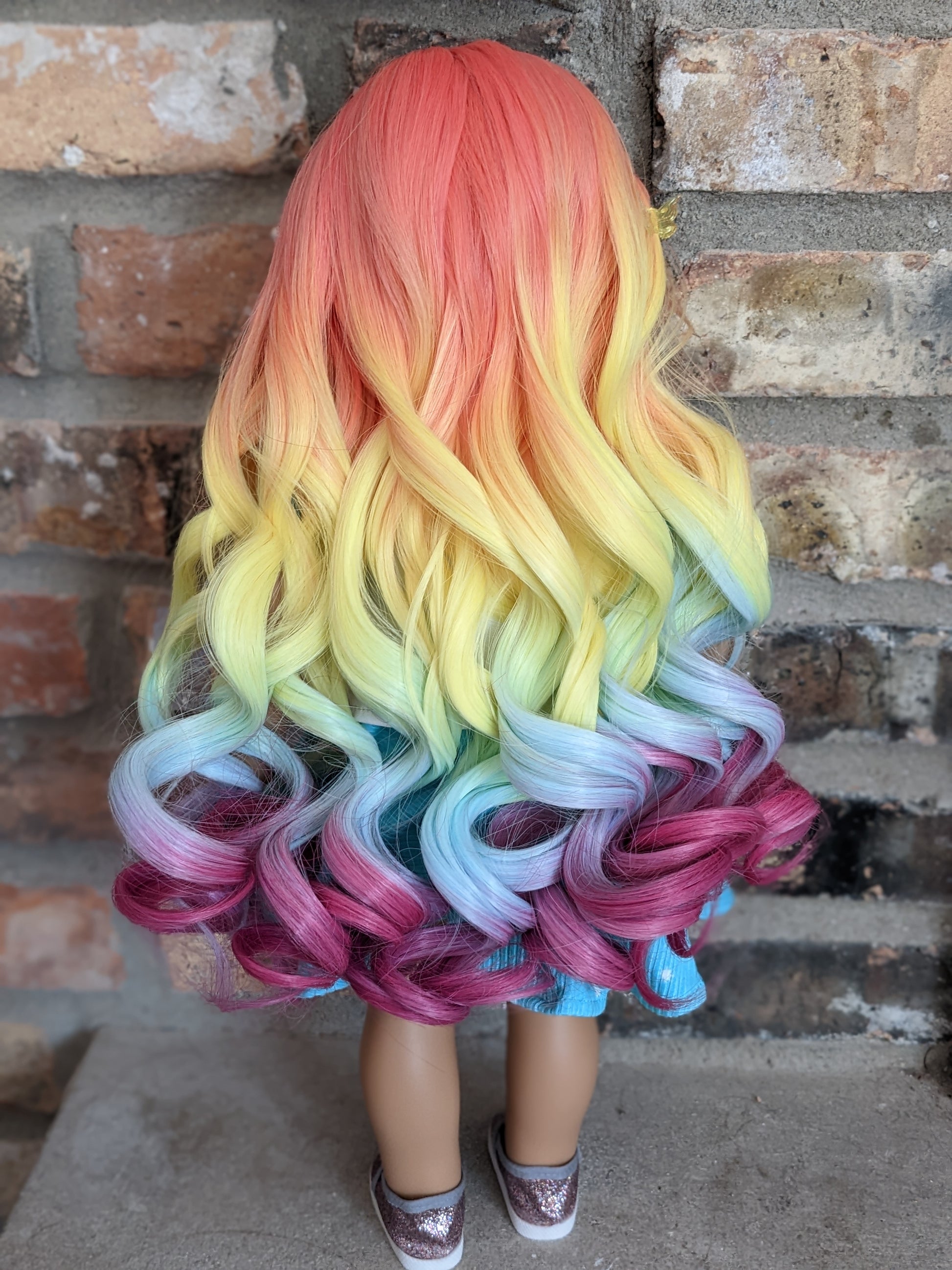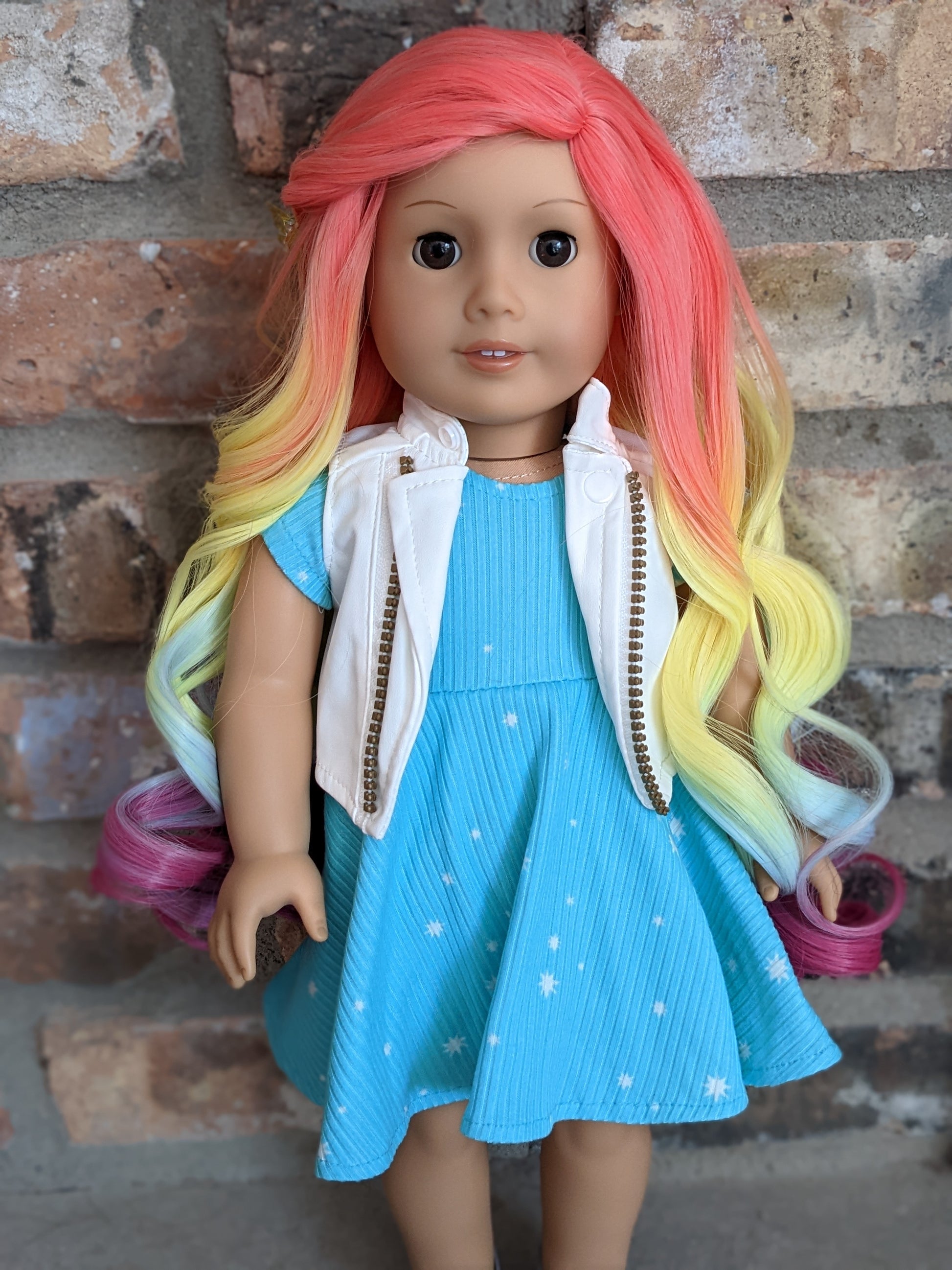 This one of a kind OOAK custom American Girl doll was created with a brand new Molly doll, a rainbow wig, and brown eyes. She has lip gloss that was hand painted and sealed. She may have some minor shine marks from handling. She comes with the outfit pictured.