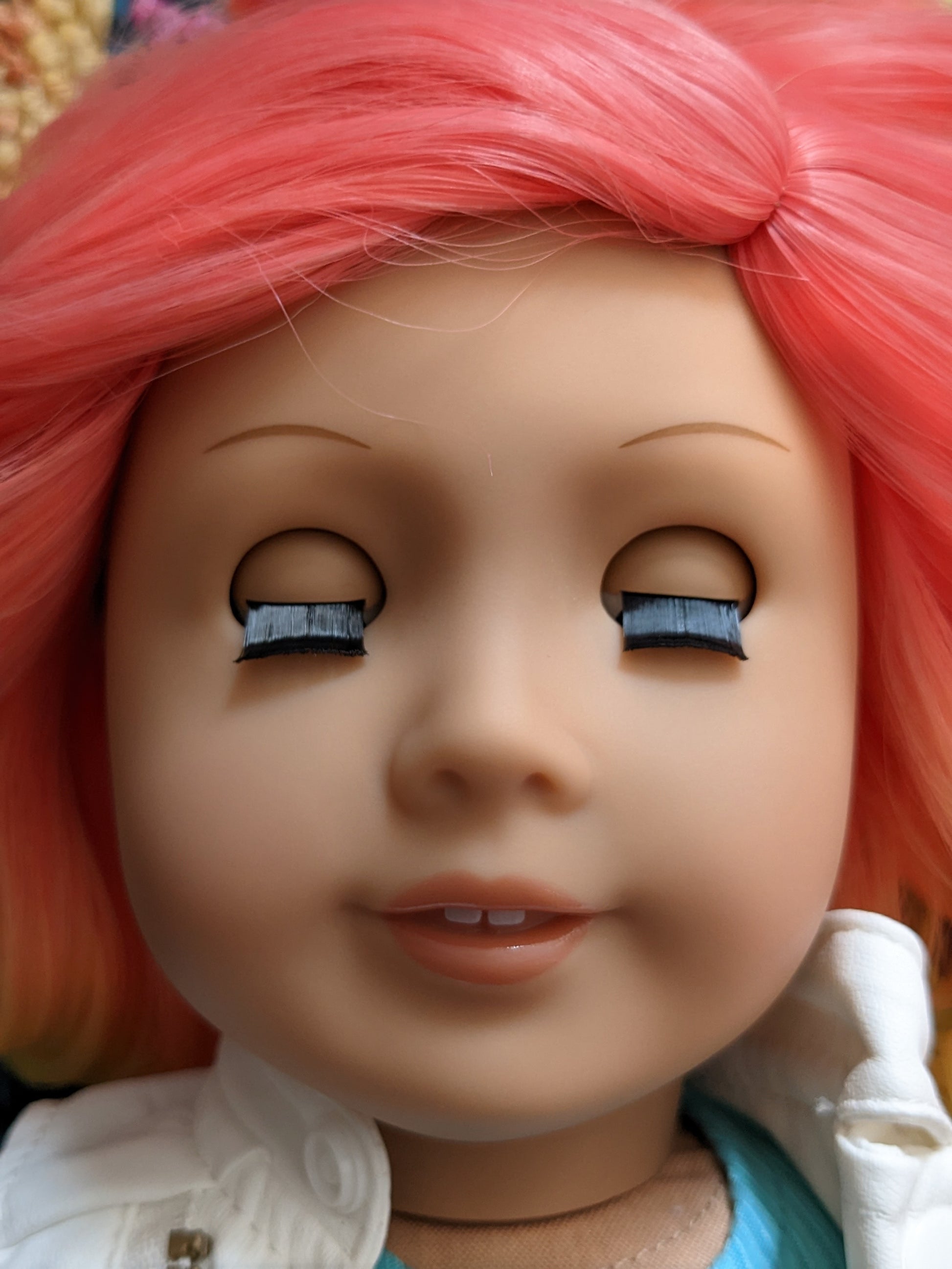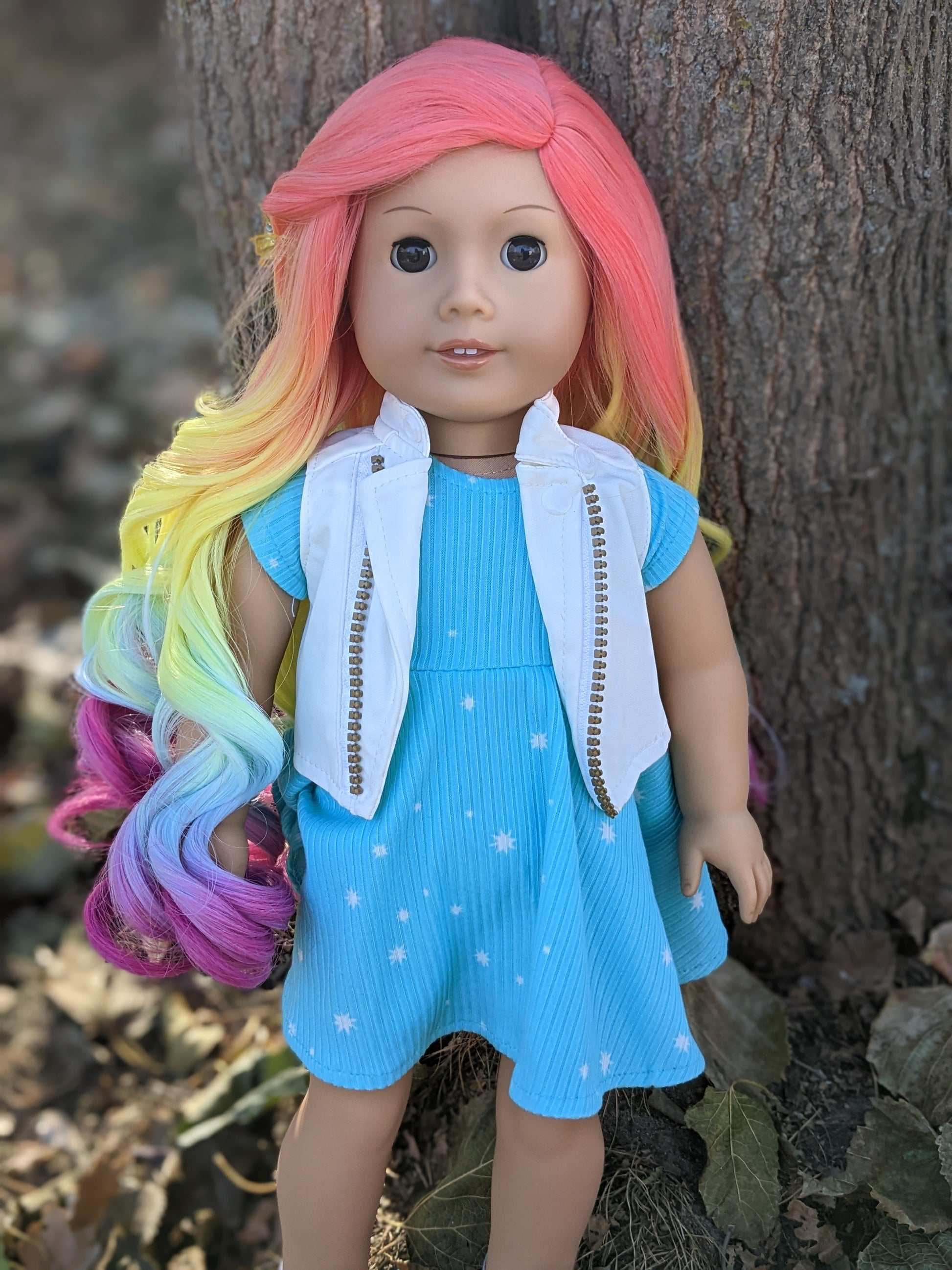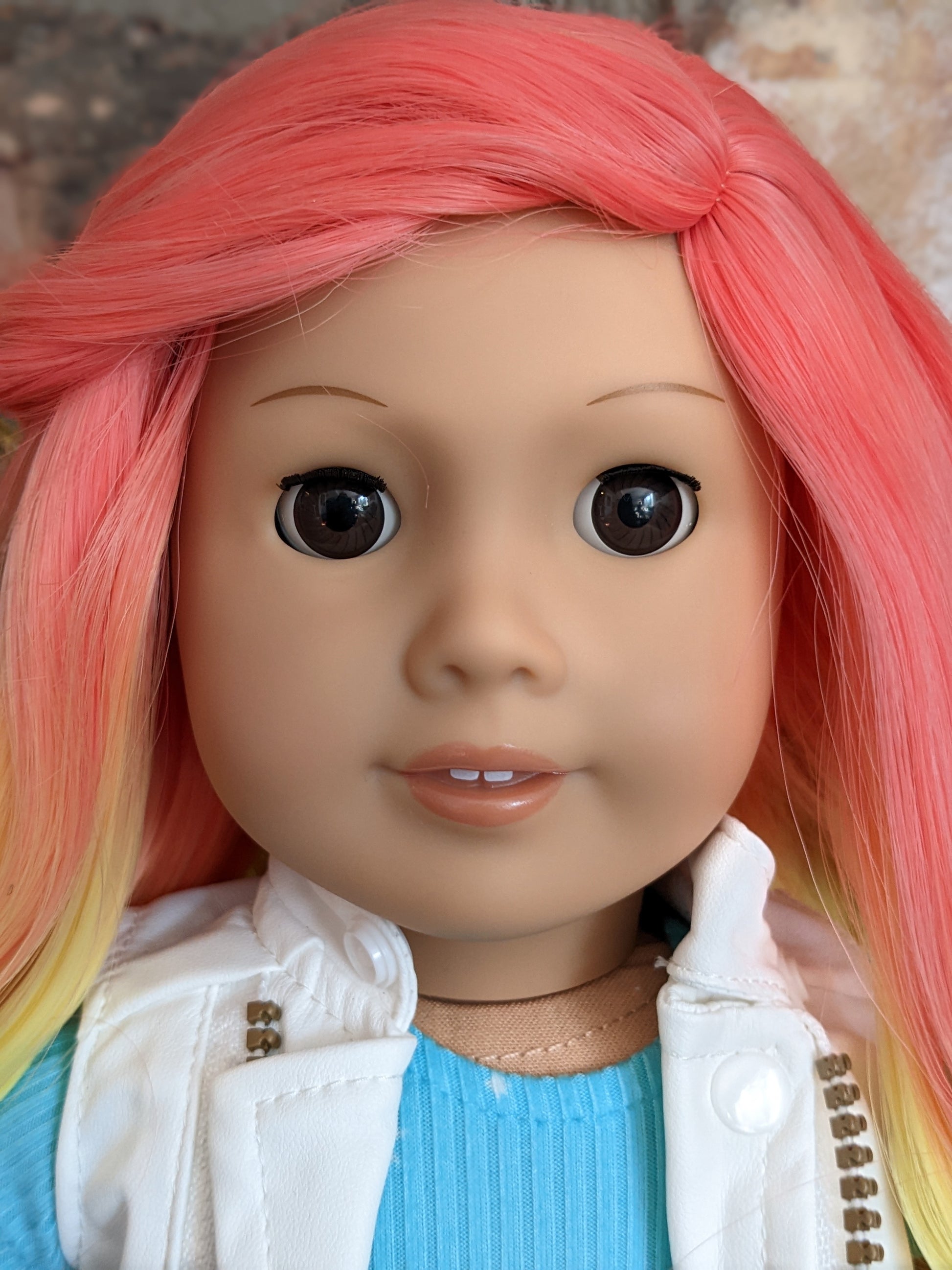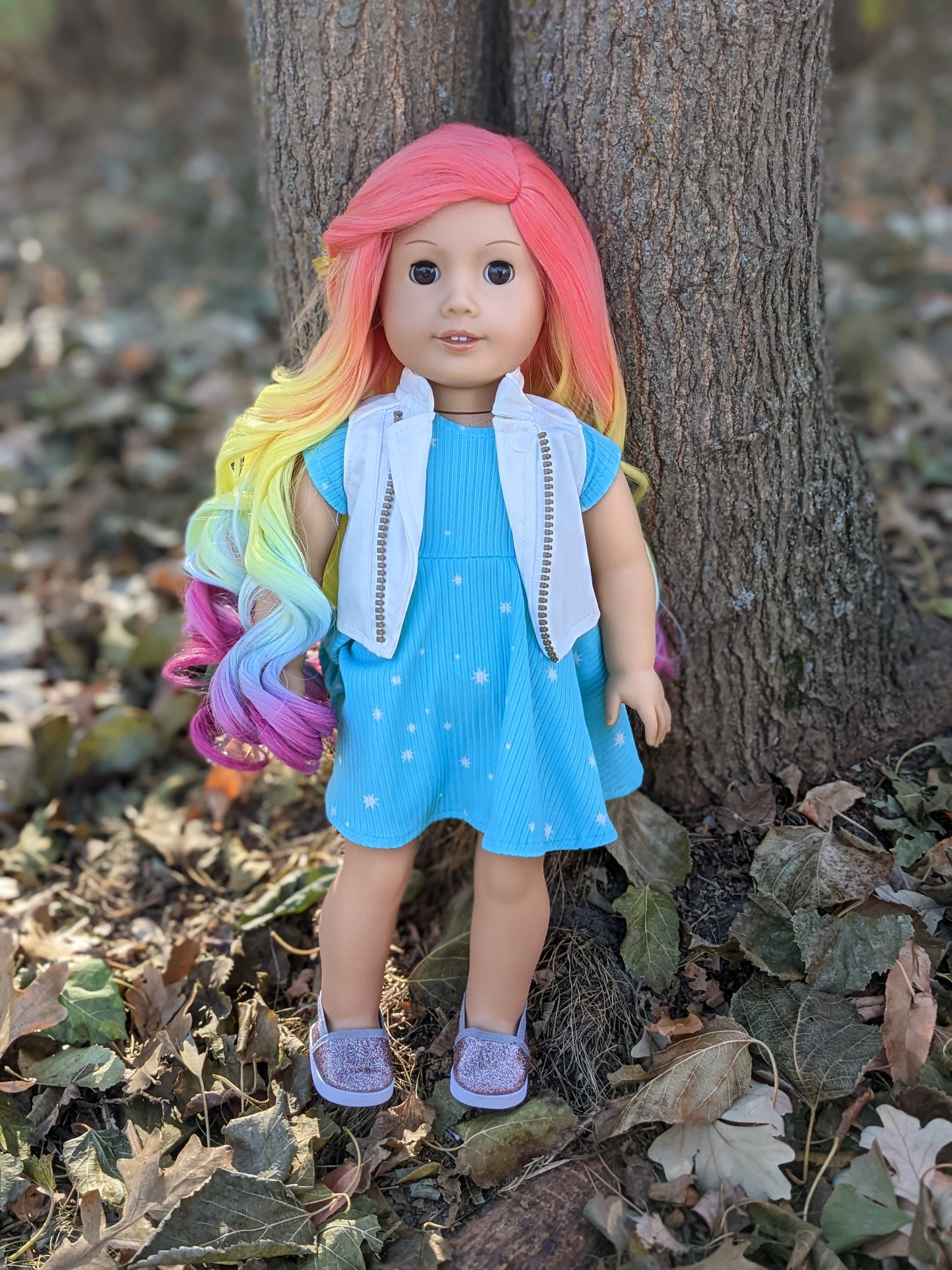 This one of a kind OOAK custom American Girl doll was created with a brand new Molly doll, a rainbow wig, and brown eyes. She has lip gloss that was hand painted and sealed. She may have some minor shine marks from handling. She comes with the outfit pictured.