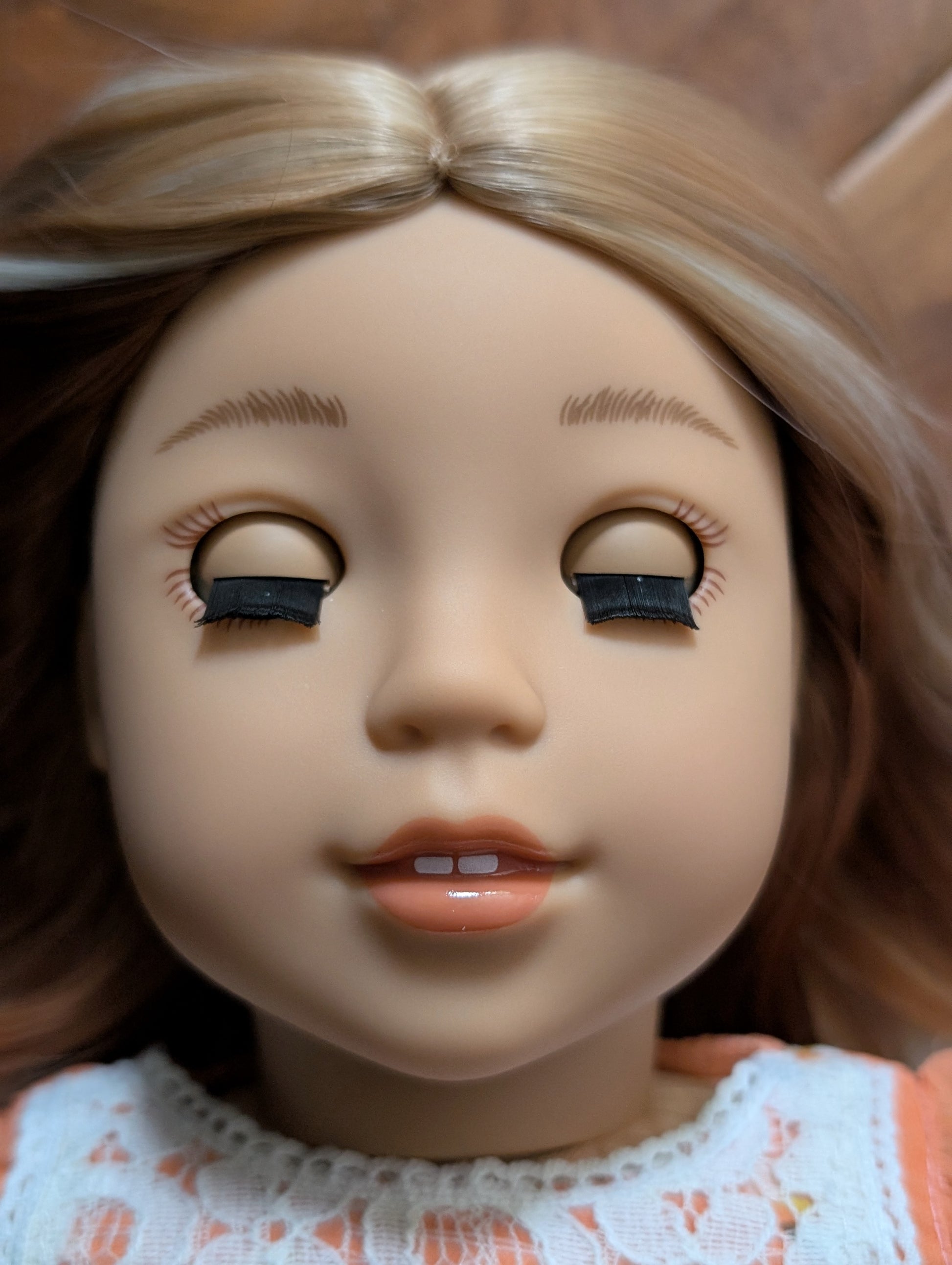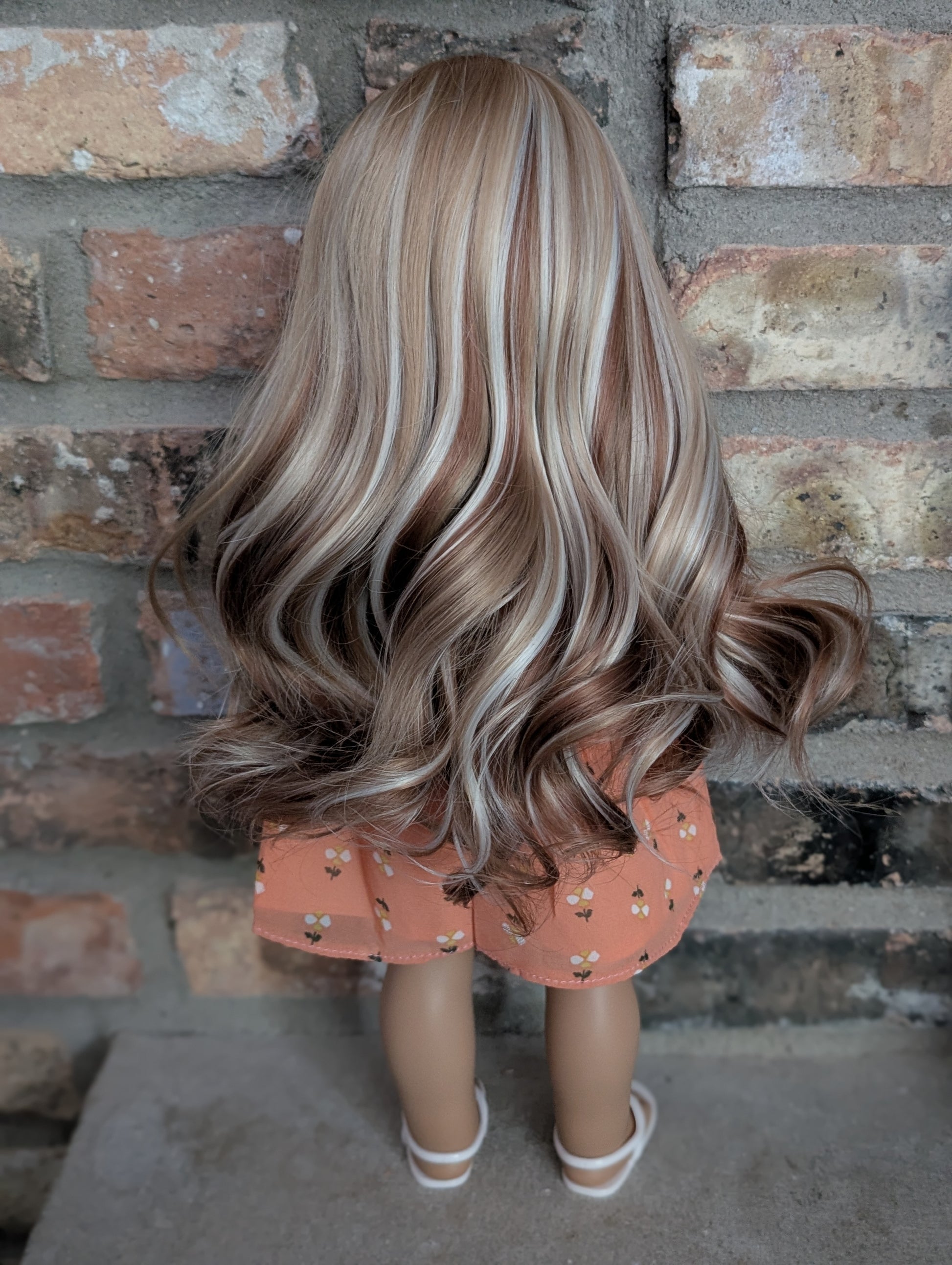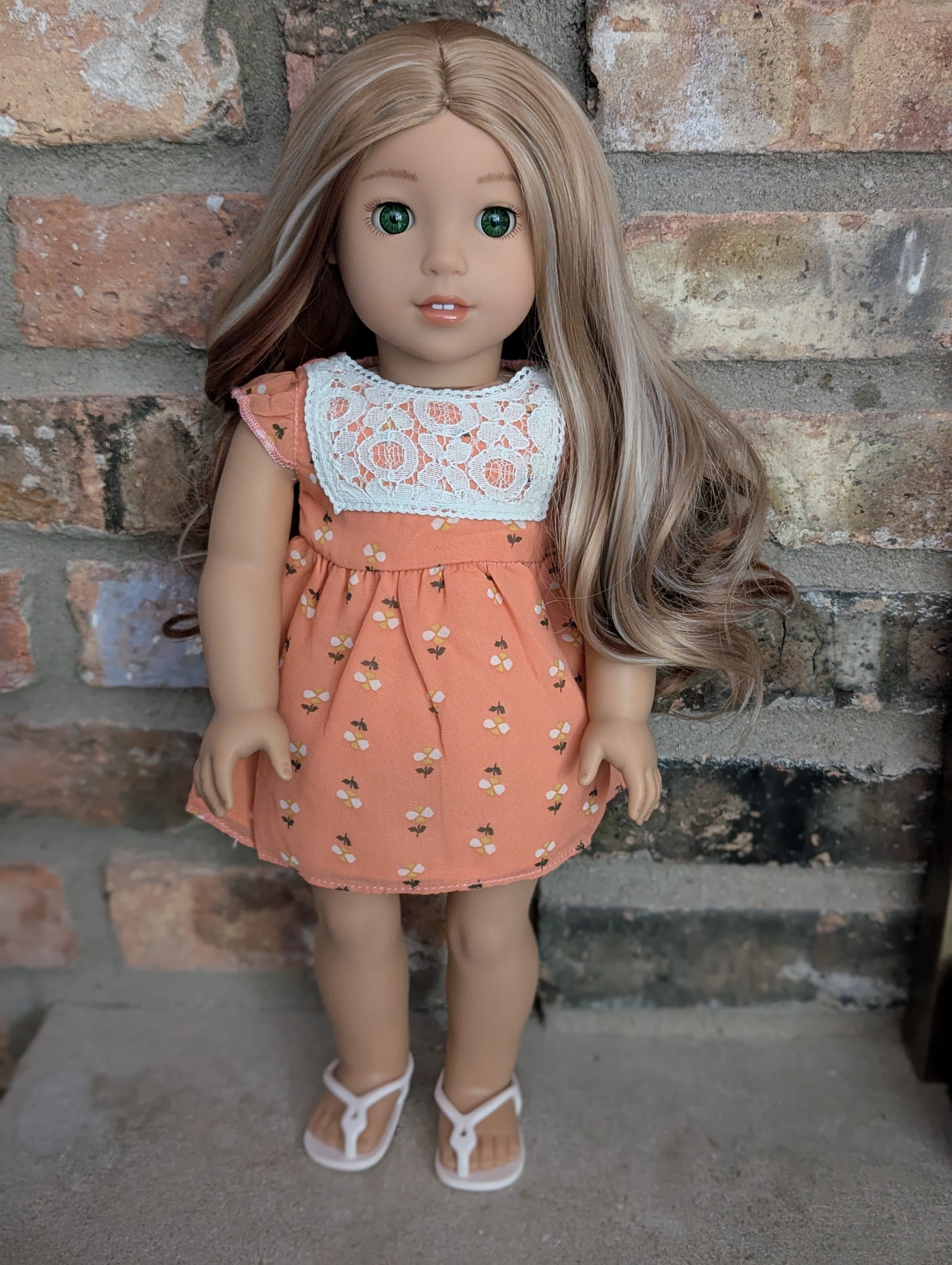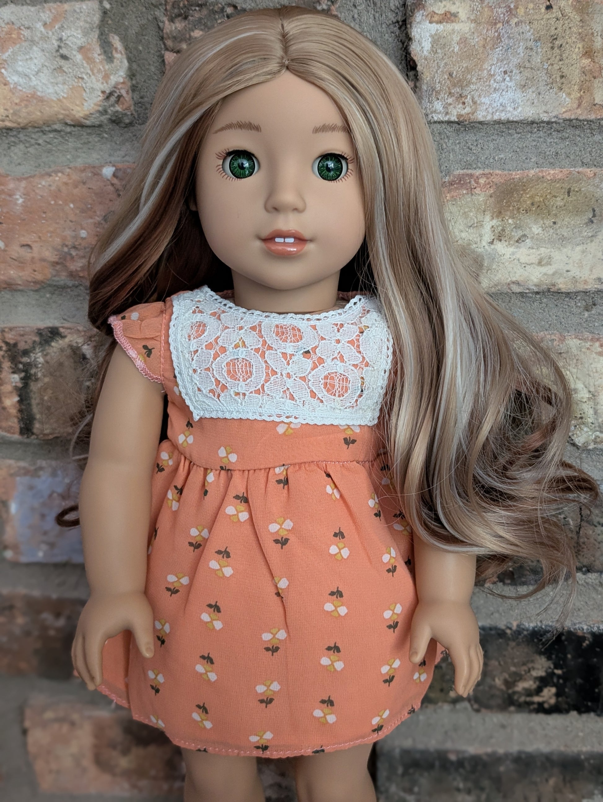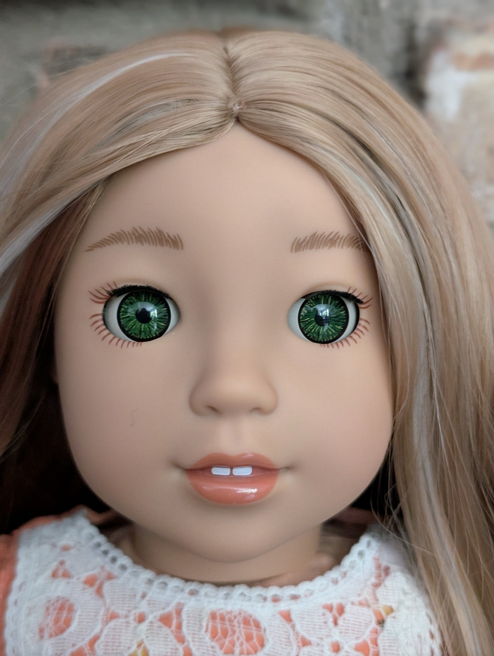 This one of a kind OOAK custom American Girl doll was created with a brand new doll, a reddish blonde wig, and green eyes from a BeForever Felicity. She has lip gloss that was hand painted and sealed. She may have some minor shine marks from handling. She comes with the outfit pictured.