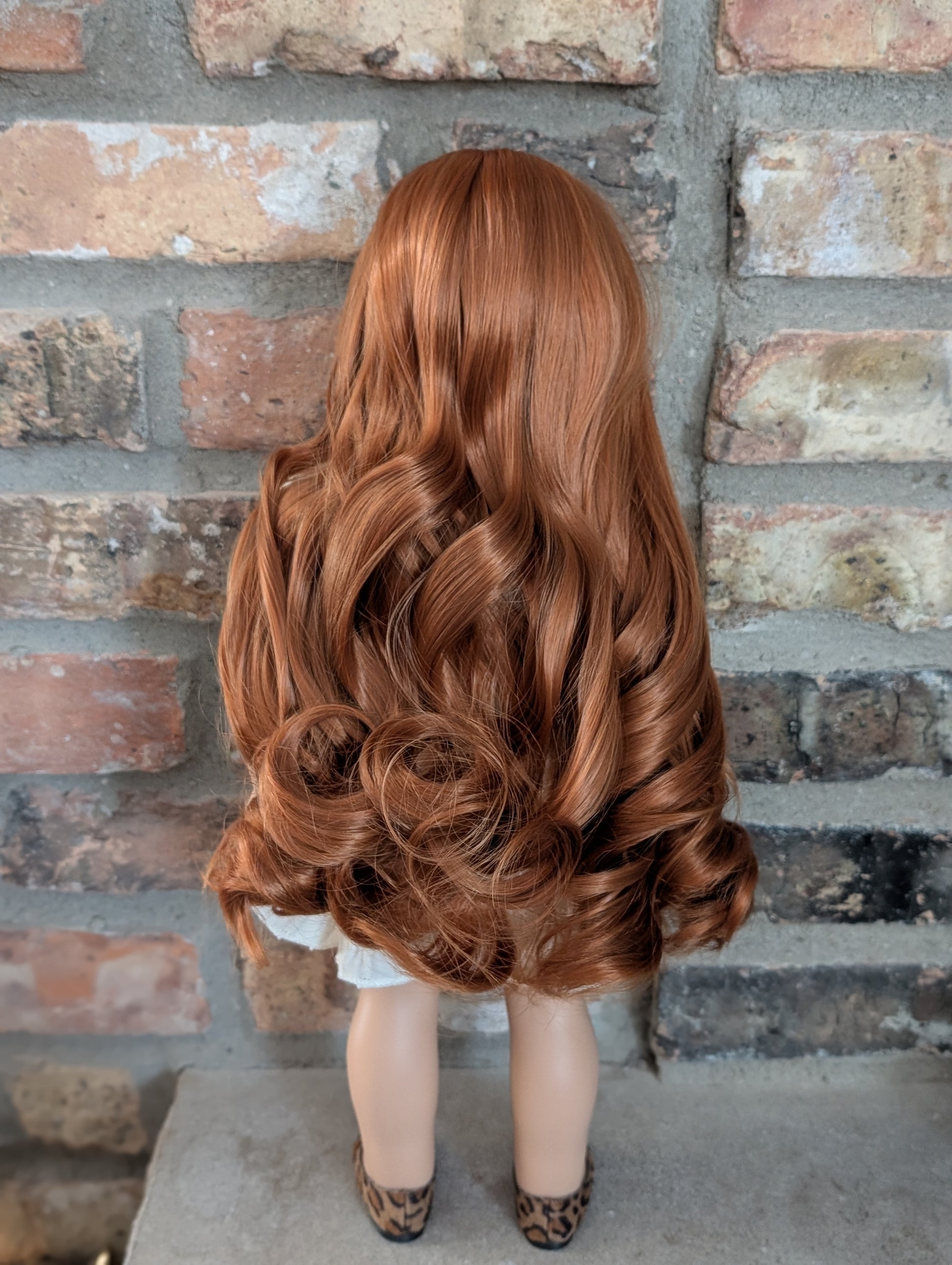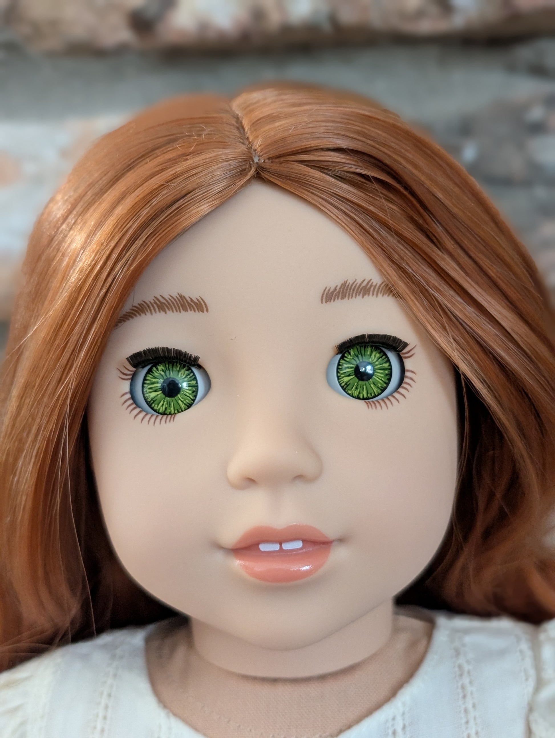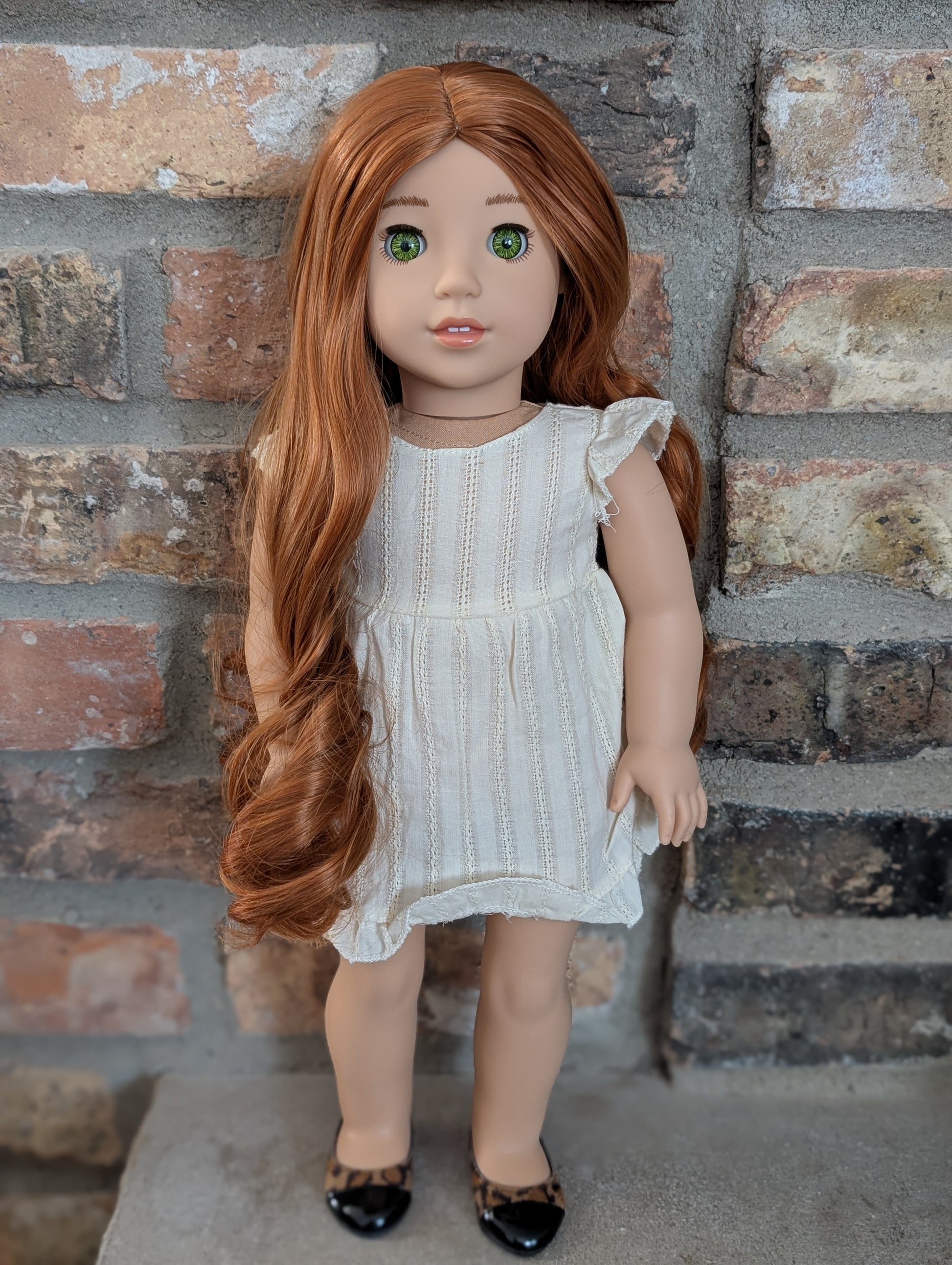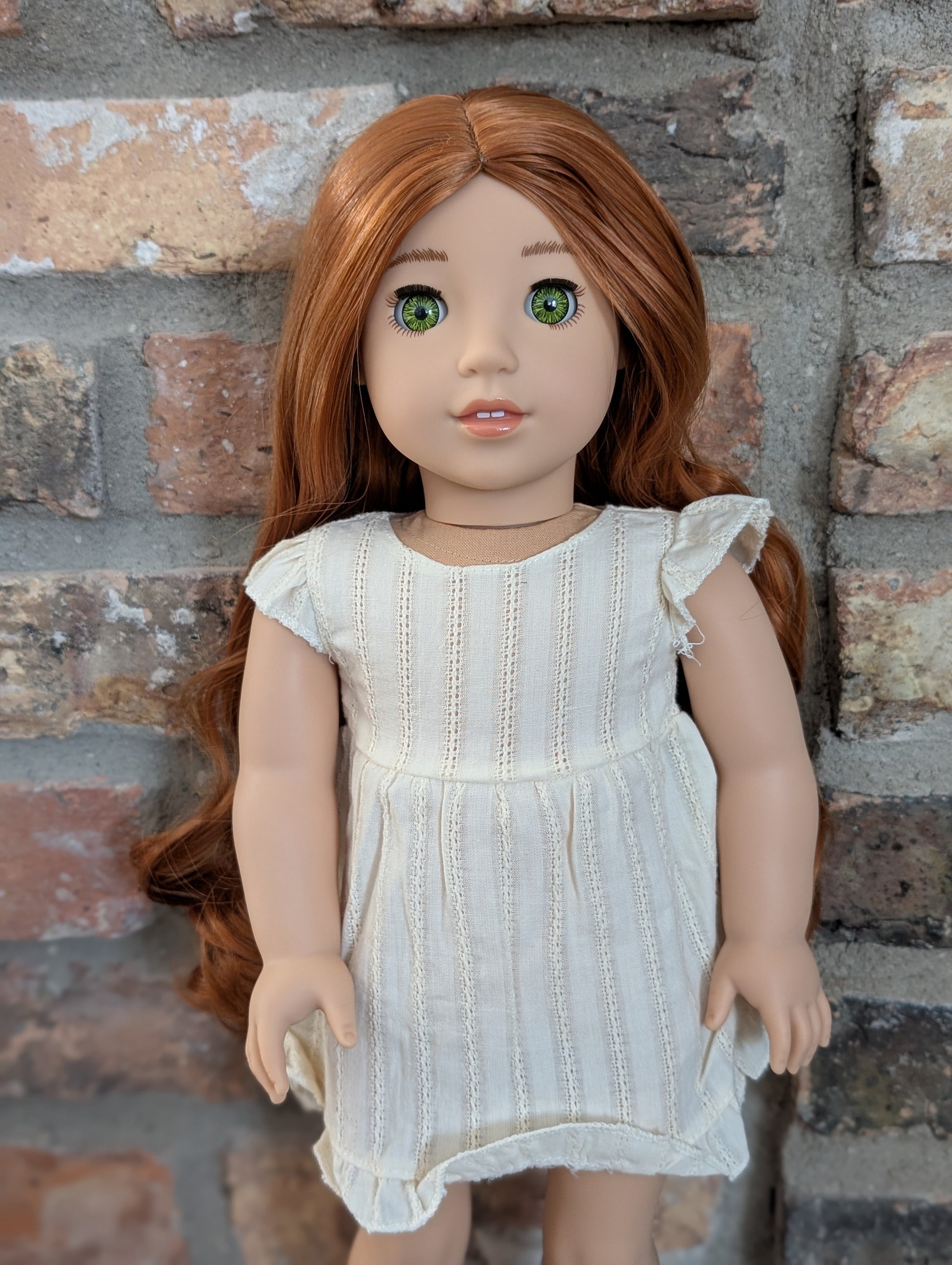 This one of a kind OOAK custom American Girl doll was created with a brand new doll, a red wig, and green eyes. She has lip gloss that was hand painted and sealed. She may have some minor shine marks from handling. She comes with the outfit pictured.