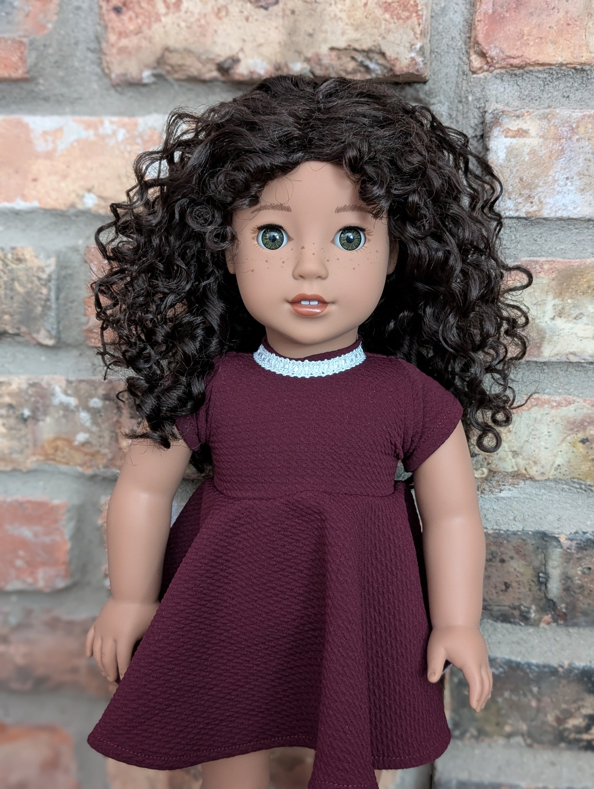 This one of a kind OOAK custom American Girl doll was created with a brand new doll, a dark brown wig, and hazel eyes. She has lip gloss and freckles that were hand painted and sealed. She may have some minor shine marks from handling. She comes with the outfit pictured.