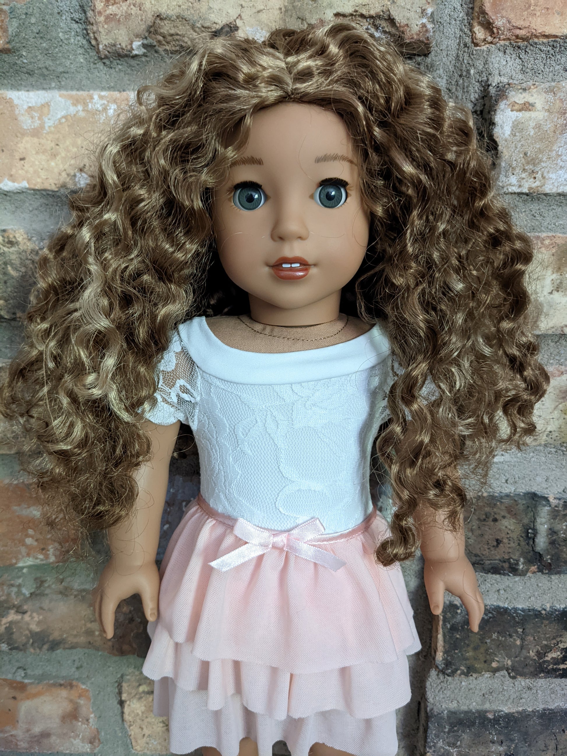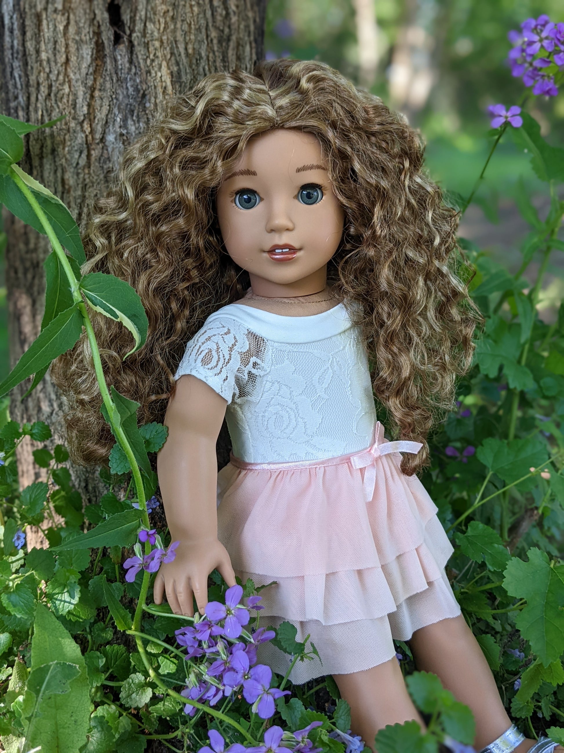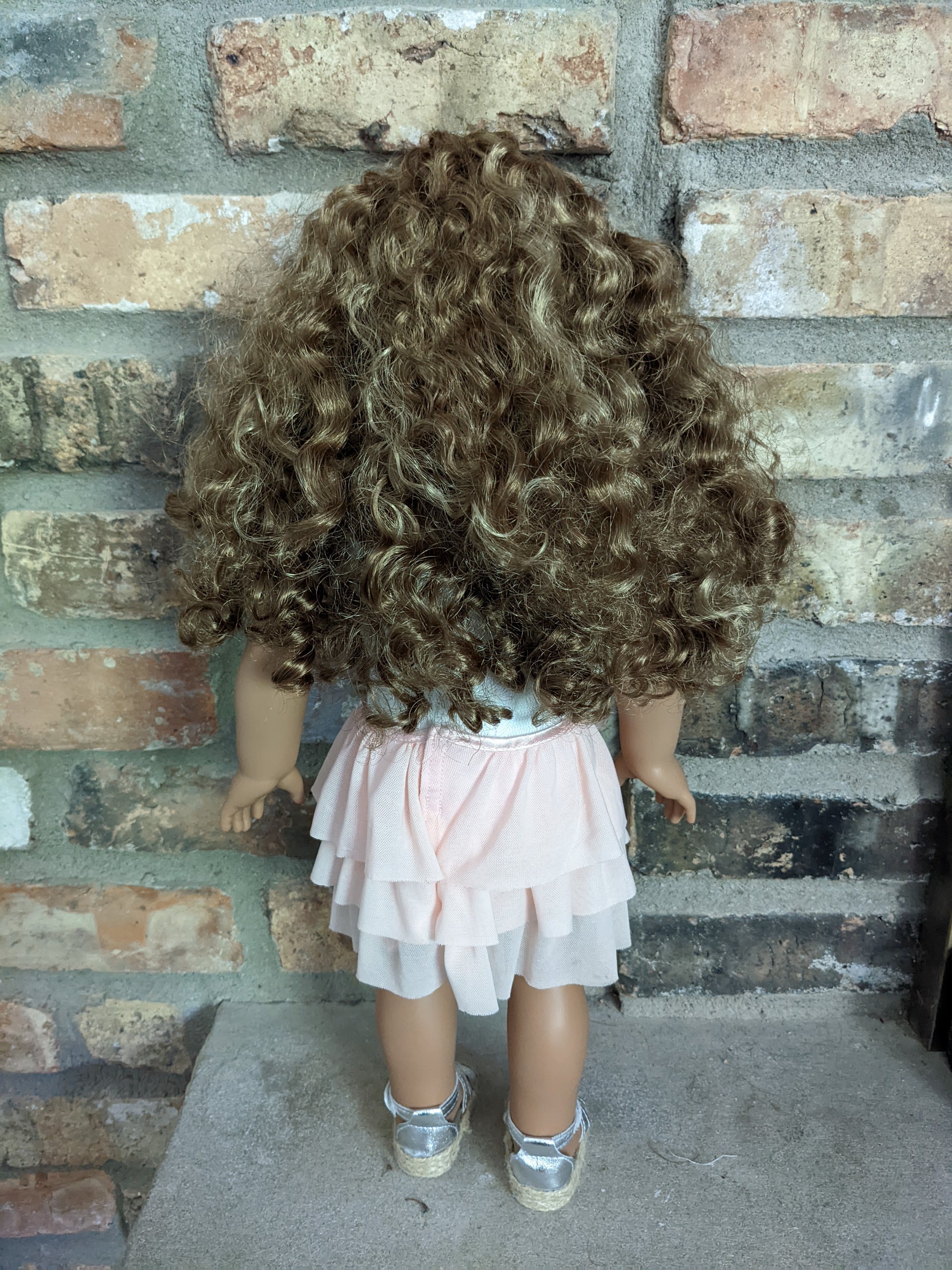 This one of a kind OOAK custom American Girl doll was created with a brand new Nanea doll, a caramel brown curly wig from a new Evette doll, and grey eyes. She has lip gloss that was hand painted and sealed. She may have some minor shine marks from handling. She comes with the outfit pictured. If you would like the wig left unattached, please leave a note in the "Order Special Instructions" box upon checkout. Otherwise I will attach the wig using a heavy duty permanent adhesive for a strong hold.