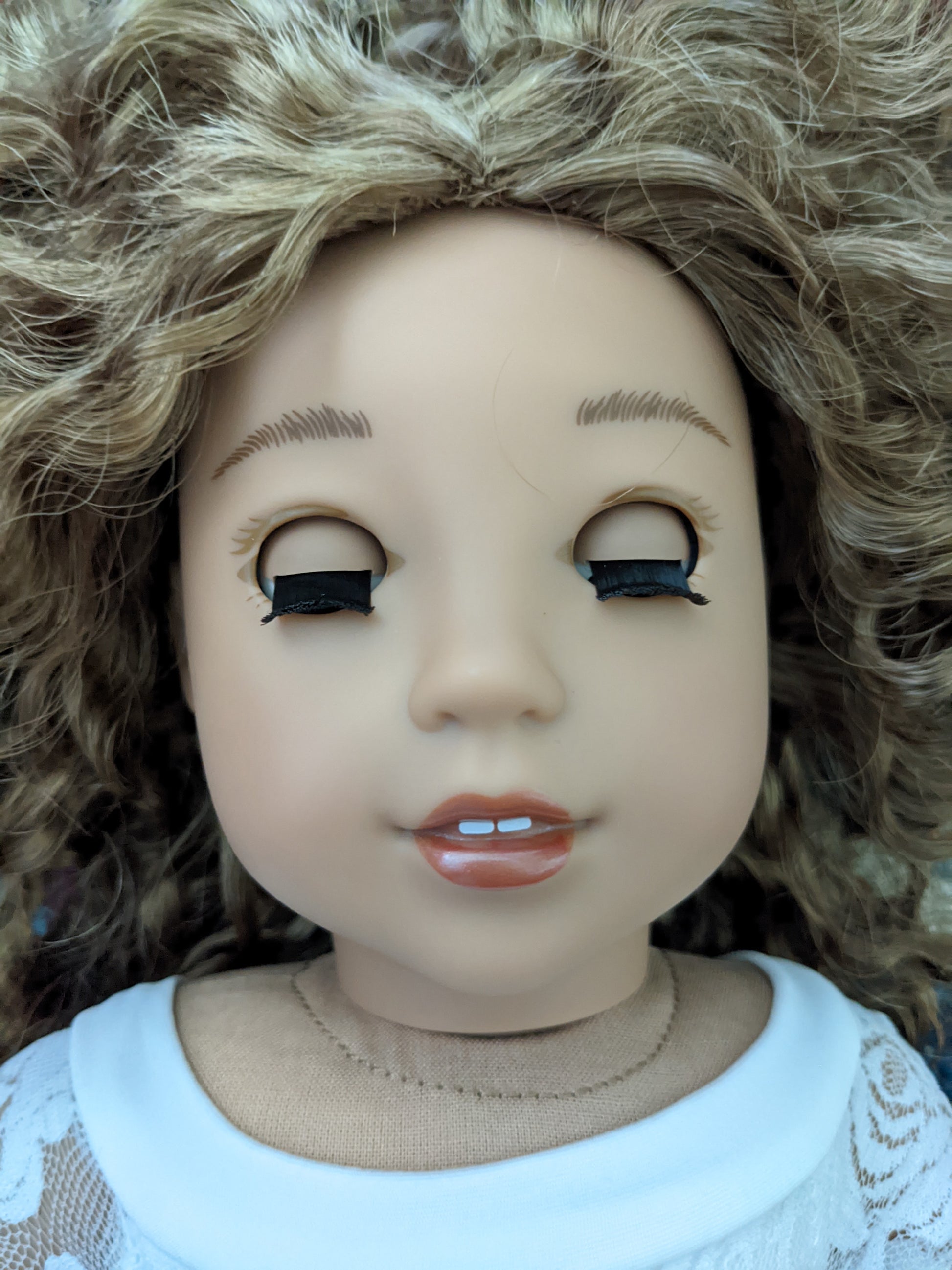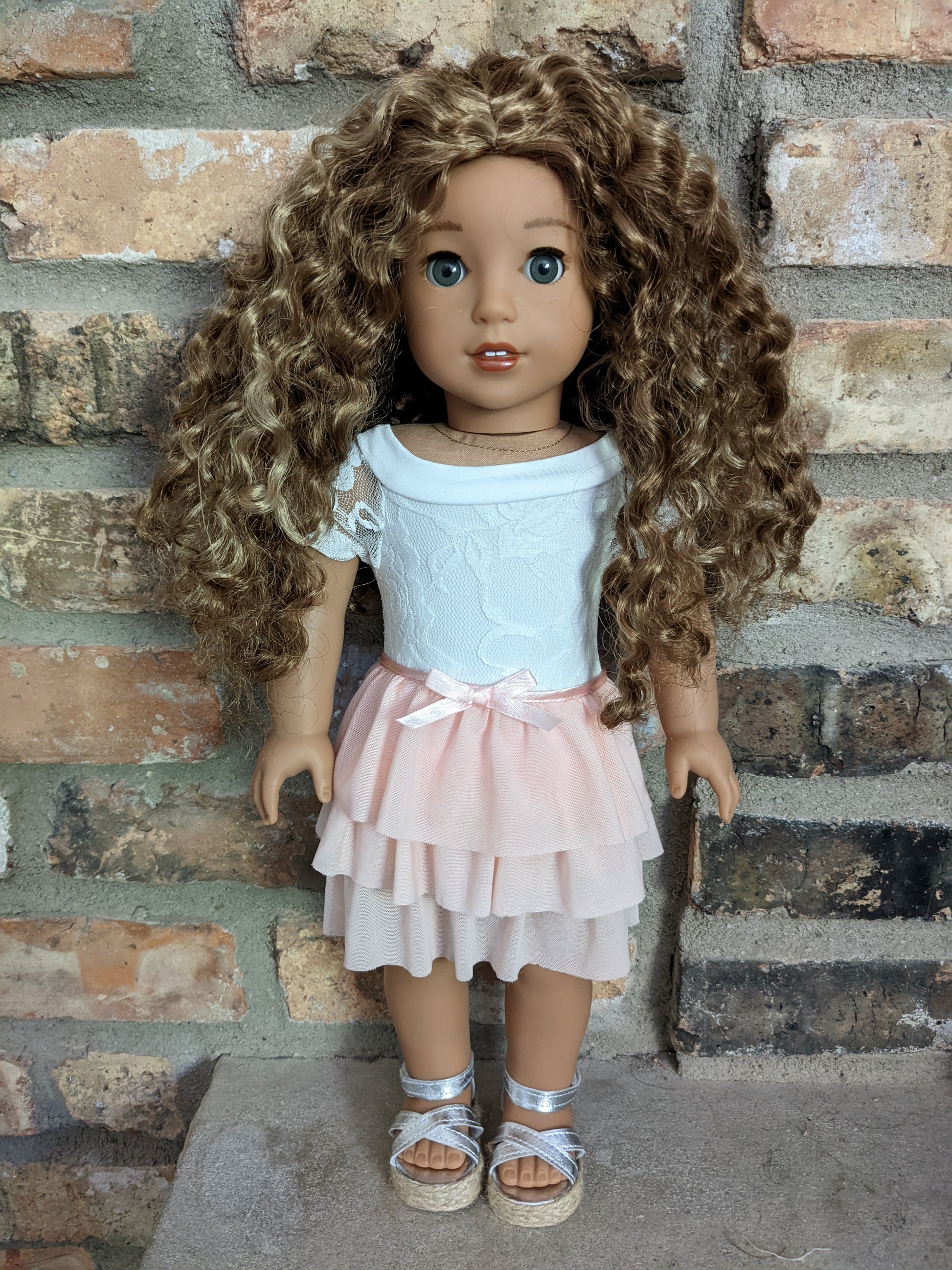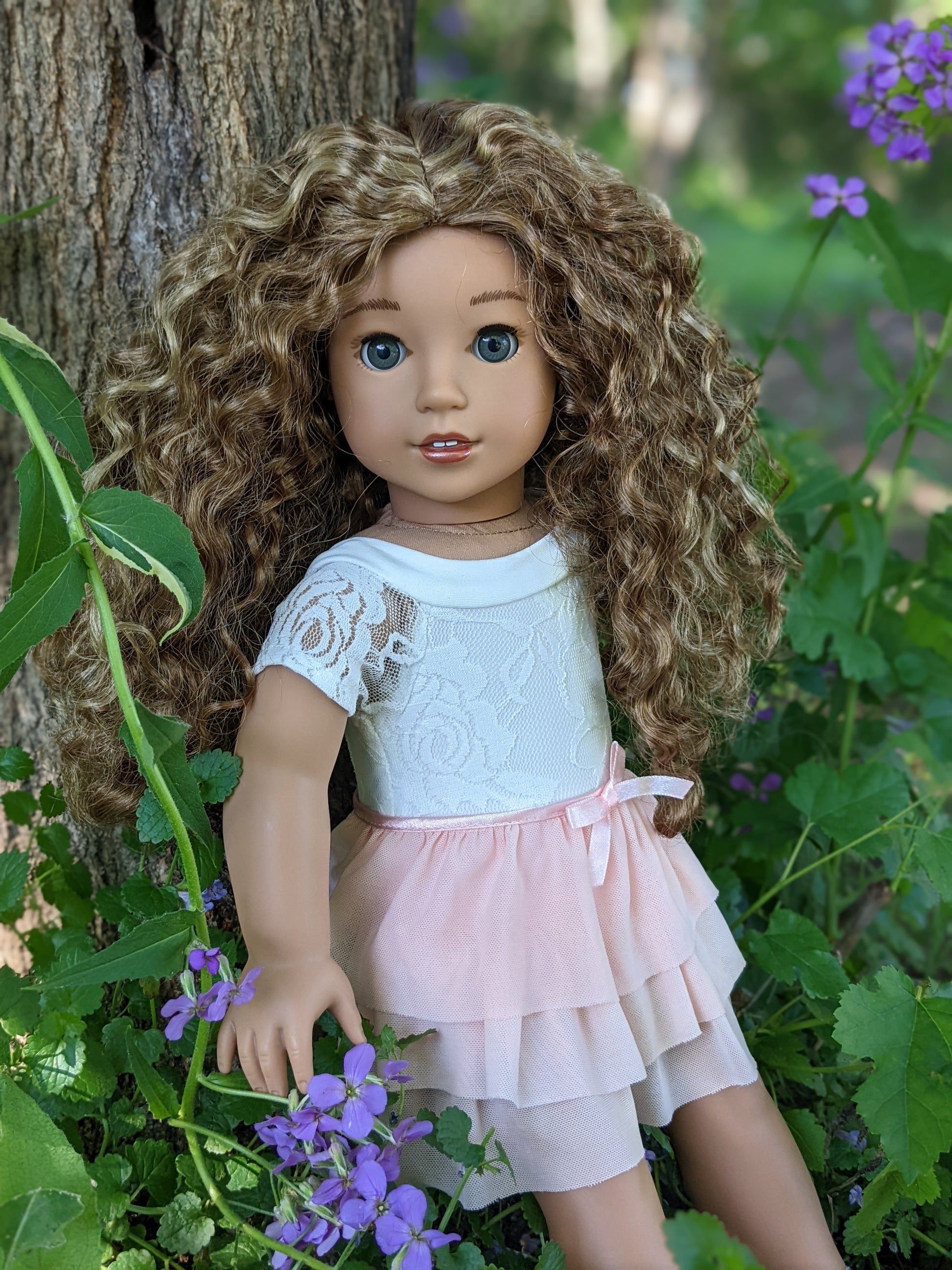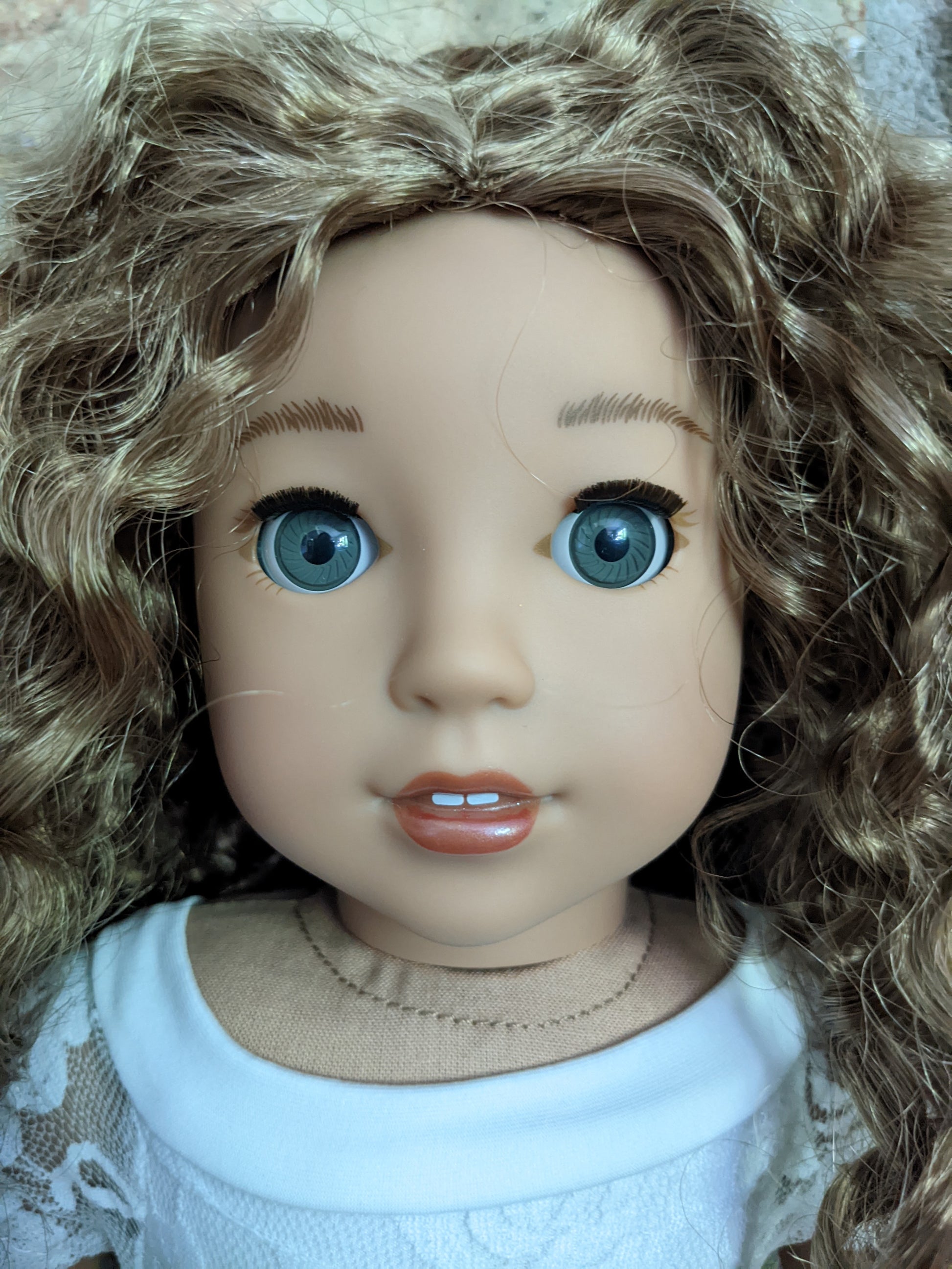 This one of a kind OOAK custom American Girl doll was created with a brand new Nanea doll, a caramel brown curly wig from a new Evette doll, and grey eyes. She has lip gloss that was hand painted and sealed. She may have some minor shine marks from handling. She comes with the outfit pictured. If you would like the wig left unattached, please leave a note in the "Order Special Instructions" box upon checkout. Otherwise I will attach the wig using a heavy duty permanent adhesive for a strong hold.