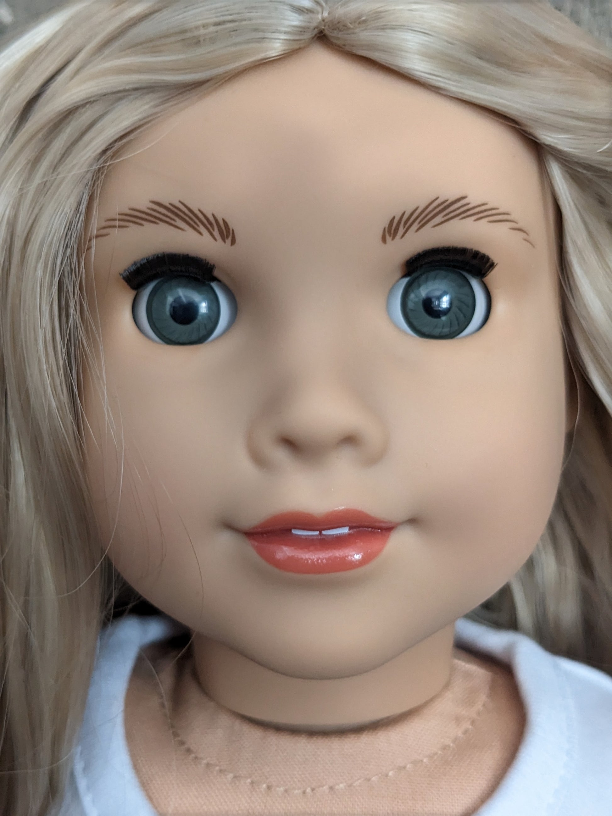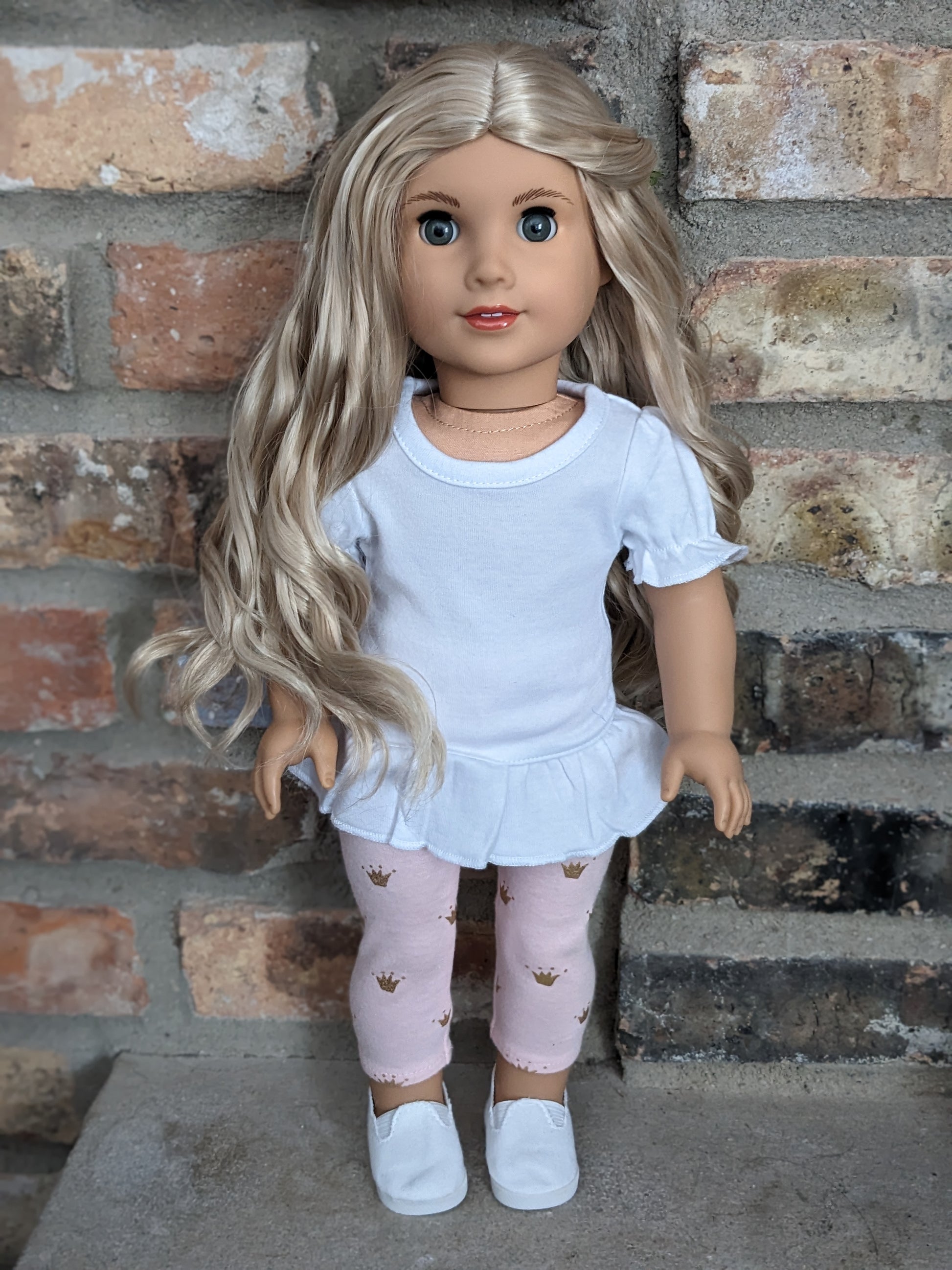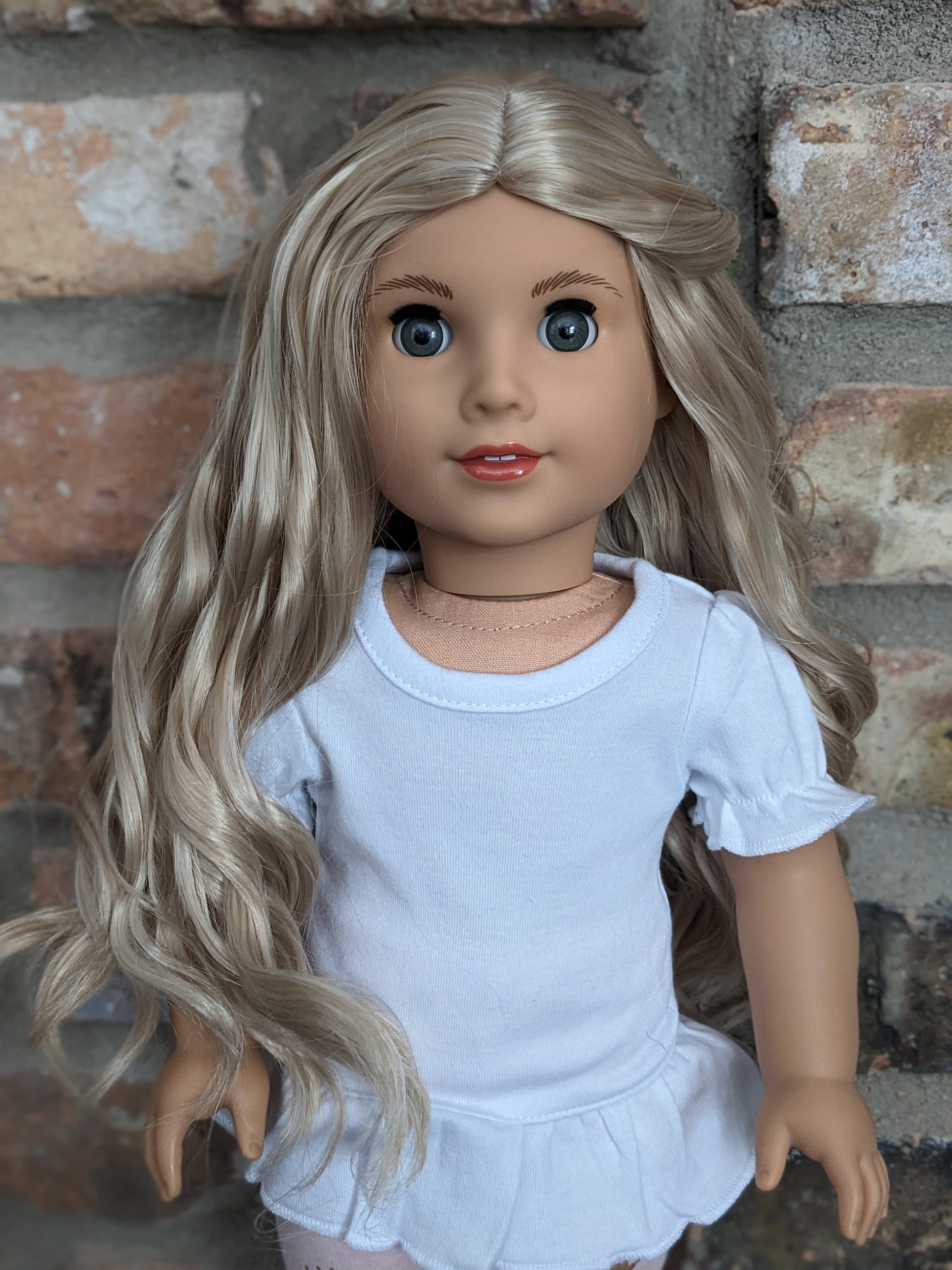 This one of a kind OOAK custom American Girl doll was created with a new doll, a blonde curly wig, and grey eyes. She has lip gloss that was hand painted and sealed. She may have some minor shine marks from handling. She comes with the outfit pictured. Her painted on eyelashes have been removed.